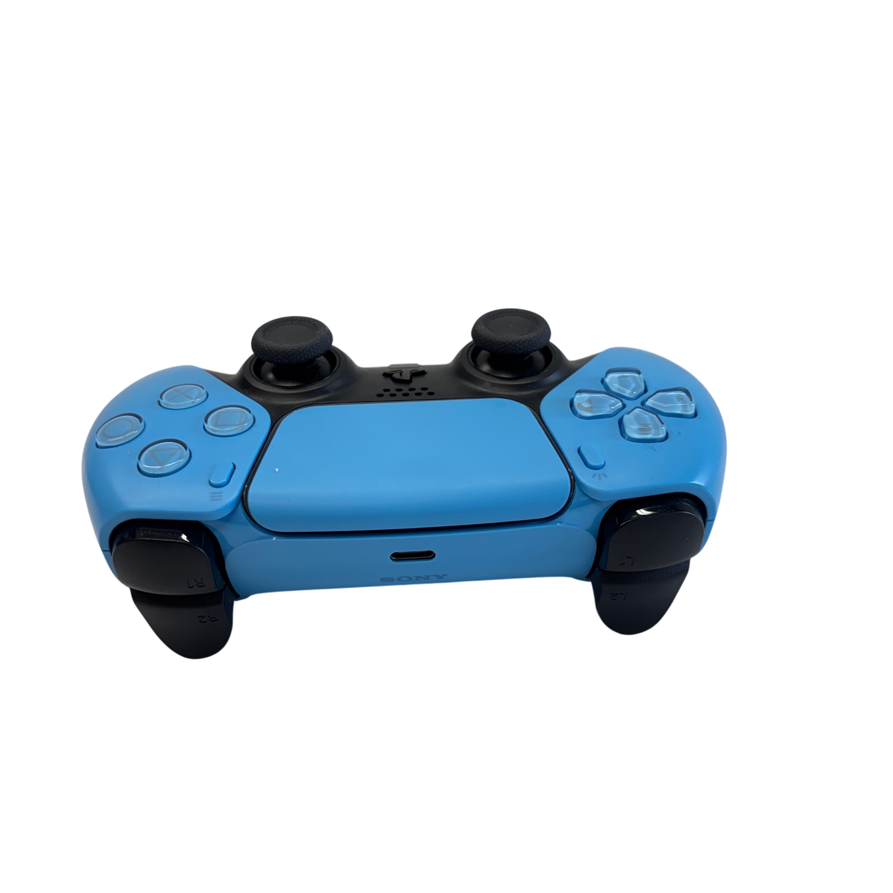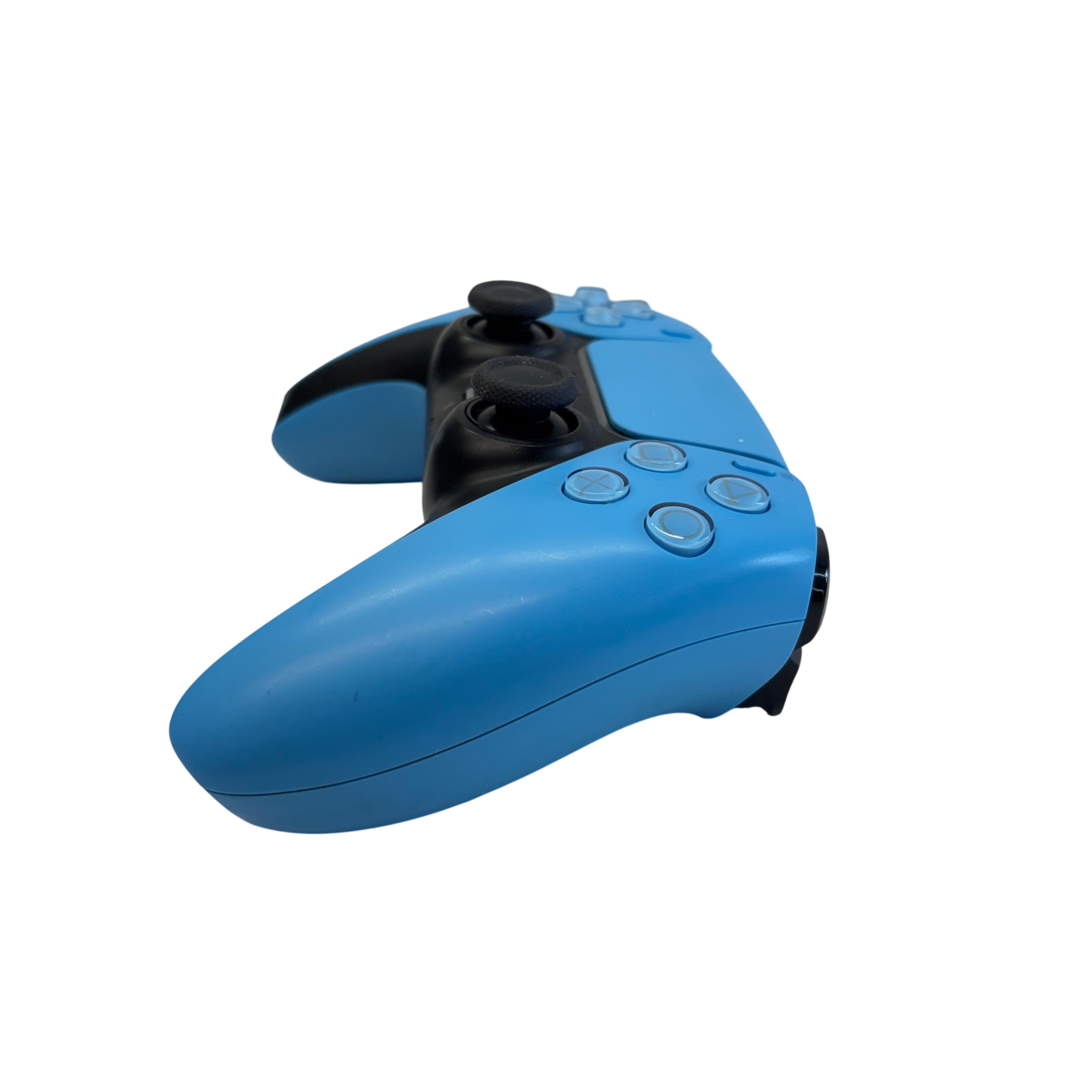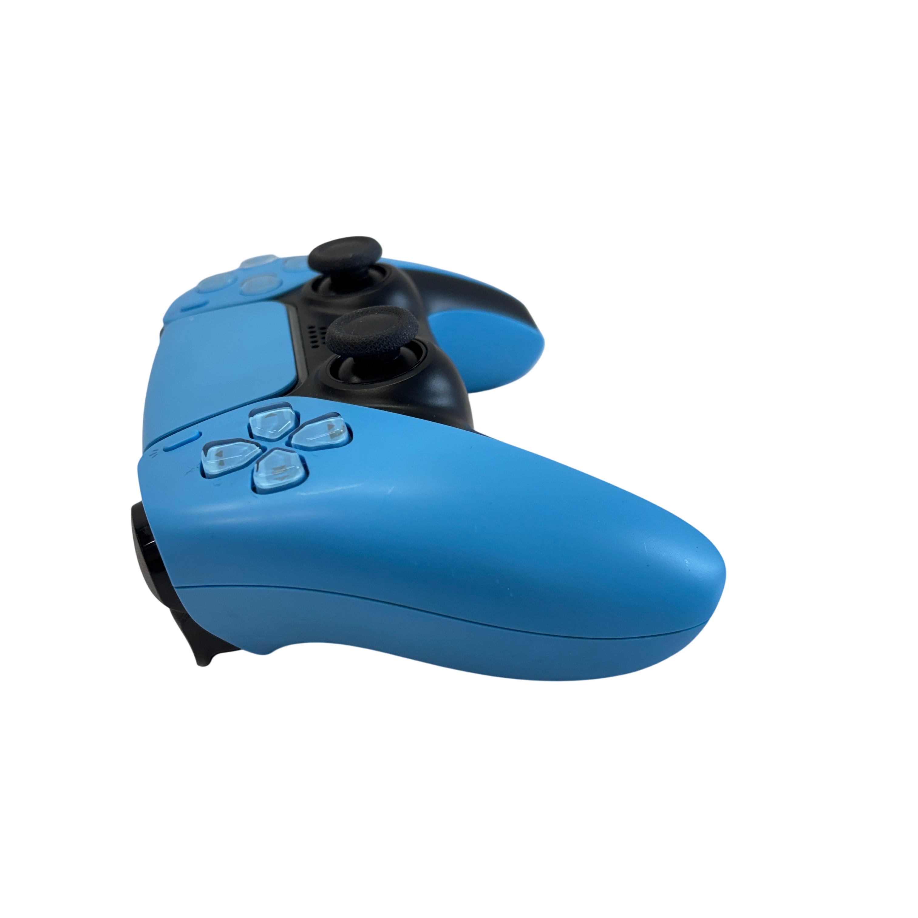 Sony PlayStation 5 DualSense Wireless Controller (Model CFI-ZCT1W) in blue and black offers an immersive gaming experience with wireless connectivity and advanced haptic feedback. Powered via 5V 1500mA input, this ergonomic controller features adaptive triggers, a built-in microphone, and speaker for enhanced gameplay interaction. Compatible with the PlayStation 5 console, it provides precise control and comfort for extended gaming sessions. The controller shows light signs of use but remains fully functional and ready to elevate your gaming setup.