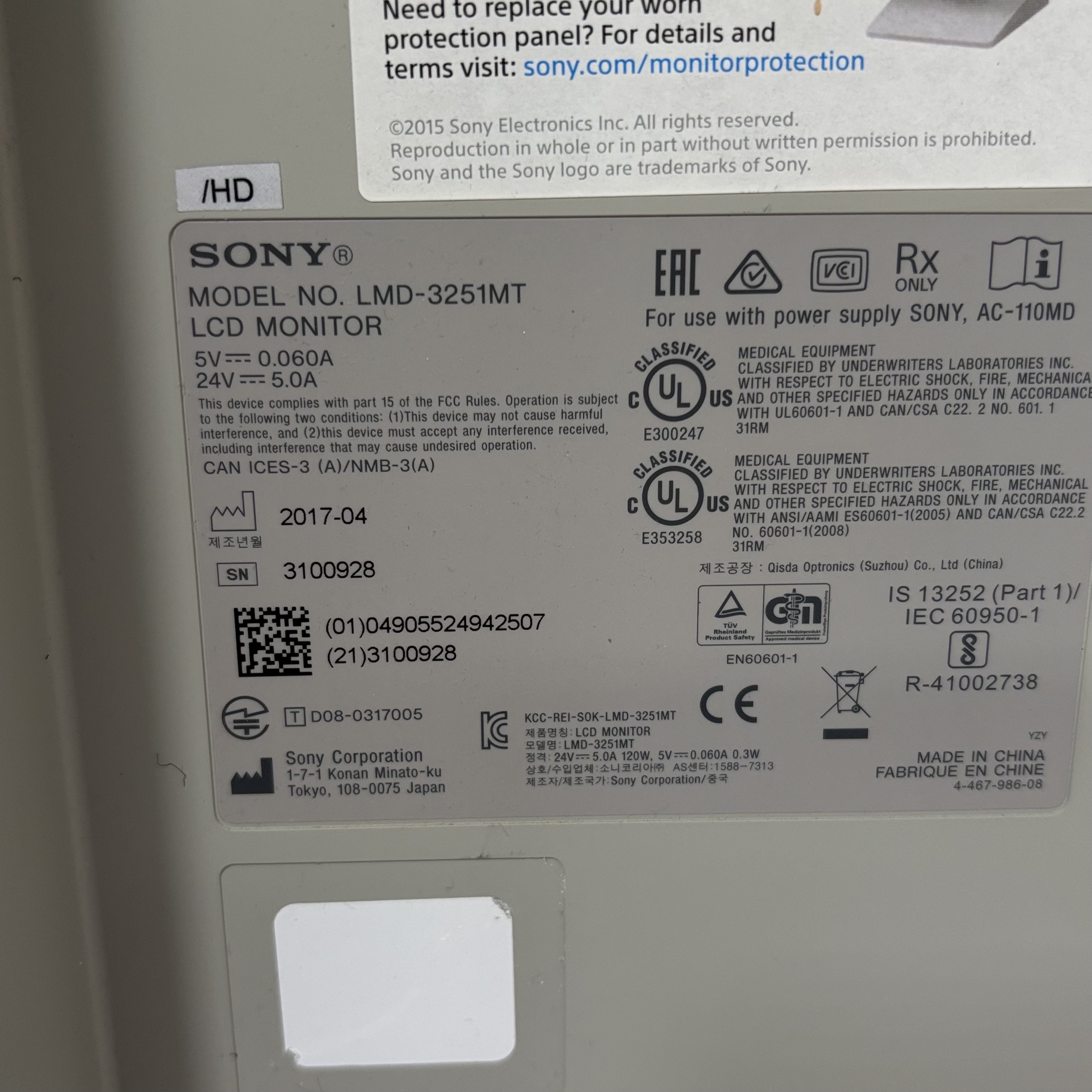 Sony LMD-3251MT LCD Monitor offers high-definition display capabilities, perfect for professional environments requiring precise image quality. This model includes a 24V power supply and multiple input options, making it versatile for various setups. Ideal for medical or industrial applications, it ensures reliable performance with its robust build.