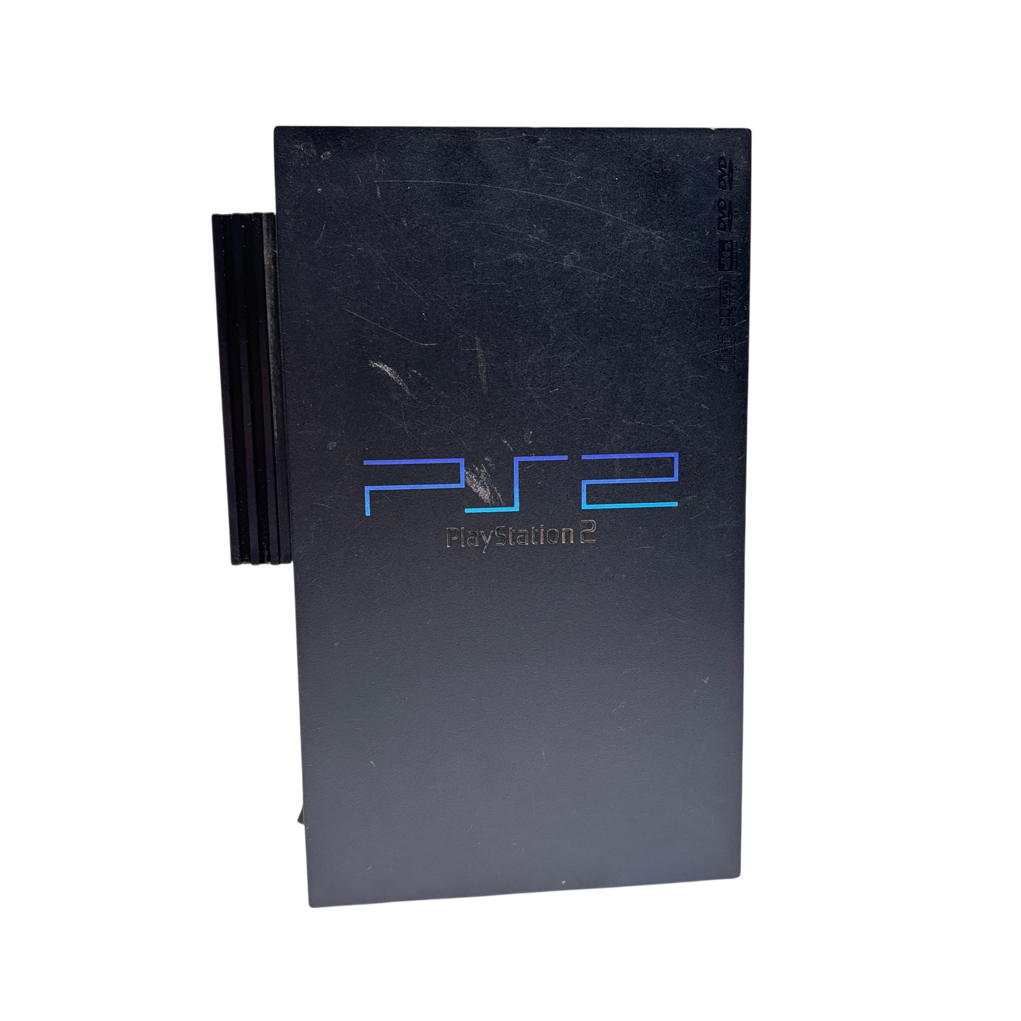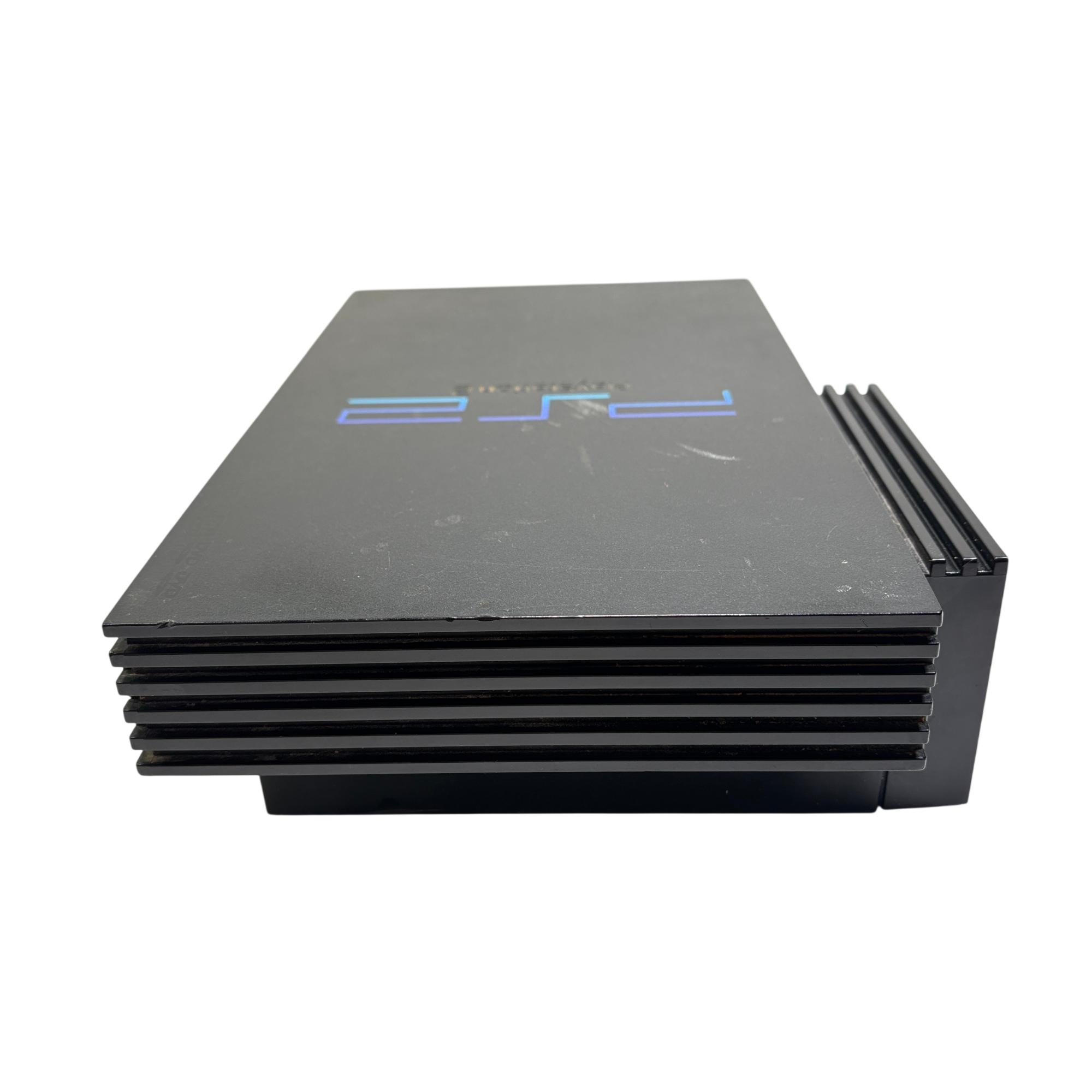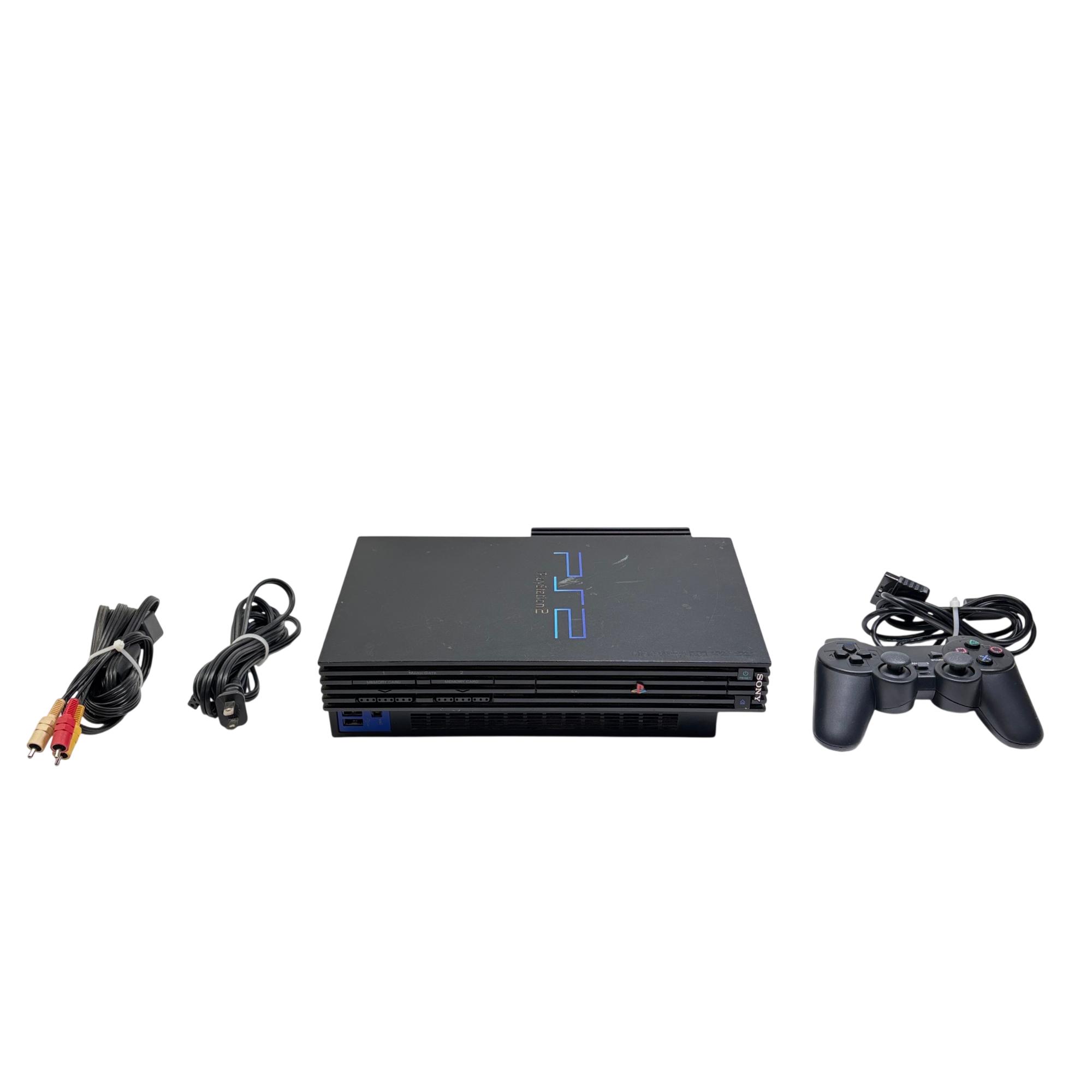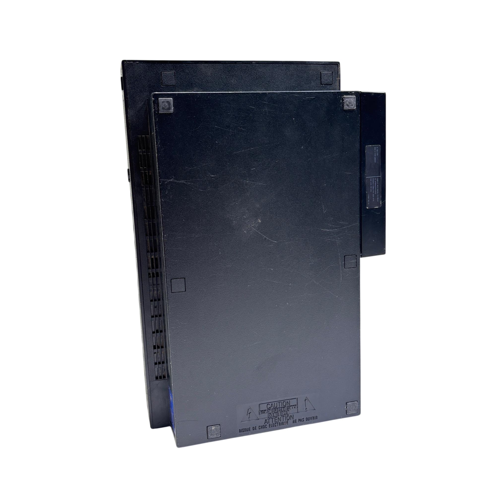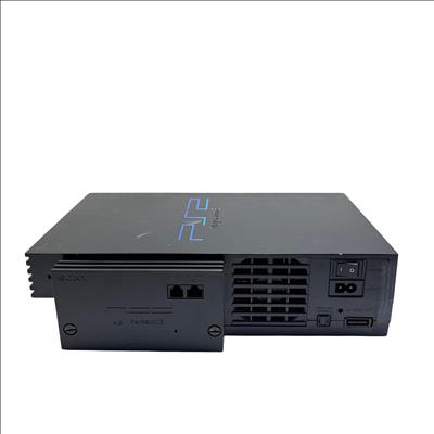 Sony PlayStation 2 (PS2) Fat Console - Model SCPH-30001 is a classic black gaming system known for its robust design and iconic status in video game history. Featuring a rectangular shape with blue LED indicators and multiple cable connections, this model supports a wide range of popular game titles and multimedia functions. Its durable build and recognizable interface make it a sought-after console for retro gaming enthusiasts.