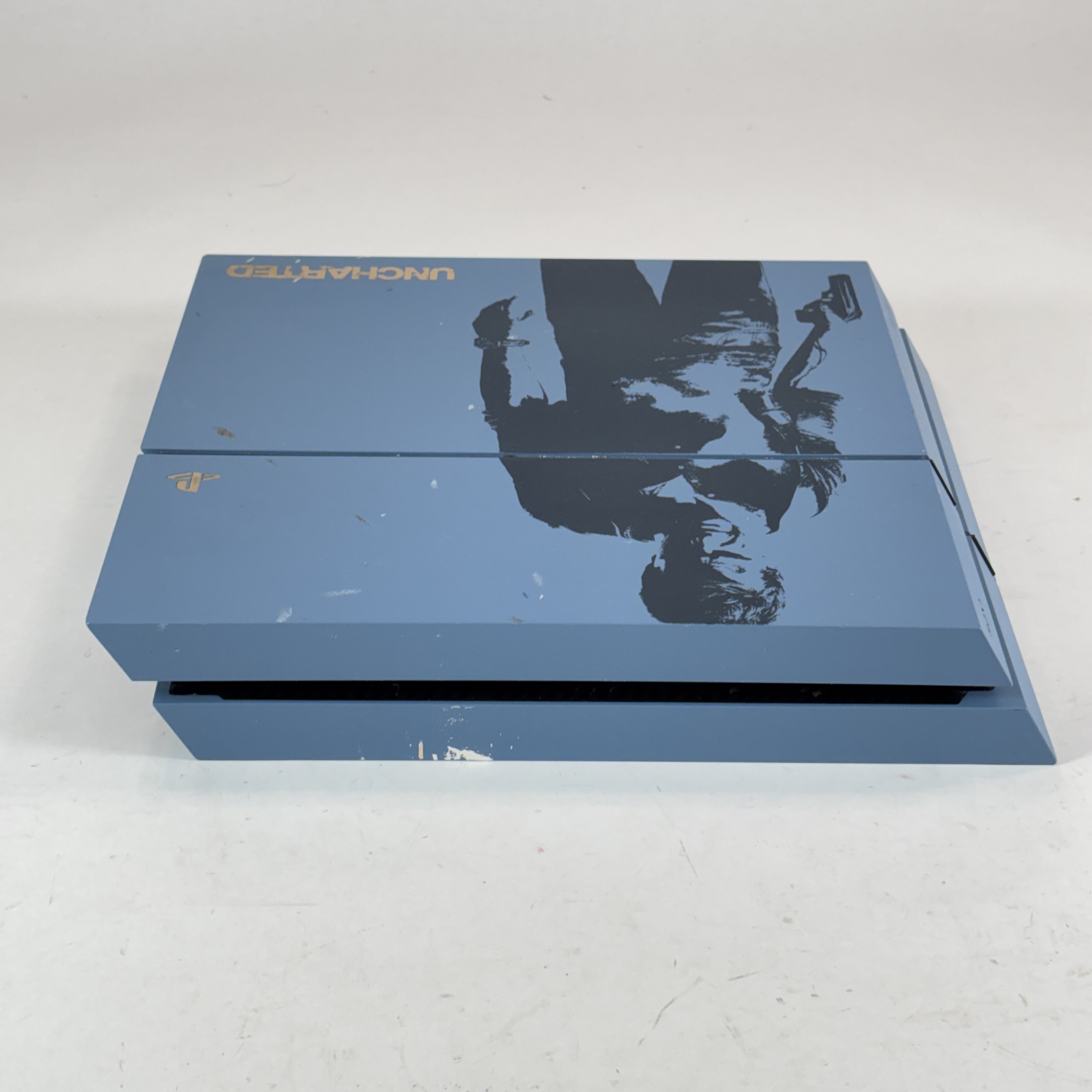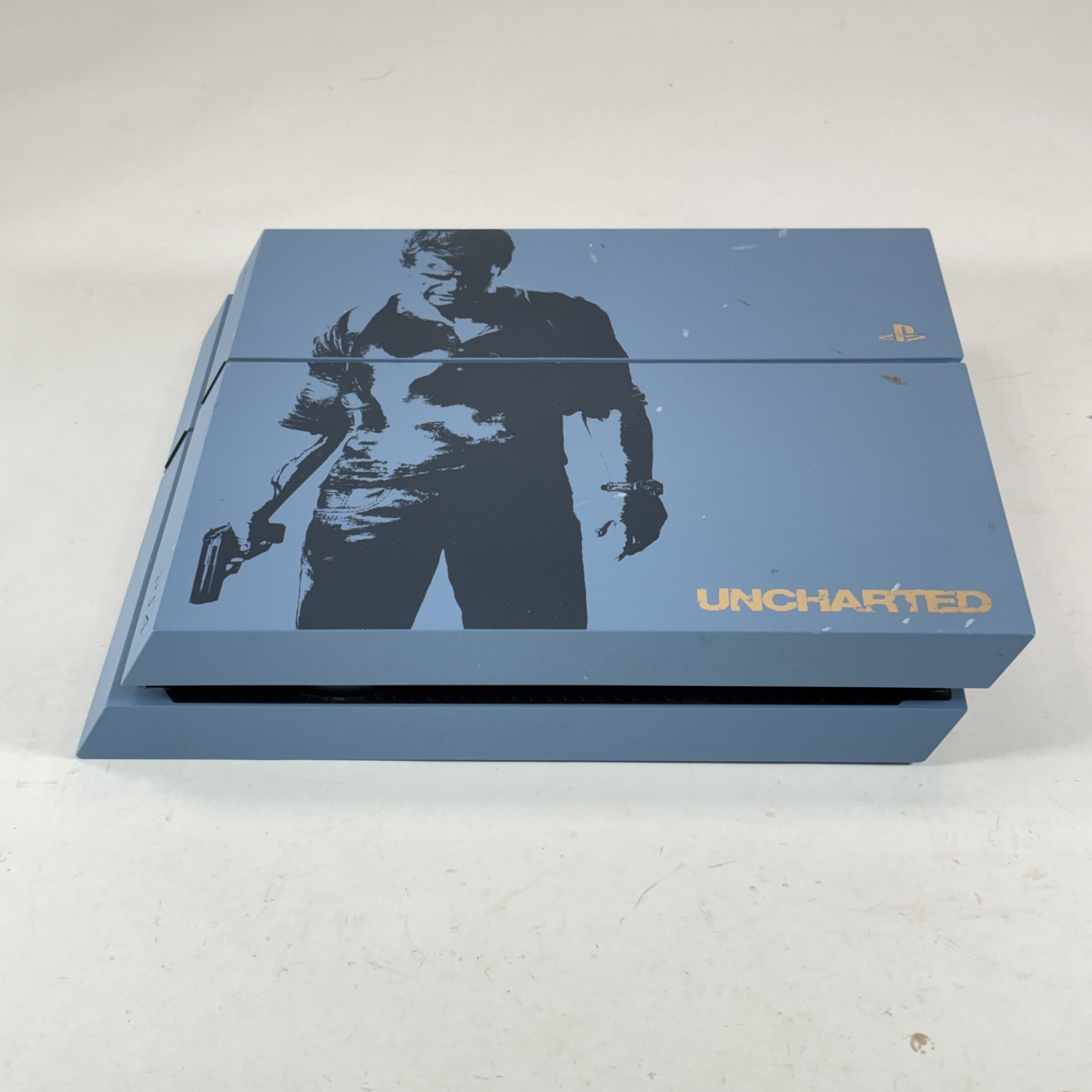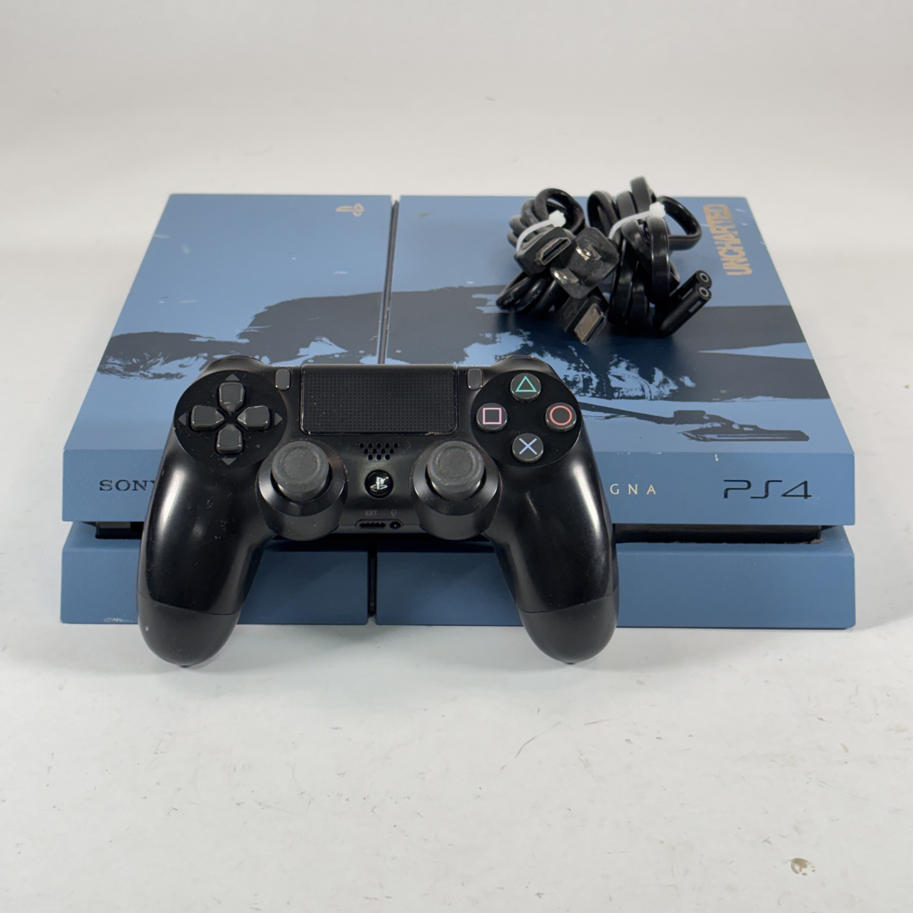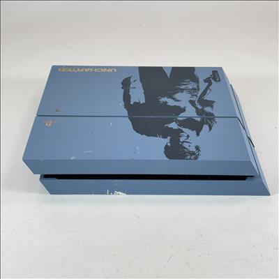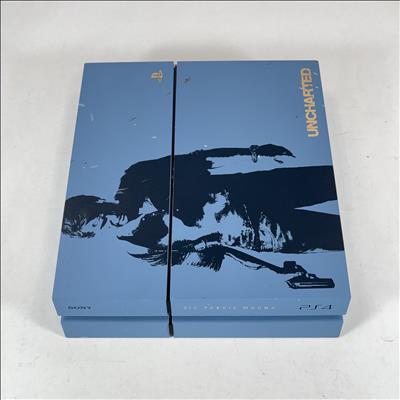 The Sony PlayStation 4 CUH-1215A Uncharted 4 Limited Edition is a striking 500GB gaming console featuring a distinctive Gray Blue finish with custom silk-screened artwork inspired by Uncharted 4: A Thief's End, including a detailed image of Nathan Drake, the Uncharted logo, PlayStation branding, and the iconic phrase "SIC PARVIS MAGNA" in gold. This collector's piece delivers cutting-edge graphics that bring immersive game worlds to life, paired with next-gen processing speed for faster load times and seamless gameplay. Enjoy deeply integrated social features, including the Share button for instant broadcasting of epic moments to platforms like Twitch, YouTube, Facebook, and Twitter. Play online with friends, access additional content, and enhance your experience through PlayStation Plus (sold separately). Perfect for fans of the Uncharted series and standout console designs.