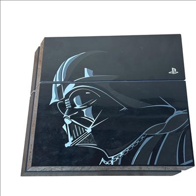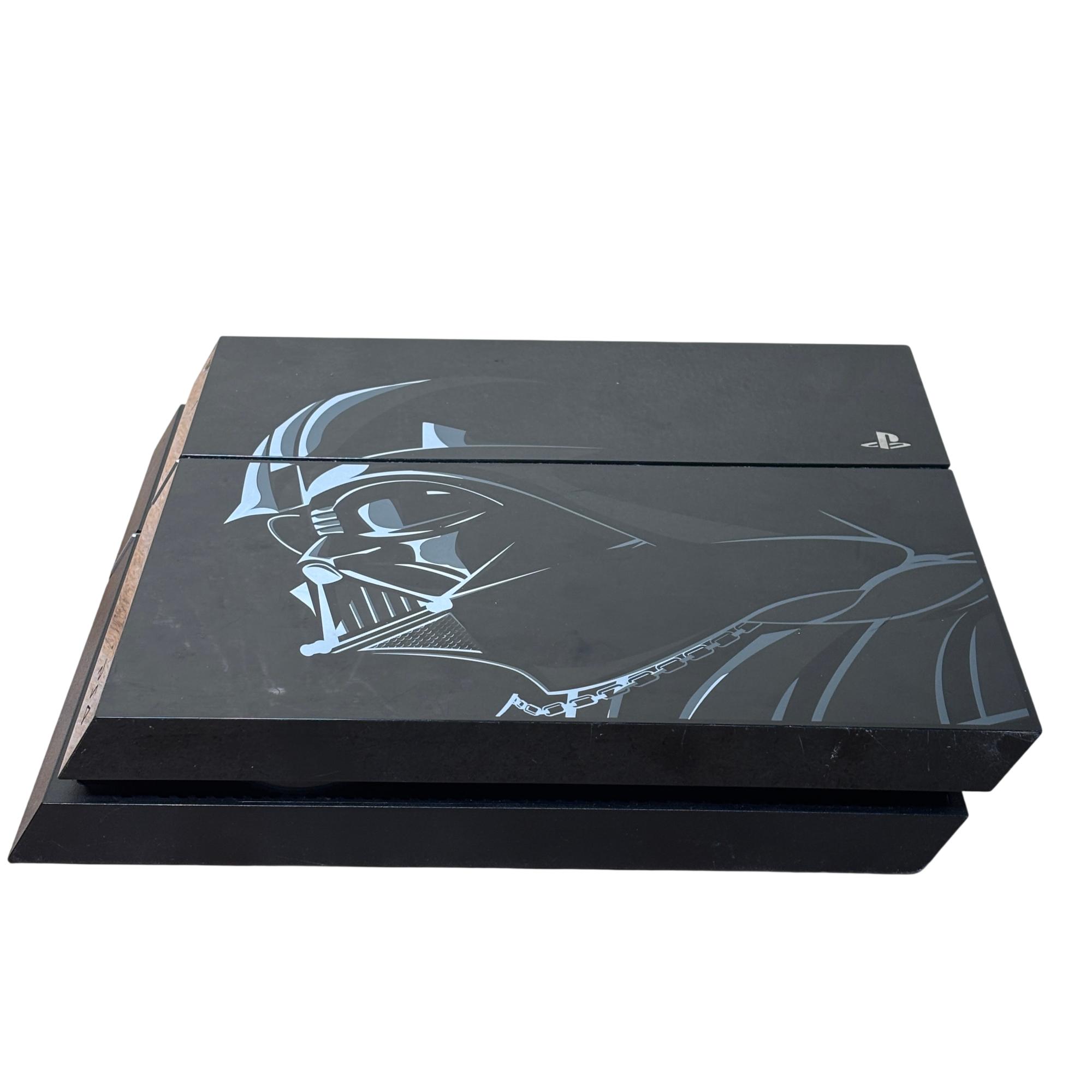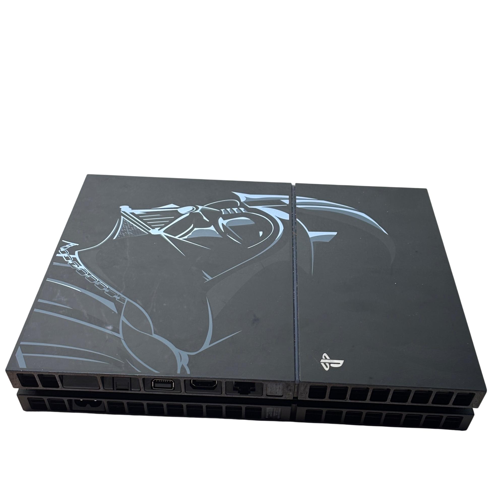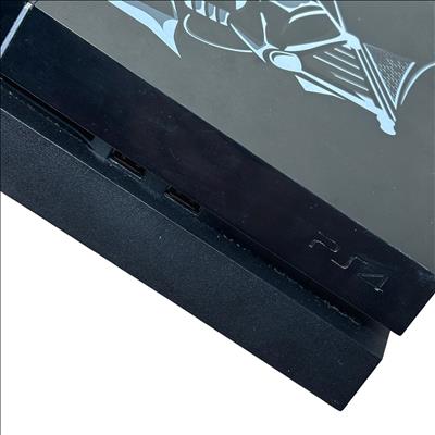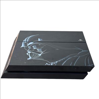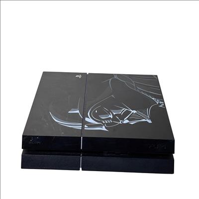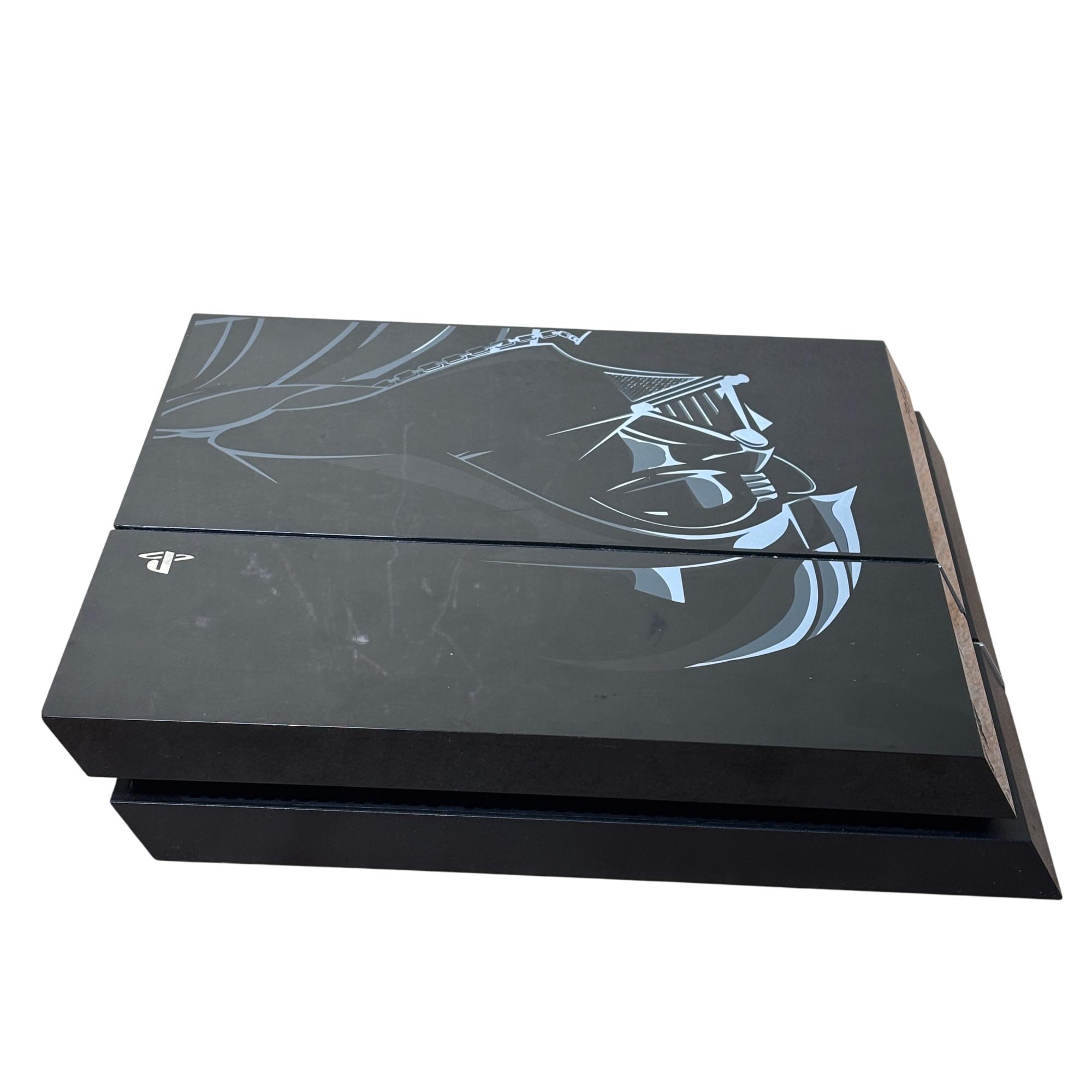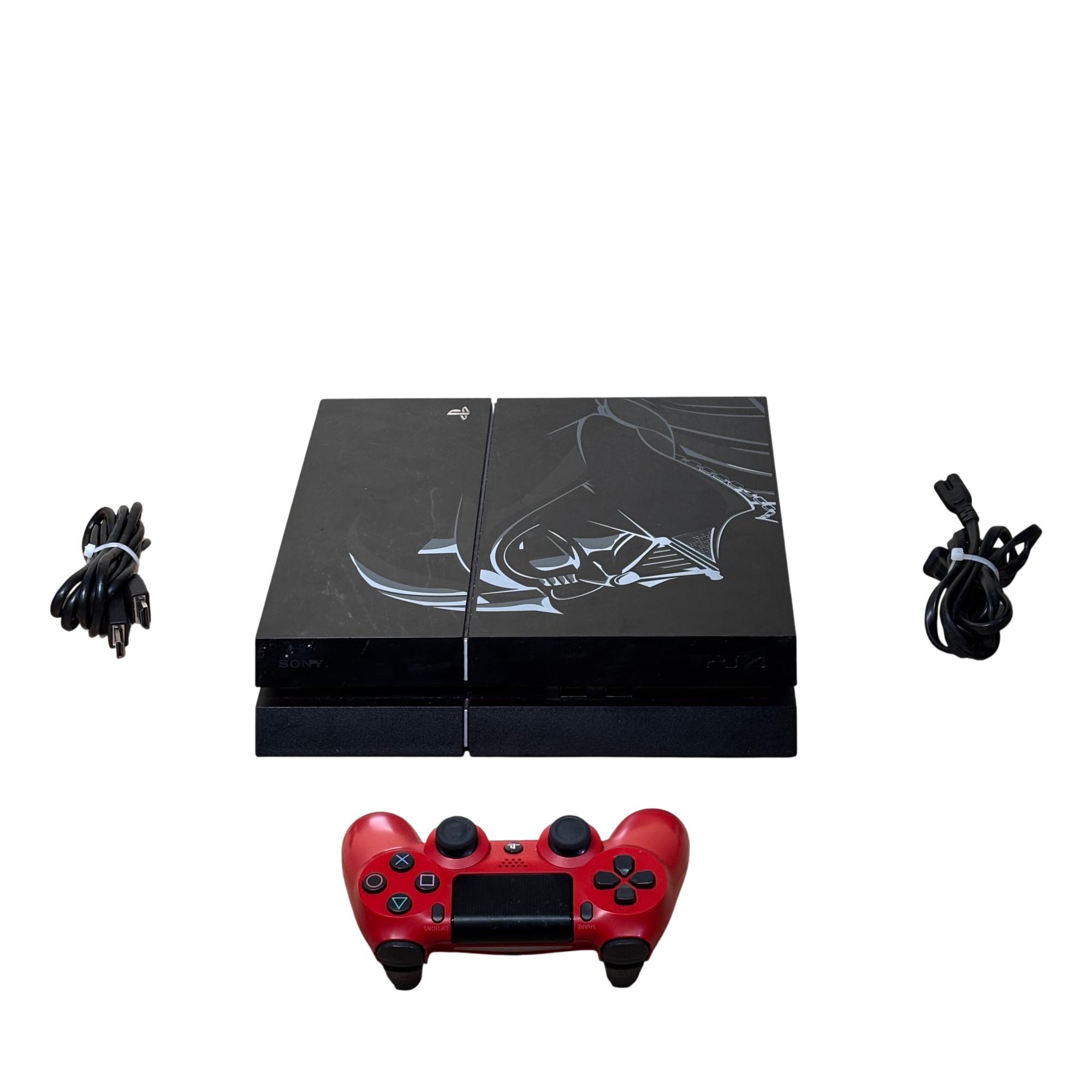 Sony PlayStation 4 Star Wars Battlefront Darth Vader Limited Edition (CUH-1215A) 500GB features a sleek black console adorned with distinctive Star Wars-themed designs. This limited edition model is paired with a striking red controller and includes all necessary cords for immediate setup. Engineered for immersive gaming, it combines powerful performance with iconic Star Wars aesthetics optimized for collectors and fans alike.