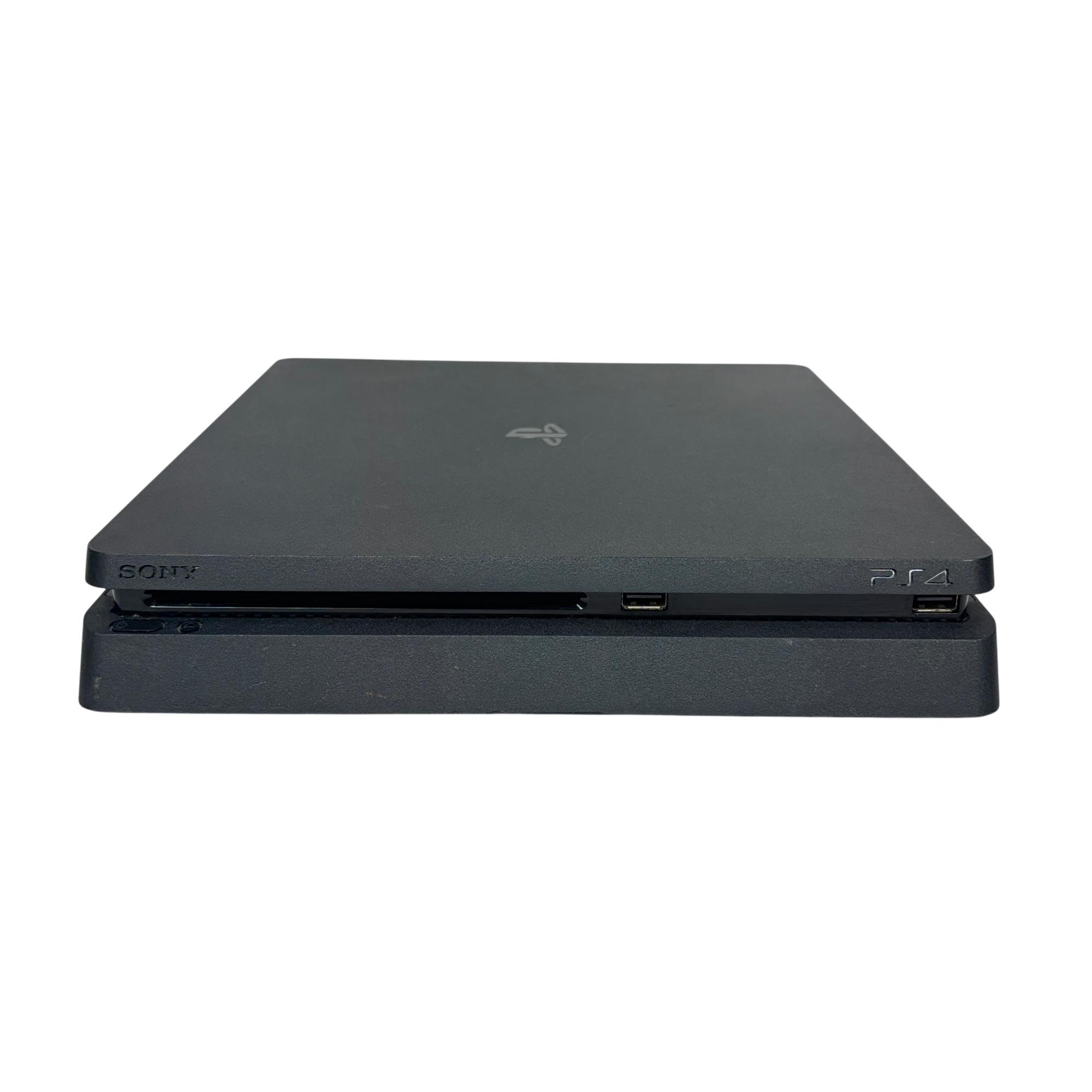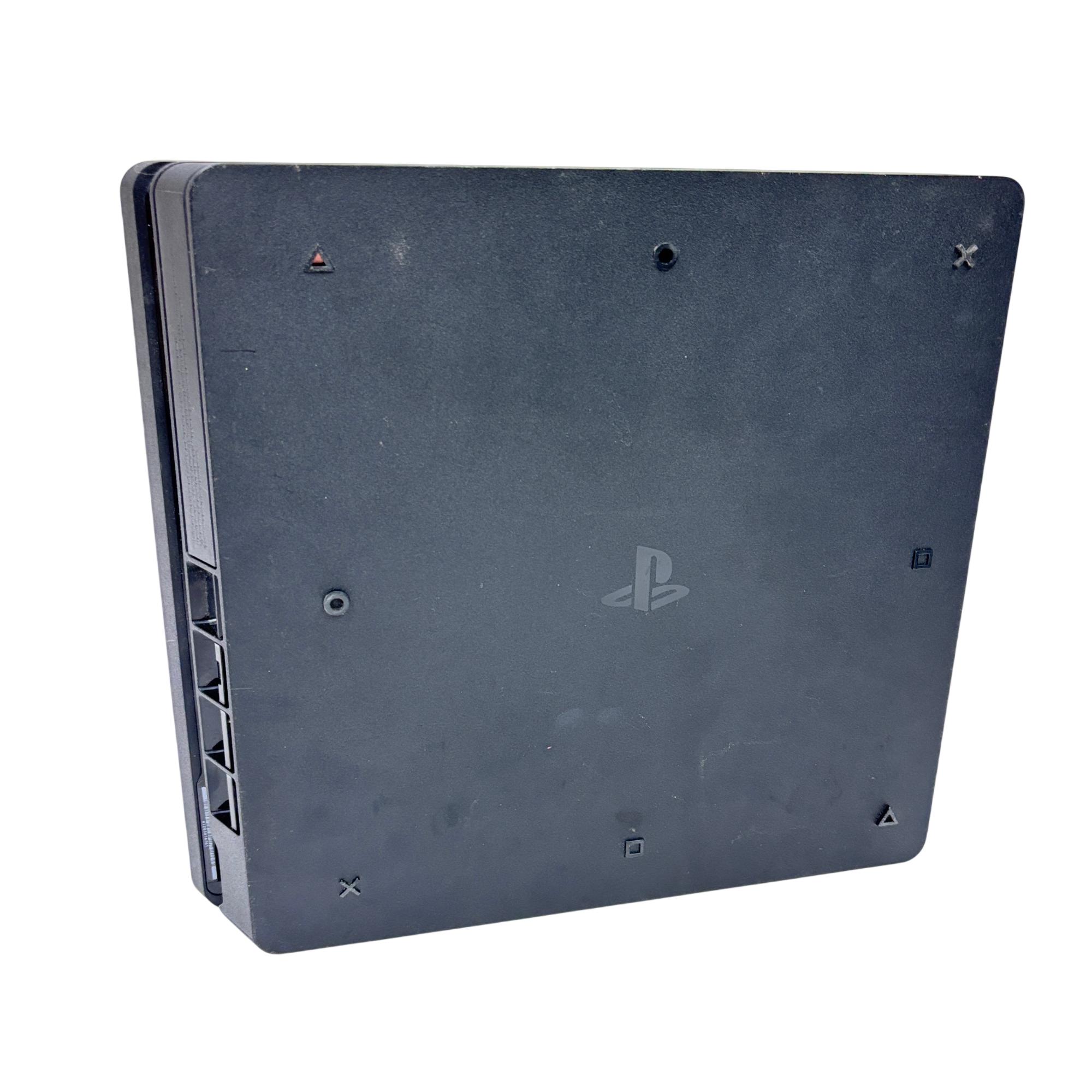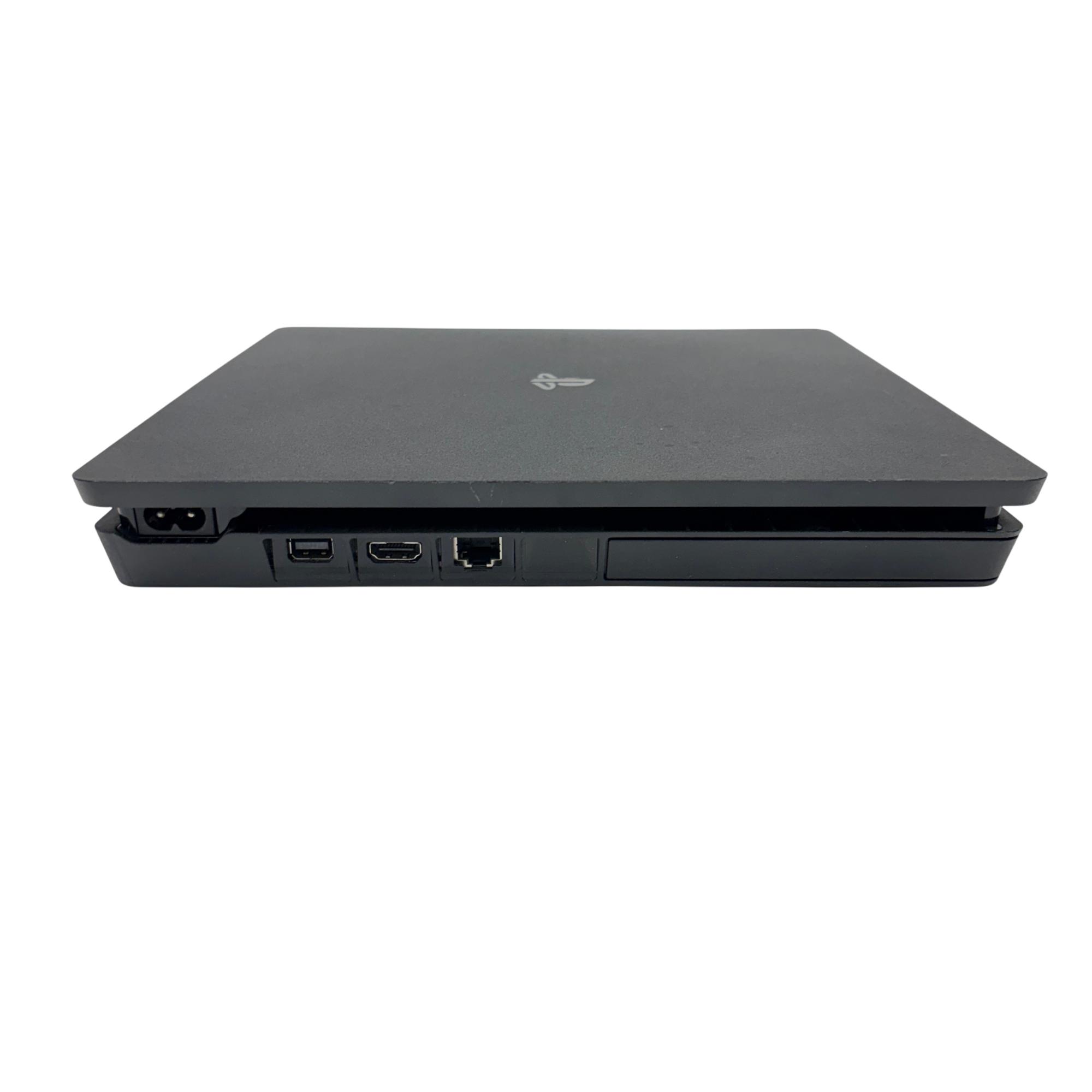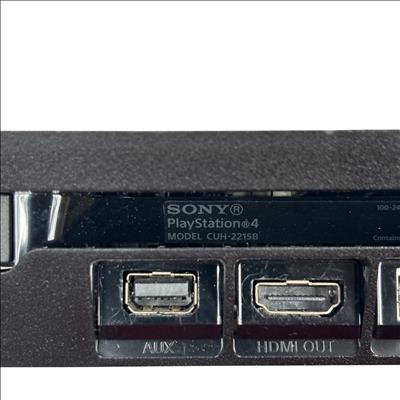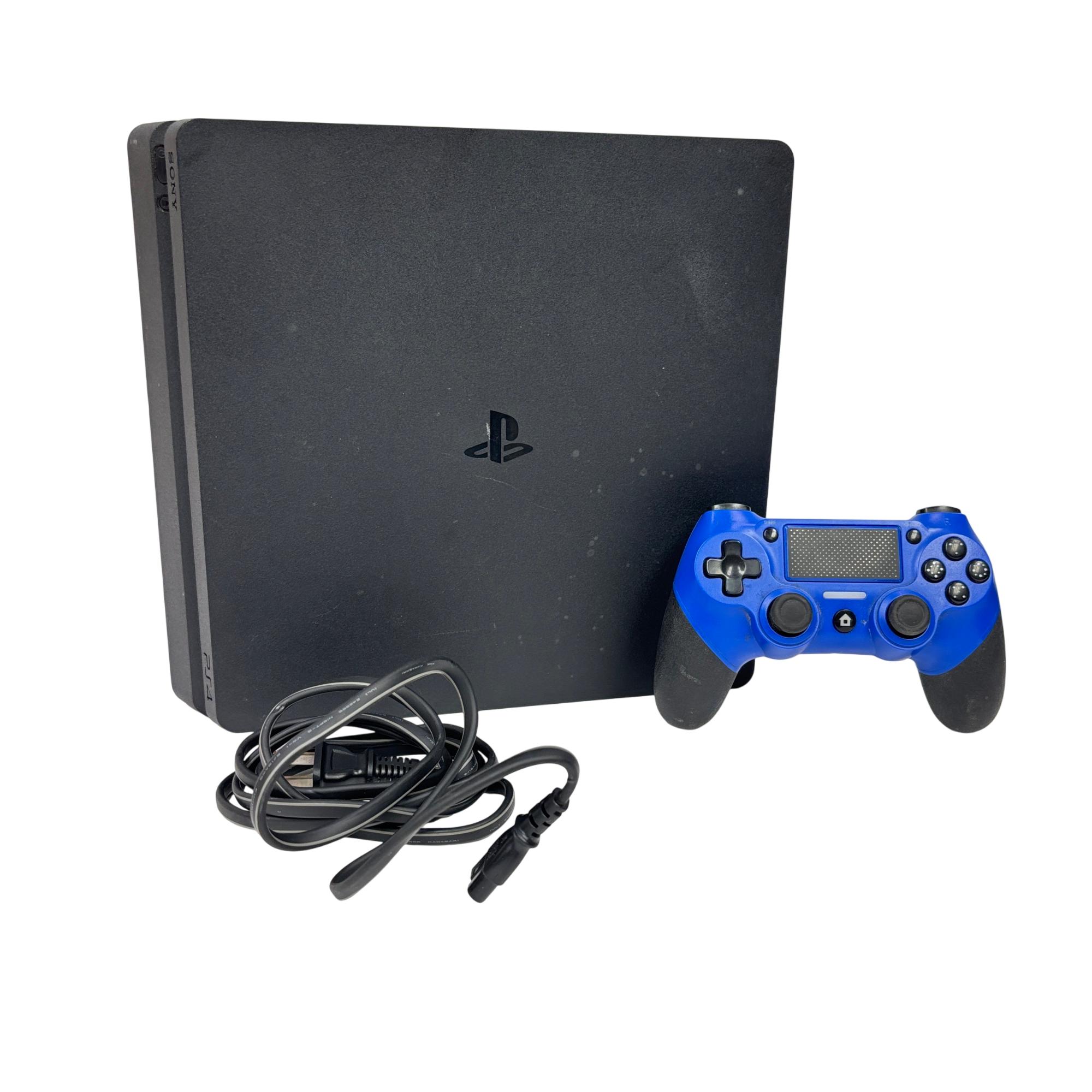 This Sony PlayStation 4 Slim 1TB delivers an immersive gaming experience with its sleek black design and spacious 1TB hard drive for ample storage. The console features multiple ports for connectivity and comes with a blue DualShock 4 controller designed for responsive gameplay and enhanced control.