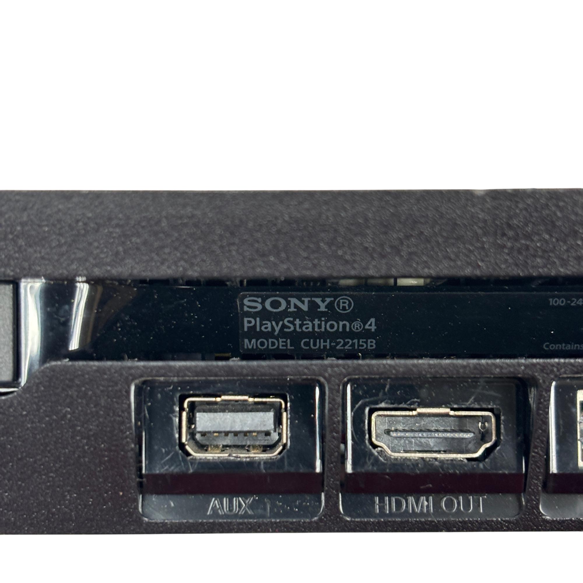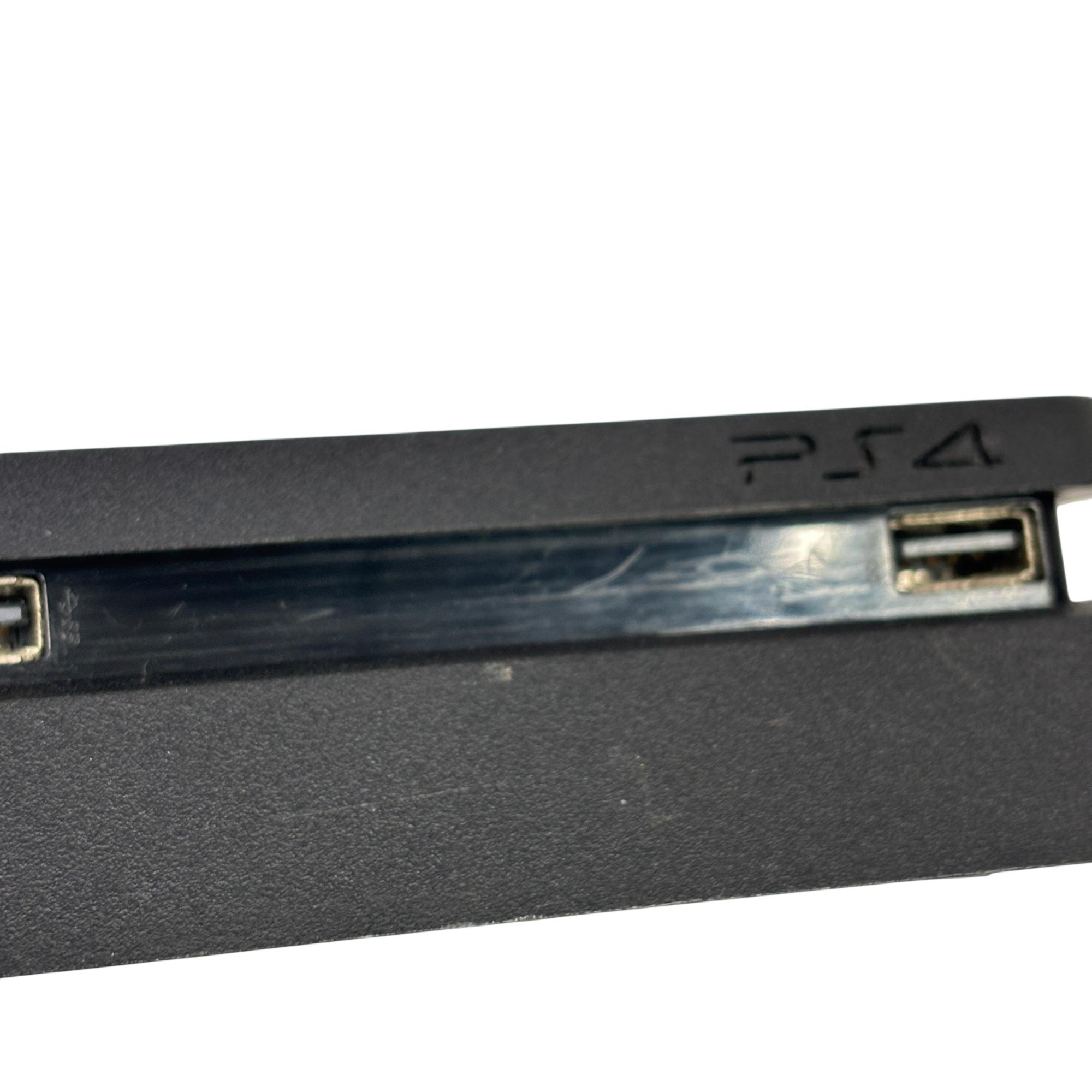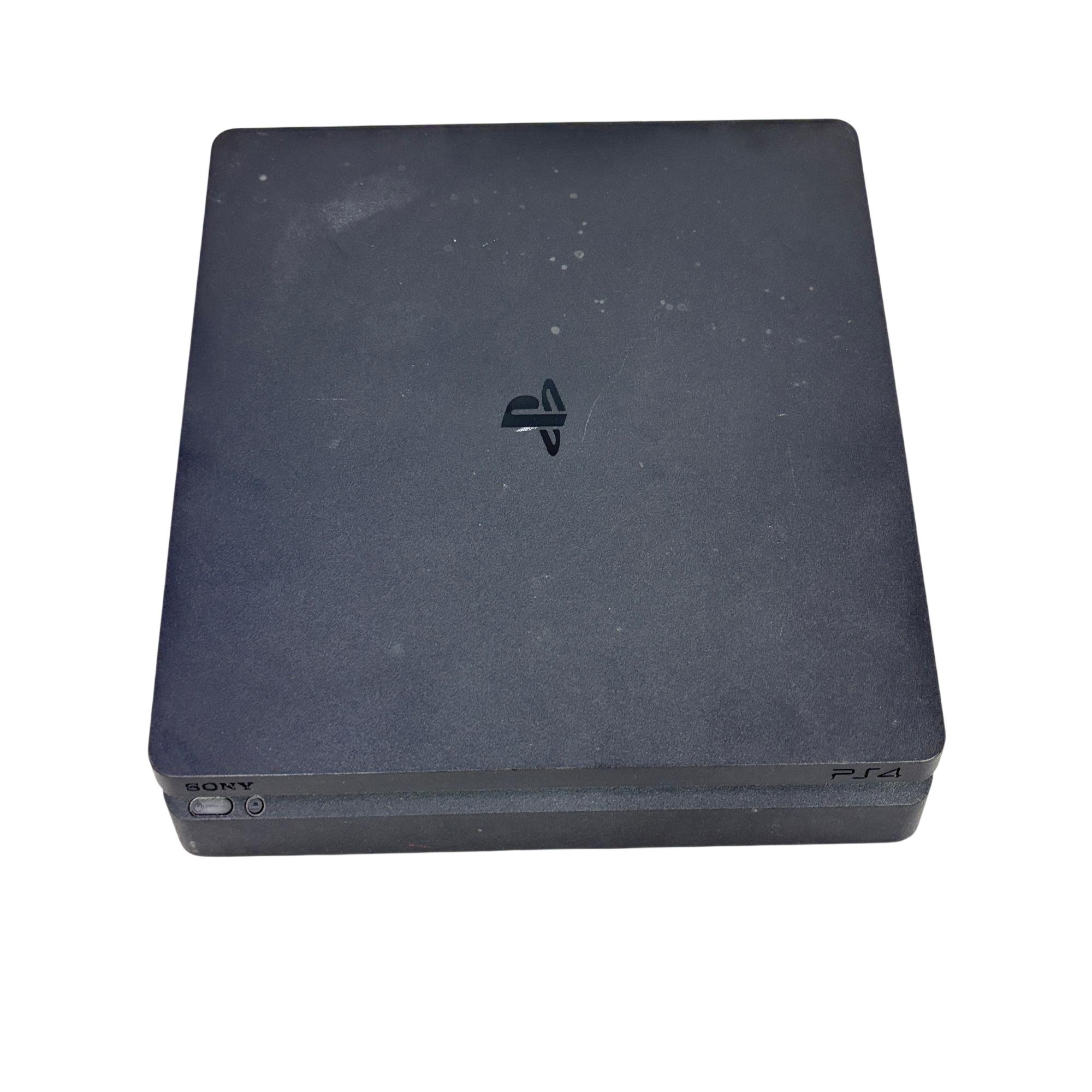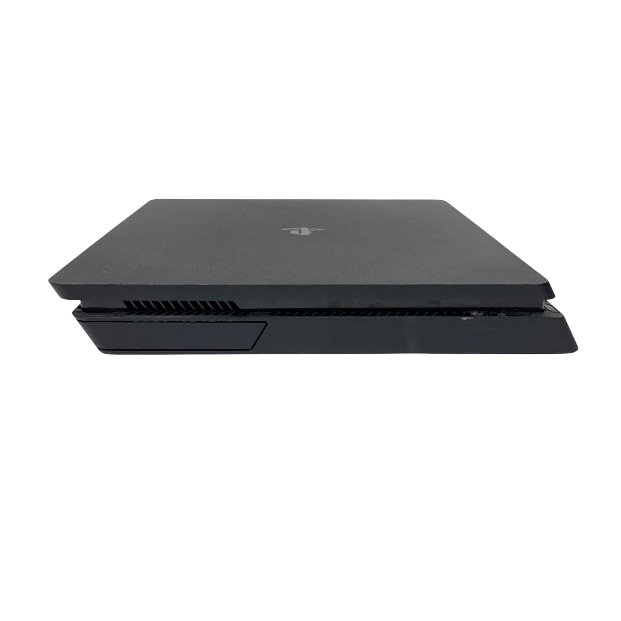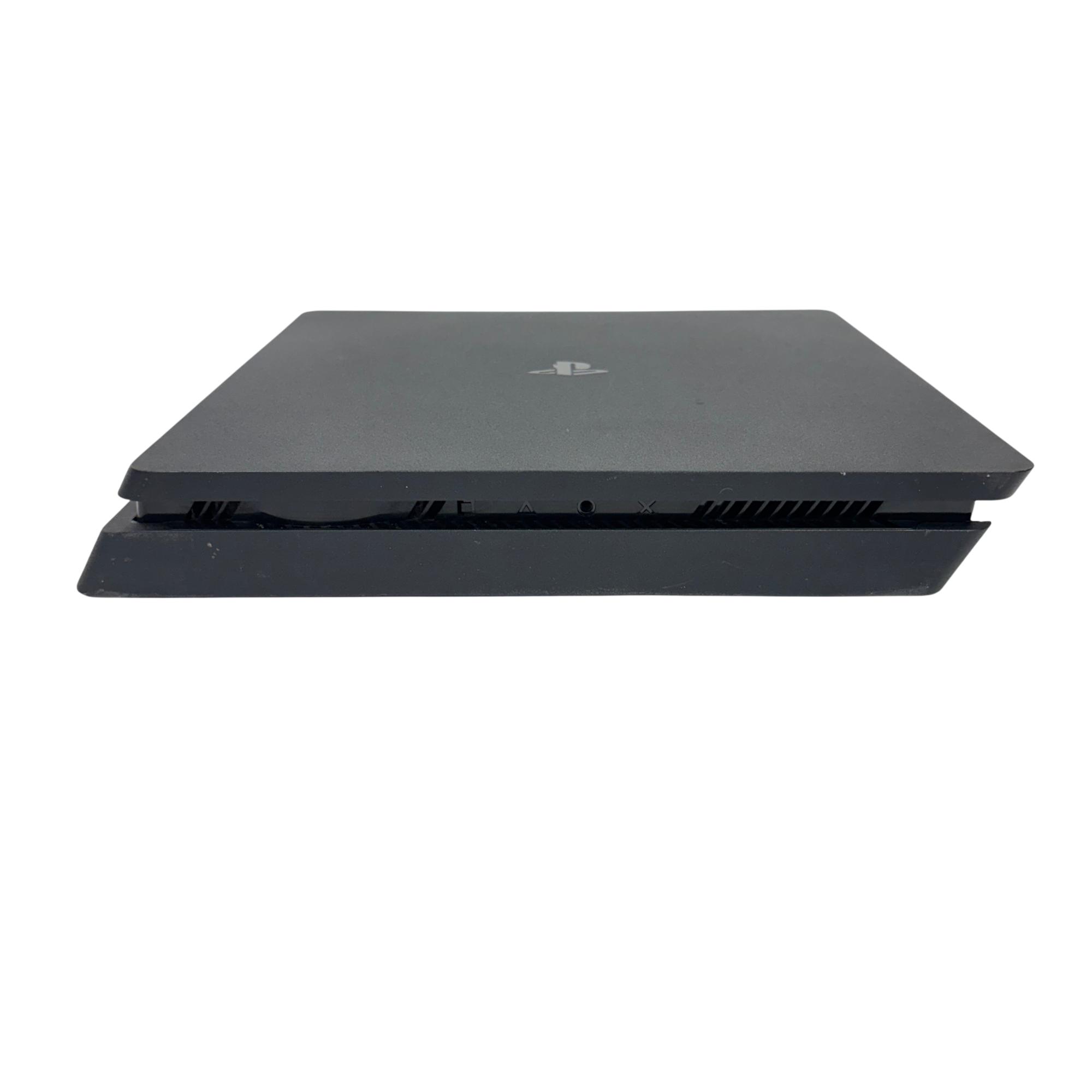 This Sony PlayStation 4 Slim 1TB delivers an immersive gaming experience with its sleek black design and spacious 1TB hard drive for ample storage. The console features multiple ports for connectivity and comes with a blue DualShock 4 controller designed for responsive gameplay and enhanced control.
