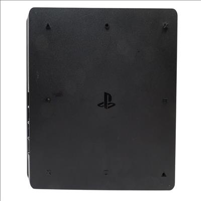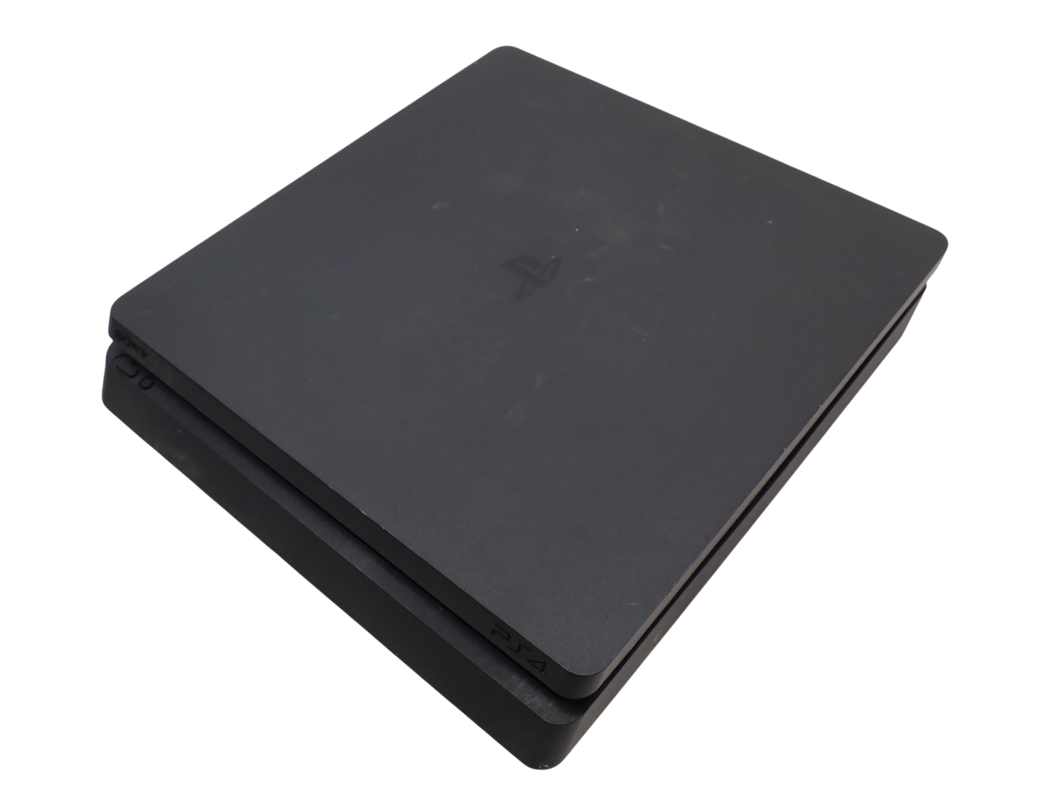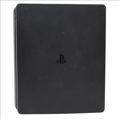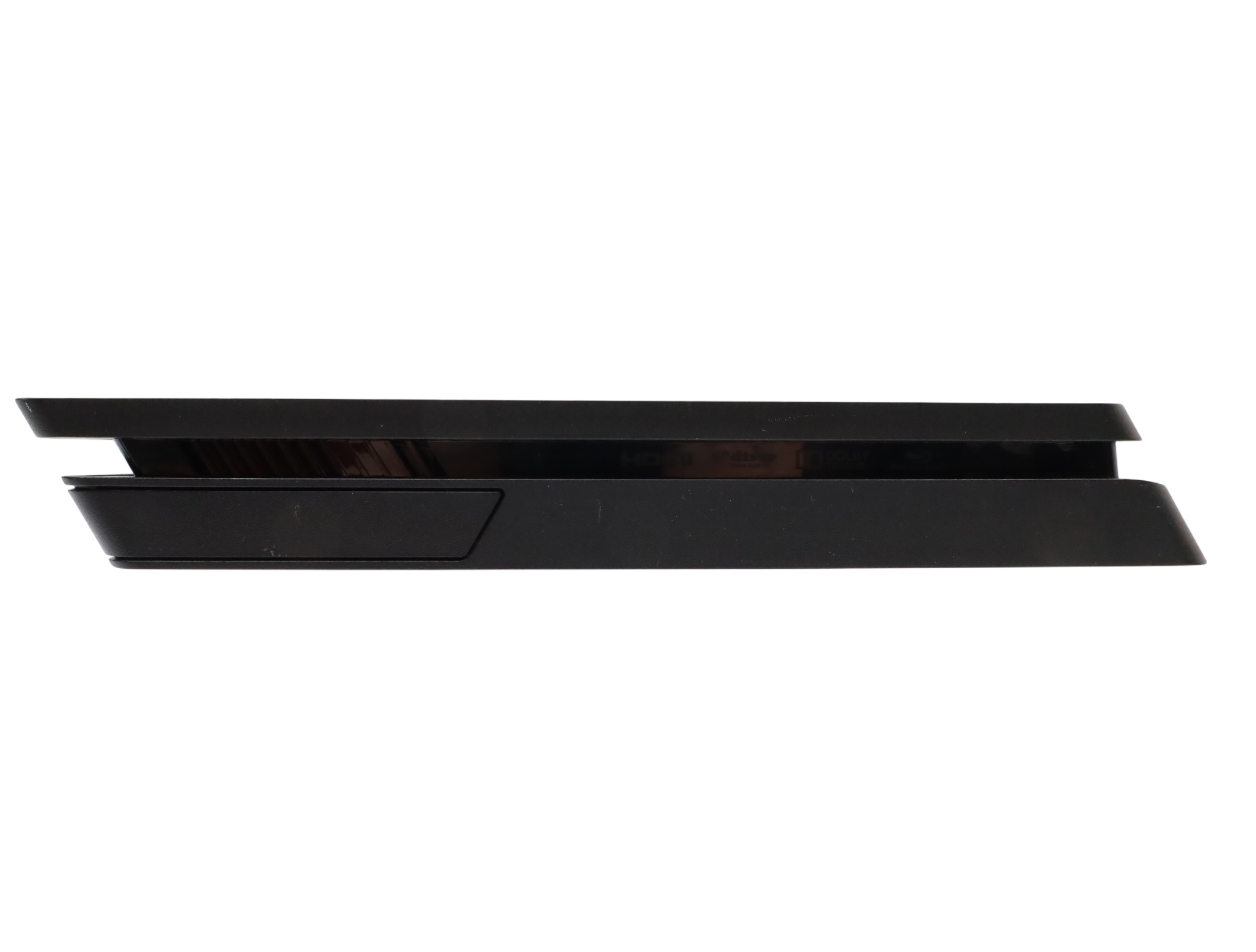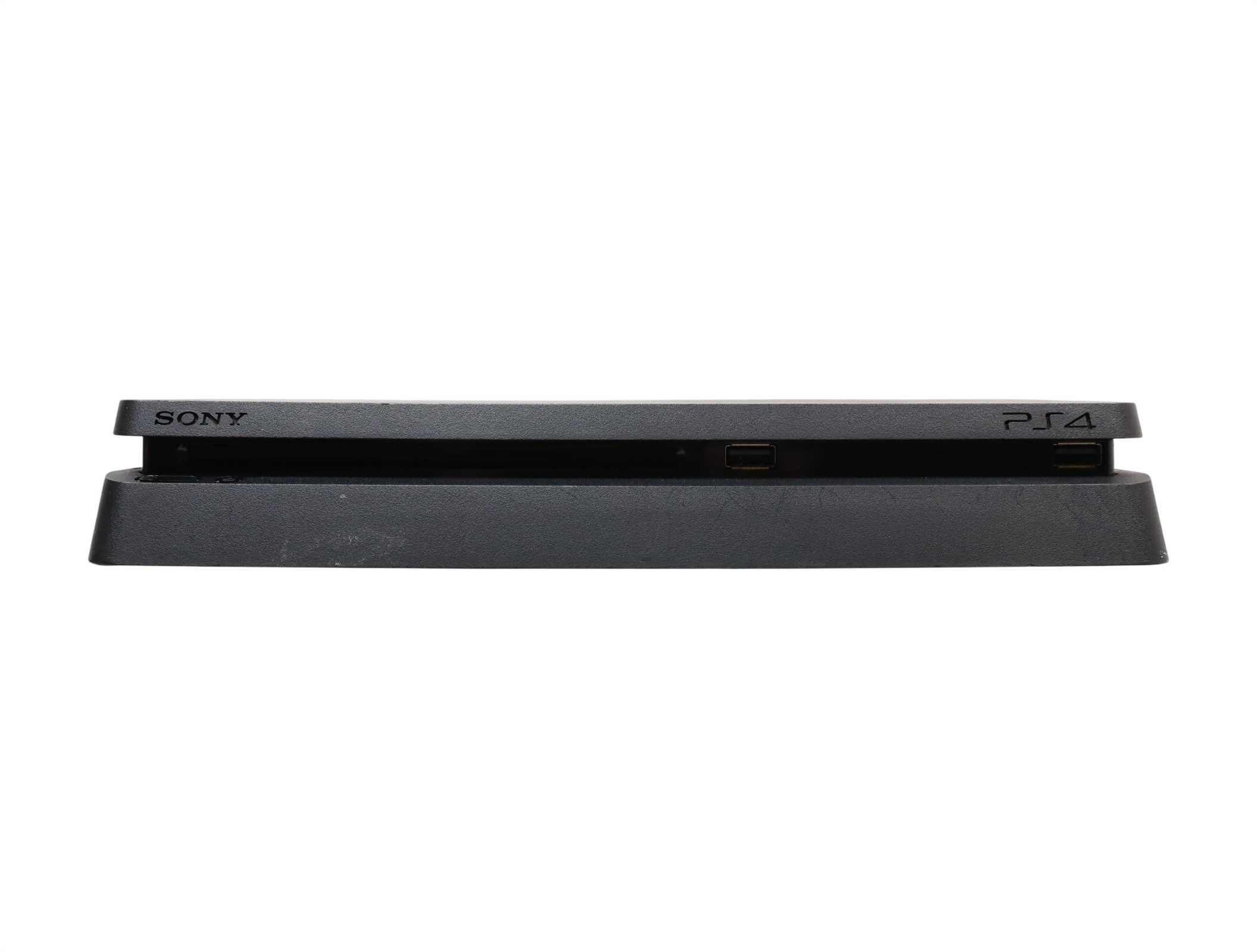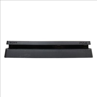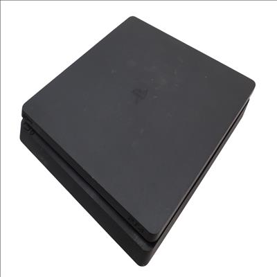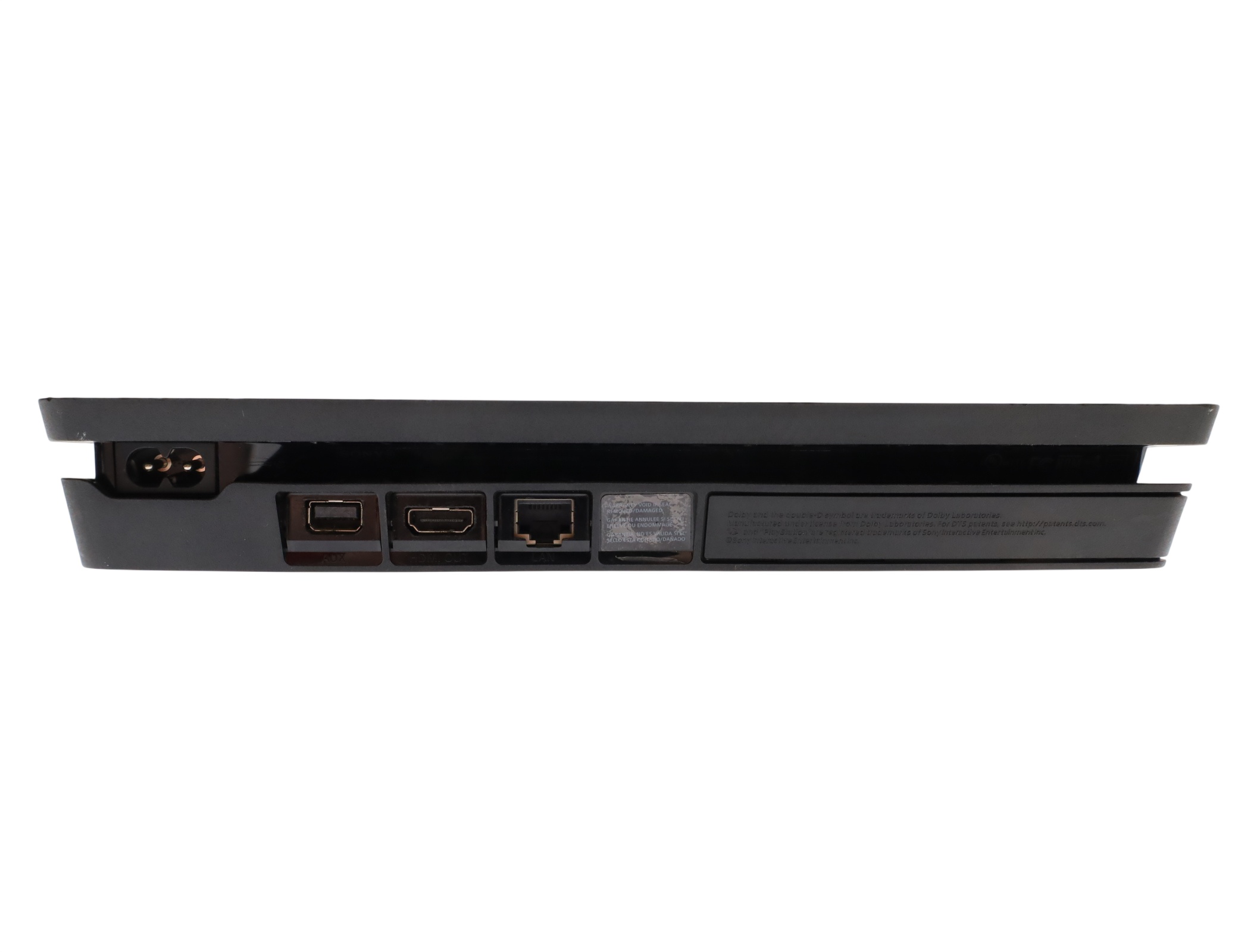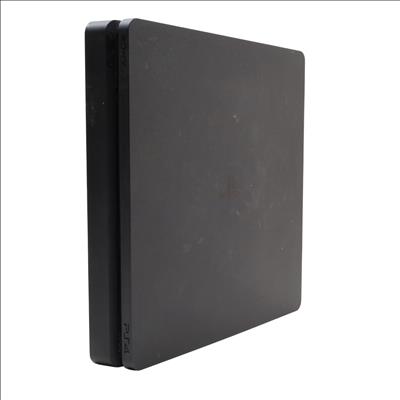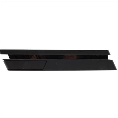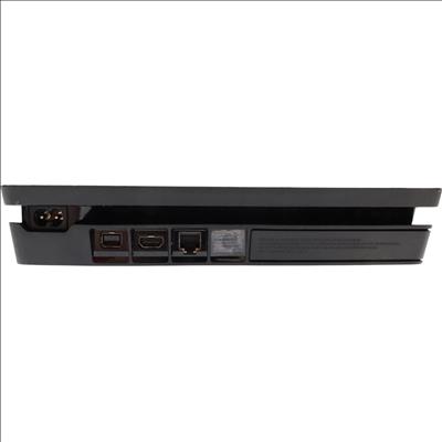 A compact home console finished in black and equipped with a 500GB hard drive for storing games, apps, and media. It features an eight-core x86-64 processor paired with a 1.84 TFLOPS graphics engine and 8GB of GDDR5 unified system memory, supporting smooth performance across a wide range of titles. The system offers access to digital games, streaming services, and curated content, with a design that provides the same core PS4 functionality in a lighter, slimmer form factor. Ports include HDMI, Ethernet, two USB 3.1 Gen 1 ports, and an AUX port for accessories.