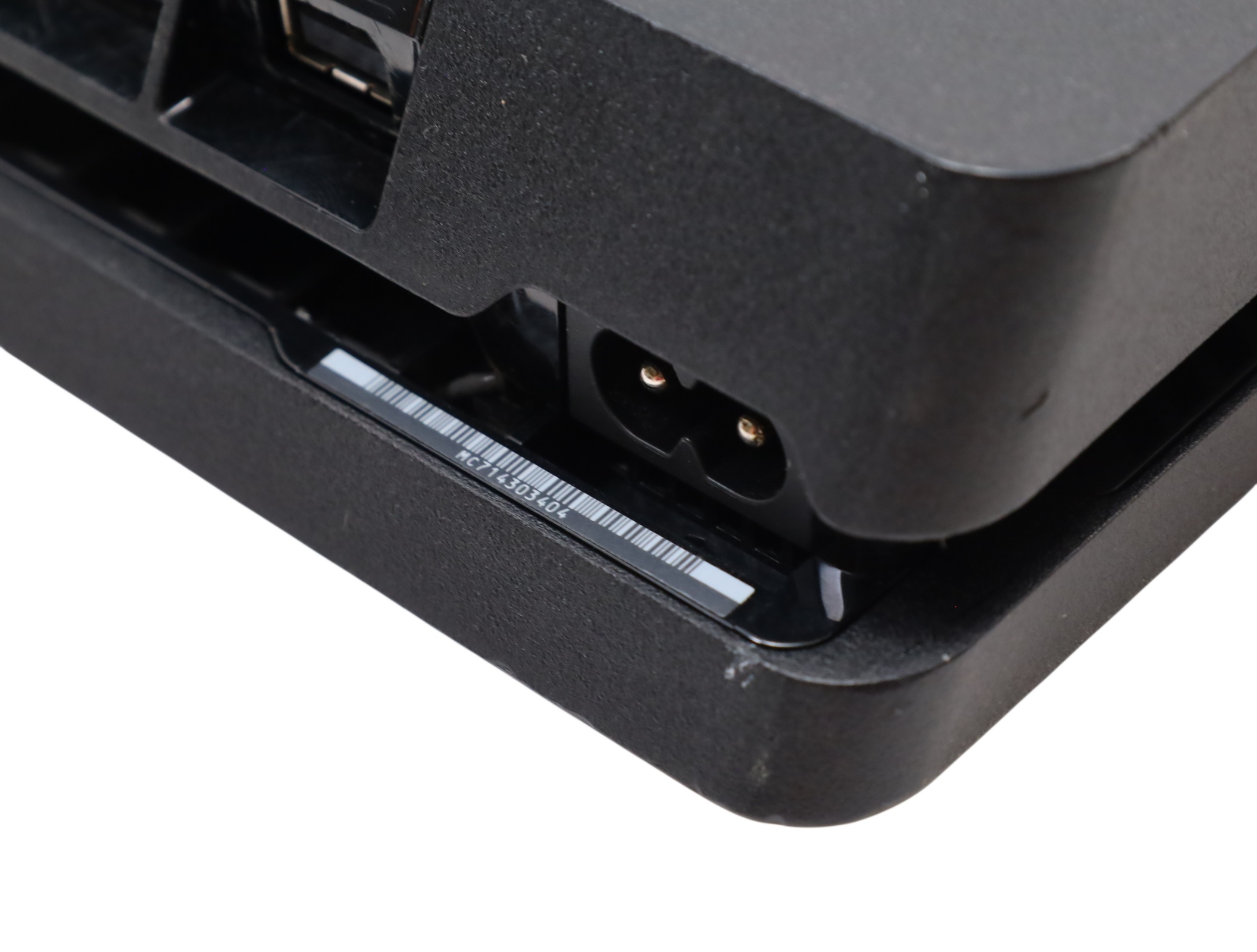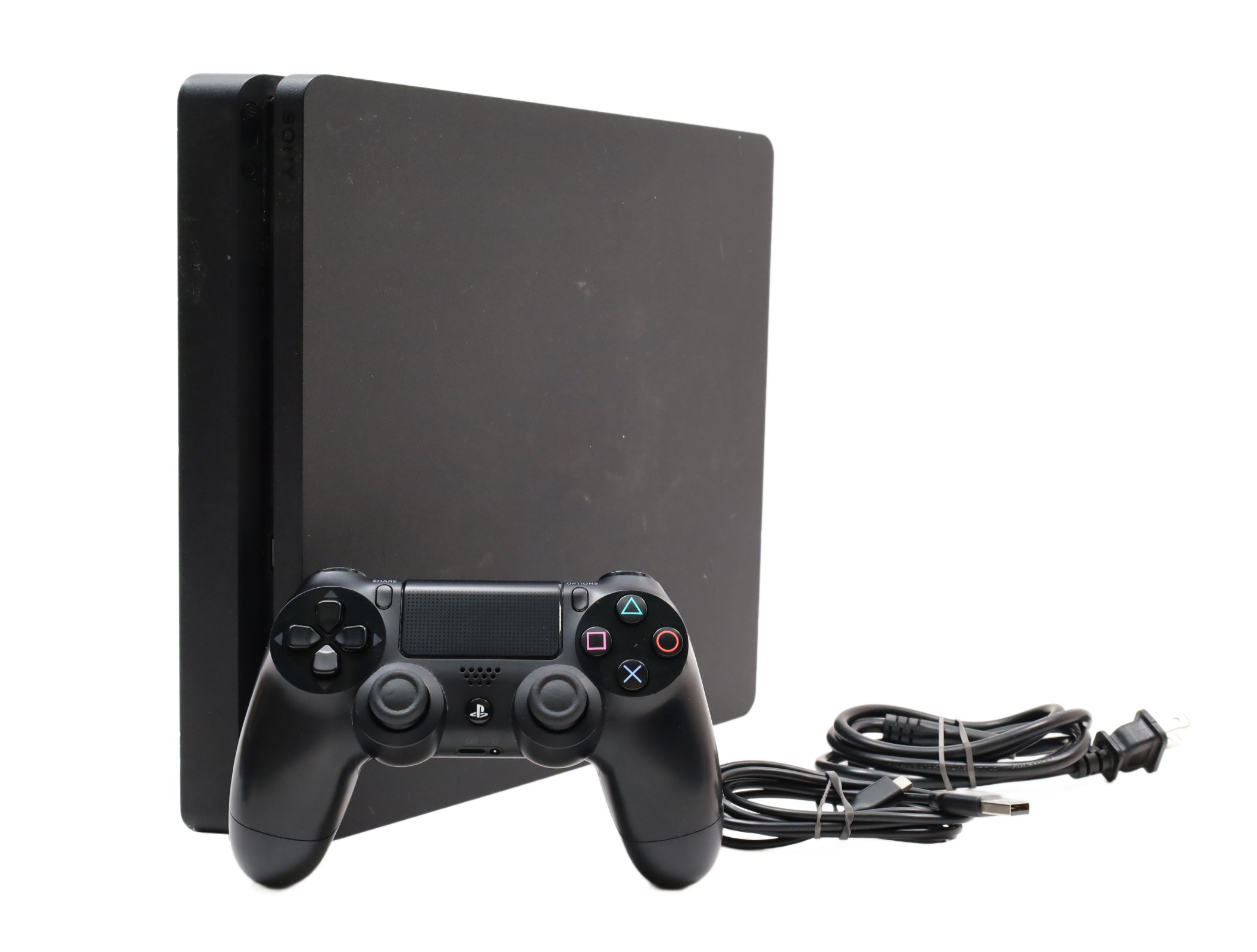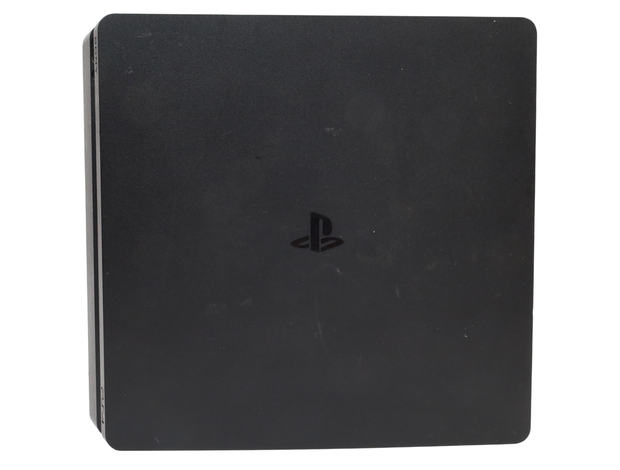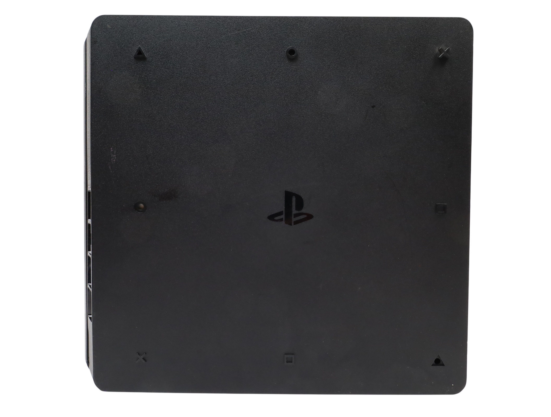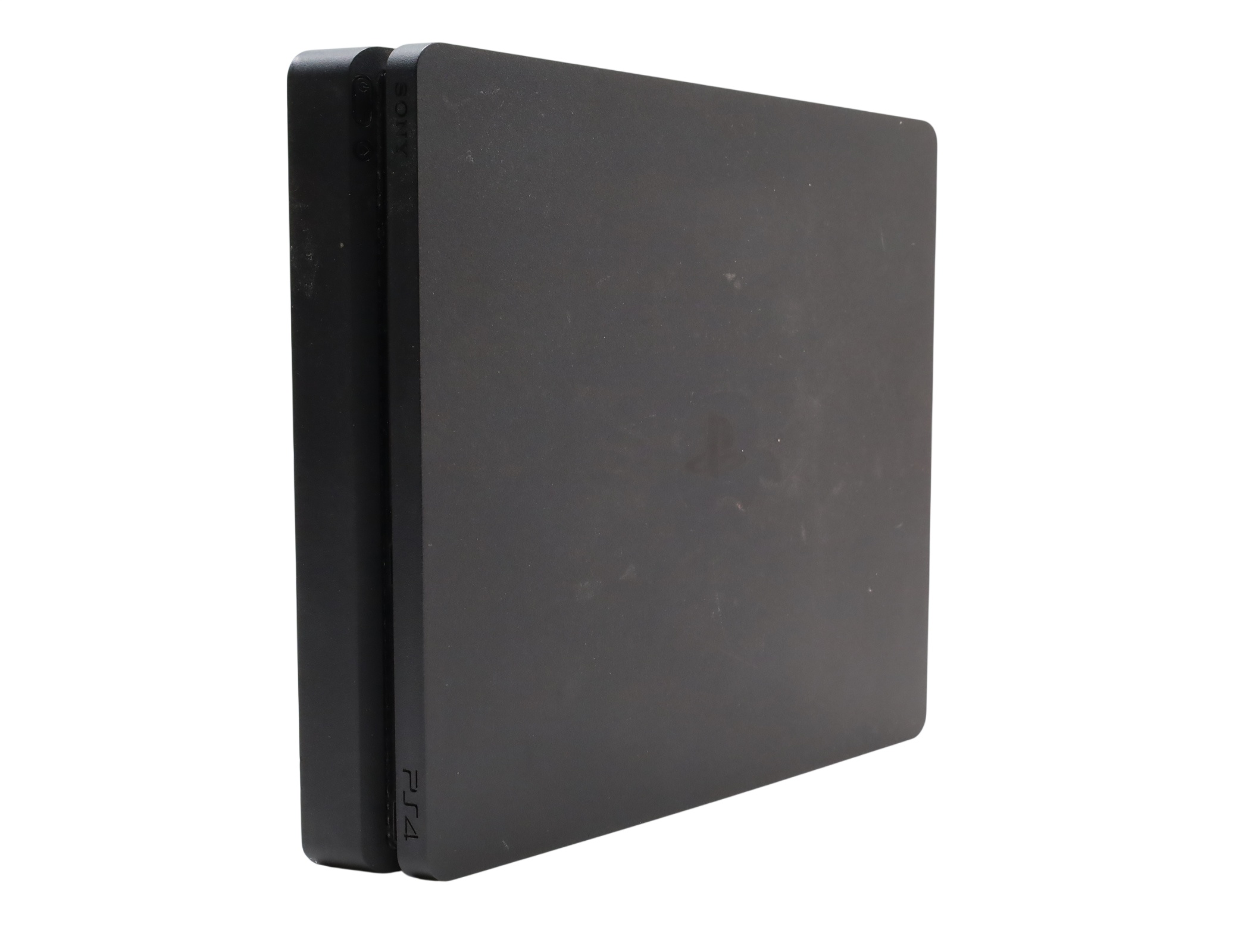 A compact home console finished in black and equipped with a 500GB hard drive for storing games, apps, and media. It features an eight-core x86-64 processor paired with a 1.84 TFLOPS graphics engine and 8GB of GDDR5 unified system memory, supporting smooth performance across a wide range of titles. The system offers access to digital games, streaming services, and curated content, with a design that provides the same core PS4 functionality in a lighter, slimmer form factor. Ports include HDMI, Ethernet, two USB 3.1 Gen 1 ports, and an AUX port for accessories.