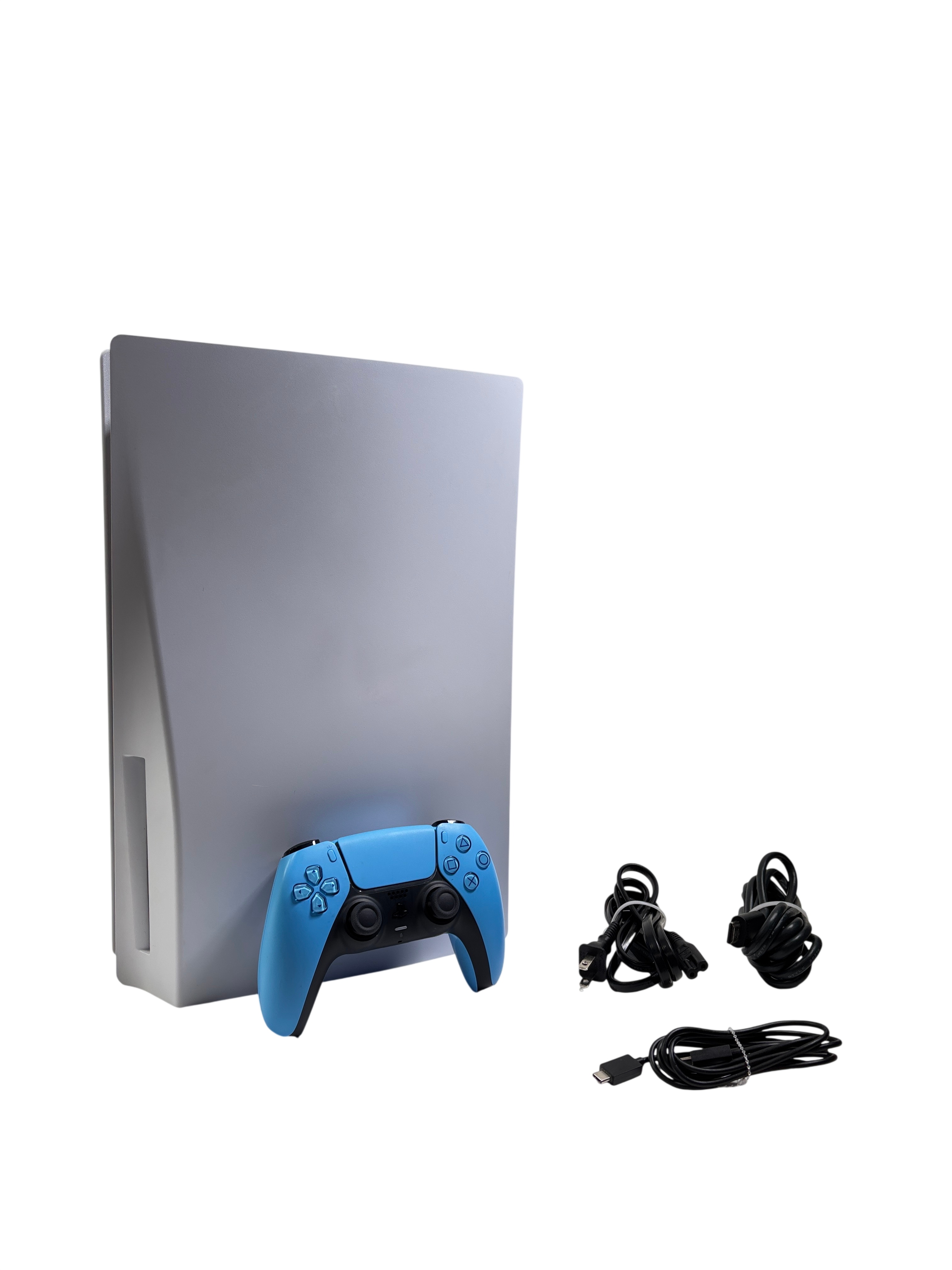 Sony PlayStation 5 Disk Edition Console (Model CFI-1015A) offers next-generation gaming with ultra-fast SSD storage and stunning 4K graphics. This set includes the console, a blue DualSense wireless controller, power cord, HDMI cable, and USB charging cable, providing everything needed to start gaming immediately. The PS5 supports ray tracing, HDR, and backward compatibility with many PS4 titles, making it a versatile and powerful entertainment system. Its sleek white and black design fits seamlessly into modern entertainment setups.