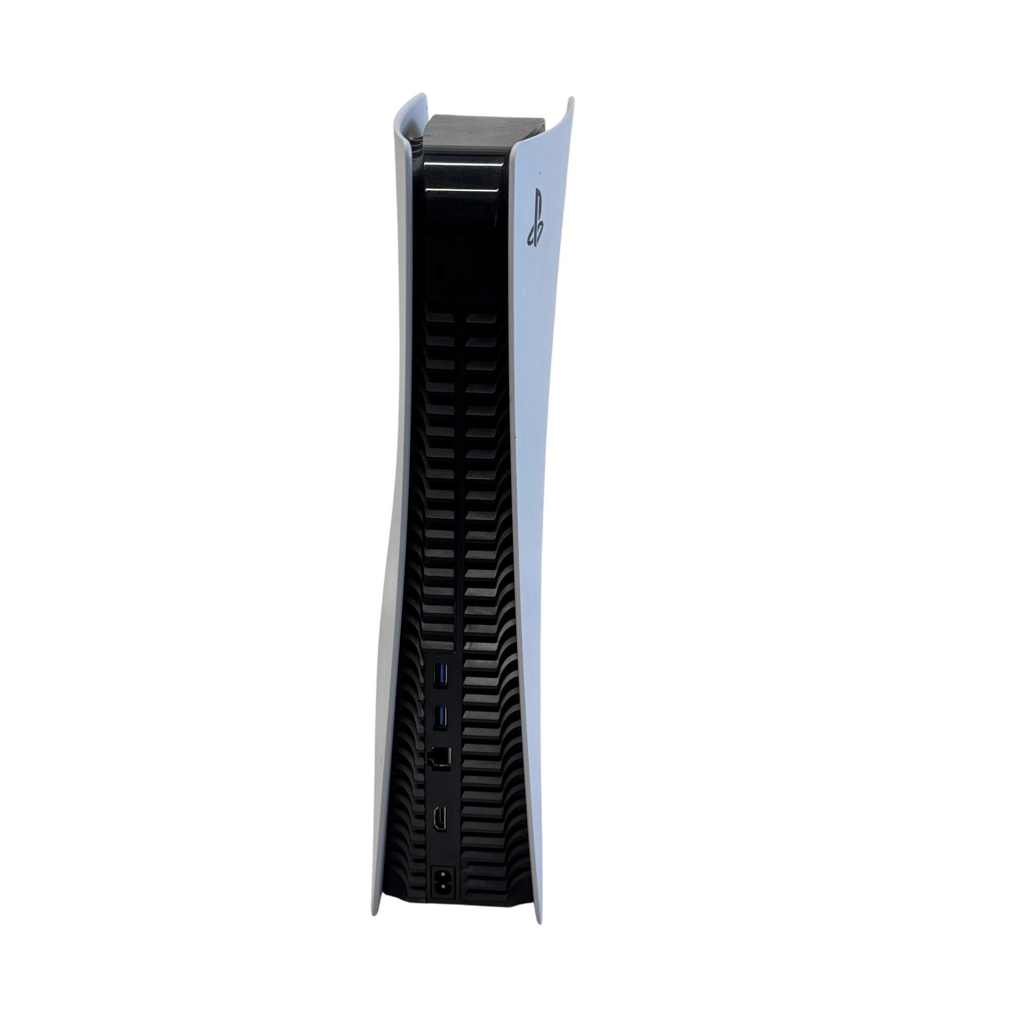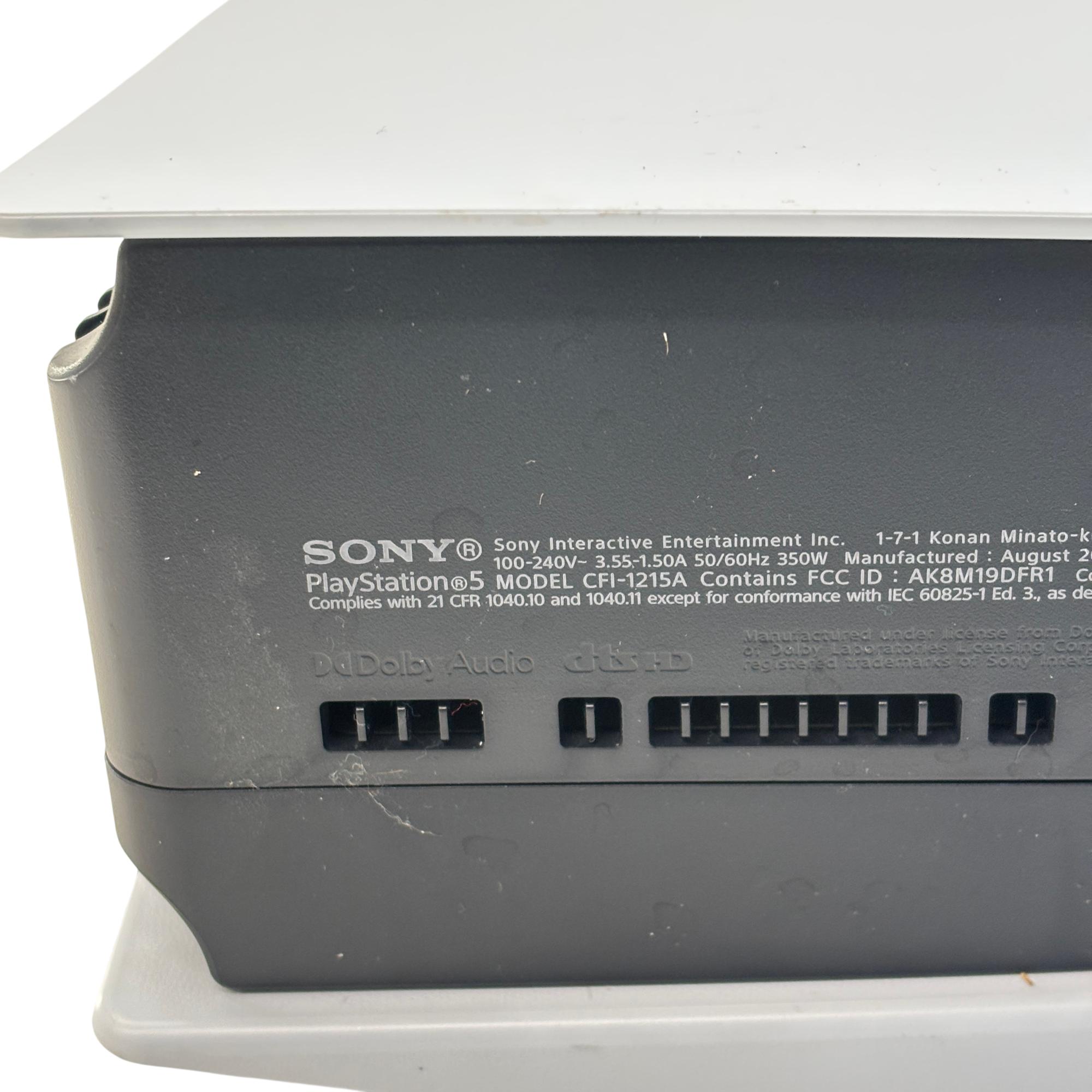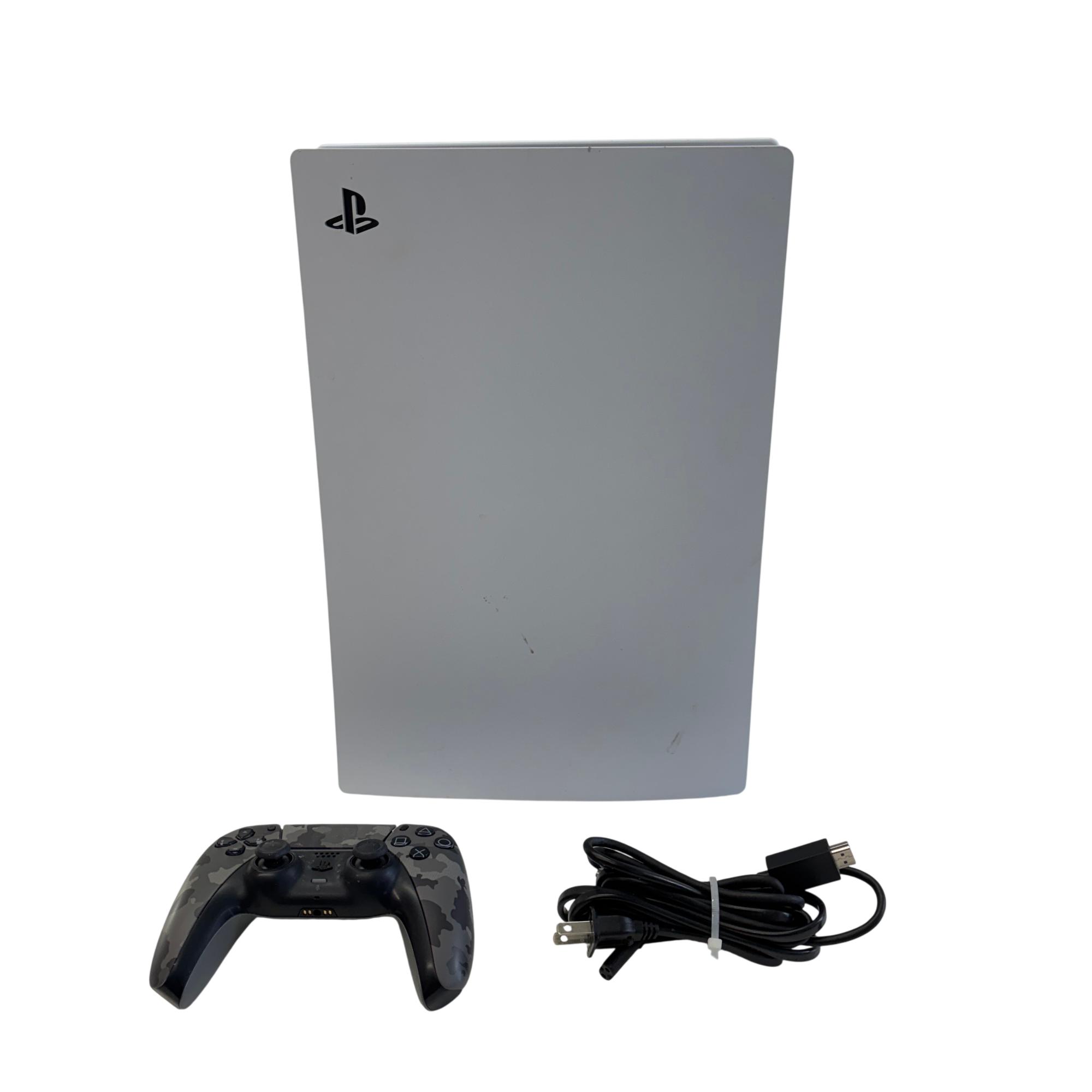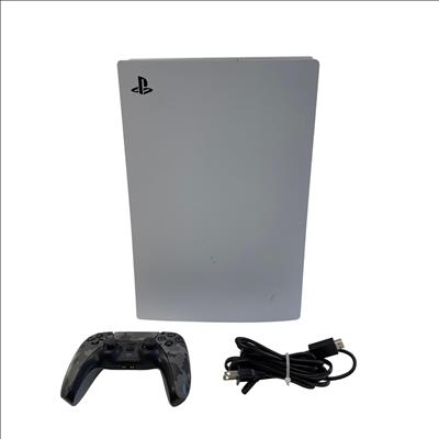 Sony PlayStation 5 Disc Edition CFI-1215A 825GB Console with Camouflage DualSense Controller features a sleek white design with black accents and an 825GB SSD for fast loading of games and applications. This console supports 4K UHD gaming and includes a DualSense wireless controller with adaptive triggers and enhanced haptic feedback for immersive gameplay experiences.