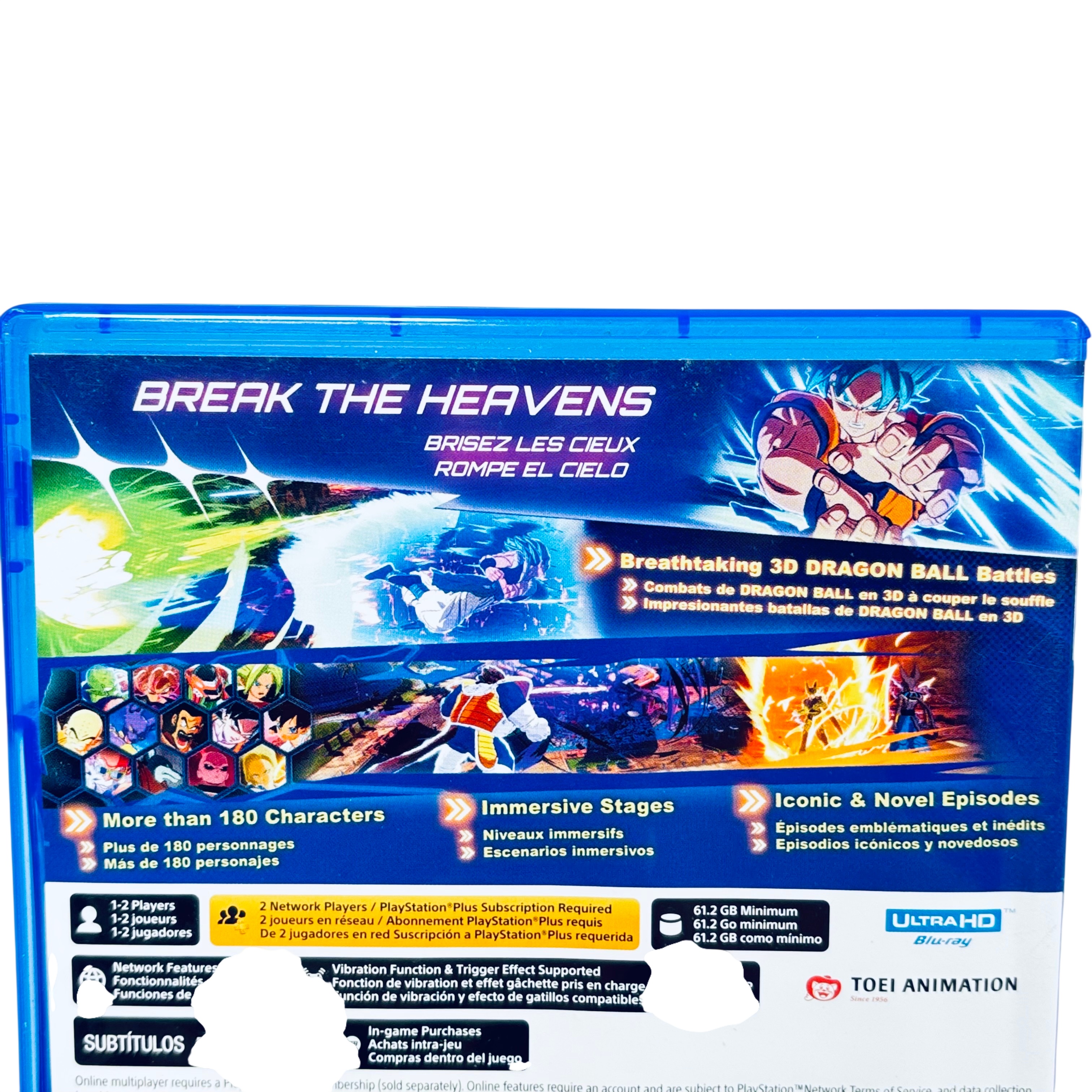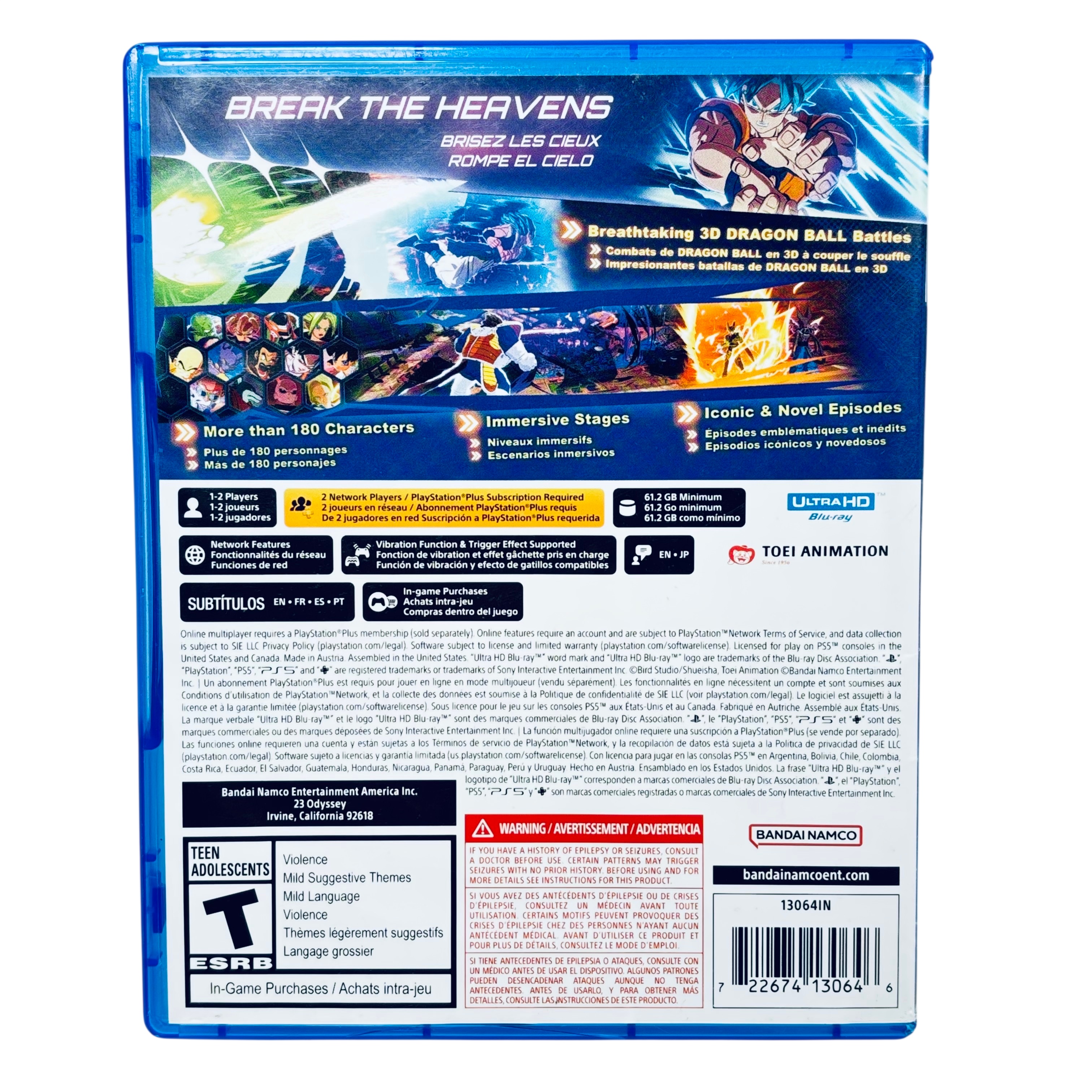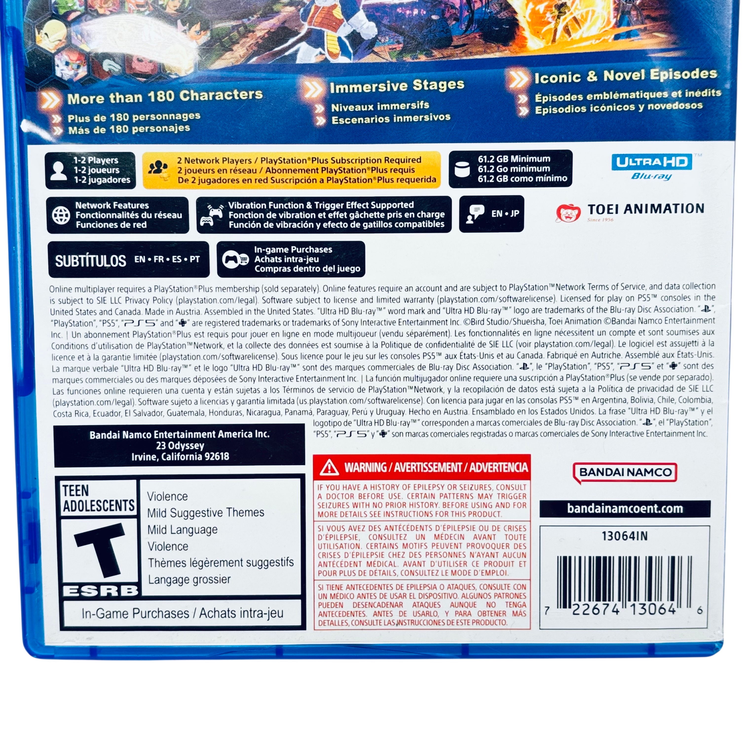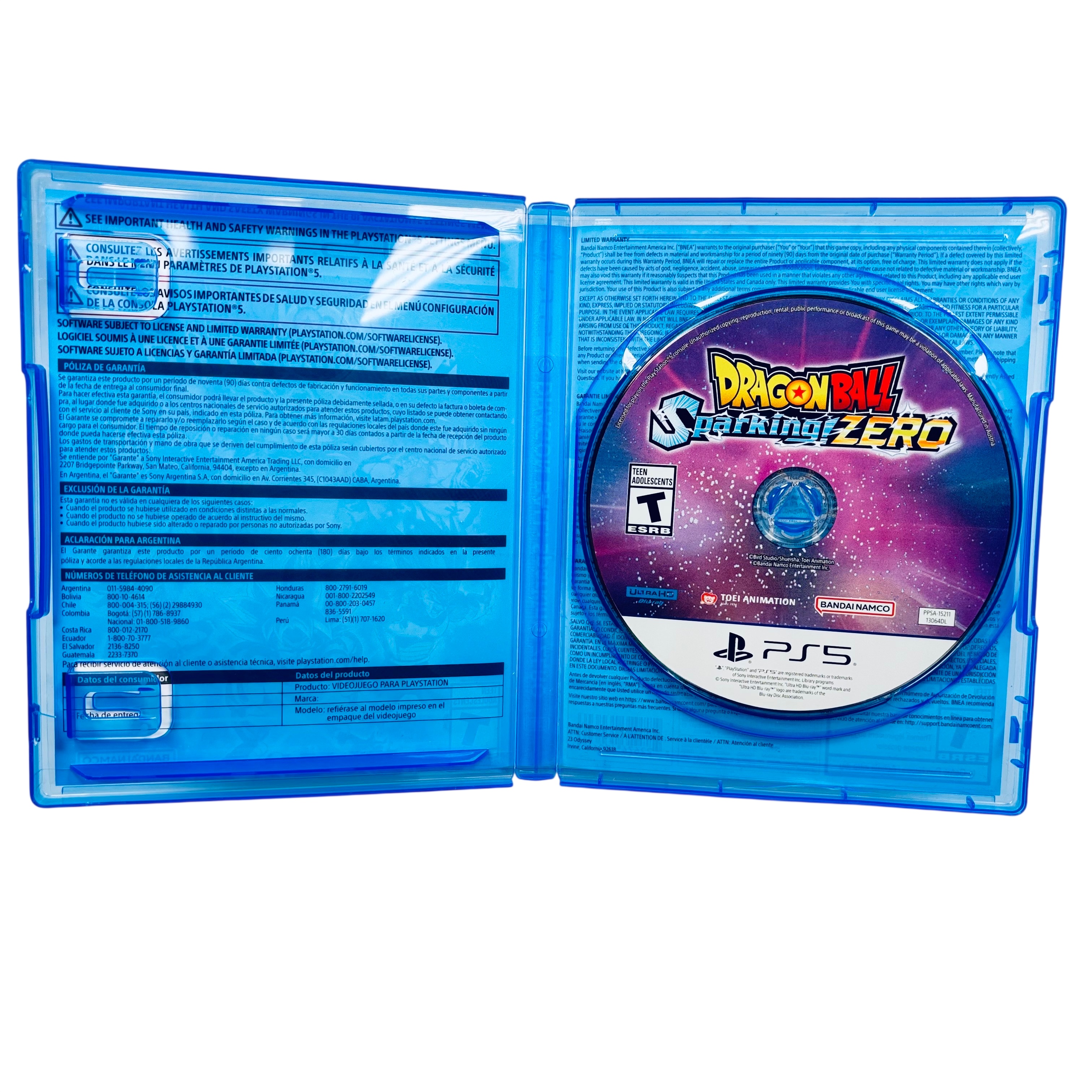 Sony Dragon Ball: Sparking Zero for PlayStation 5 (Model 722674130646) is an immersive fighting game featuring breathtaking 3D battles with over 180 characters from the Dragon Ball universe. This PS5 game disc requires 61.2 GB of storage and supports both local and online multiplayer modes, with online play requiring a PlayStation Plus subscription. The game includes iconic episodes and novel storylines, enhanced with vibration and trigger effects for an engaging gameplay experience. Packaged in a standard PS5 Blu-ray case, this game is licensed for use in the US and Canada.
