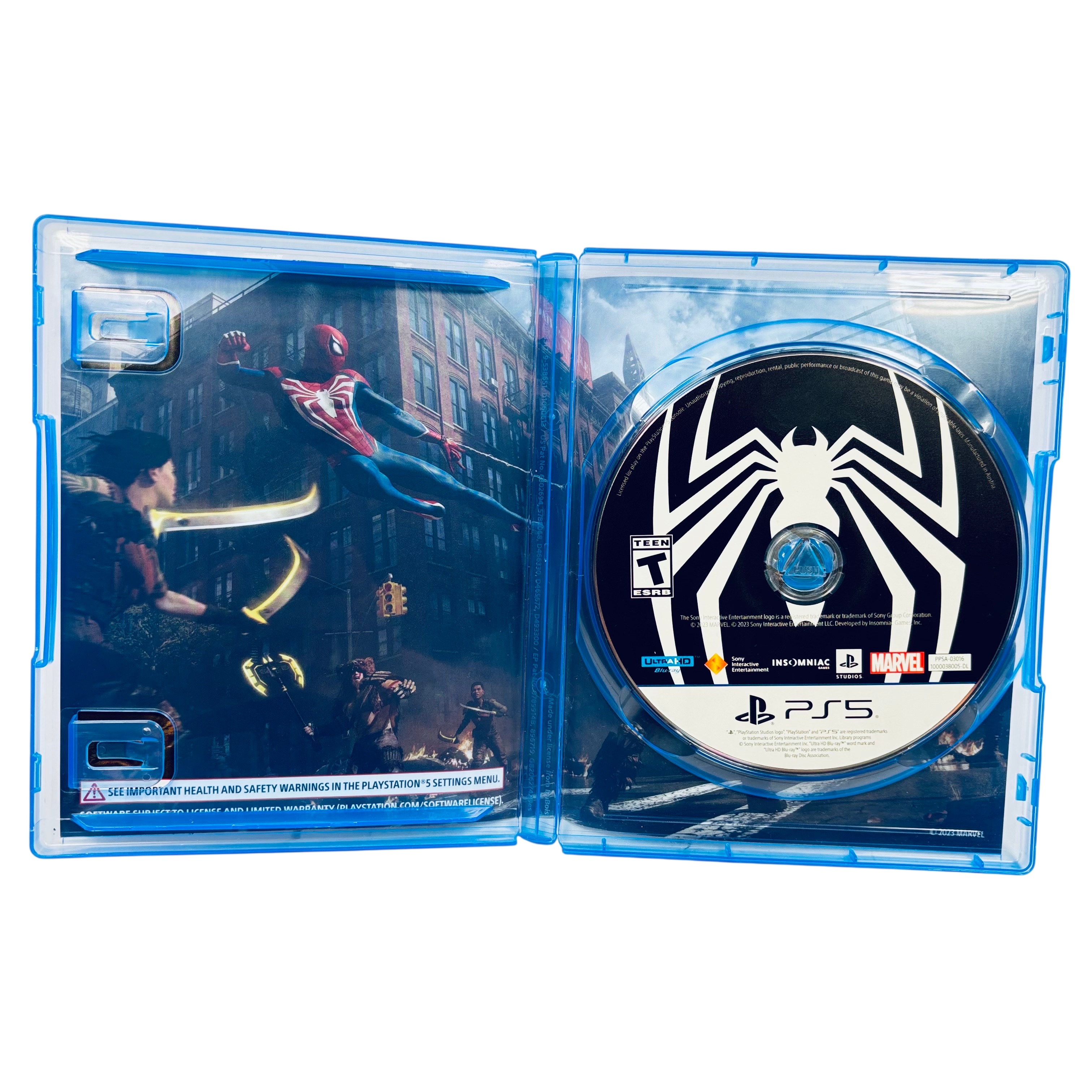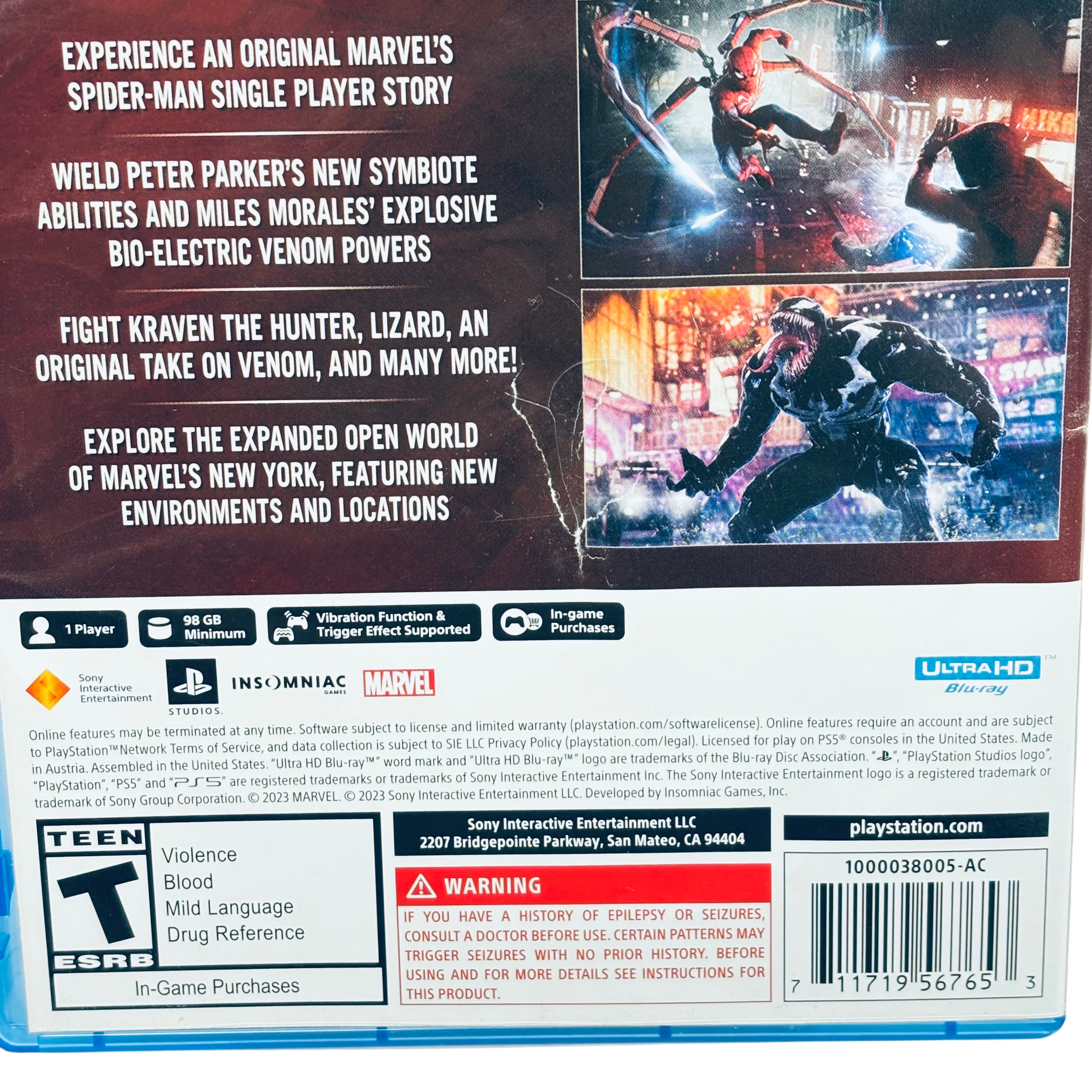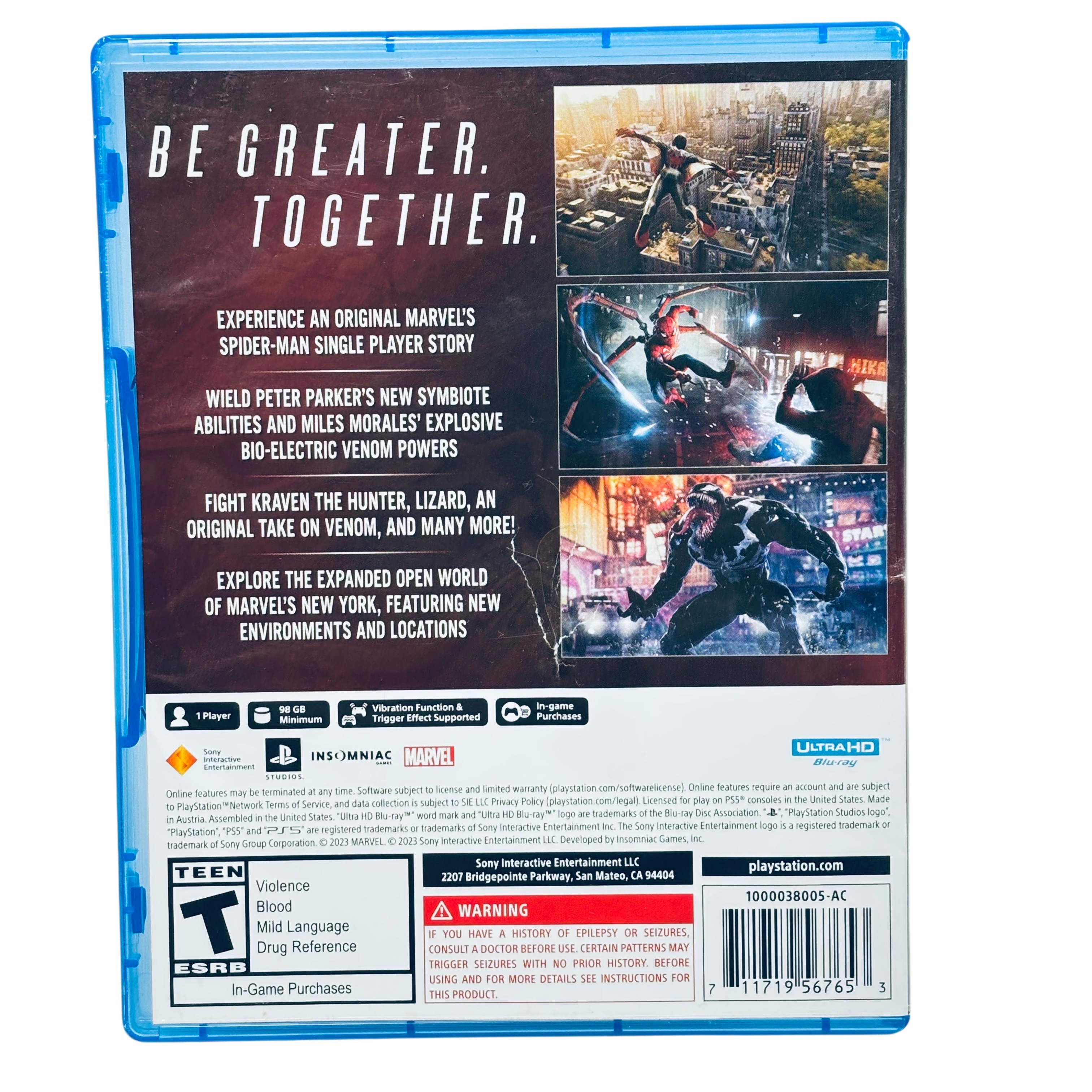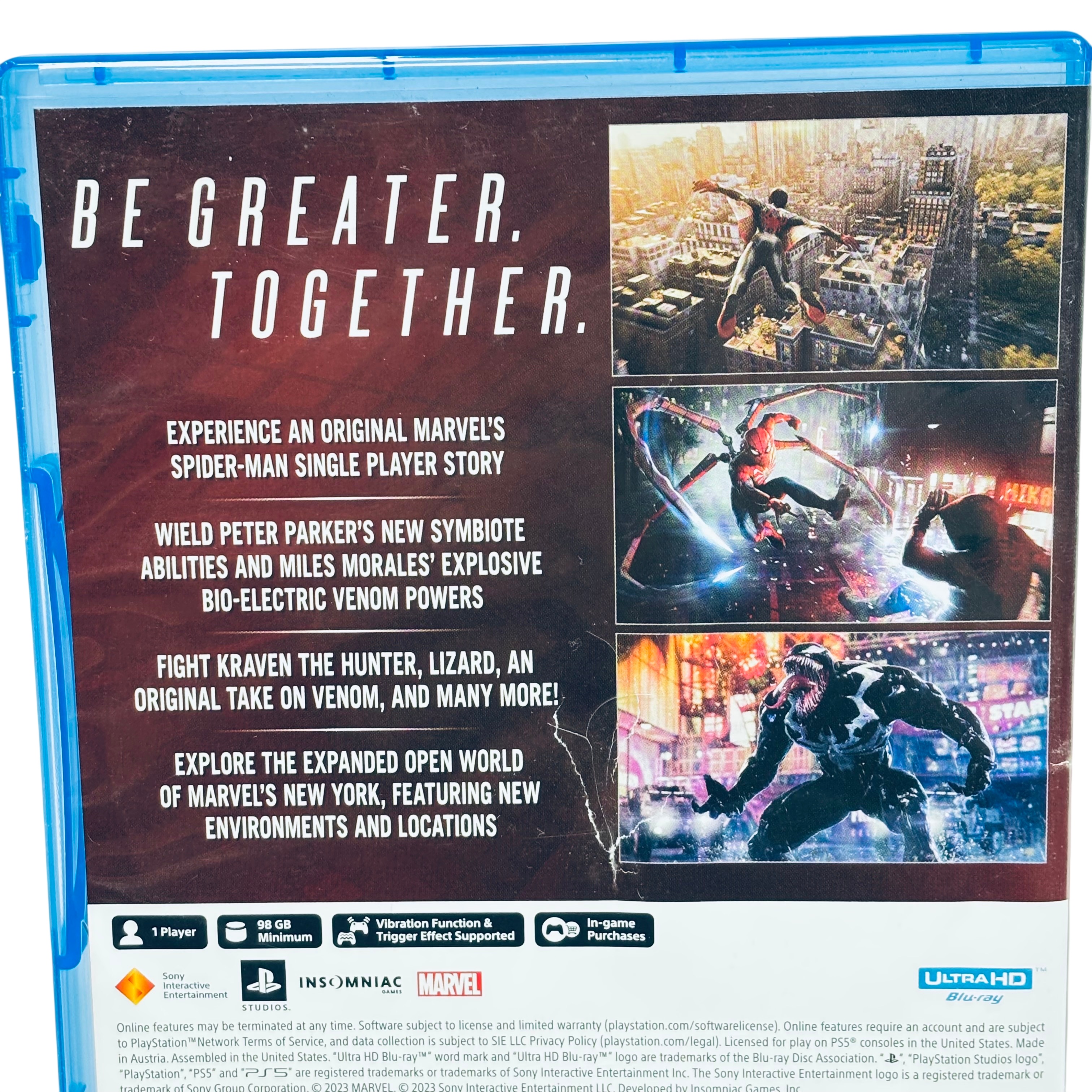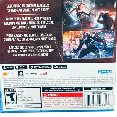 Sony Marvel Spider-Man 2 PS5 Game delivers an original single-player story featuring Peter Parker and Miles Morales with new symbiote and bio-electric venom powers. This action-adventure title requires a minimum of 98 GB storage and supports PS5s vibration and trigger effects for immersive gameplay. Fight classic villains like Kraven the Hunter and Venom while exploring an expanded open world of Marvels New York. The game comes in a standard Ultra HD Blu-ray case compatible with PlayStation 5 consoles.
