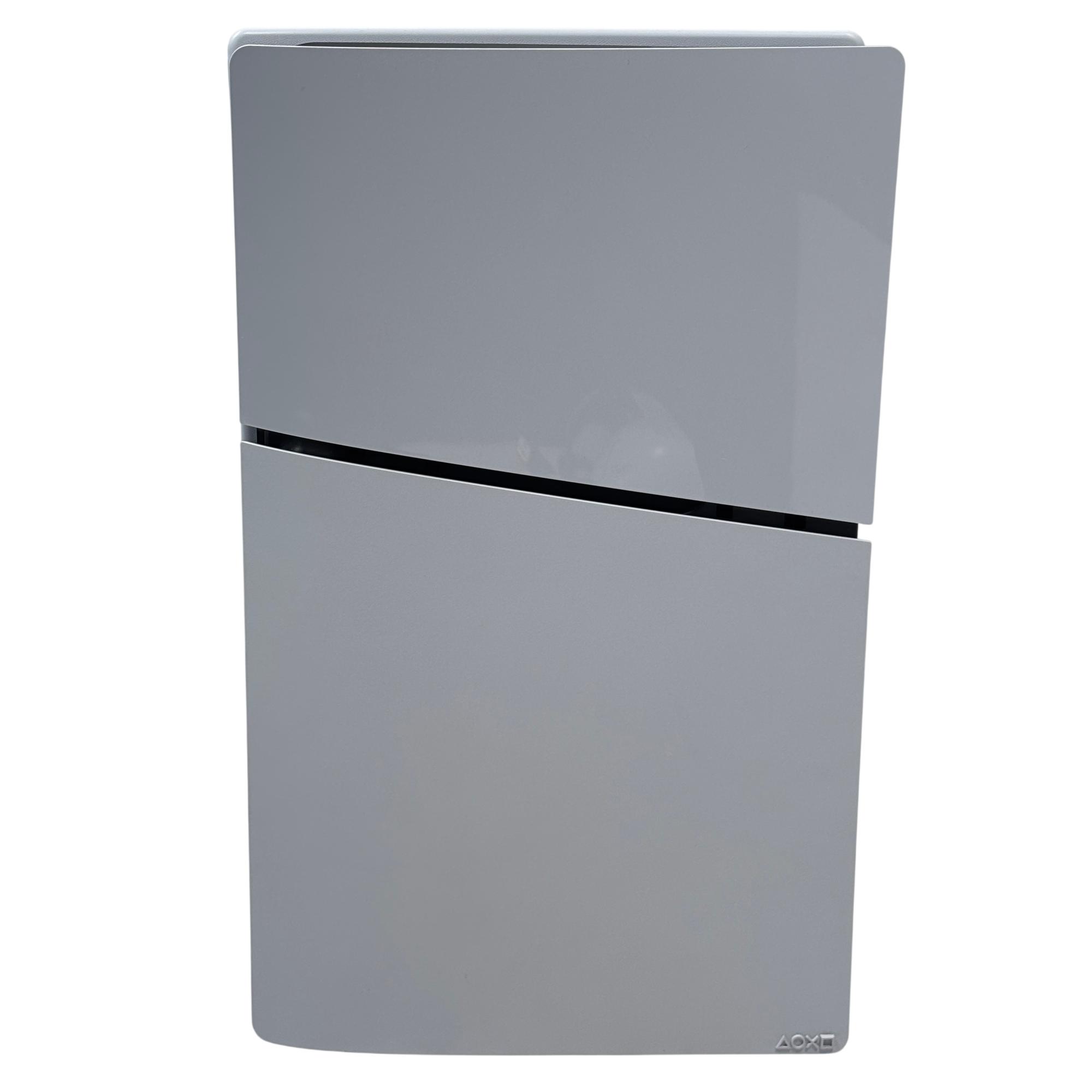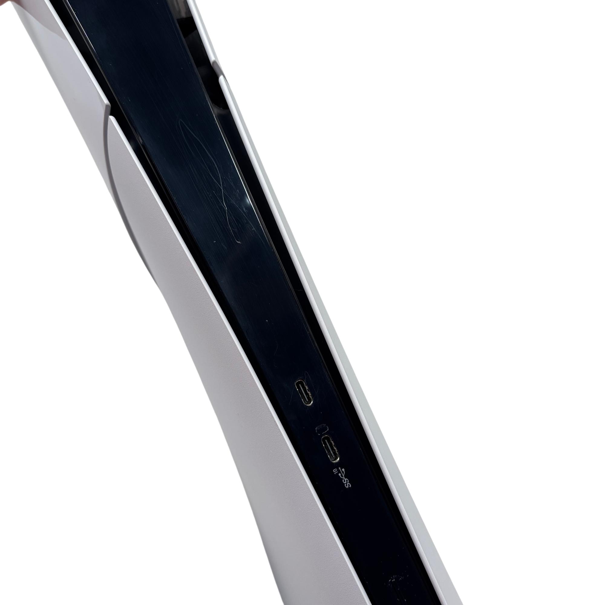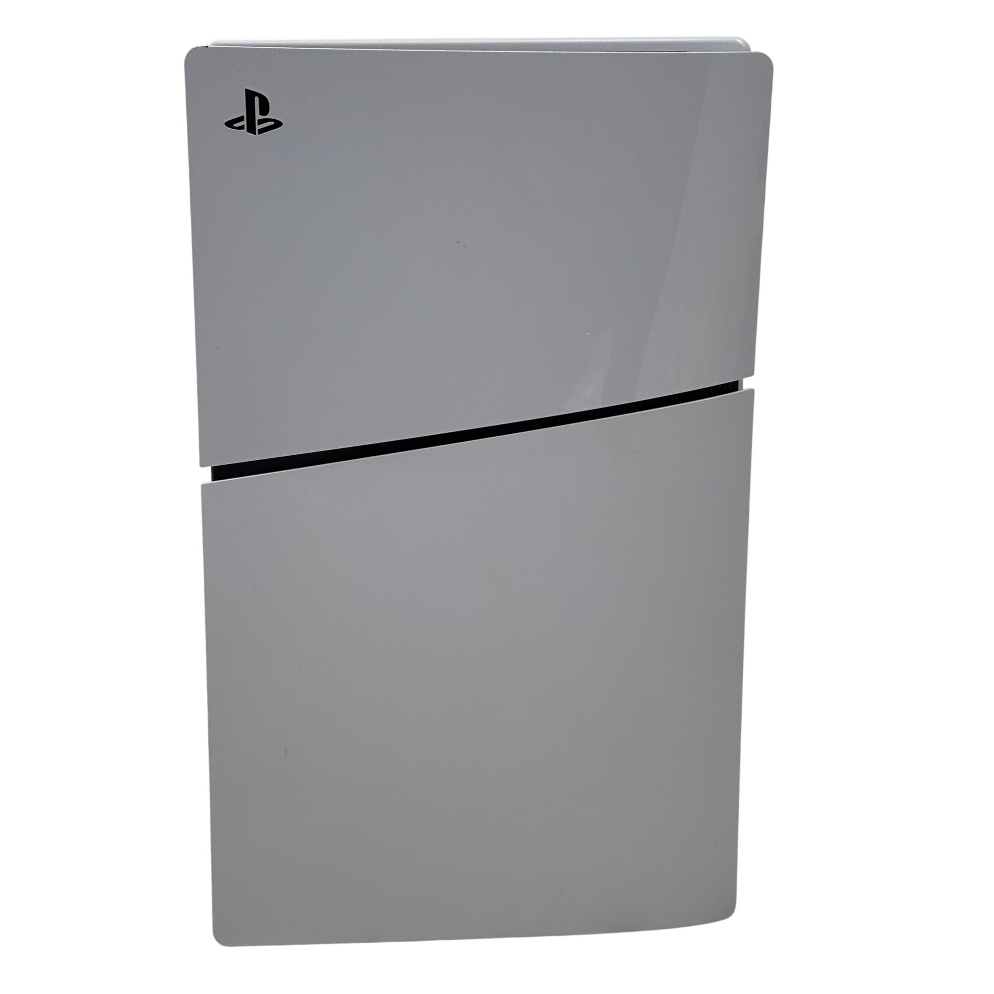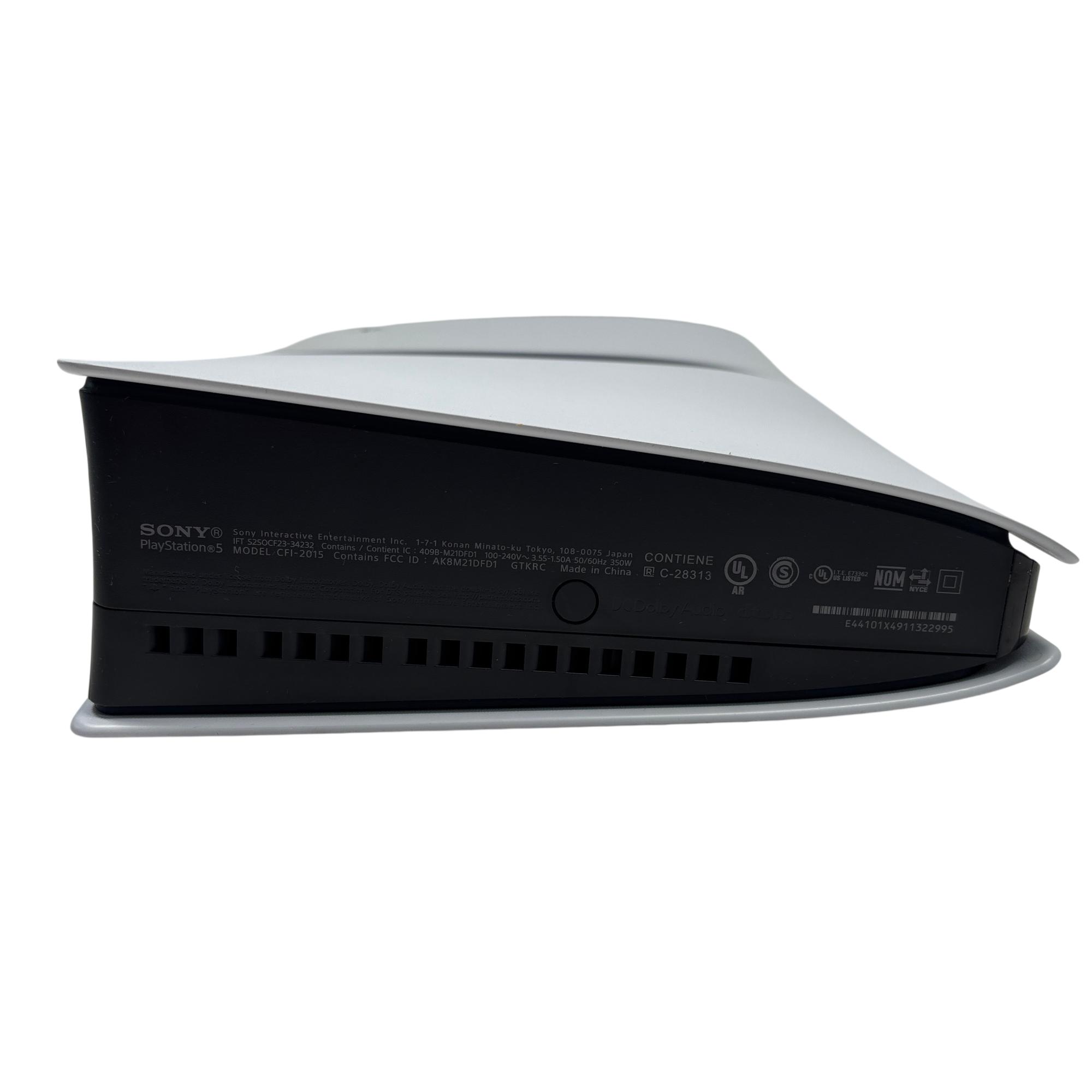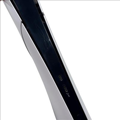 The Sony PlayStation 5 Slim Digital Edition CFI-2015 features a sleek white design with a distinctive black stripe, optimized for high-performance gaming. This model includes a responsive controller and multiple ports, including USB and LAN connections, enabling versatile connectivity for immersive gameplay. Designed for next-generation entertainment, it supports a broad library of games with enhanced graphics and fast loading times.