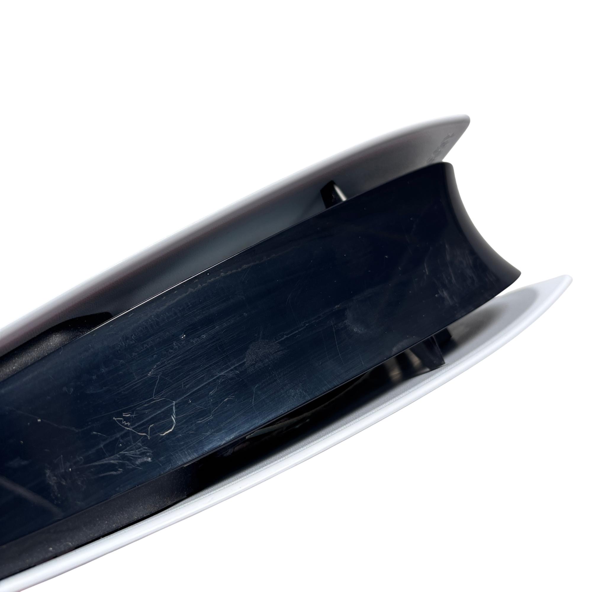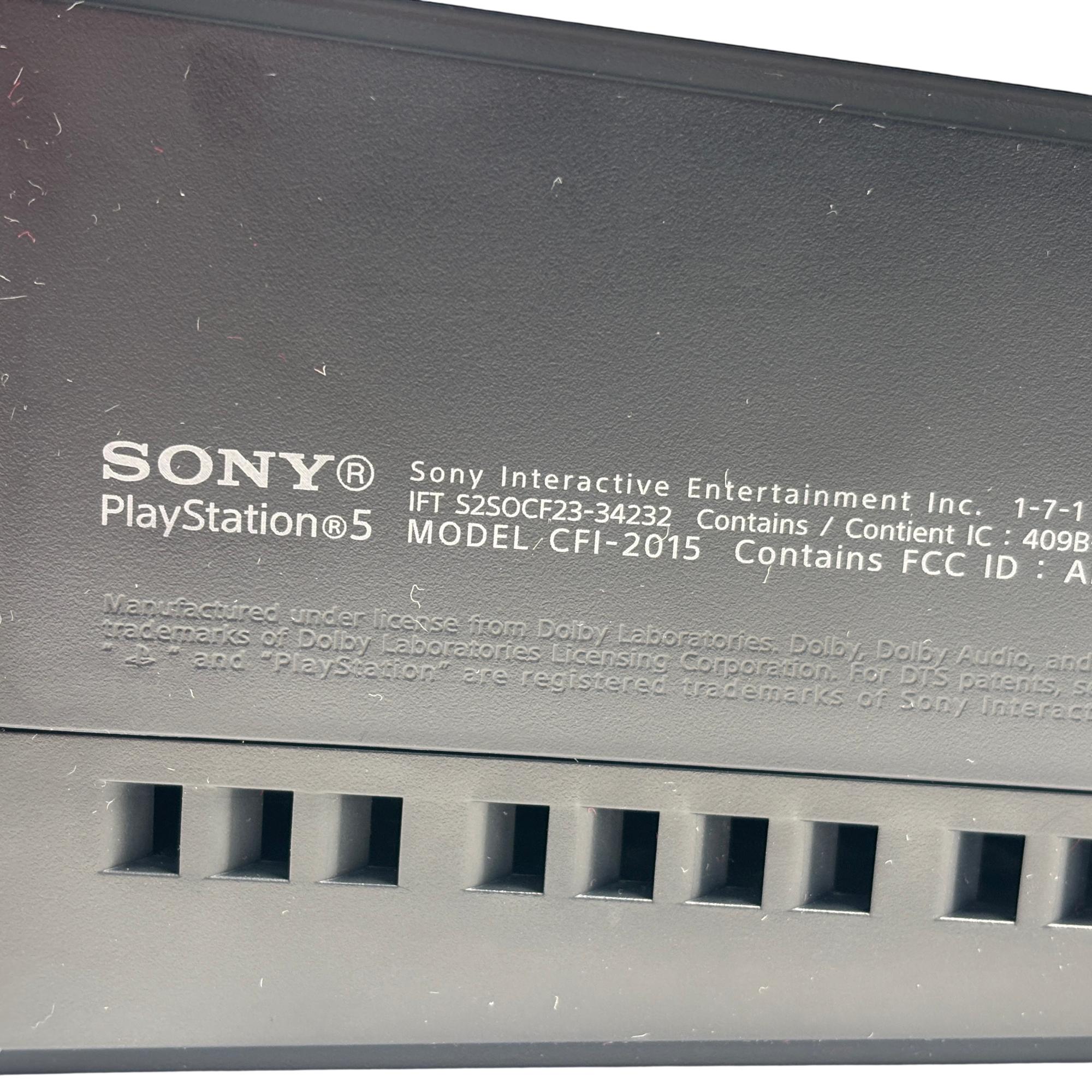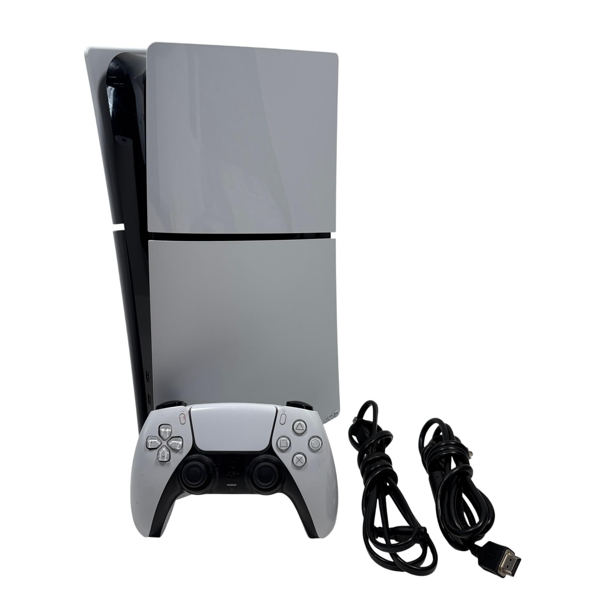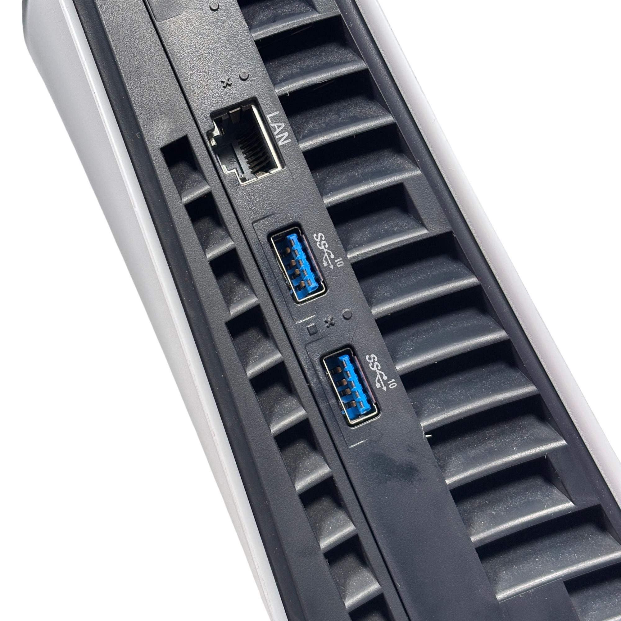 The Sony PlayStation 5 Slim Digital Edition CFI-2015 features a sleek white design with a distinctive black stripe, optimized for high-performance gaming. This model includes a responsive controller and multiple ports, including USB and LAN connections, enabling versatile connectivity for immersive gameplay. Designed for next-generation entertainment, it supports a broad library of games with enhanced graphics and fast loading times.