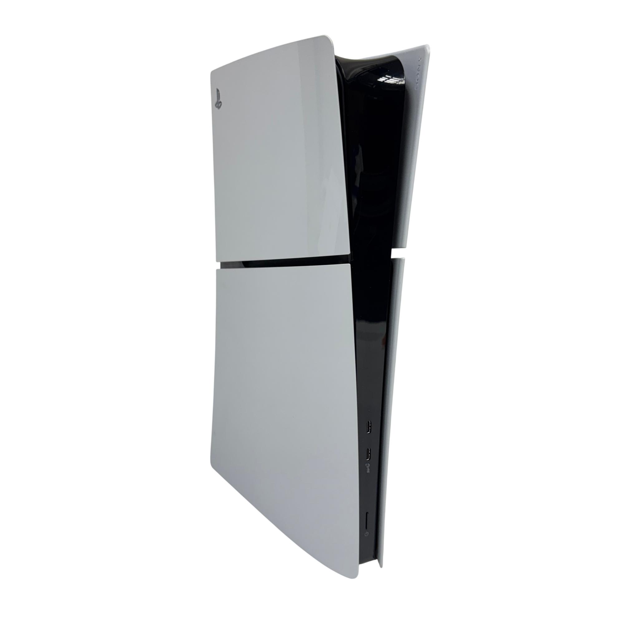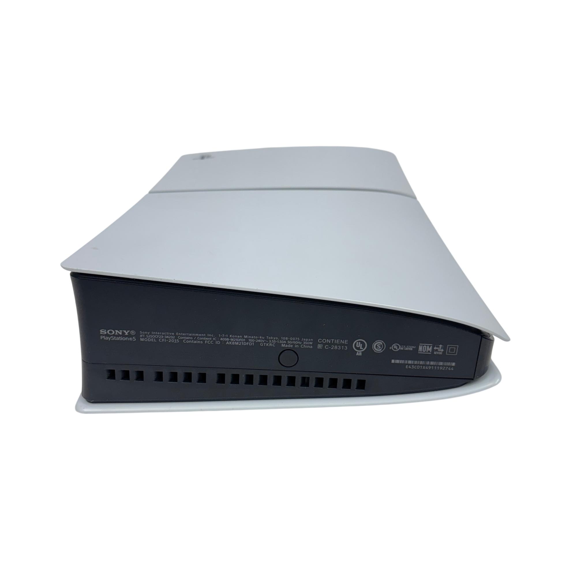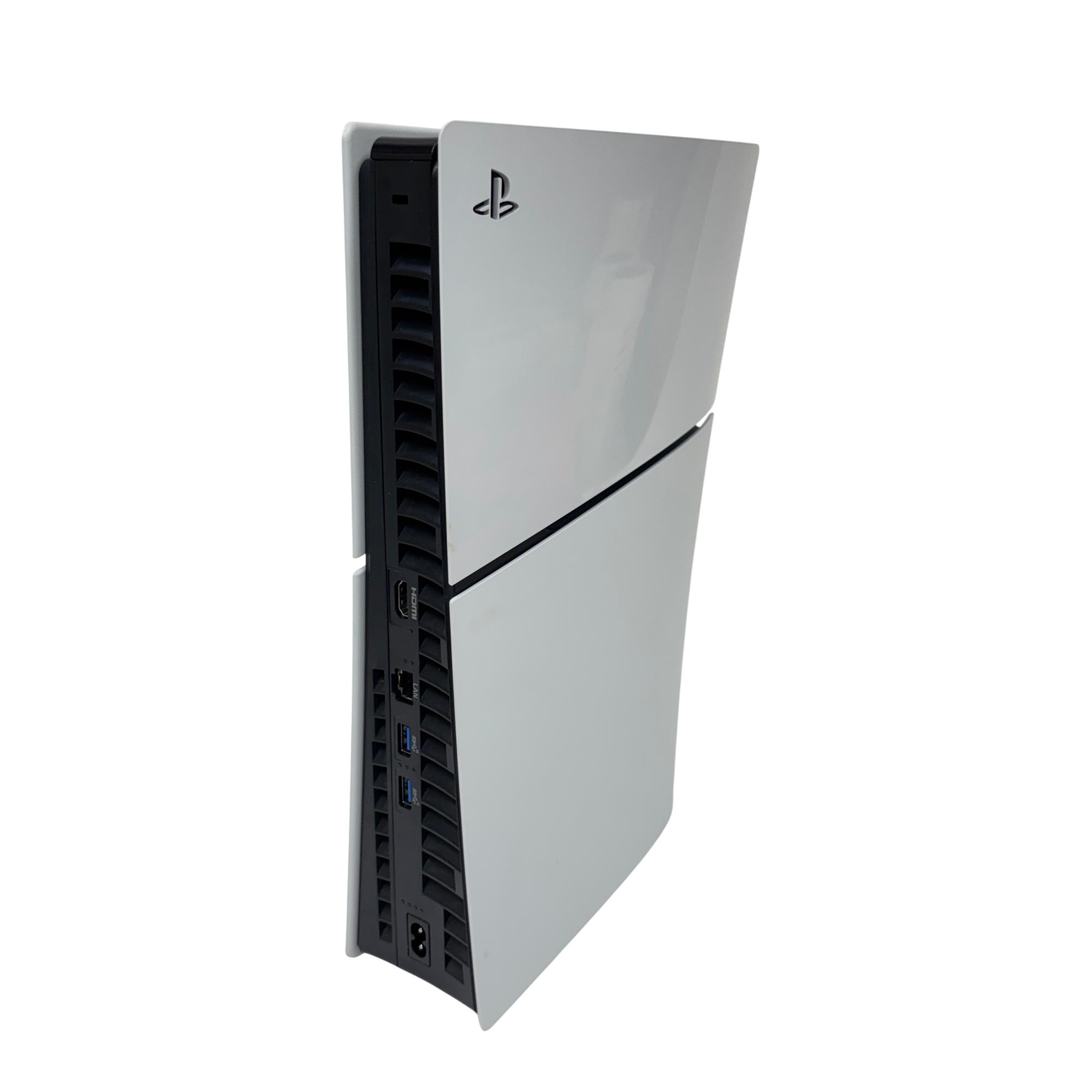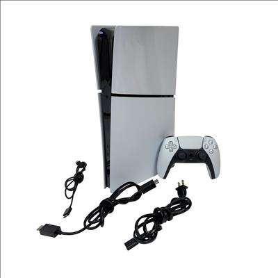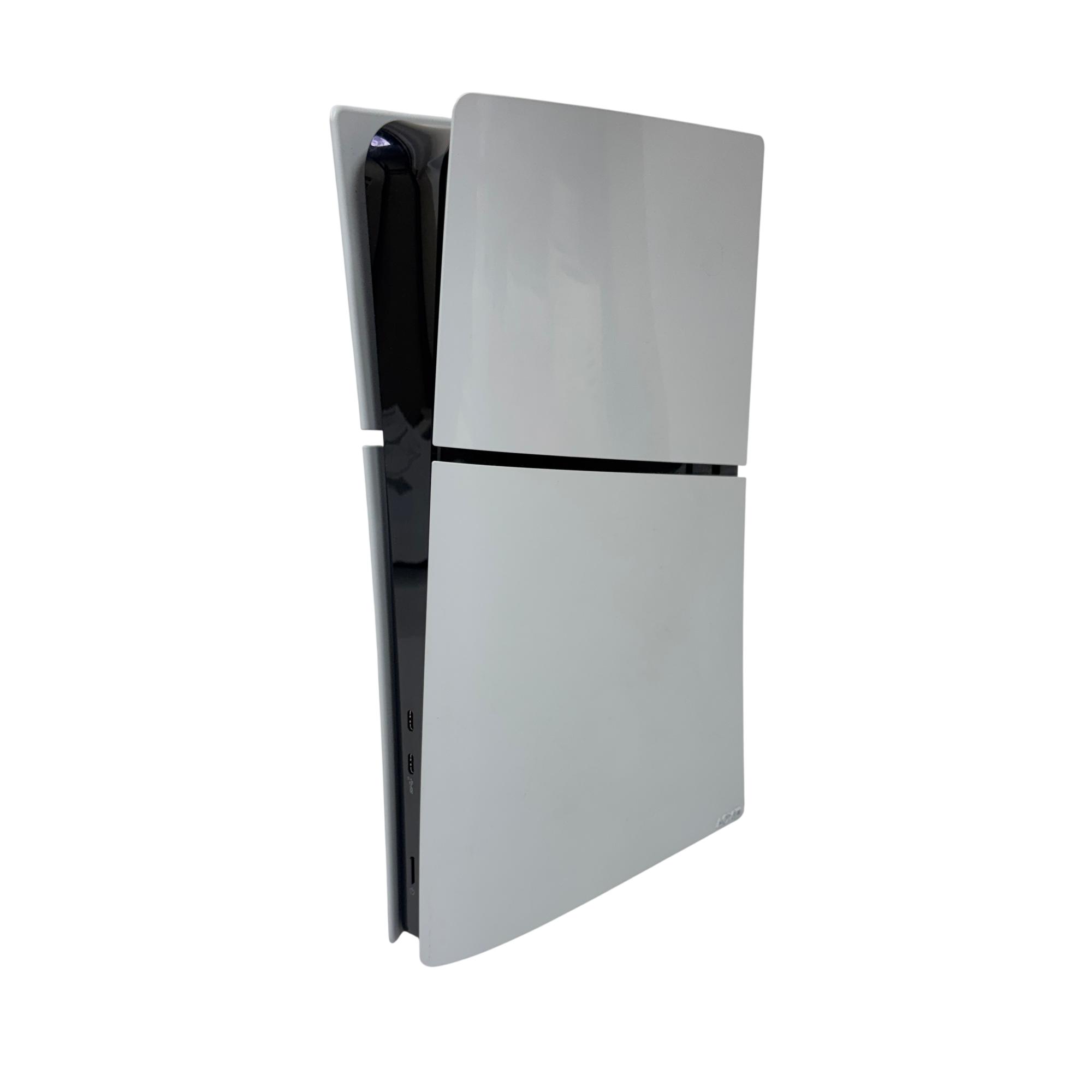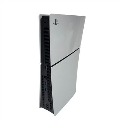 This Sony PlayStation 5 Slim Digital Edition Console (Model: CFI-2015, 1TB SSD) features a sleek white design with black trim, offering a compact and modern upgrade to home gaming setups. This digital-only console delivers ultra-fast load times and immersive 4K gameplay powered by a high-speed SSD and advanced hardware architecture, providing an enhanced gaming experience optimized for performance and efficiency.