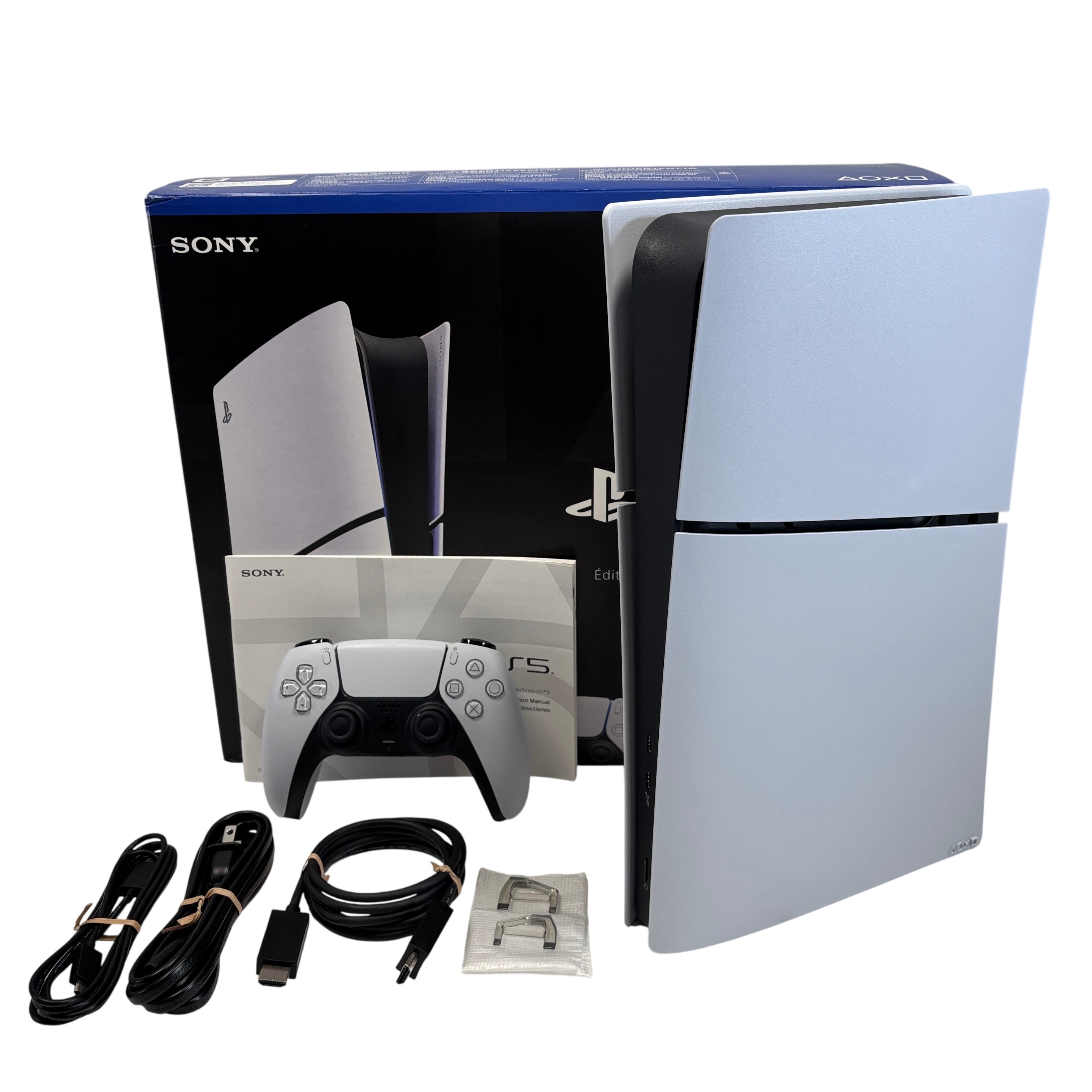 The Sony PlayStation 5 Slim Digital Edition CFI-2115 delivers next-generation gaming with powerful hardware capable of 4K resolution and ultra-fast load times. This set includes the console, a DualSense wireless controller, HDMI cable, power cable, and USB charging cable. Designed with a sleek white and black finish, the PS5 offers immersive gameplay and advanced features for both casual and hardcore gamers.