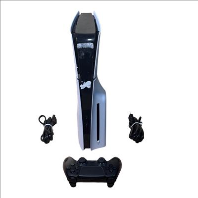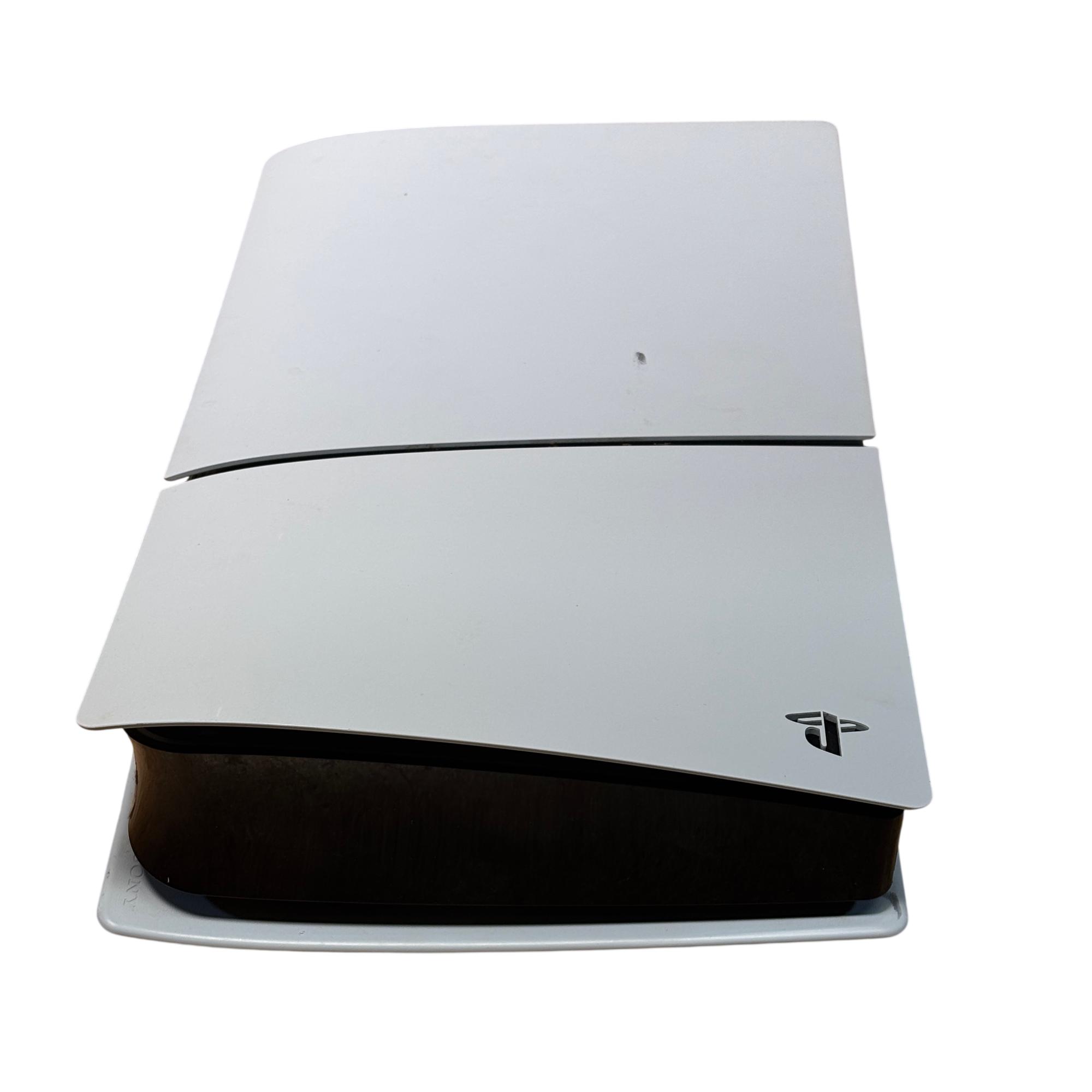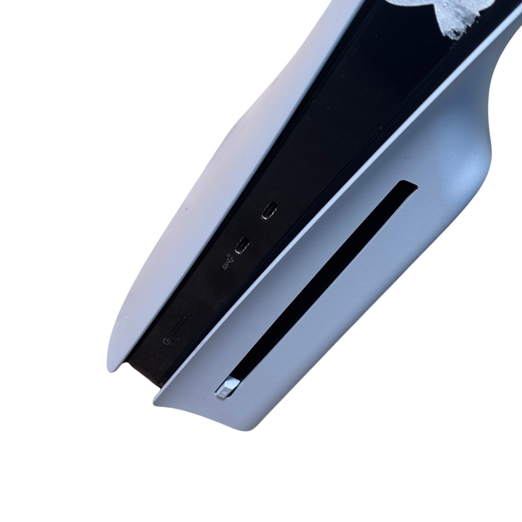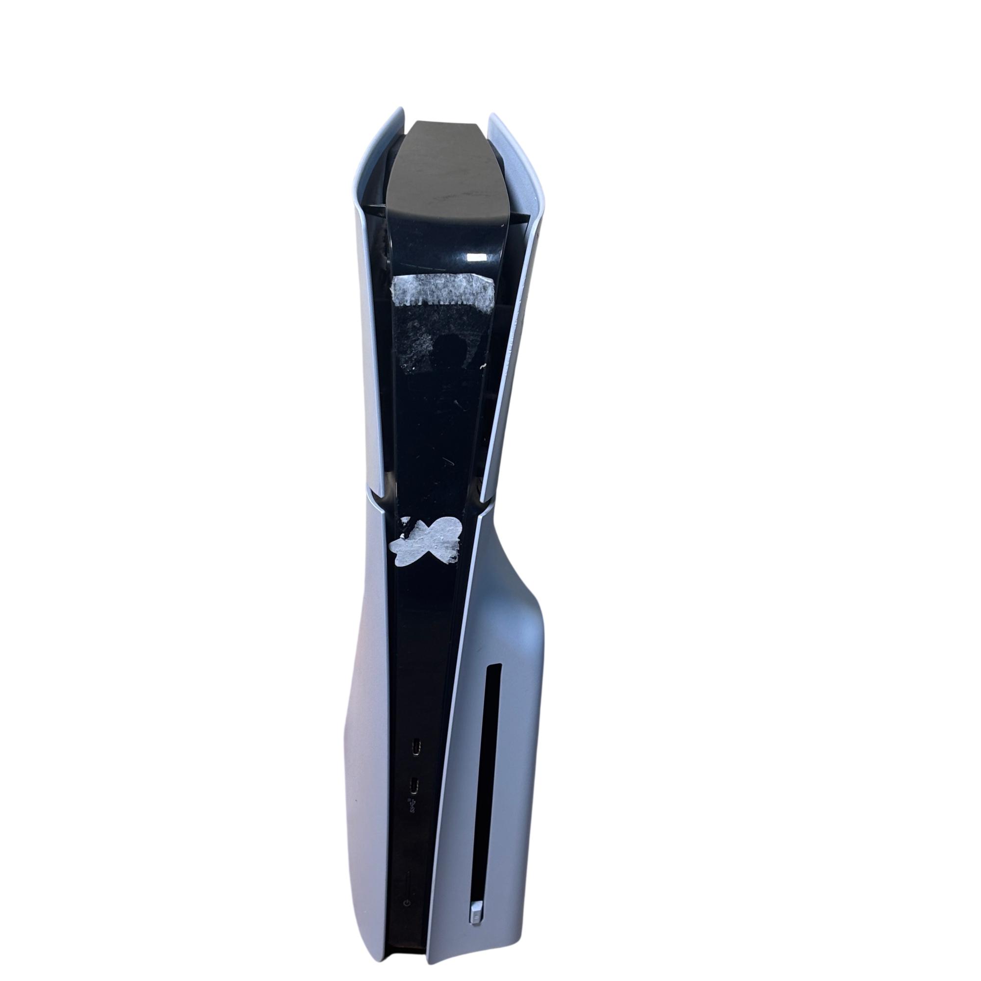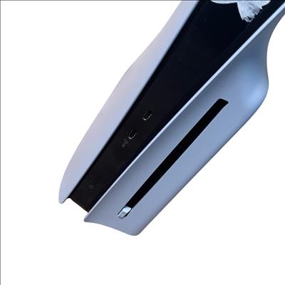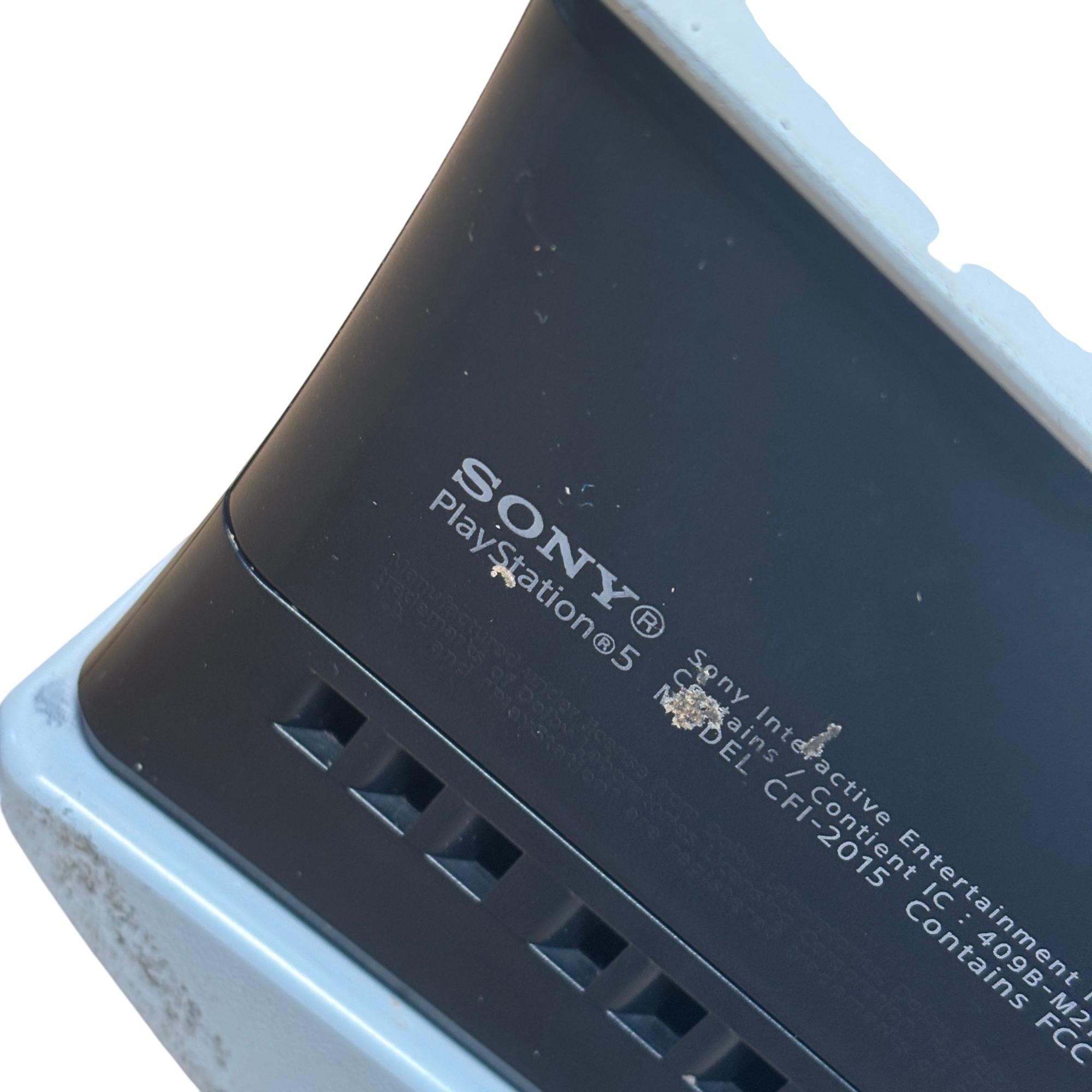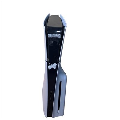 Sony PlayStation 5 Slim CFI-2015 Disc Edition 1TB Console features a sleek white design and enhanced hardware for immersive next-generation gaming. This model includes a matching black DualSense controller and necessary cables, offering high-speed performance and compatibility with a vast library of PlayStation games. The console shown has visible damage and is intended for parts or repair.