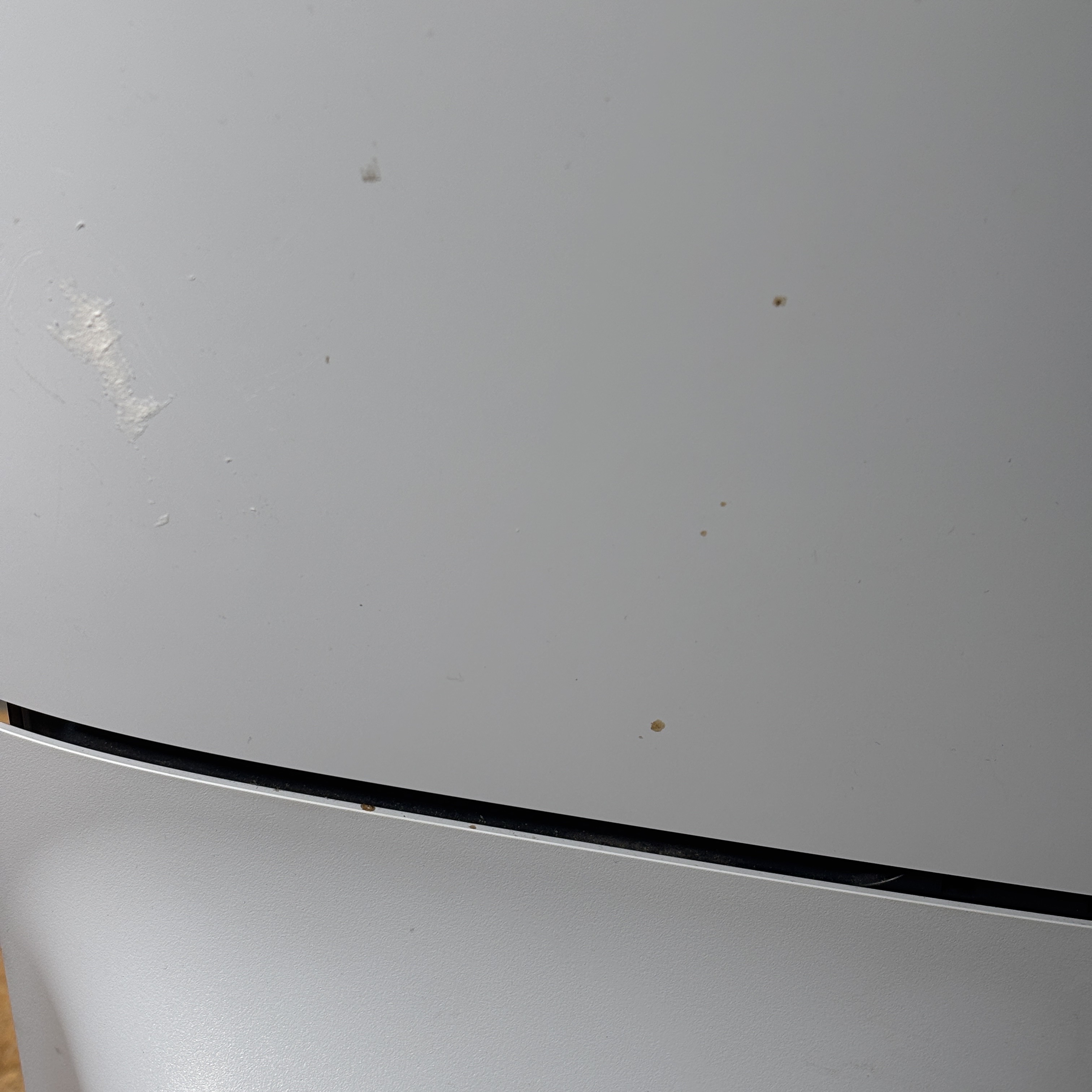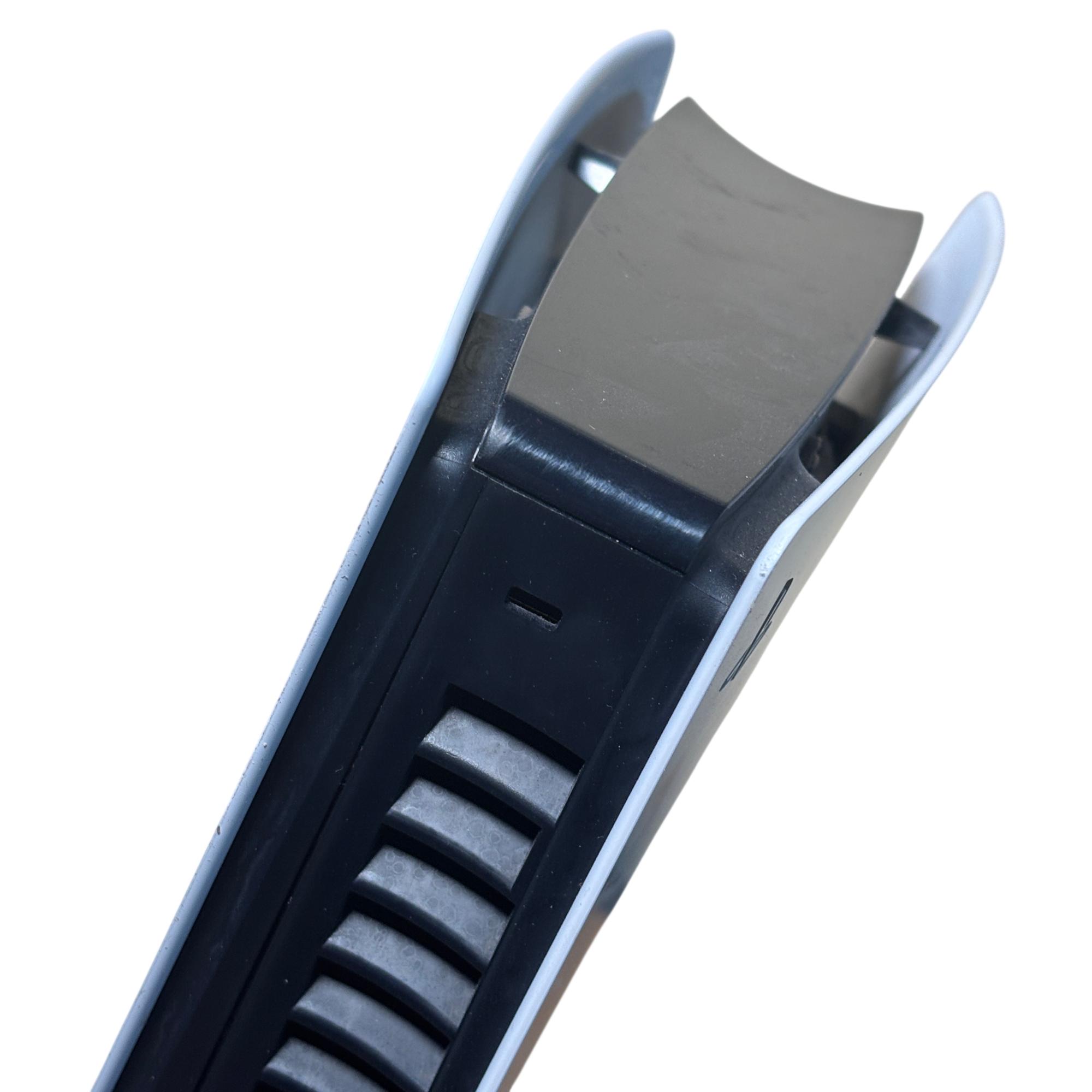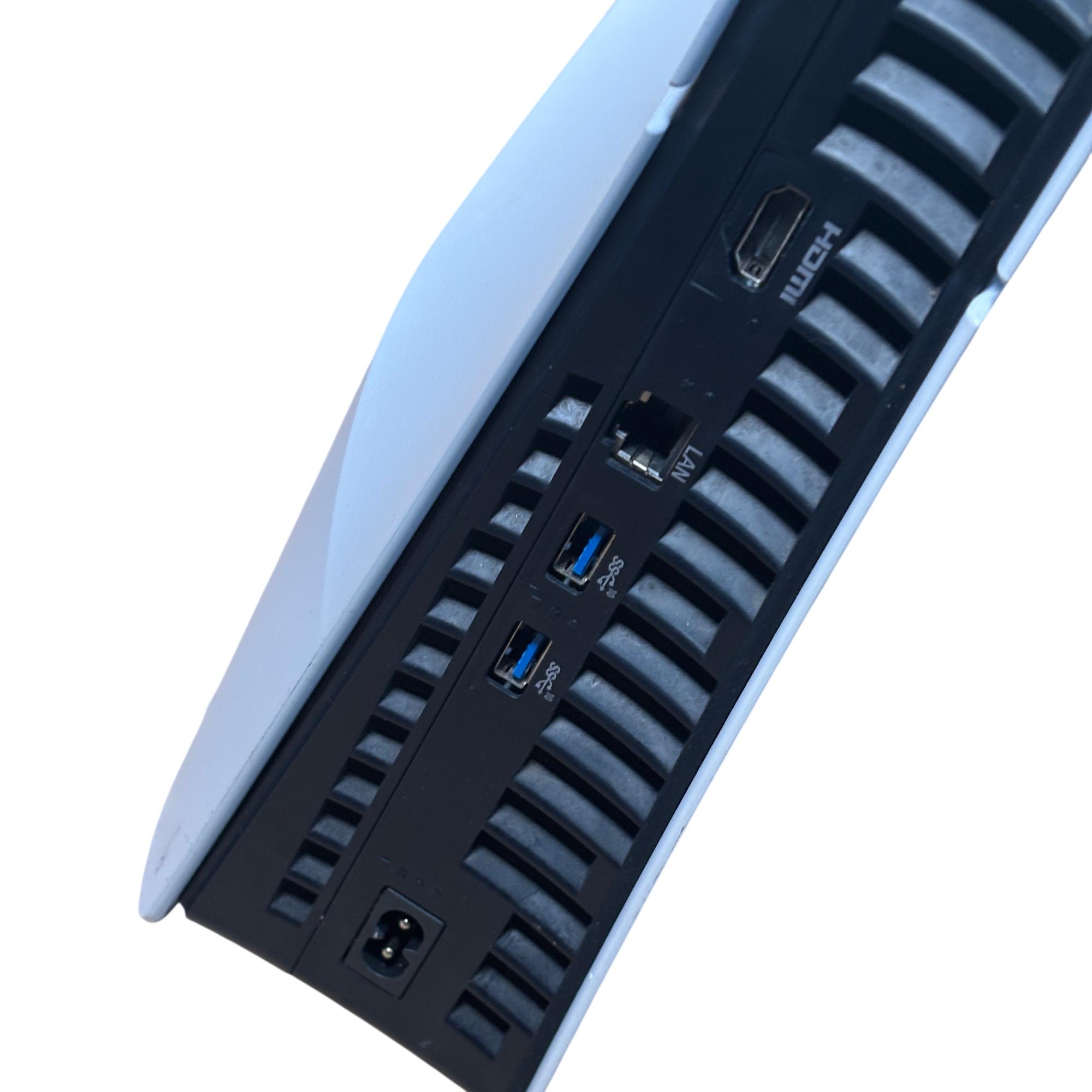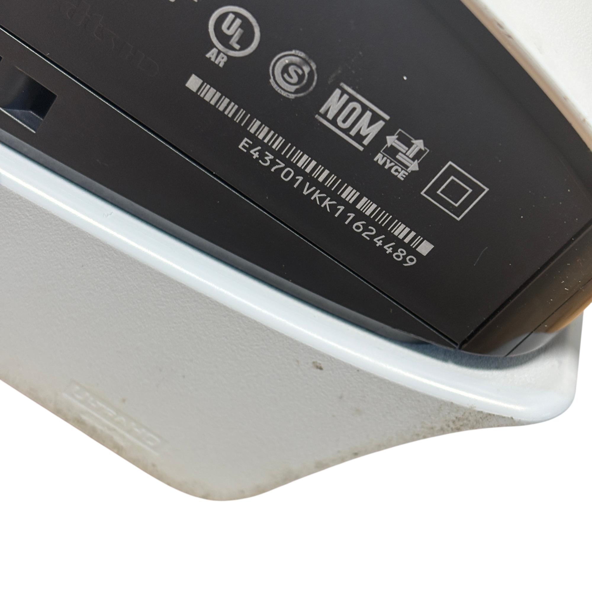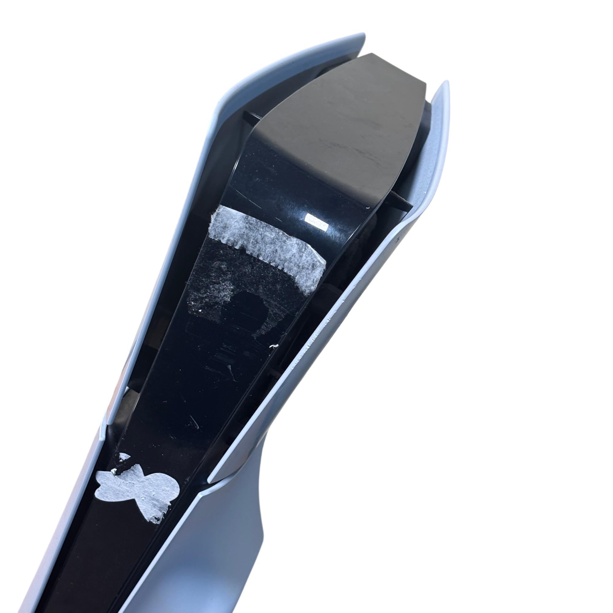 Sony PlayStation 5 Slim CFI-2015 Disc Edition 1TB Console features a sleek white design and enhanced hardware for immersive next-generation gaming. This model includes a matching black DualSense controller and necessary cables, offering high-speed performance and compatibility with a vast library of PlayStation games. The console shown has visible damage and is intended for parts or repair.