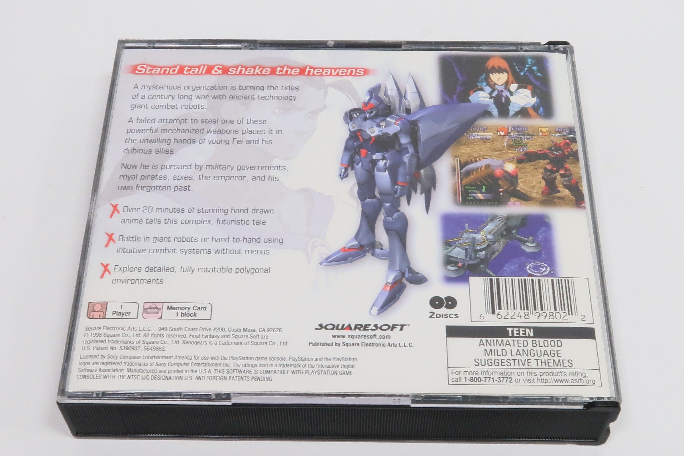 Xenogears is a 1998 role-playing video game developed and published by Square for the PlayStation video game console. It is the debut entry in the larger Xeno franchise. The gameplay of Xenogears revolves around navigating 3D environments both on-foot and using humanoid mecha dubbed "Gears". Combat is governed by a version of the turn-based "Active Time Battle" system. The story follows protagonist Fei Fong Wong and several others as they journey across the world to overthrow the all-powerful rule of Solaris and uncover mysteries concerning their world. The story incorporates Jungian psychology, Freudian thought, and religious symbolism.