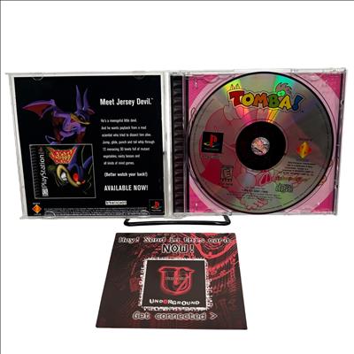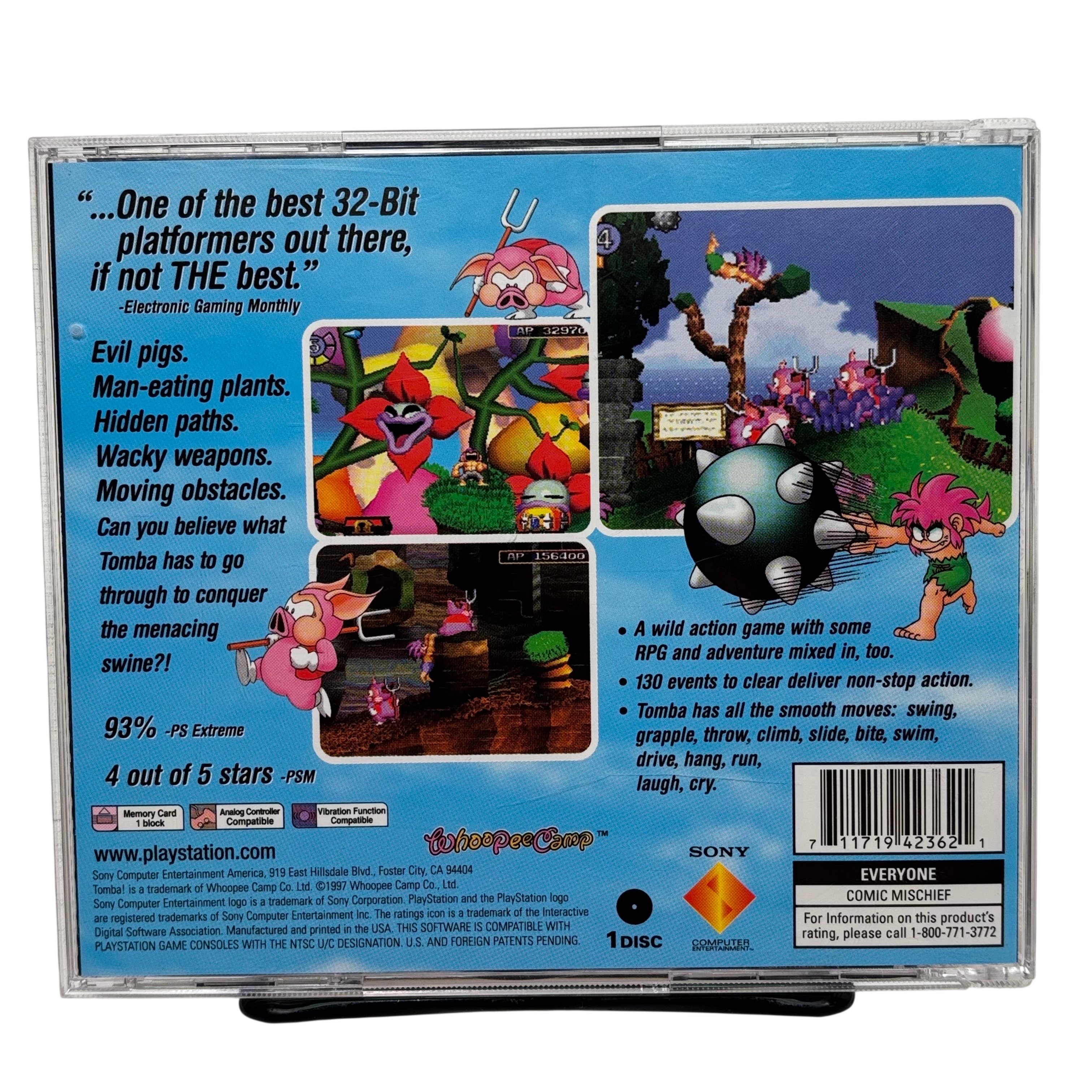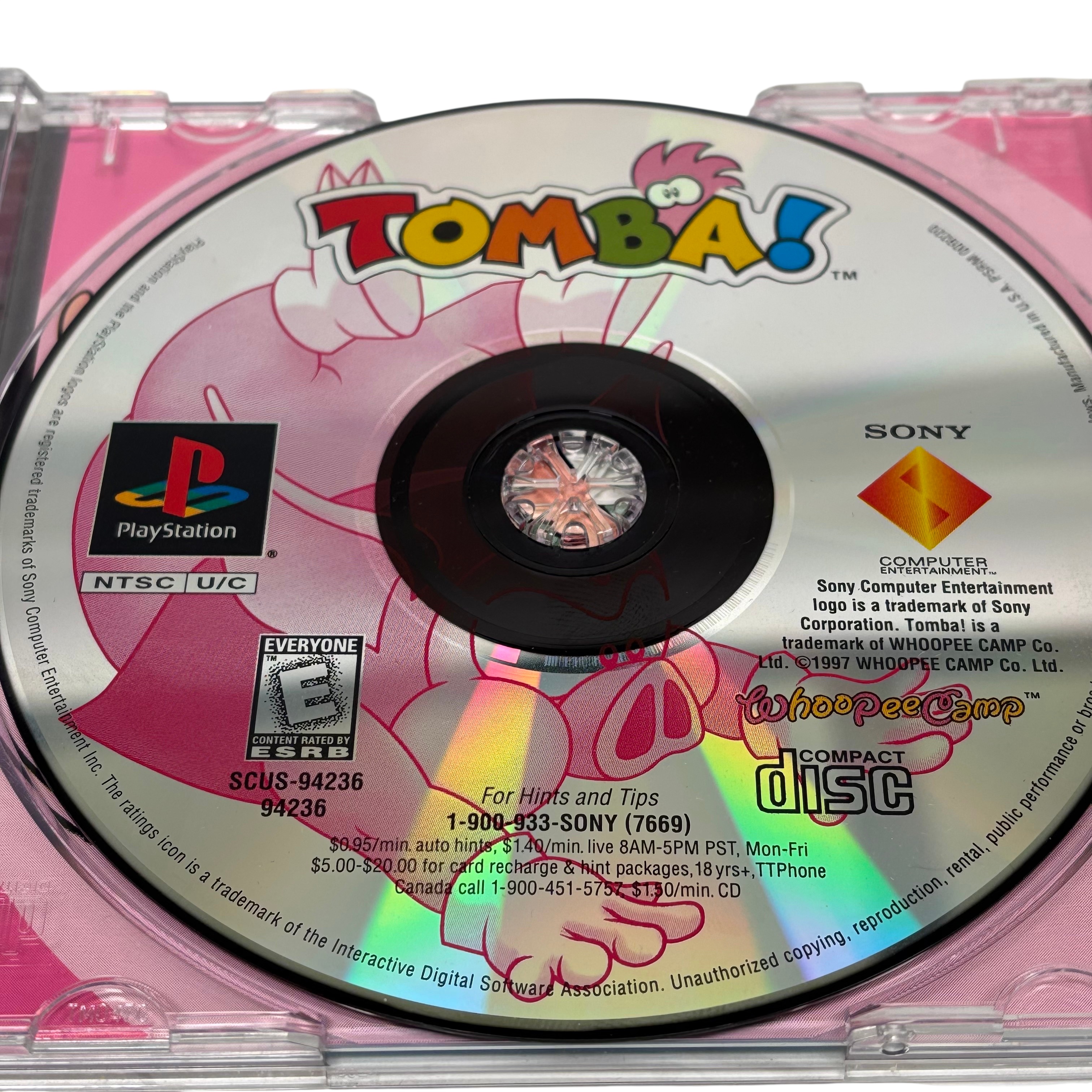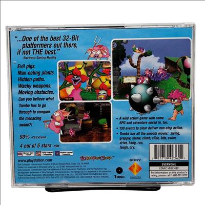 Sony Tomba! PlayStation Game (Model SCUS-94236) is a highly acclaimed 32-bit platformer featuring a blend of action, RPG, and adventure elements. This NTSC U/C region disc is compatible with North American PlayStation consoles and includes the original jewel case and instruction manual. Players experience over 130 events with smooth character moves such as swinging, climbing, and swimming, making it a unique and engaging classic title. Ideal for collectors and fans of retro gaming, this game delivers wacky weapons, hidden paths, and challenging obstacles in a colorful and vibrant world.
