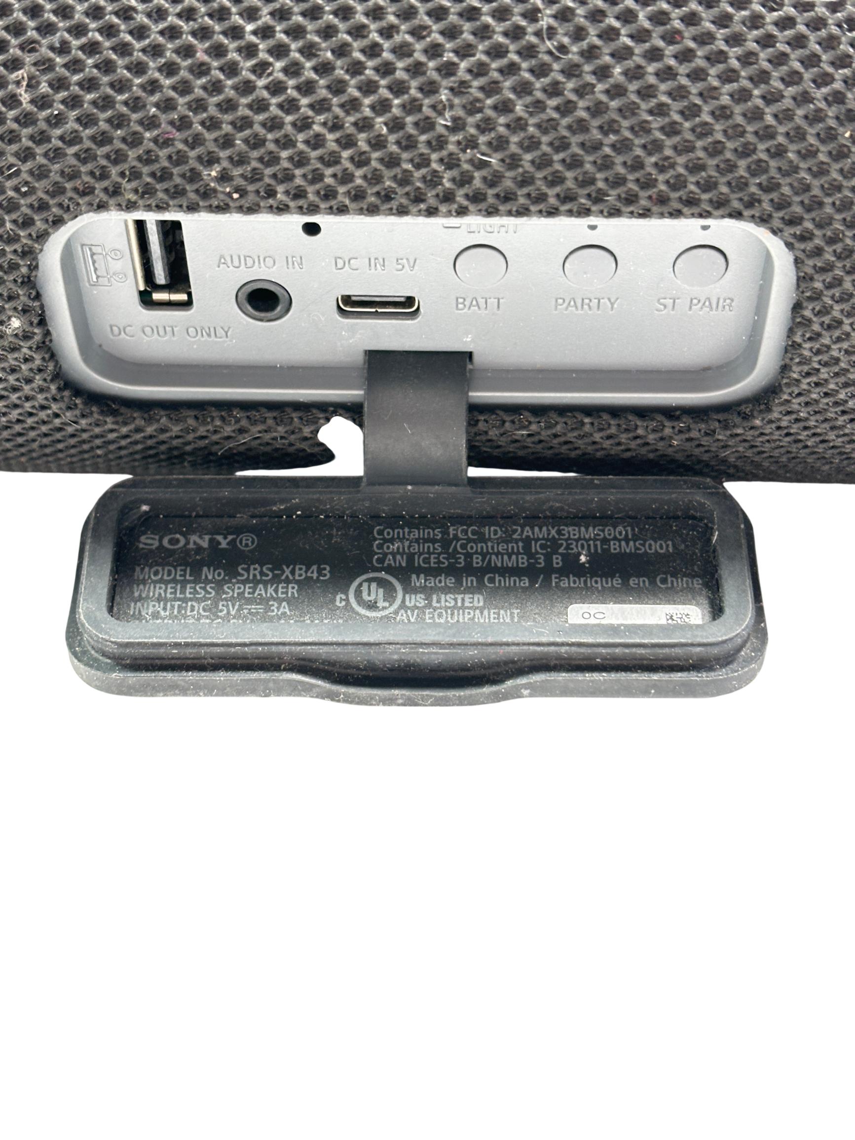 Sony SRS-XB43 Extra BASS Portable Bluetooth Speaker delivers powerful sound with deep bass and clear audio quality. This speaker features a durable design with water and dust resistance, making it ideal for outdoor use. Its Bluetooth connectivity ensures seamless wireless streaming from compatible devices in a stylish black finish.