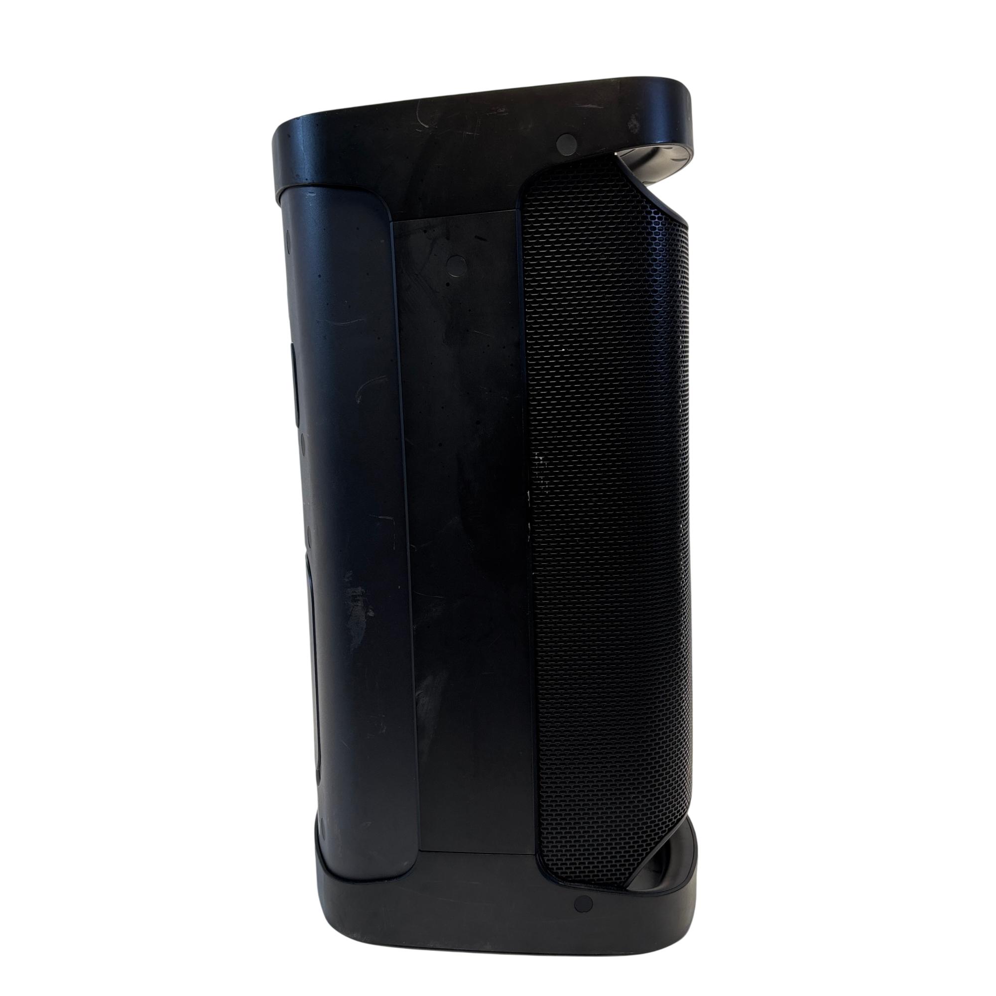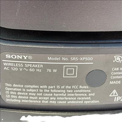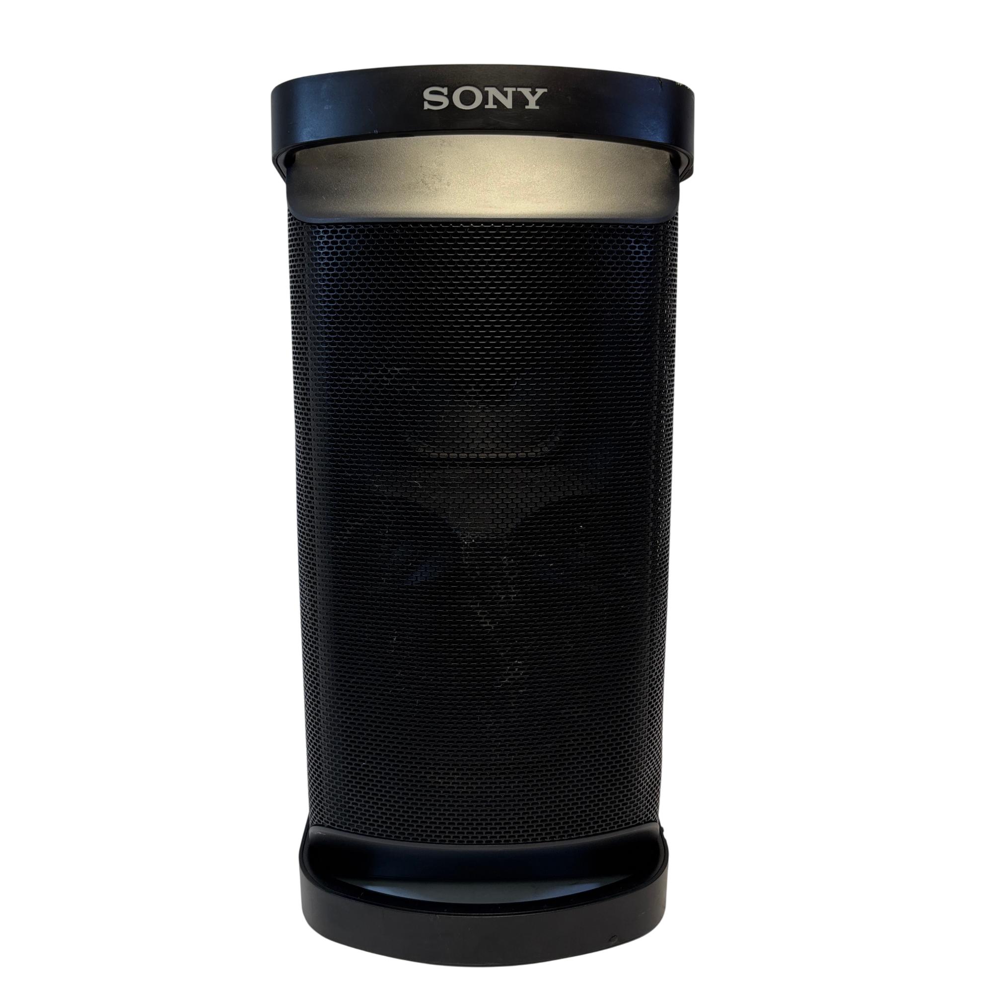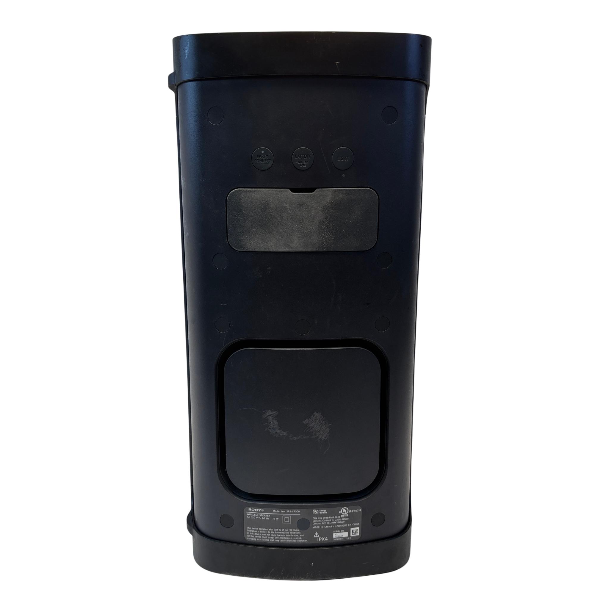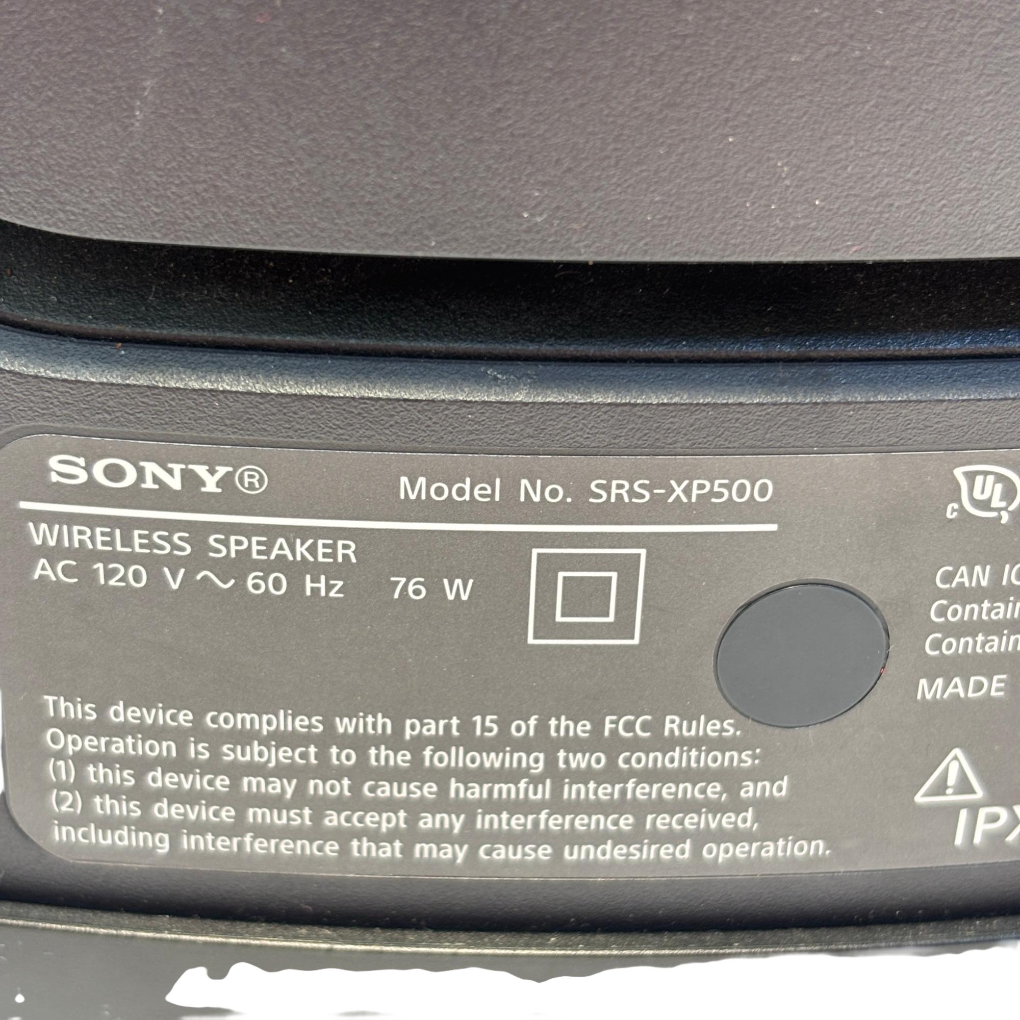The Sony SRS-XP500 X-Series Portable Wireless Bluetooth Speaker delivers powerful party sound with extra bass in a sleek black design accented by a silver rim. Its cylindrical shape is equipped with a metal grille that protects the speaker drivers while enhancing durability. Engineered for wireless connectivity, this speaker provides high-quality audio performance suitable for various indoor and outdoor settings.