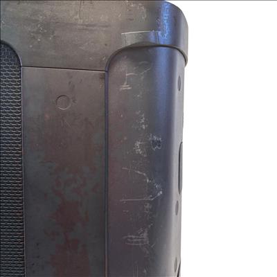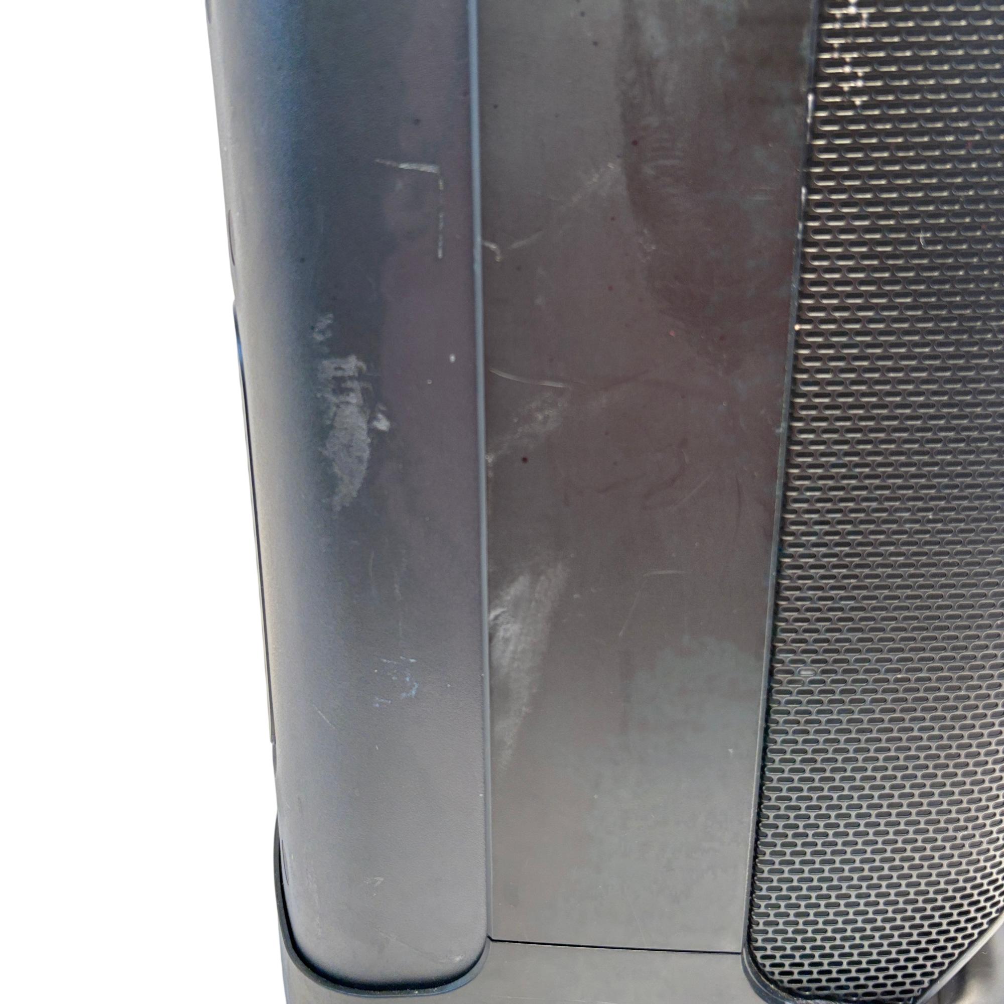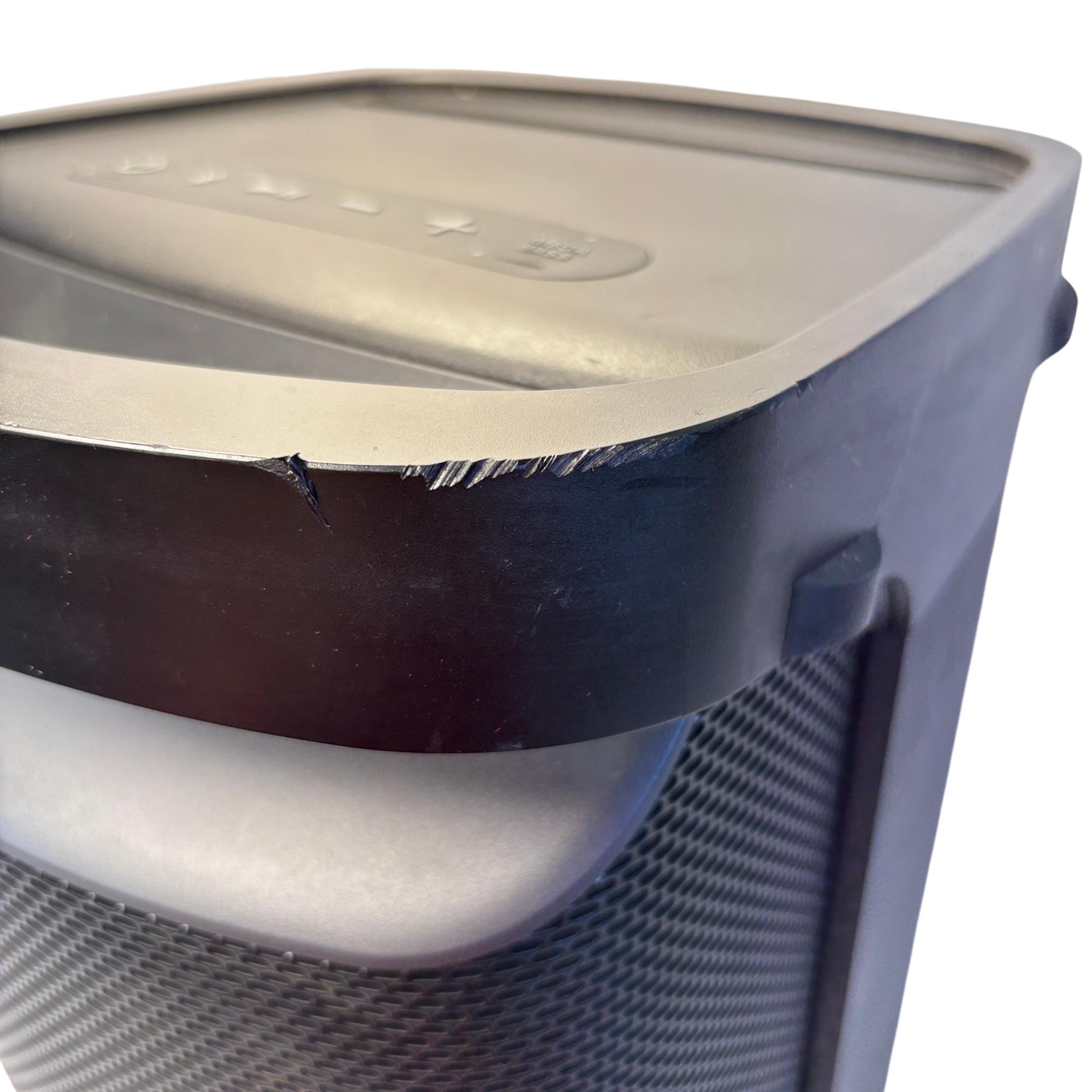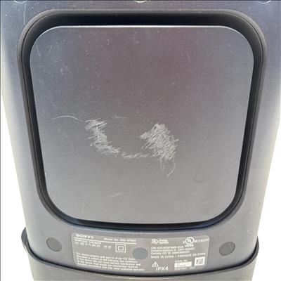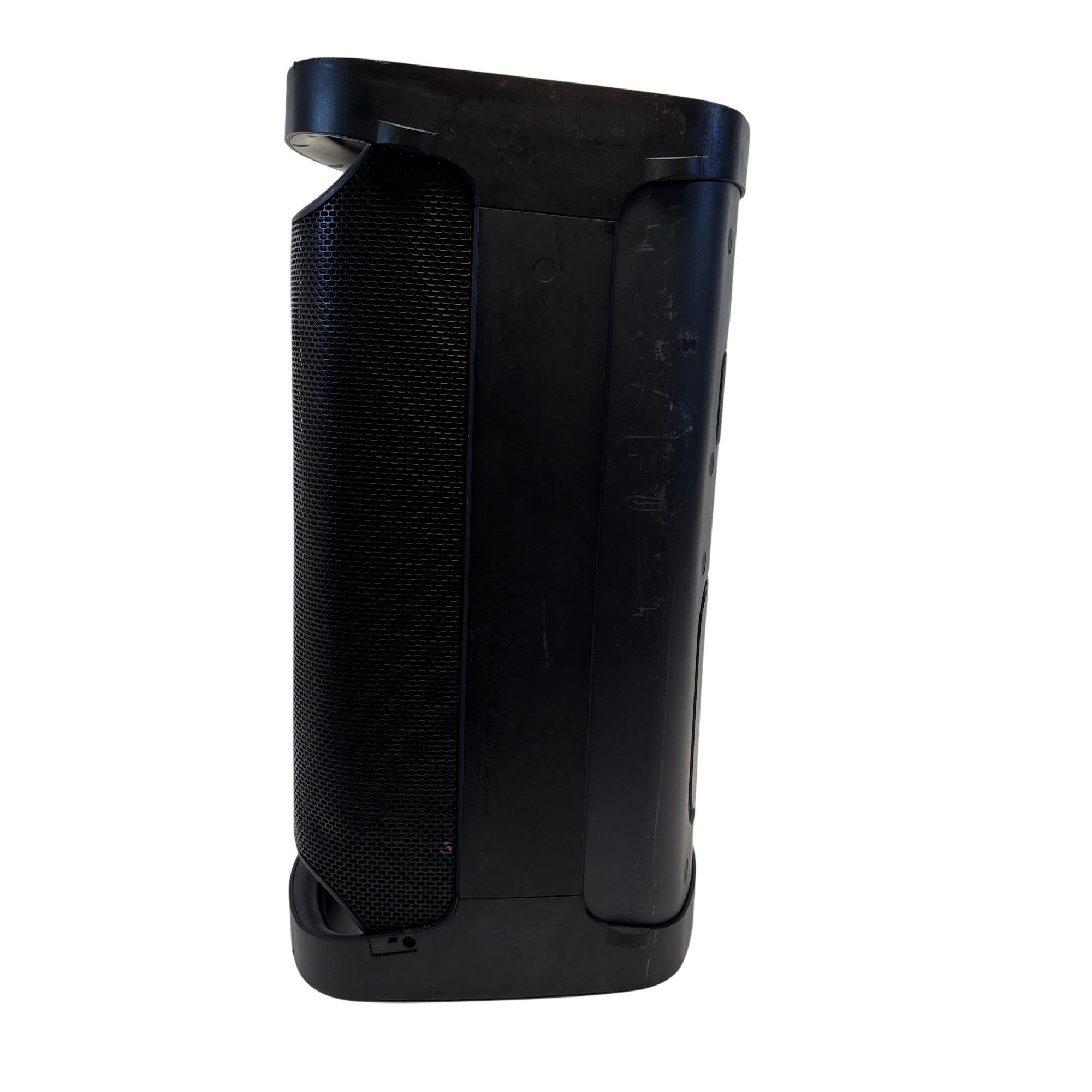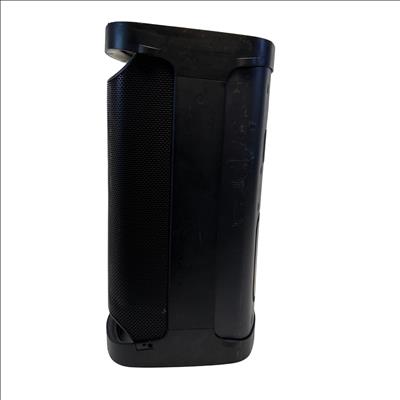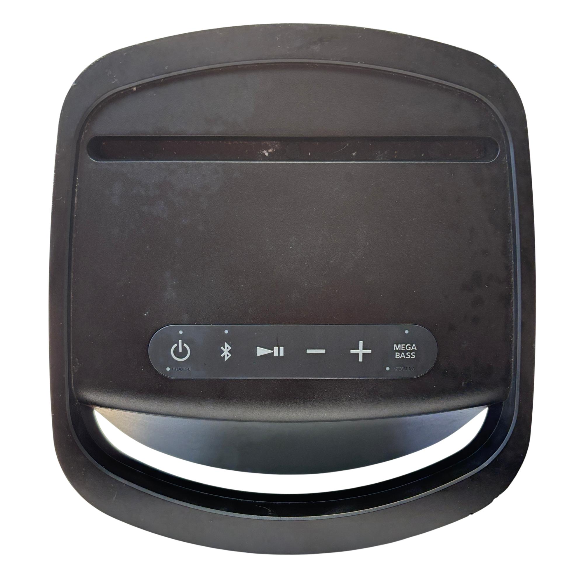 The Sony SRS-XP500 X-Series Portable Wireless Bluetooth Speaker delivers powerful party sound with extra bass in a sleek black design accented by a silver rim. Its cylindrical shape is equipped with a metal grille that protects the speaker drivers while enhancing durability. Engineered for wireless connectivity, this speaker provides high-quality audio performance suitable for various indoor and outdoor settings.