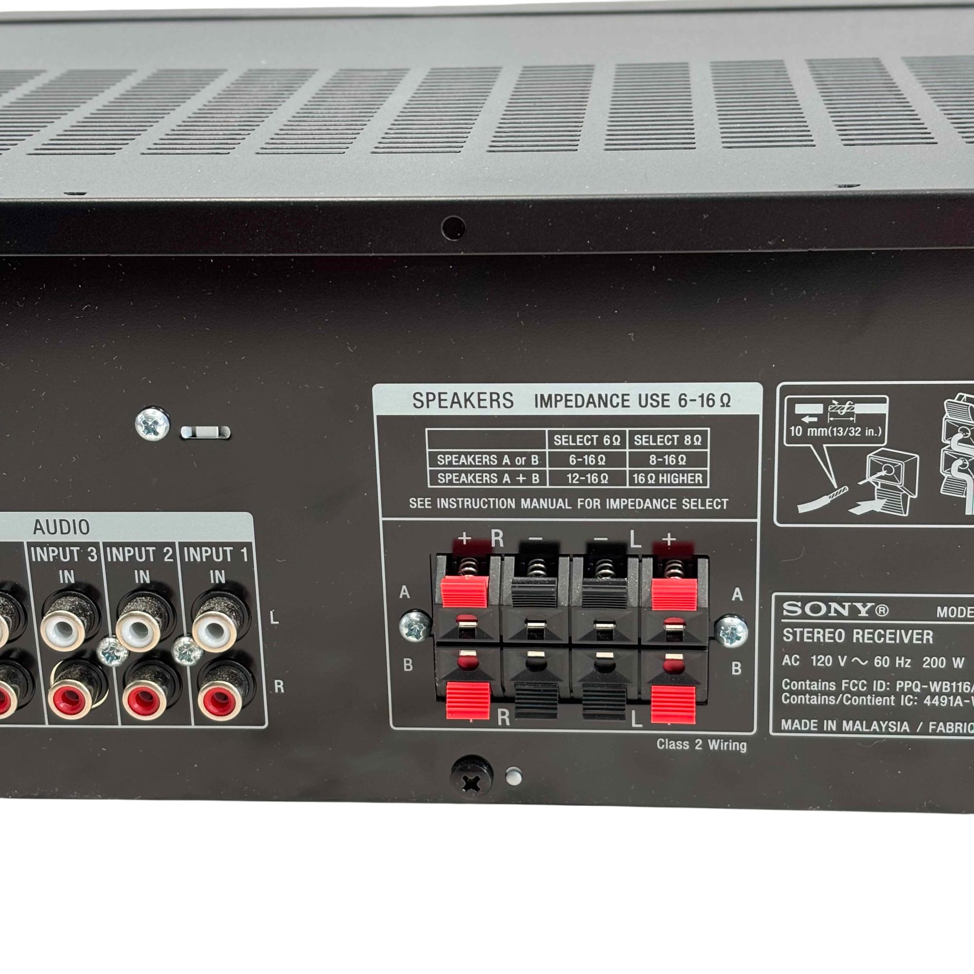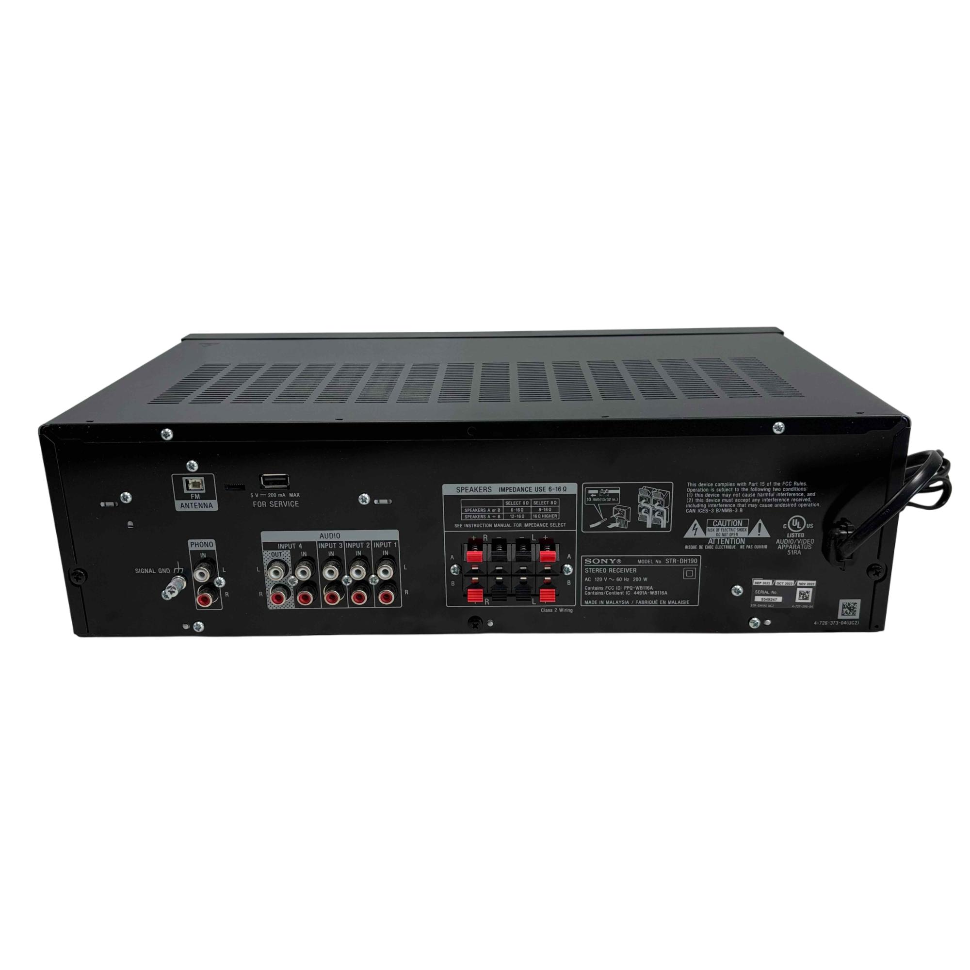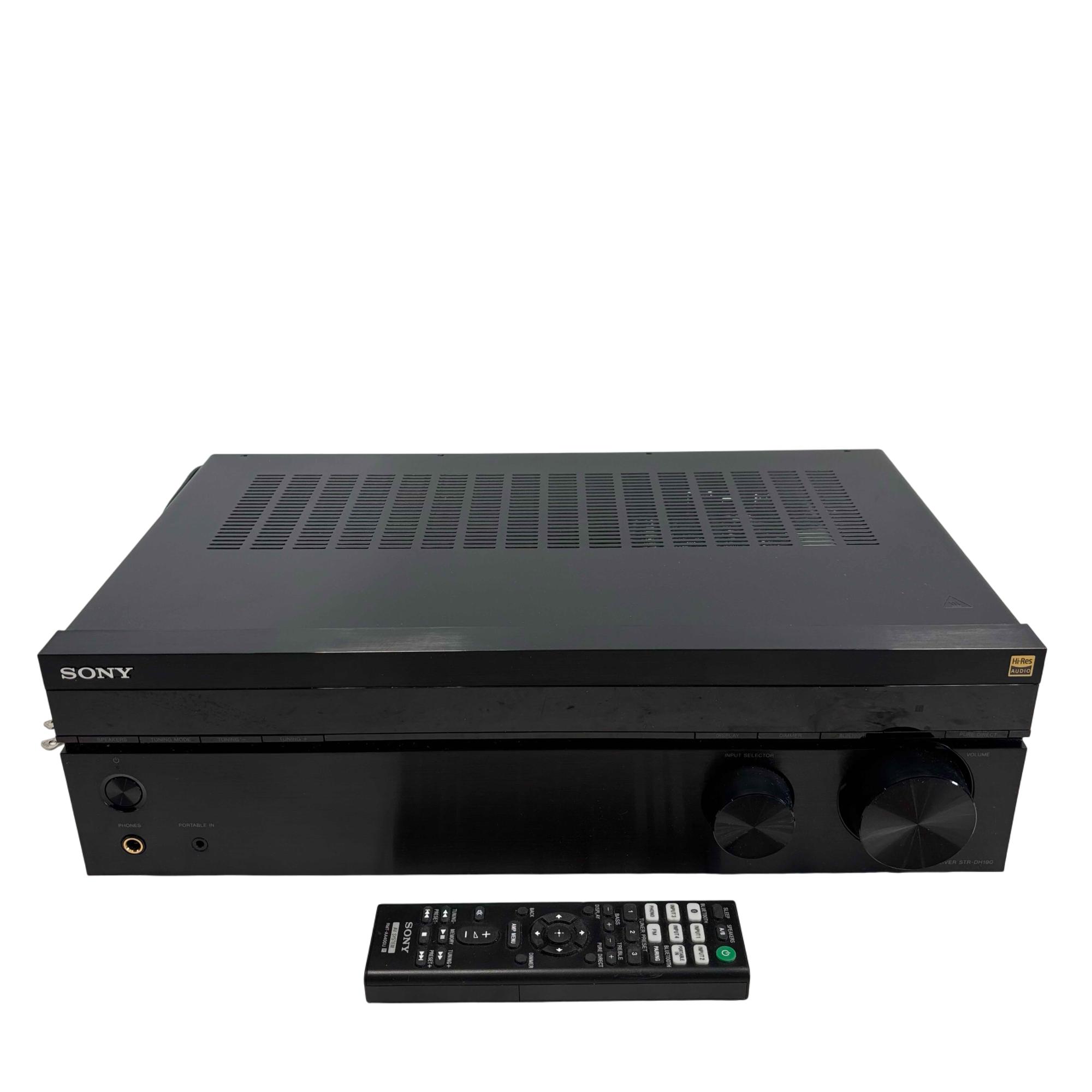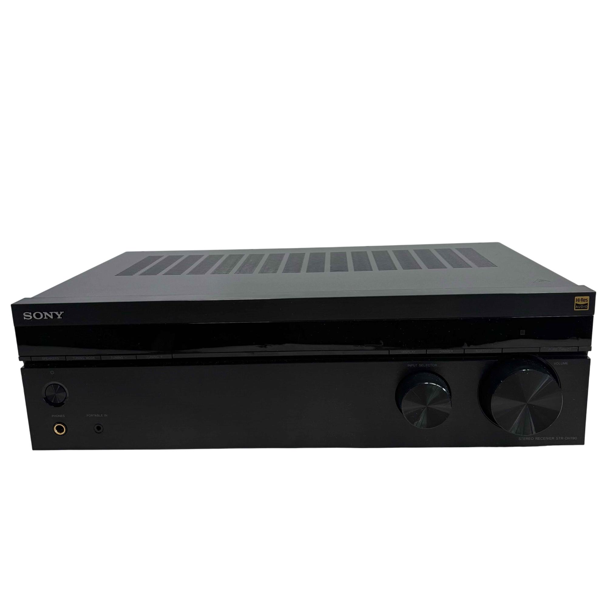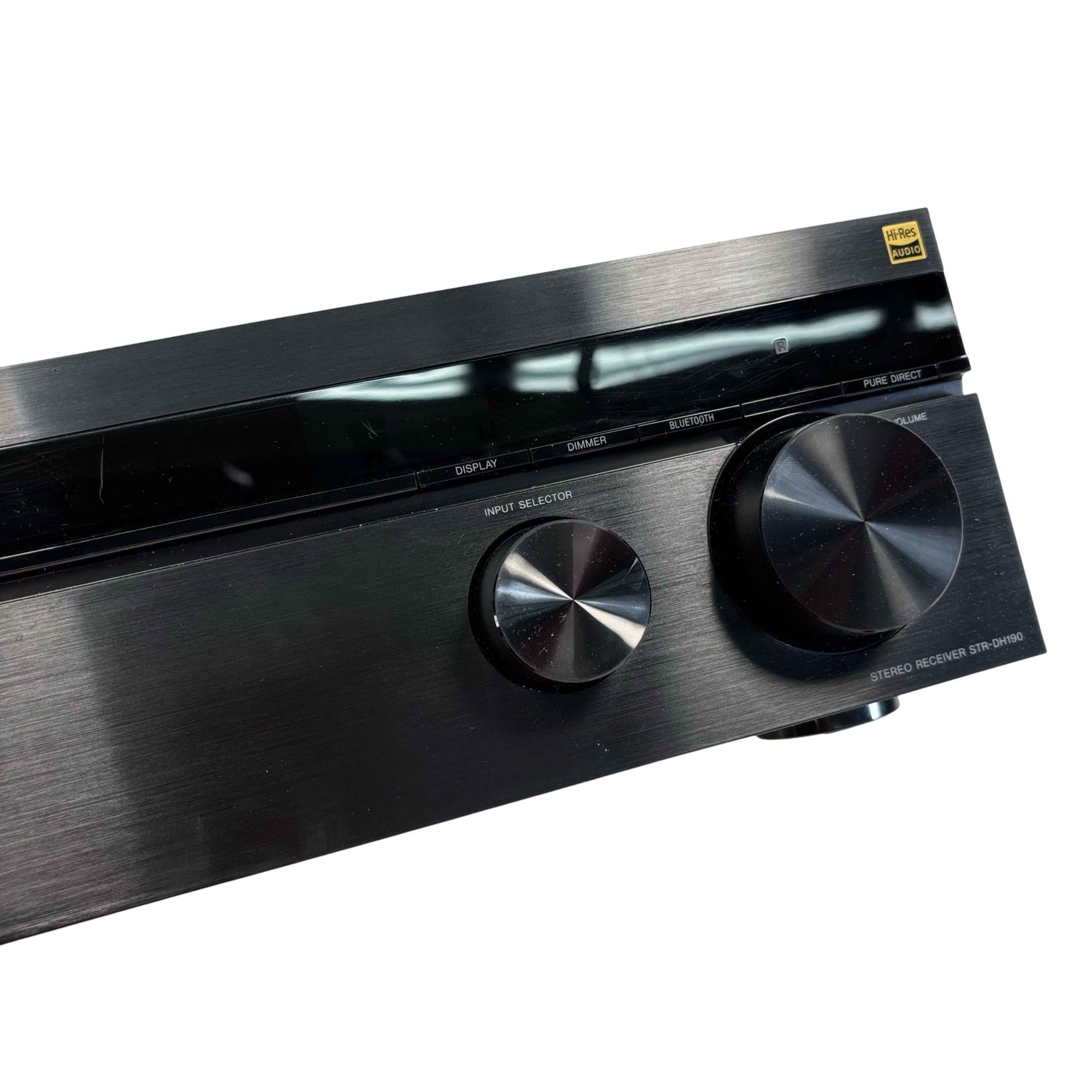 The Sony STR-DH190 2 Channel Stereo Receiver offers high-resolution audio performance and versatile connectivity options, including Bluetooth wireless streaming and multiple input selectors. This sleek black receiver features precise control knobs, a clear display, and a pure direct mode for enhanced sound clarity in a compact design perfect for any audio setup.