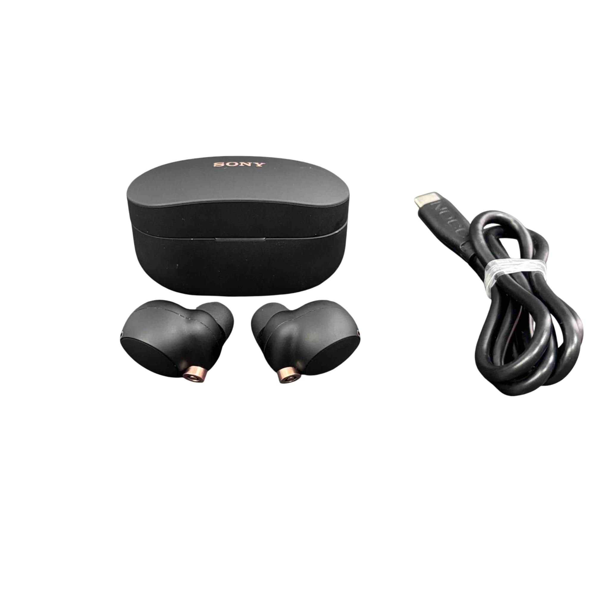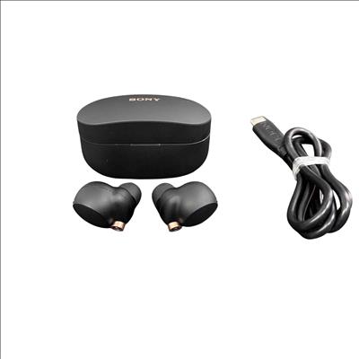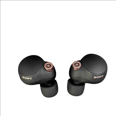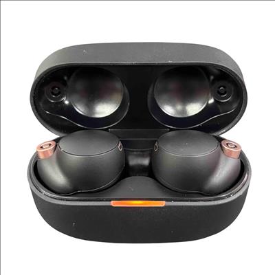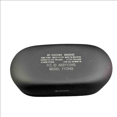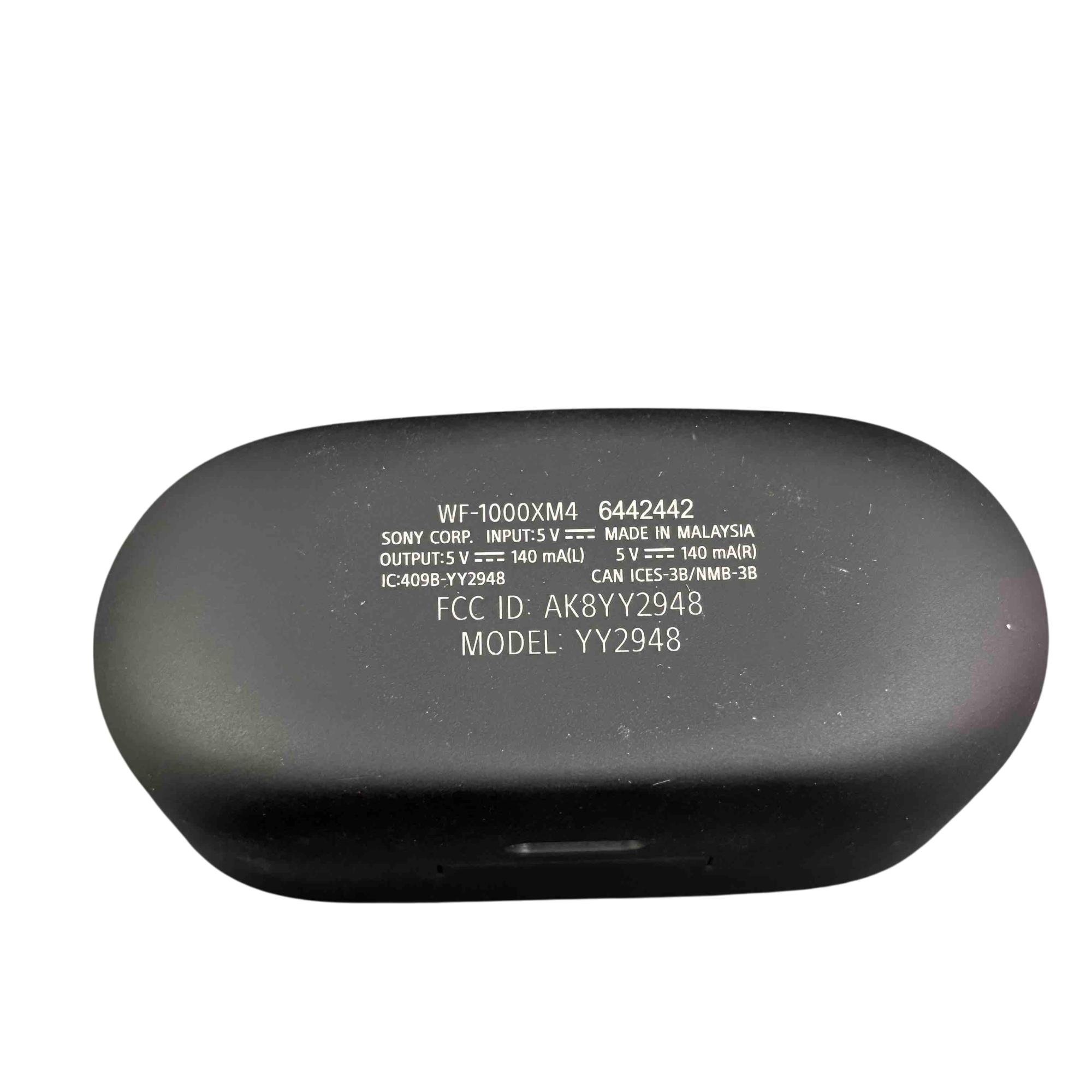 Sony WF-1000XM4 Noise Canceling Wireless Earbuds feature advanced noise cancelling technology with a sleek black design and gold accents. These earbuds offer high-quality wireless Bluetooth connectivity with efficient power input/output specifications for extended use. Made by Sony Corp. in Malaysia, they are optimized for superior sound and comfort.