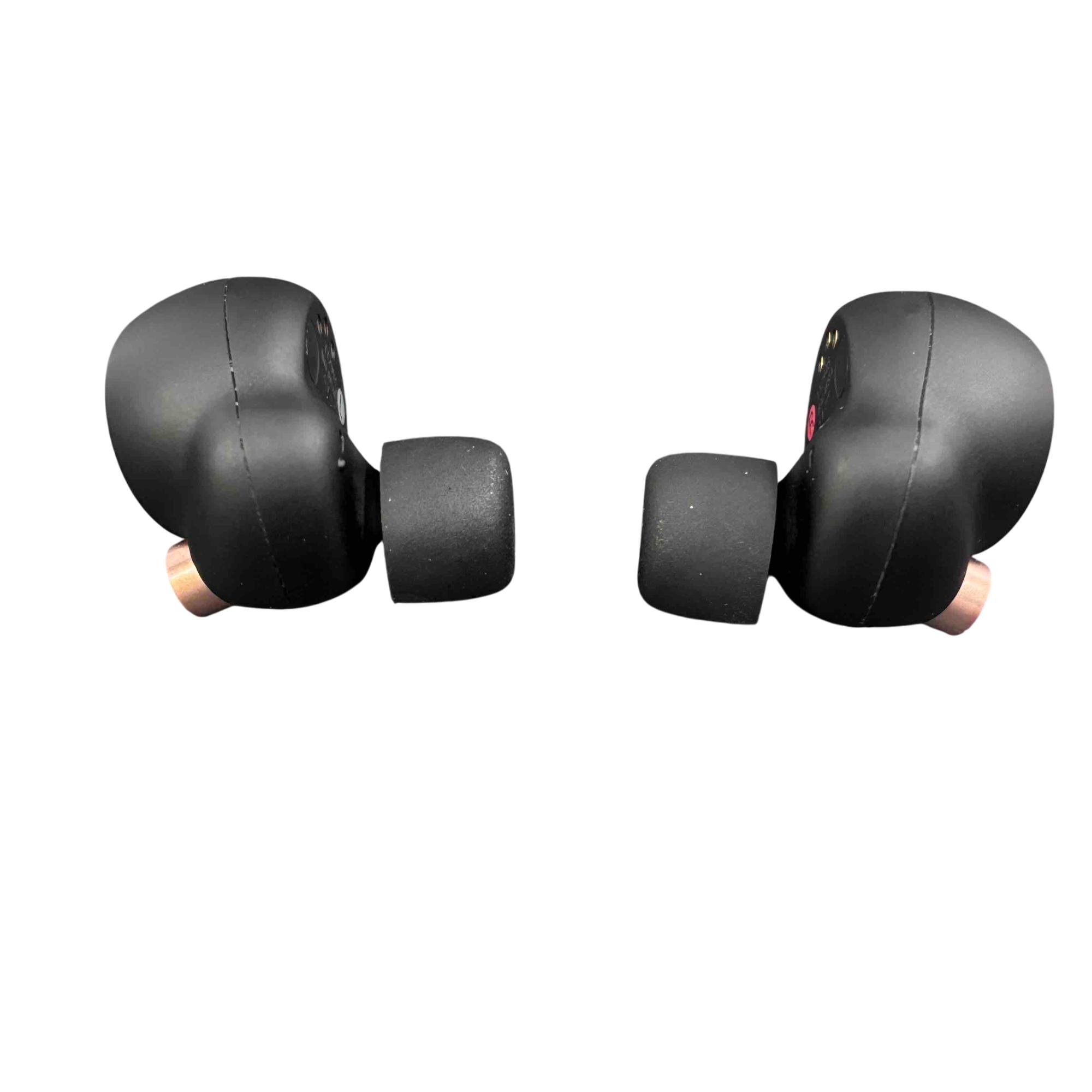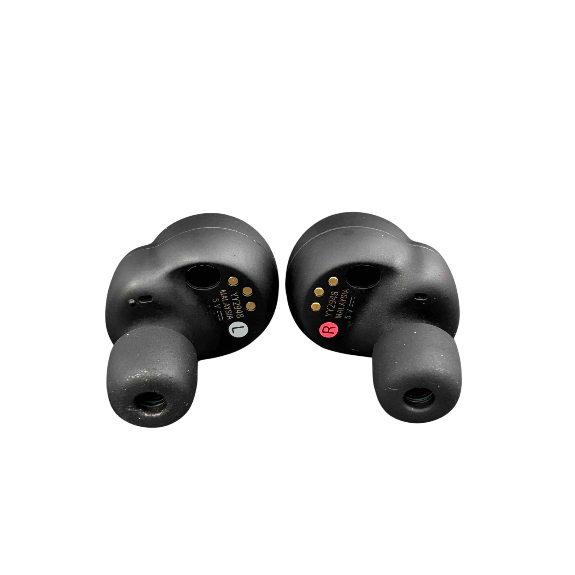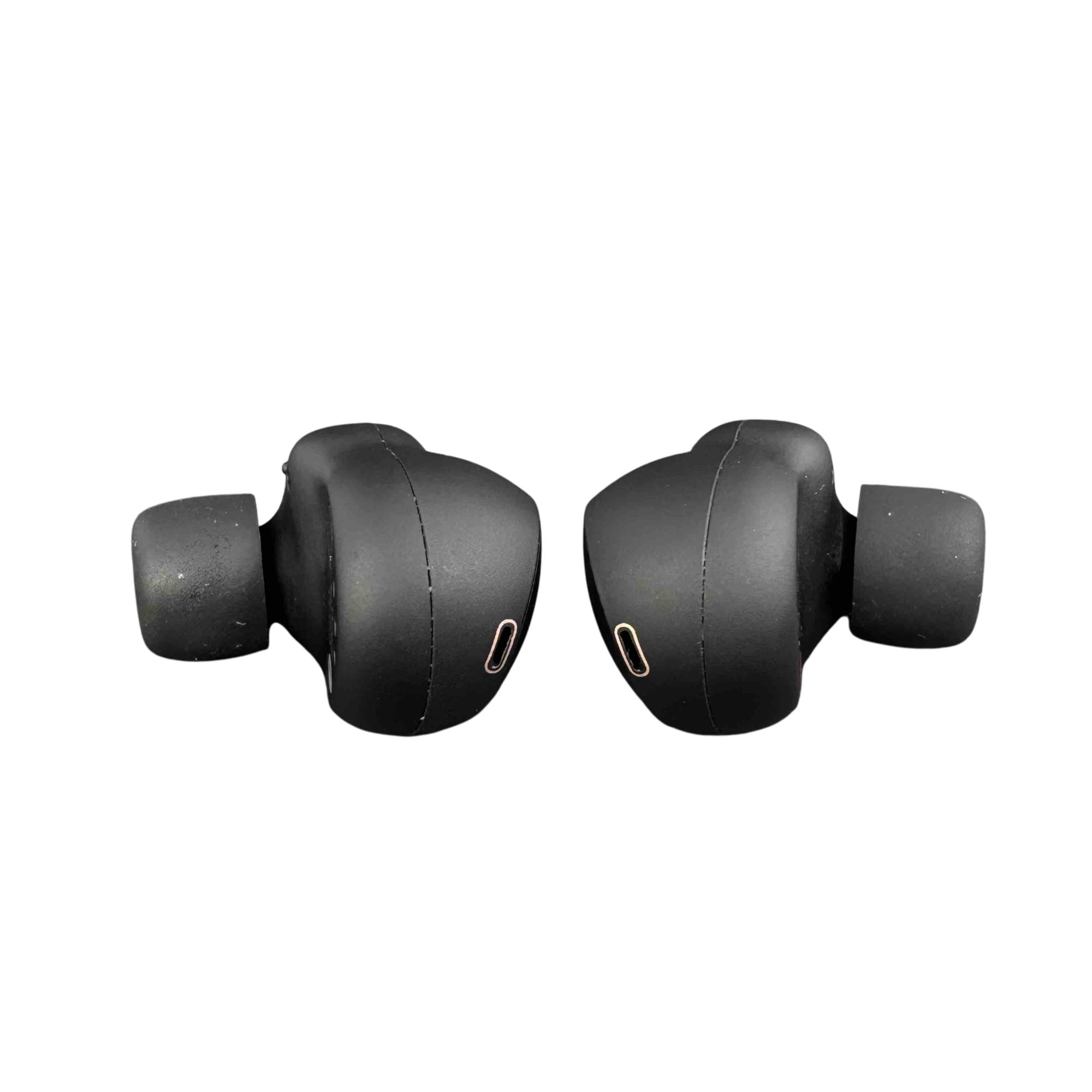 Sony WF-1000XM4 Noise Canceling Wireless Earbuds feature advanced noise cancelling technology with a sleek black design and gold accents. These earbuds offer high-quality wireless Bluetooth connectivity with efficient power input/output specifications for extended use. Made by Sony Corp. in Malaysia, they are optimized for superior sound and comfort.