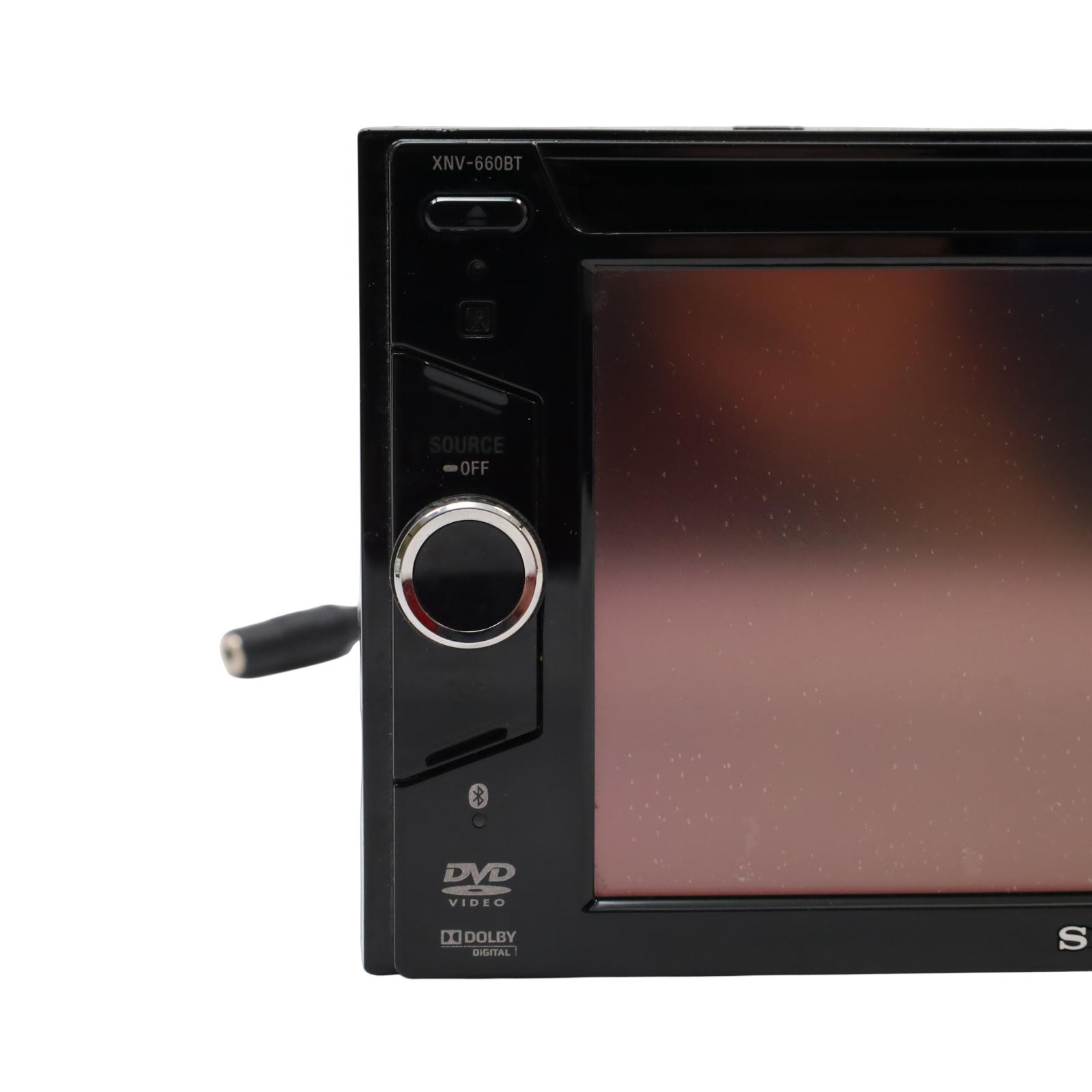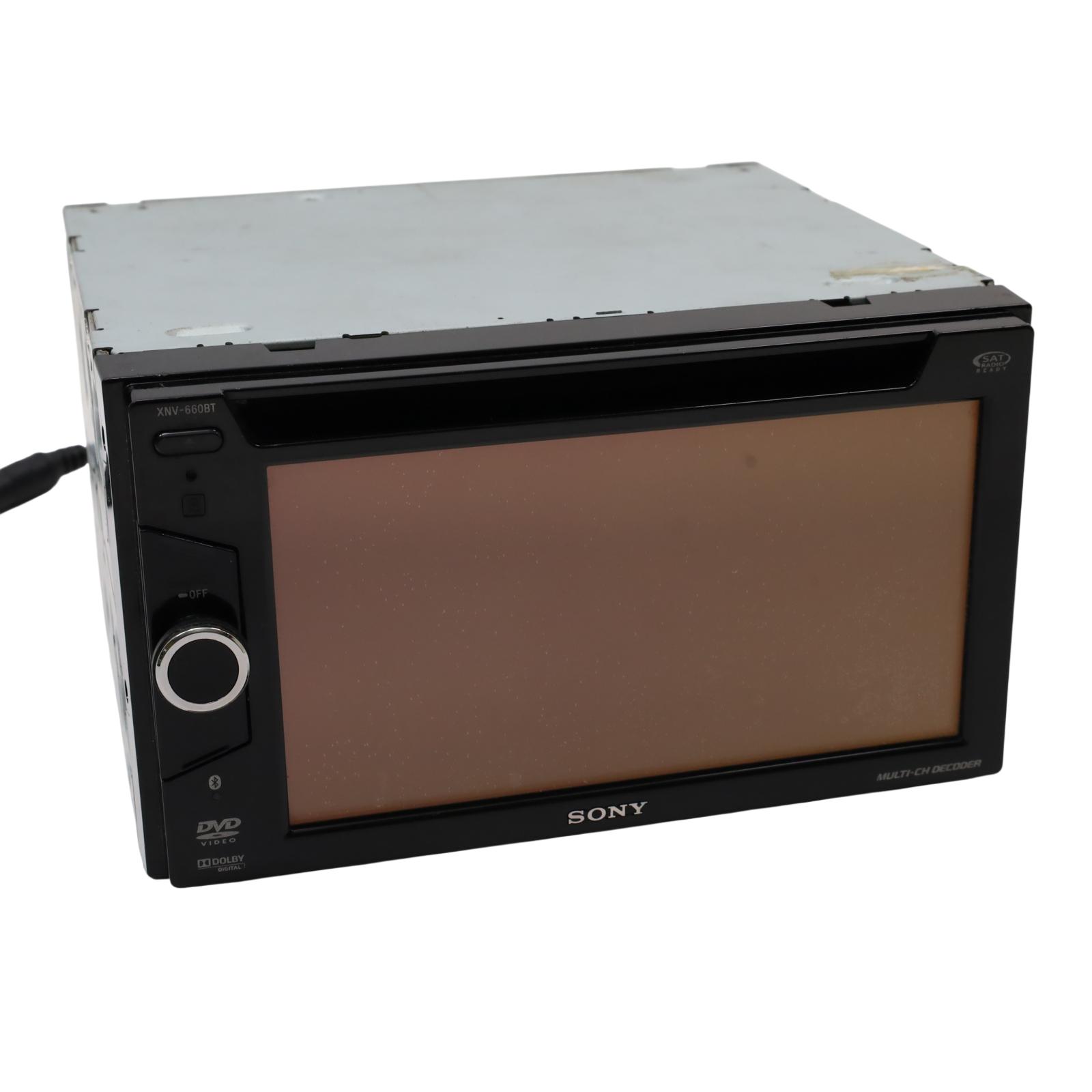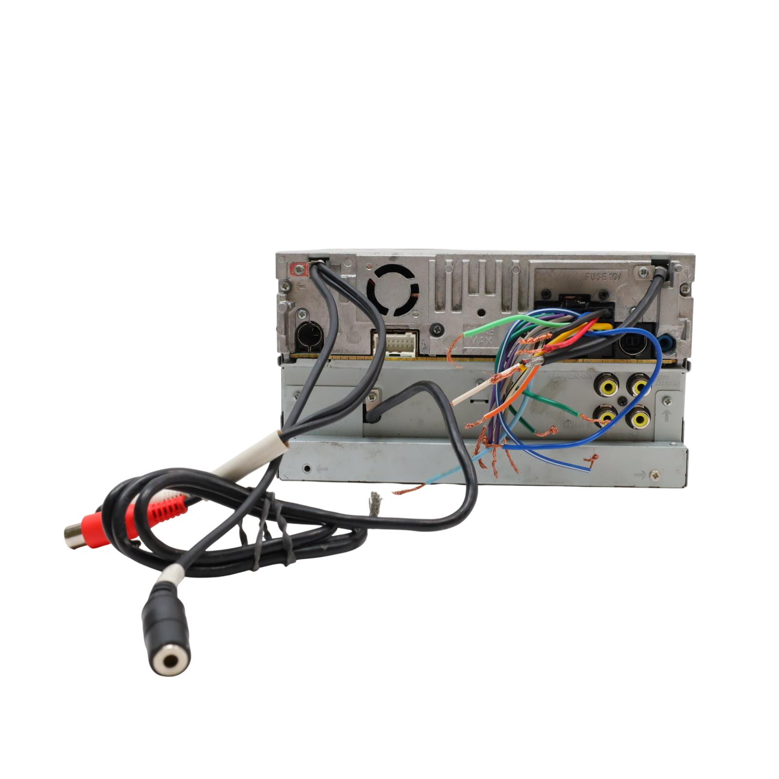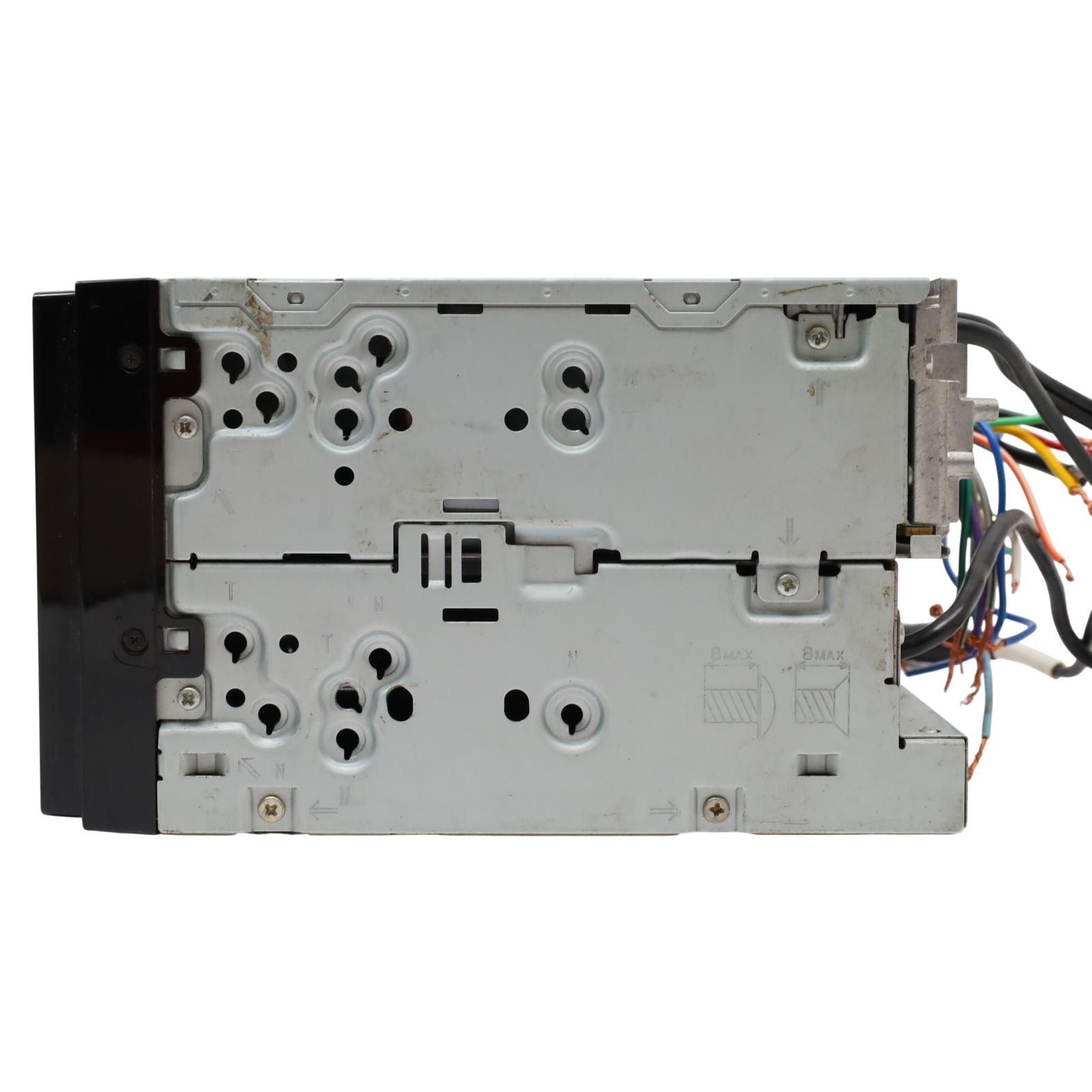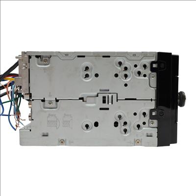 A double-DIN in-dash multimedia receiver featuring a 6.1-inch touchscreen display and an integrated TomTom navigation system with U.S. and Canada map coverage and a detachable navigation module that can be updated via computer, along with Advanced Lane Guidance and extensive points-of-interest data; it includes a built-in internal amplifier rated at 17 watts RMS per channel (CEA-2006) driving four channels, Bluetooth support for hands-free calling and wireless audio streaming, and broad media playback support for DVD, CD, MP3, WMA, AAC audio files, JPEG images, and MP4 video from disc or USB sources, complemented by a 24-bit digital-to-analog converter, high-pass and low-pass filters, and a 7-band EQ with multiple preset curves; expandability includes rear USB, rear A/V input, rear-view camera input, compatibility with satellite radio and HD Radio tuners, built-in iPod control via optional adapter cable, six-channel 4-volt preamp outputs for front, rear, and subwoofer connections, and a dedicated video output, all housed in a chassis designed to fit standard 4-inch-tall double-DIN dash openings.