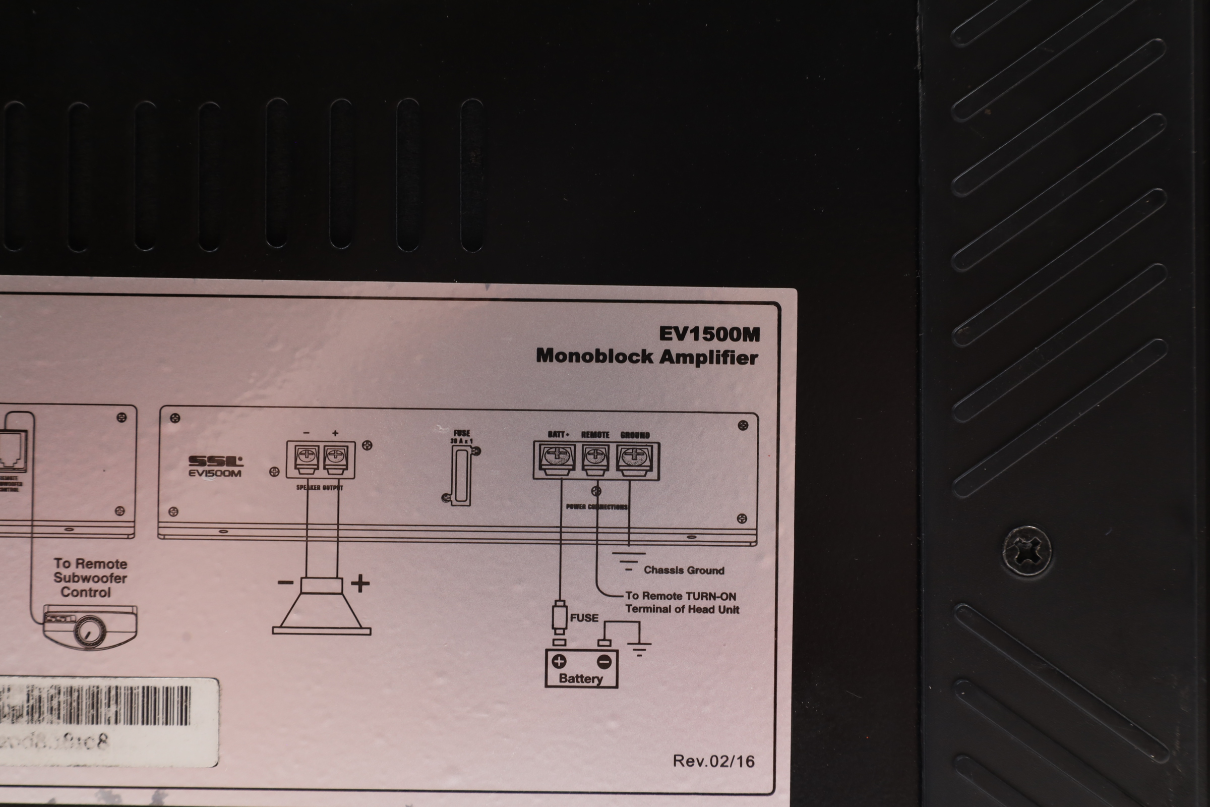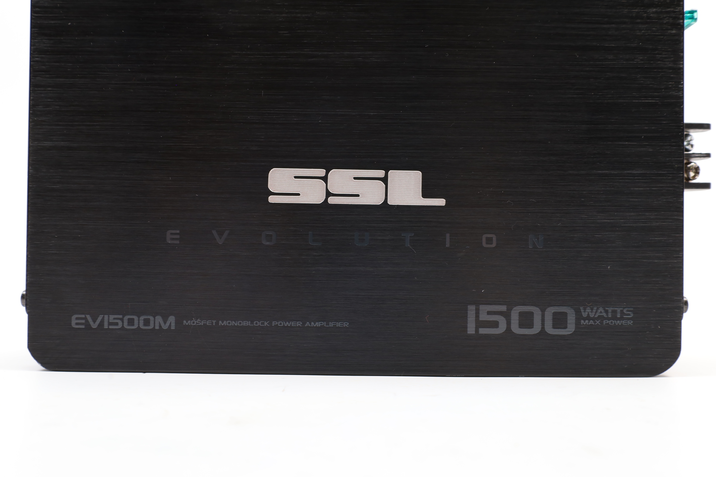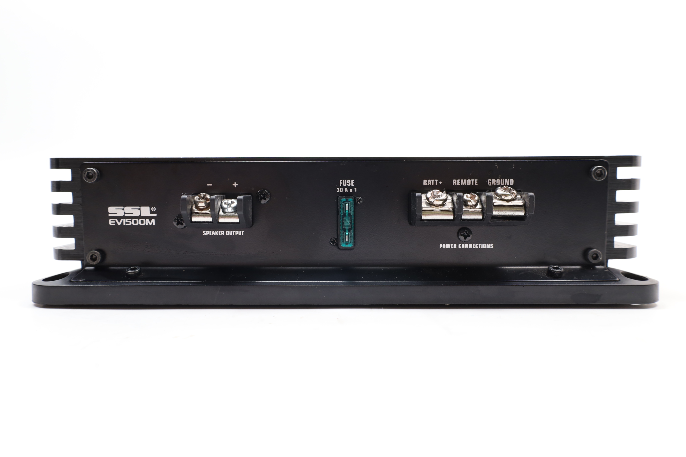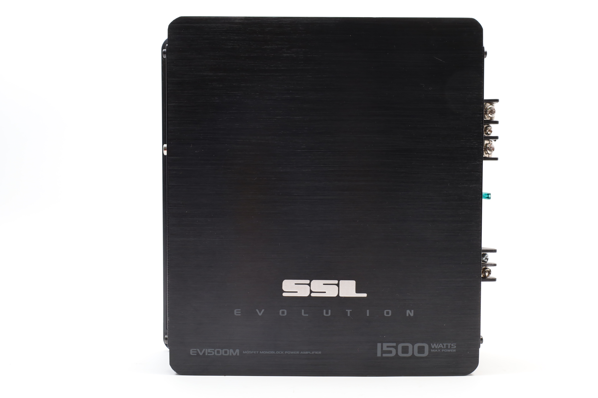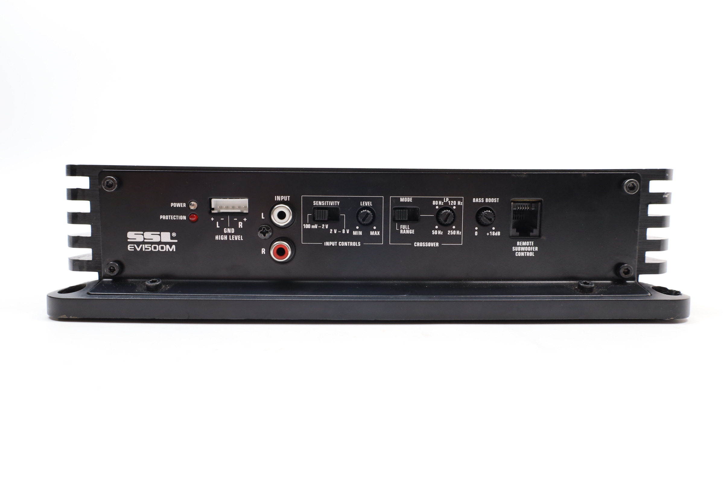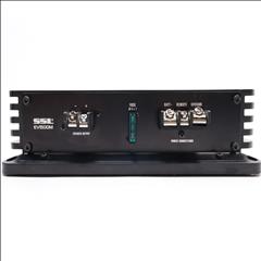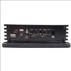 Features a Pulse Width Modulated MOSFET power supply for superior power and current output, and has dual LED indicators for power and protection status. The amplifier includes a soft turn-on circuitry to prevent high-volume damage, and a dark anodized aluminum heatsink for effective heat dissipation. Controls for crossover and gain are side-mounted for convenience, and the amplifier offers two-stage protection against thermal and speaker short circuits. It includes an on-board bass boost from 0 to +18dB at 45 Hz, a variable low-pass filter from 50 to 250 Hz at 12 dB per octave, and a frequency response range from 9 Hz to 50 kHz. The connectors are nickel plated, supporting both ring and spade types, and it has RCA inputs for low level and stereo speaker level inputs. The amplifier provides a maximum power output of 1500 watts at 2 ohms and an RMS power output of 563 watts at 4 ohms.