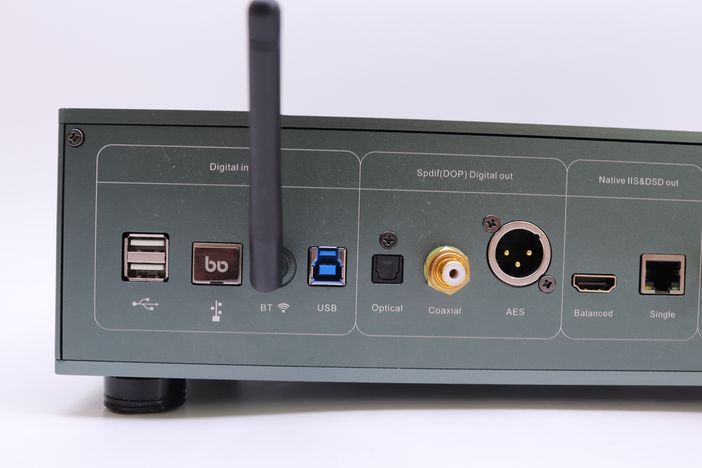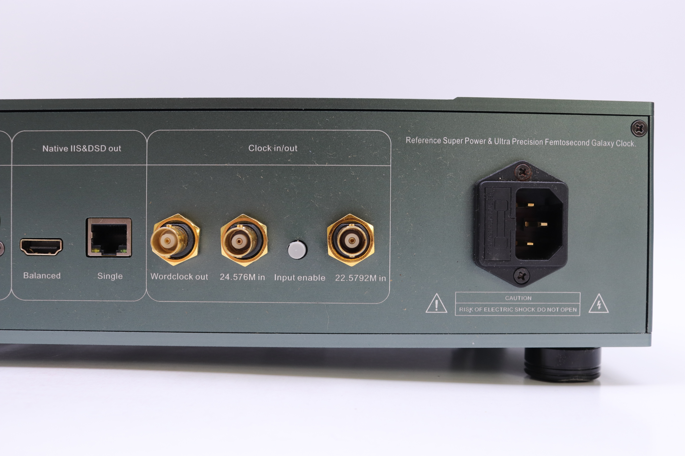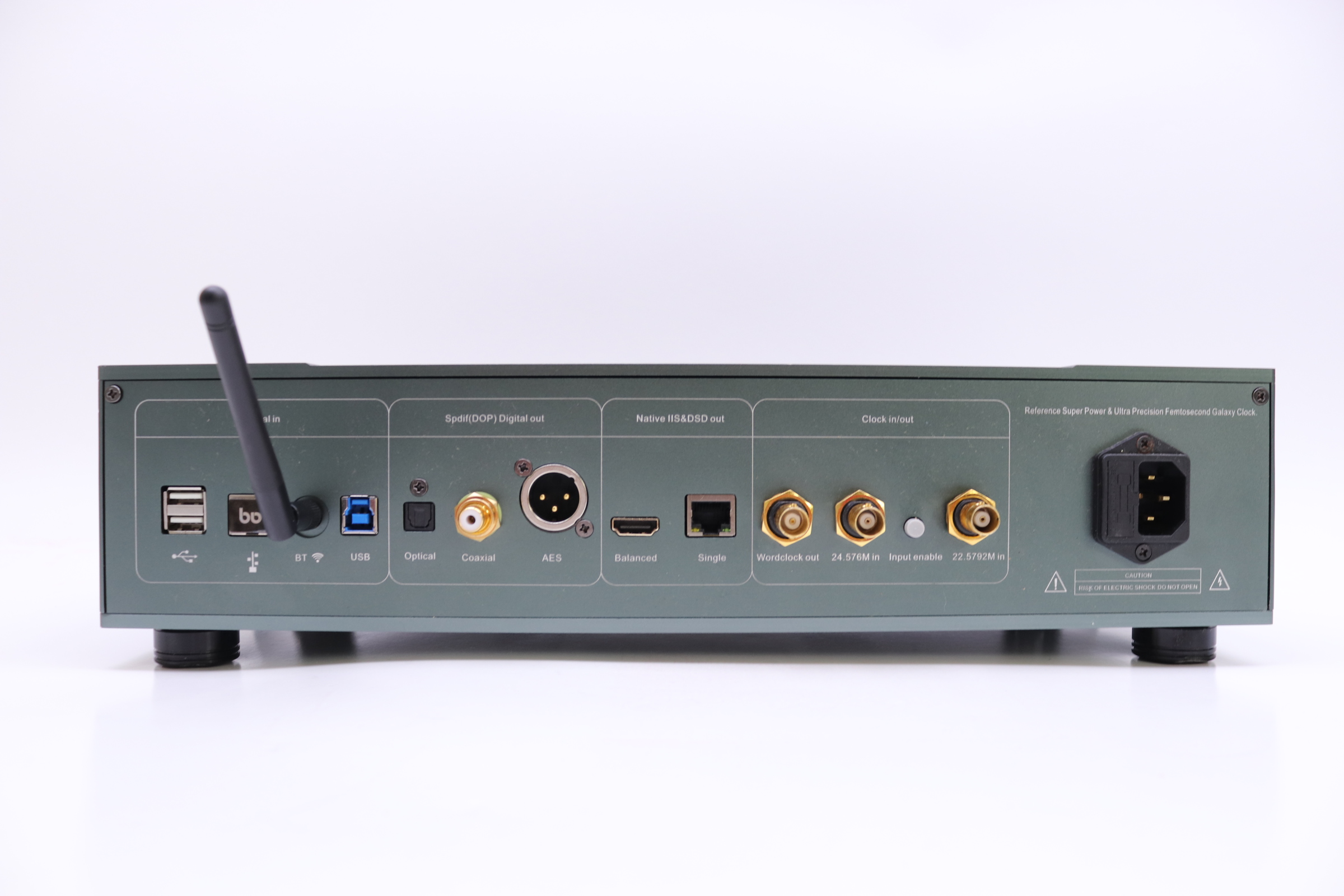 A high-end digital transport device designed for professional high-performance HIFI playback. It offers a plethora of connectivity options including SD card slot, USB 2.0 and 3.0, RJ45/Ethernet for DLNA, Samba and AirPlay network streaming, WiFi antenna with Bluetooth APTX, and various digital audio interfaces. The D300Ref is built with a focus on accurate data, stable clock, synchronous data and clock, complete waveform, and low noise, using a super-capacitance power supply system, precision clocks, and custom FPGA code. It supports various file formats including DSD128 (ISO/DSF), 192kHz PCM for .wav/.flac and up to 48kHz PCM for other formats.