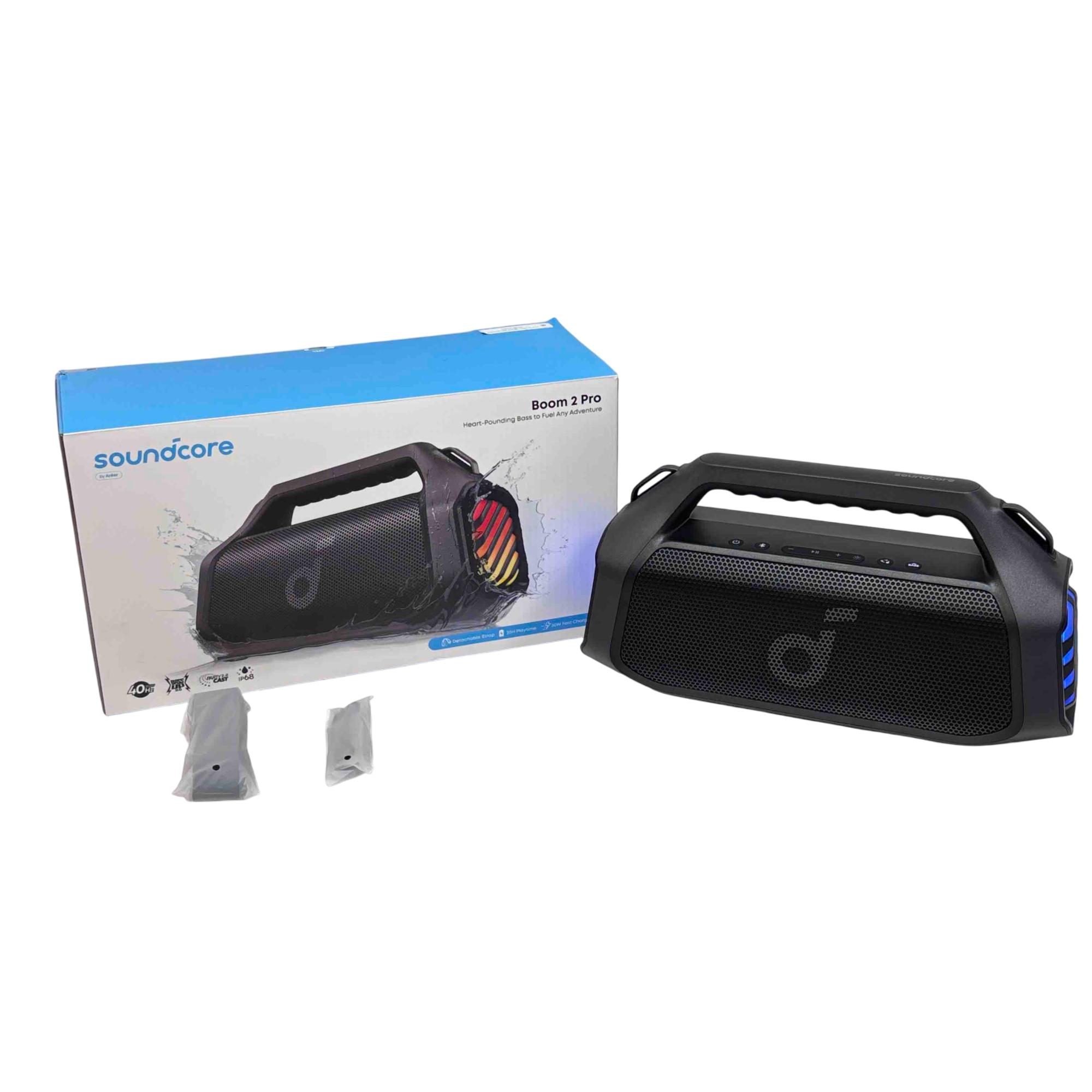 Elevate your outdoor gatherings with the Anker Soundcore Boom 2 Pro, a portable Bluetooth speaker that delivers heart-pounding bass and immersive sound. Designed with a built-in handle for easy carrying, IPX8 waterproof rating, detachable strap, and this rugged speaker is perfect for any adventure. Experience booming audio power, vibrant LED lights, and fast charging in a single, high-performance device.