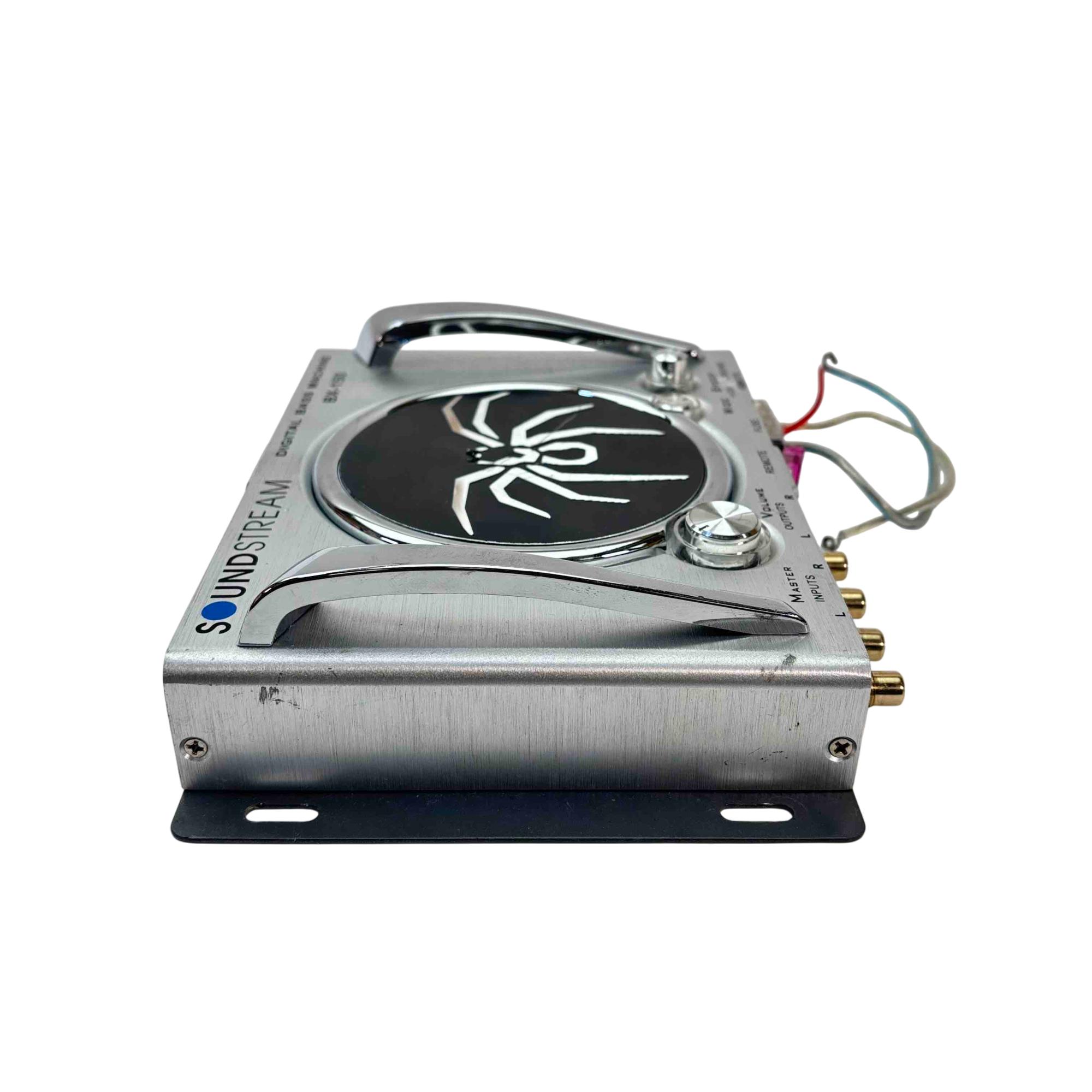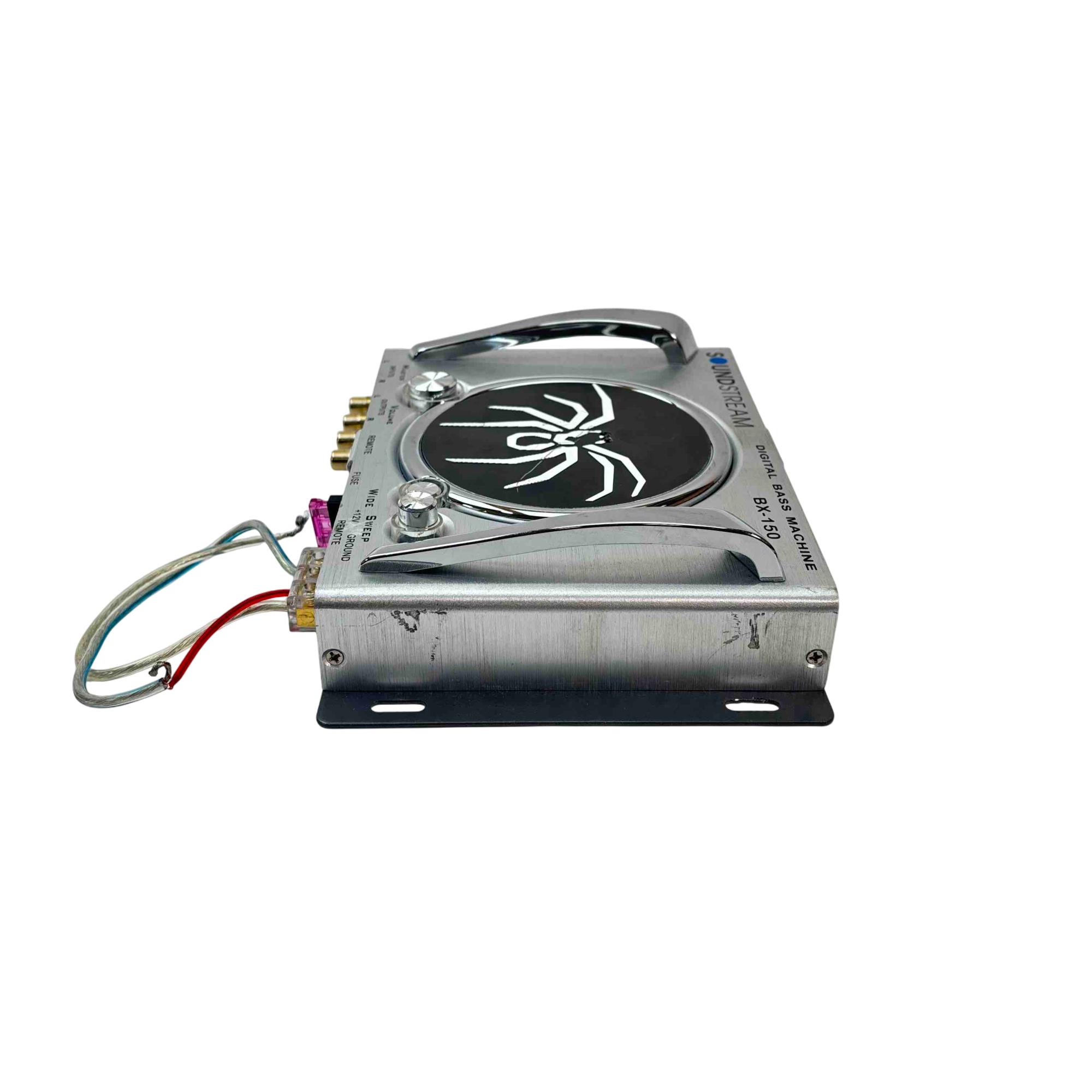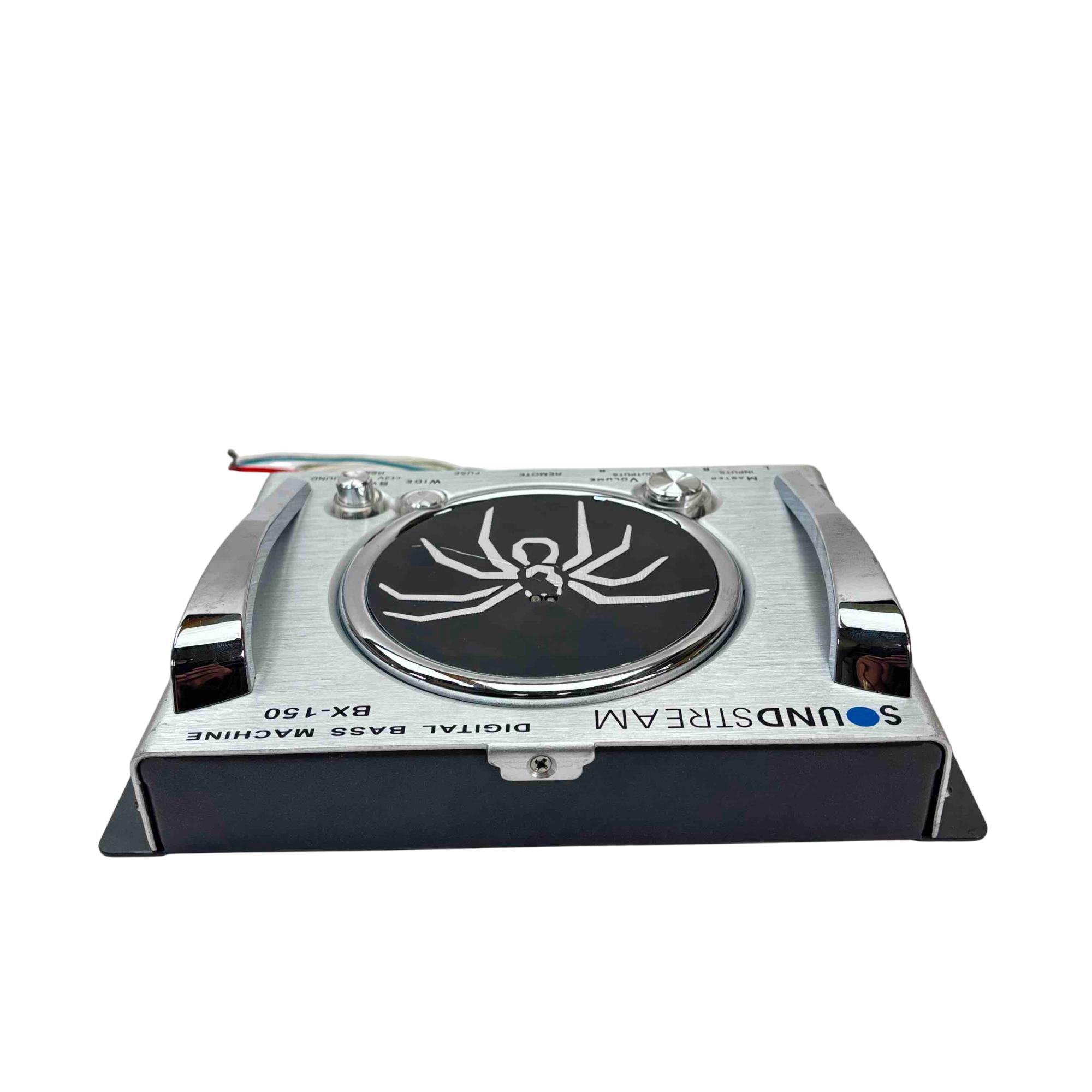 Enhance your car audio experience with the Soundstream BX-150 Digital Bass Machine. This compact and stylish silver and black device, featuring a striking spider design, delivers superior bass enhancement with adjustable master volume and wide sweep control. Easy to install with its plug-and-play interface.