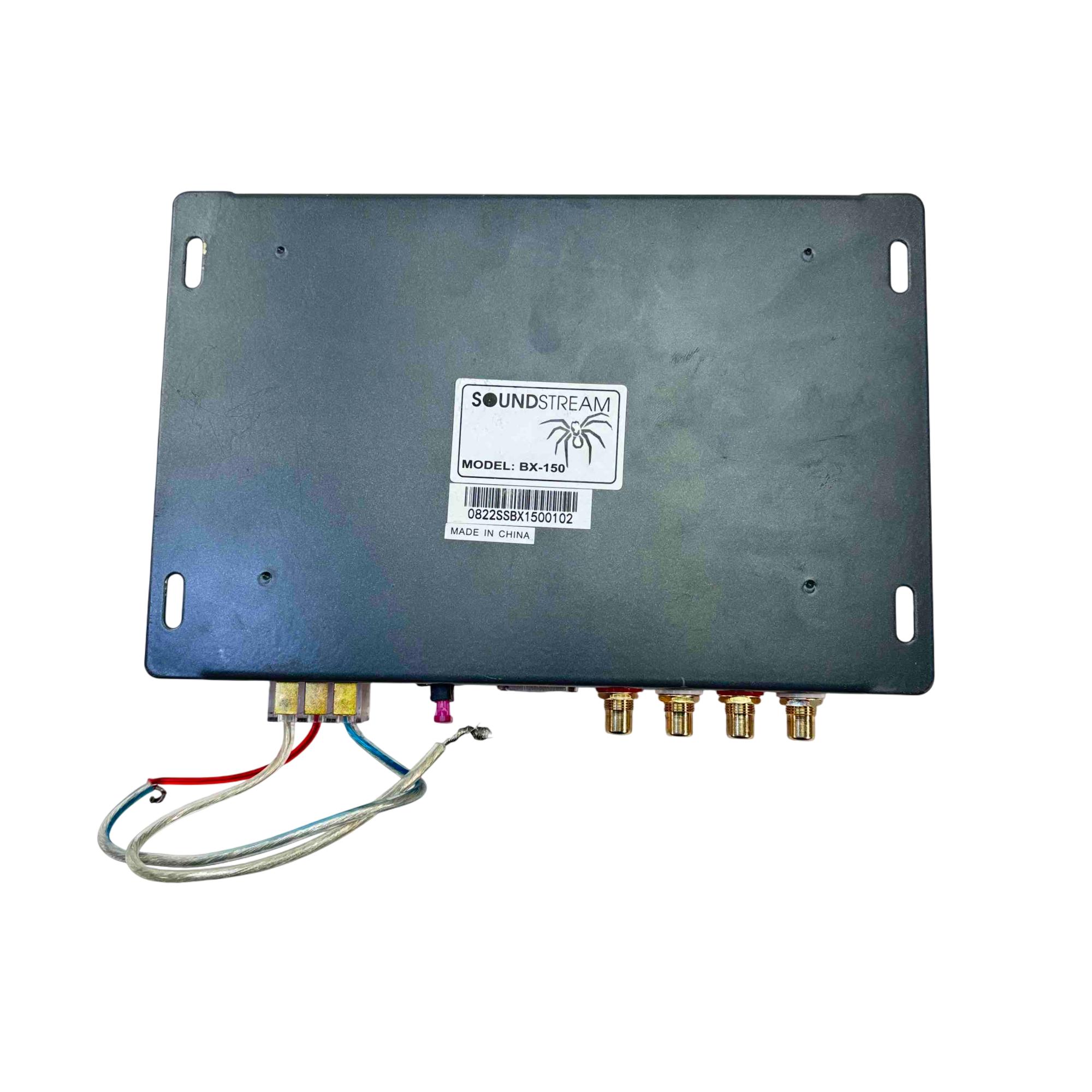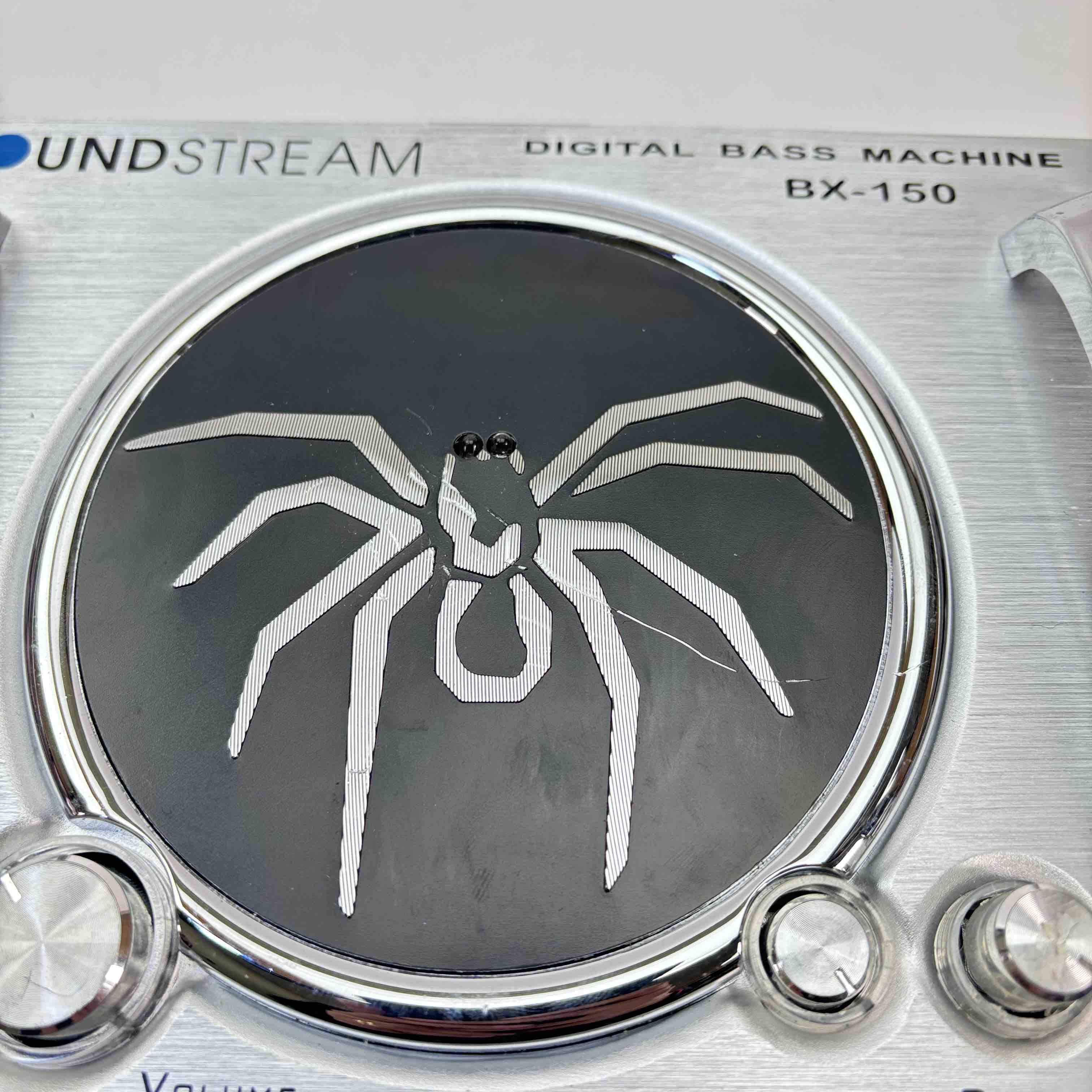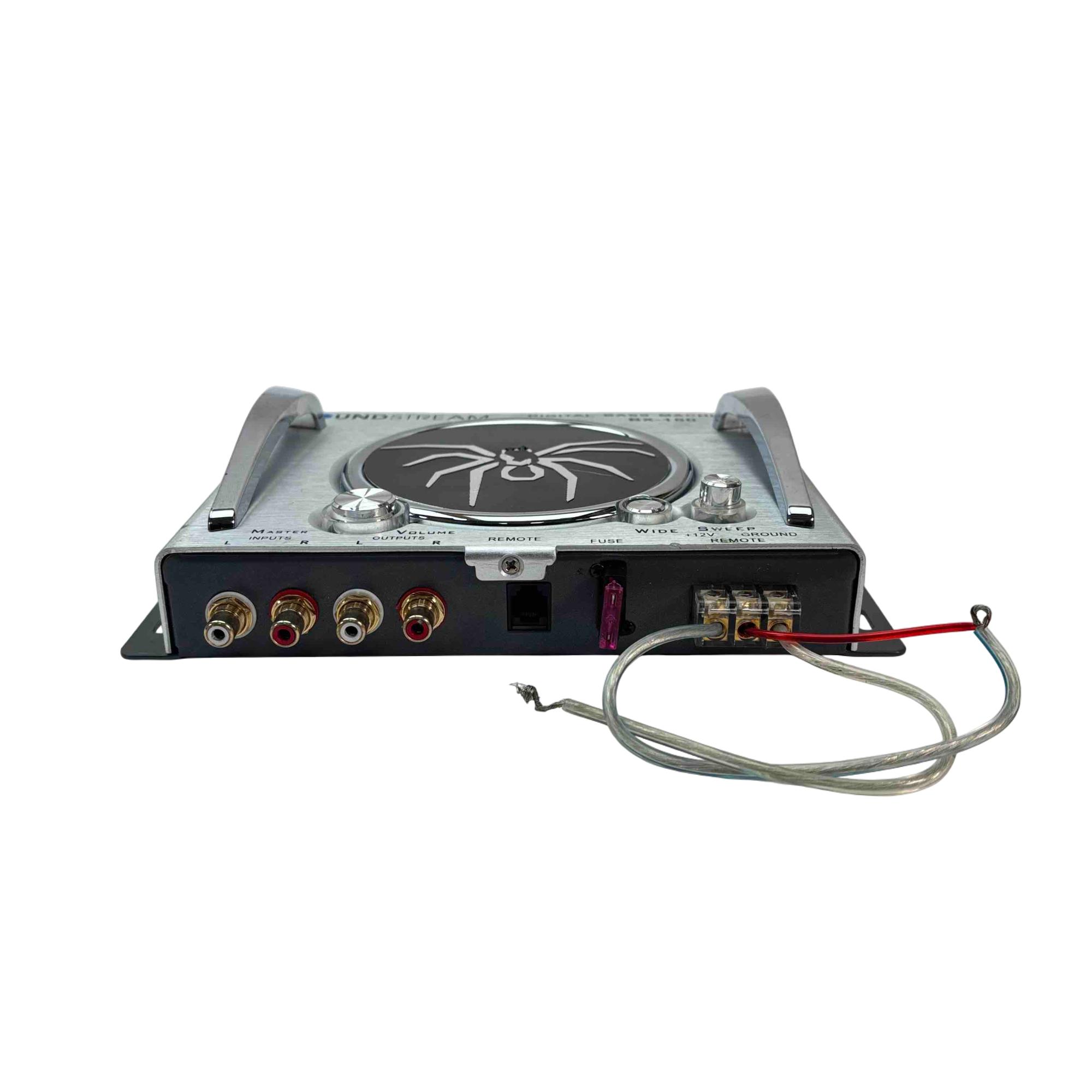 Enhance your car audio experience with the Soundstream BX-150 Digital Bass Machine. This compact and stylish silver and black device, featuring a striking spider design, delivers superior bass enhancement with adjustable master volume and wide sweep control. Easy to install with its plug-and-play interface.