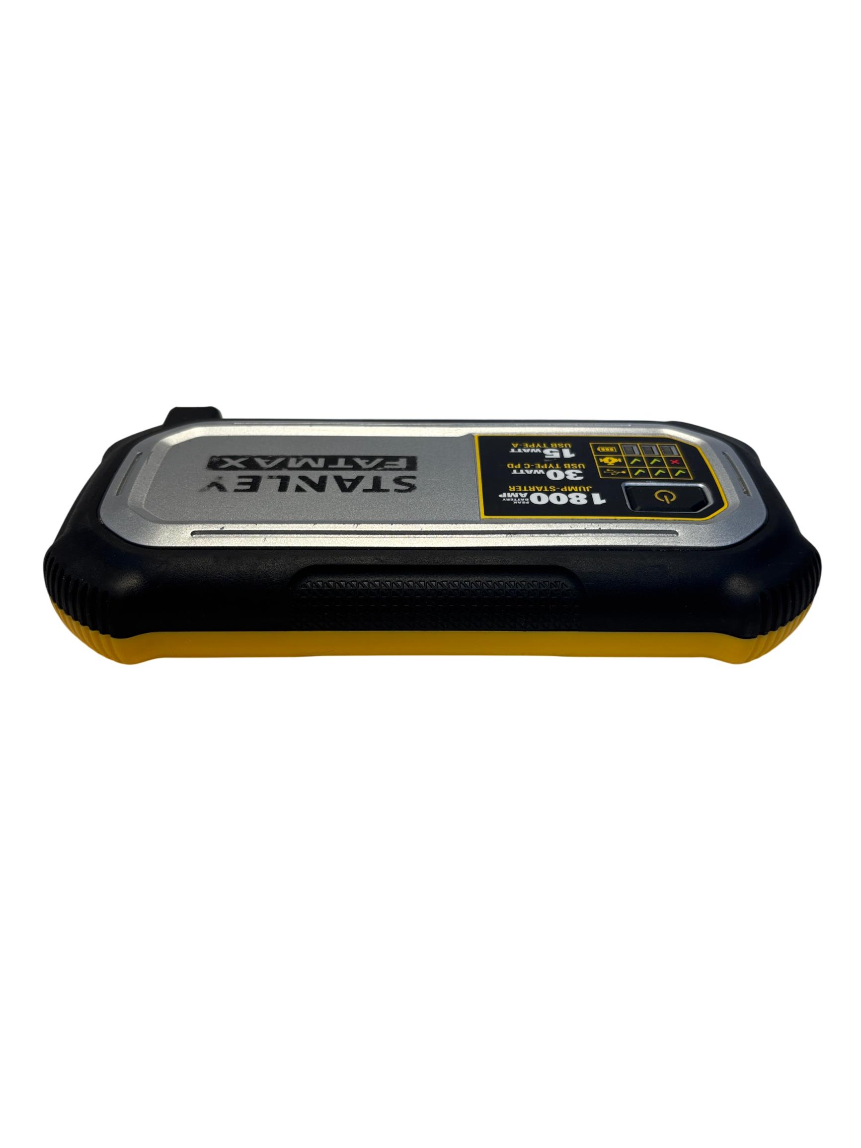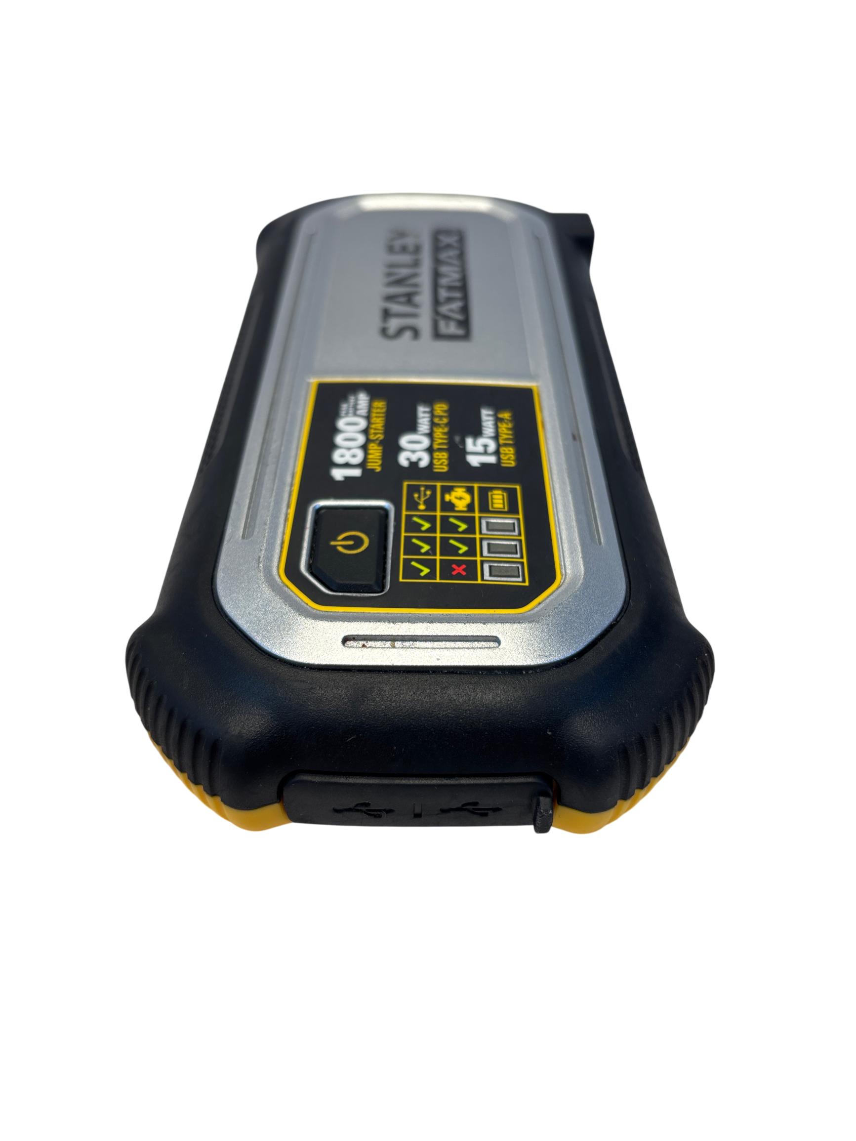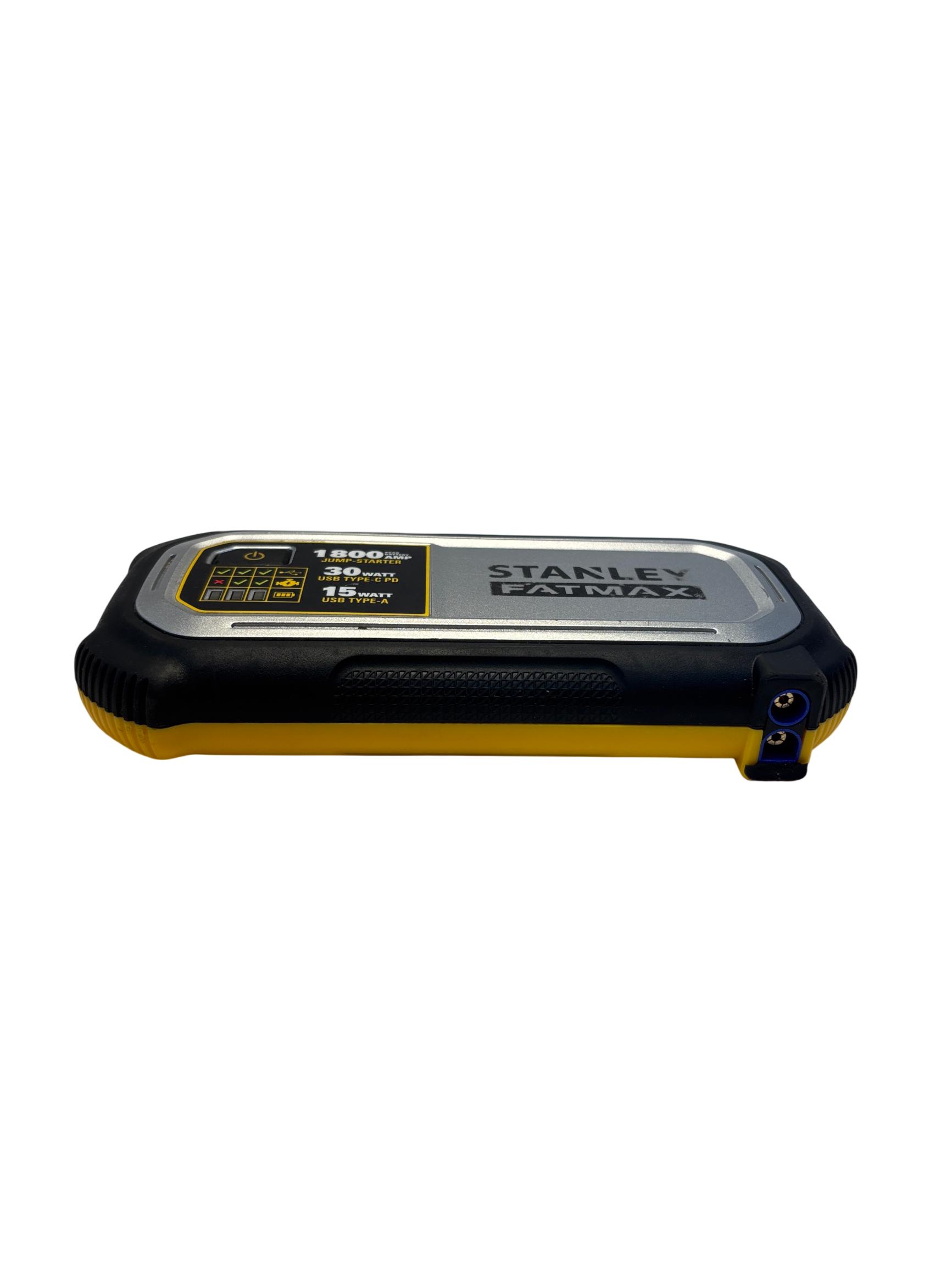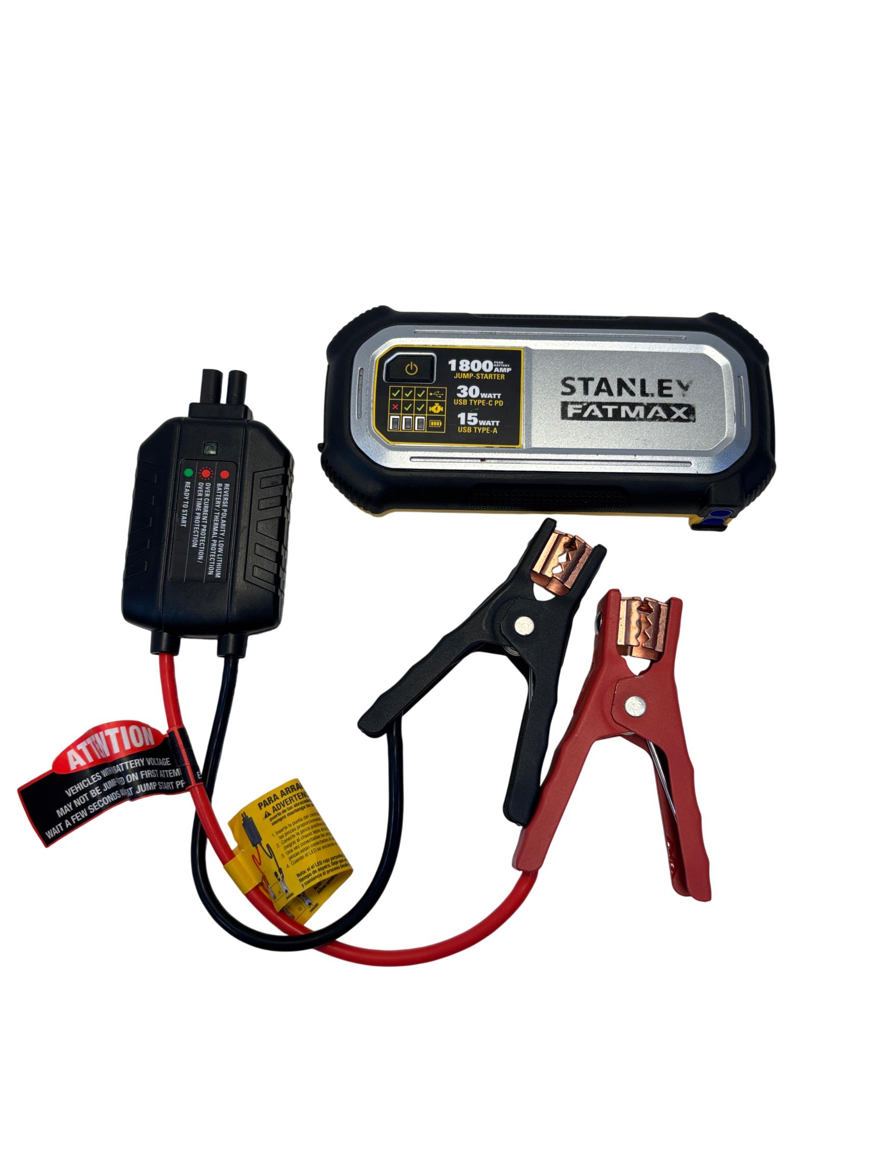 The Stanley FatMax 1800A Lithium Ion Jump Starter J18F delivers powerful 1800-amp peak current for quick vehicle starts and features versatile USB-C PD and USB-A outputs supporting up to 30W and 15W respectively for efficient device charging. Designed with multiple input voltage options and temperature operating ranges between 0 to 40 degrees Celsius, this compact and durable jump starter offers reliable performance with enhanced safety protections.