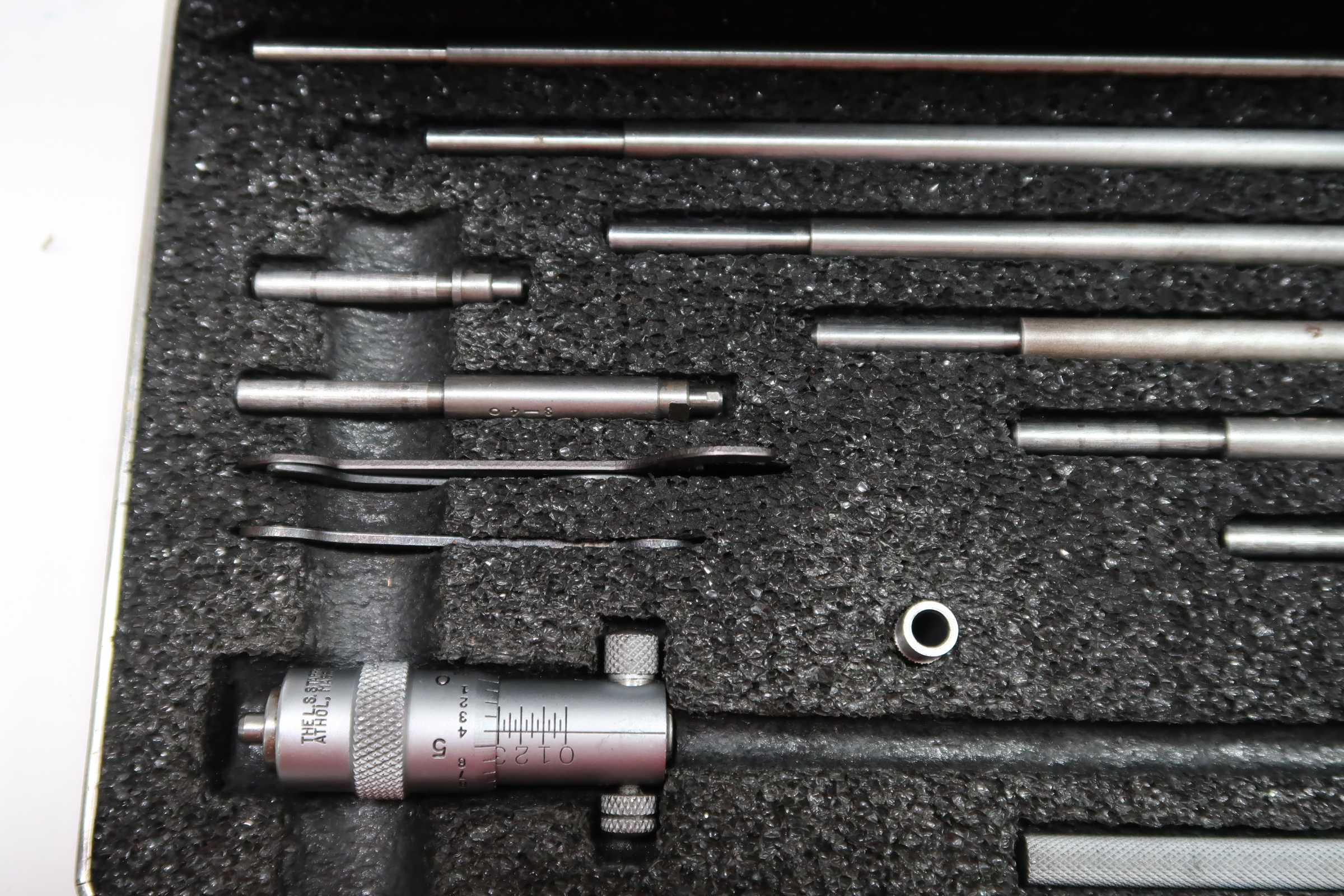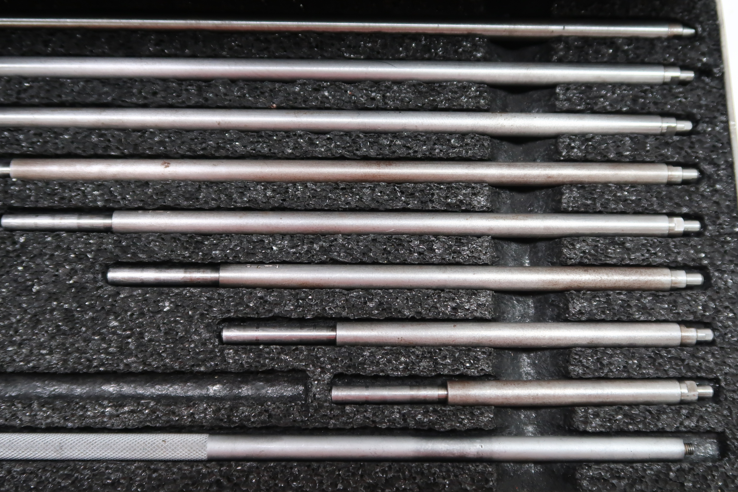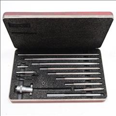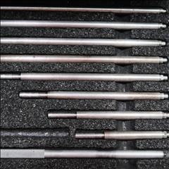 The Starrett 124 Solid -Rod Inside Micrometer Sets are one of the most popular inside micrometers because of their lightness, ease of use, and range. They are very useful for measuring inside diameters of cylinders and rings, measuring parallel surfaces, etc. The desired range is obtained by assembling rods and spacing collars to the micrometer head. Measuring rods are provided with a shoulder that is set accurately in the micrometer head and locked in position.