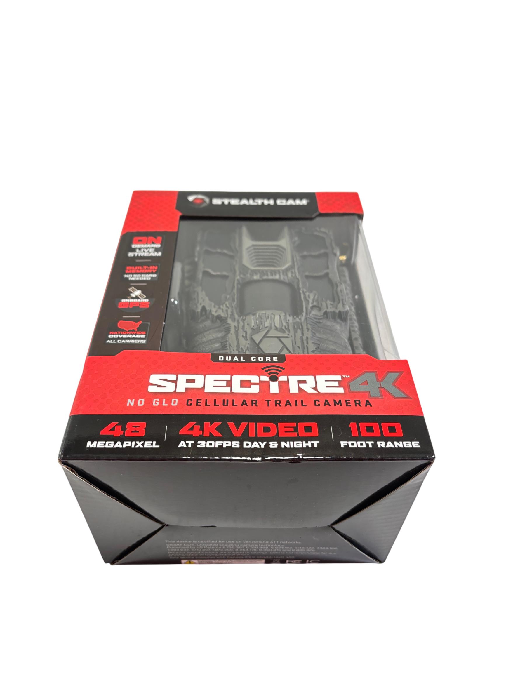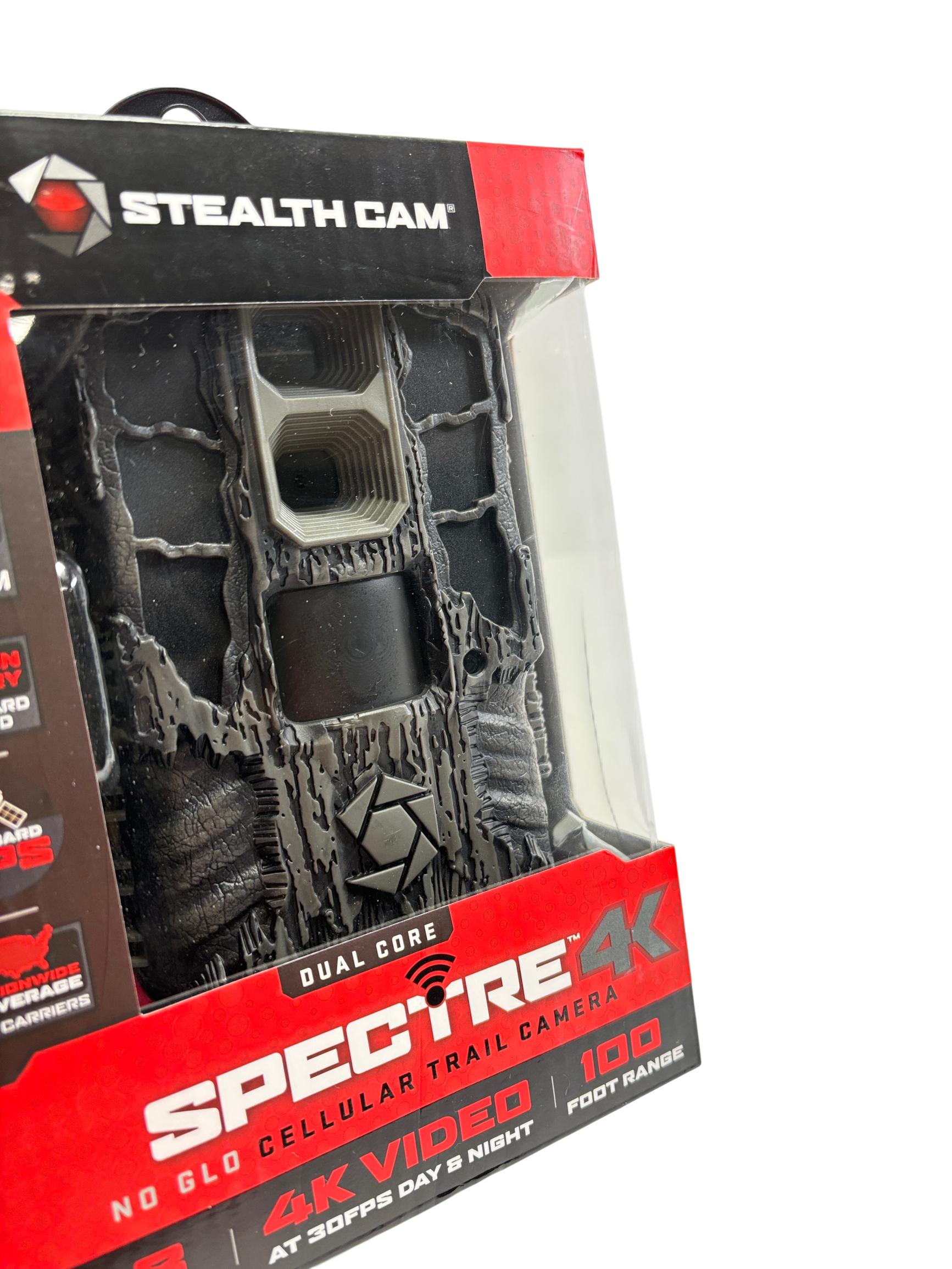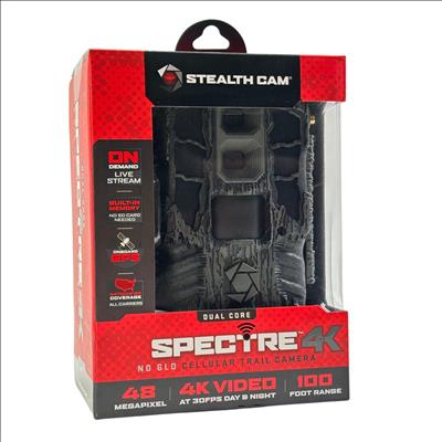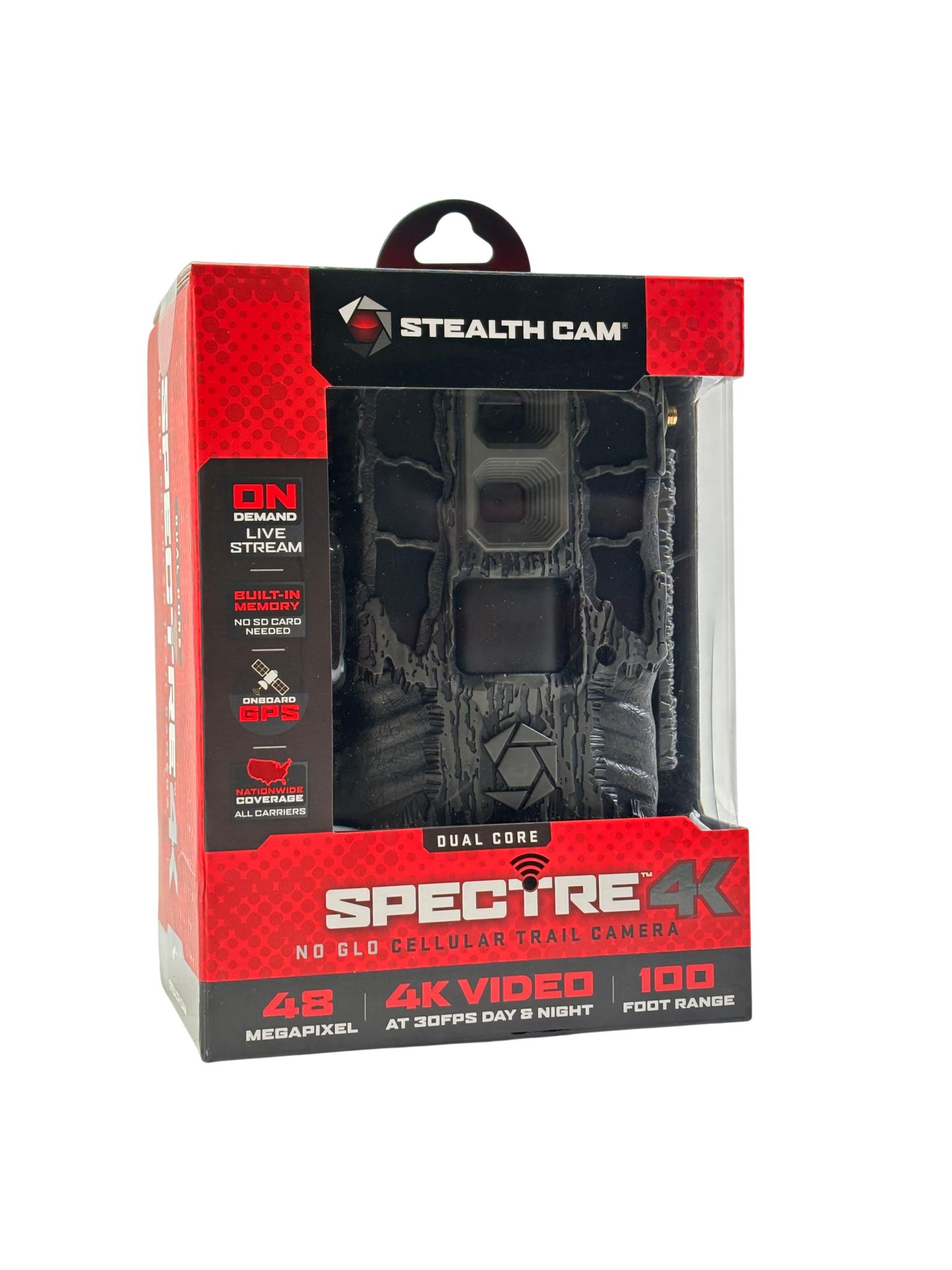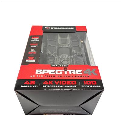 Stealth Cam Spectre 4K Dual Core No Glo Cellular Trail Camera features a 48MP sensor and captures ultra-high-definition 4K video at 30 frames per second, ensuring clear and detailed wildlife footage. Equipped with cellular connectivity and onboard GPS, it provides nationwide coverage across all carriers and supports real-time live streaming with built-in memory. Its advanced no glow infrared technology allows for discreet night surveillance within a 100-foot range, making it ideal for hunting and outdoor monitoring applications.