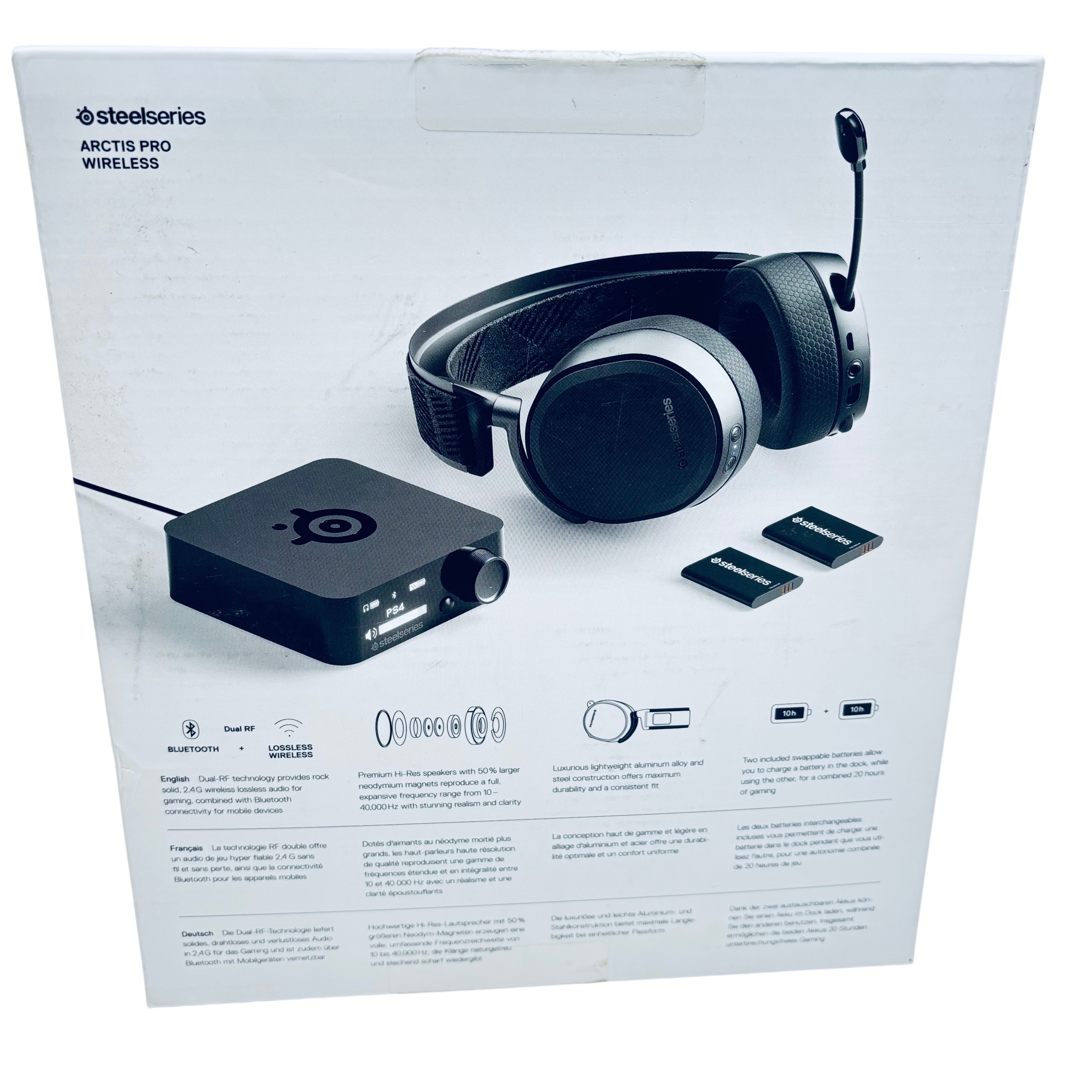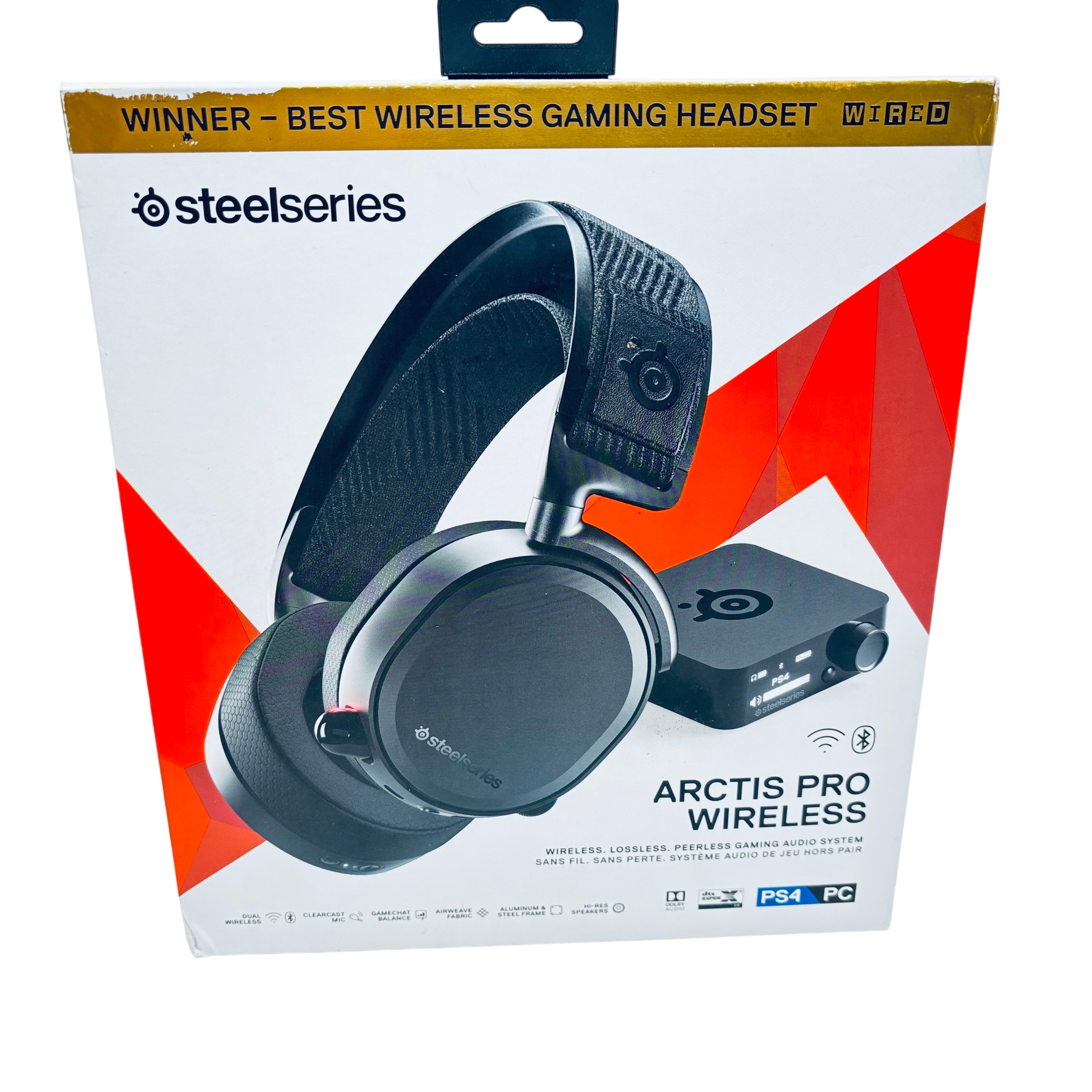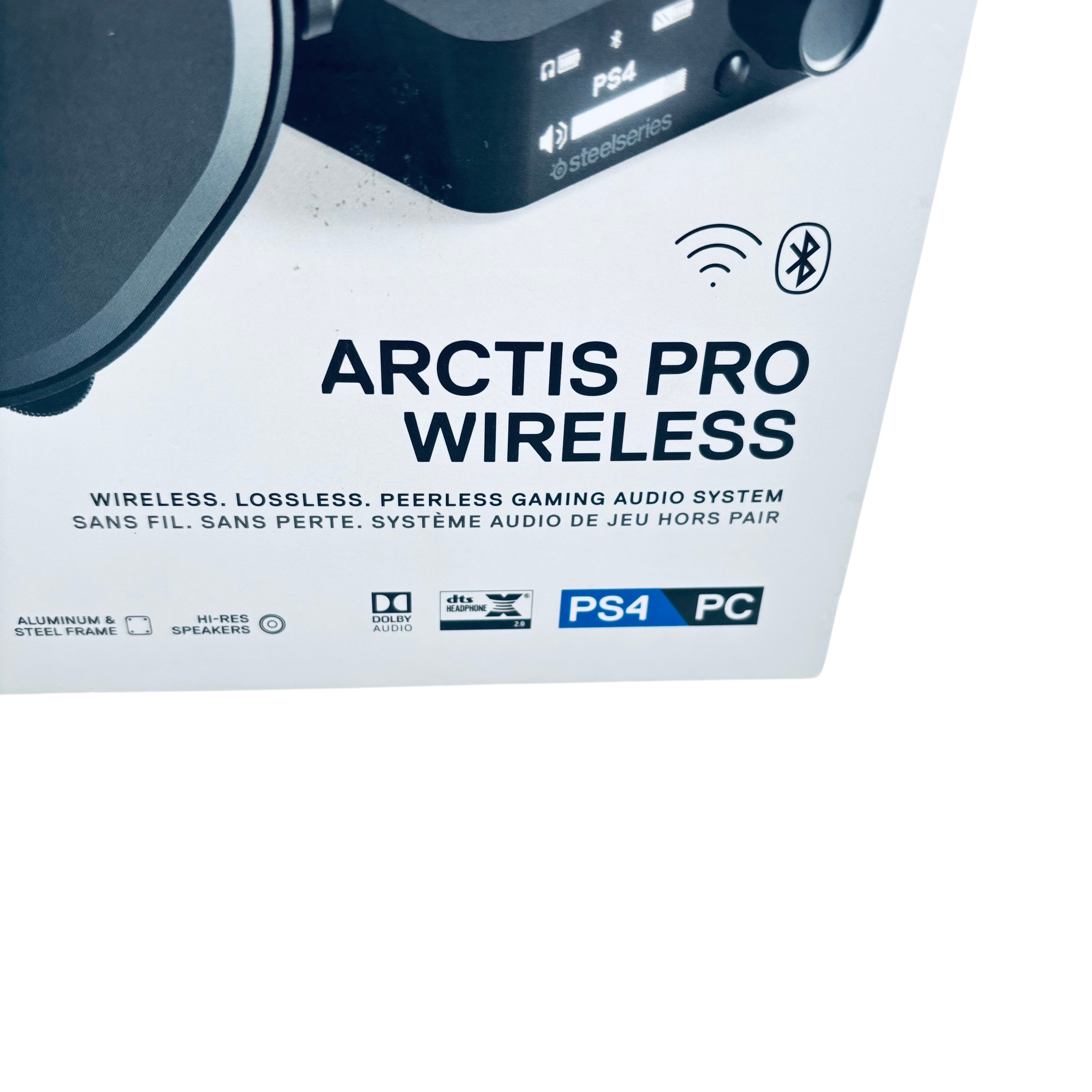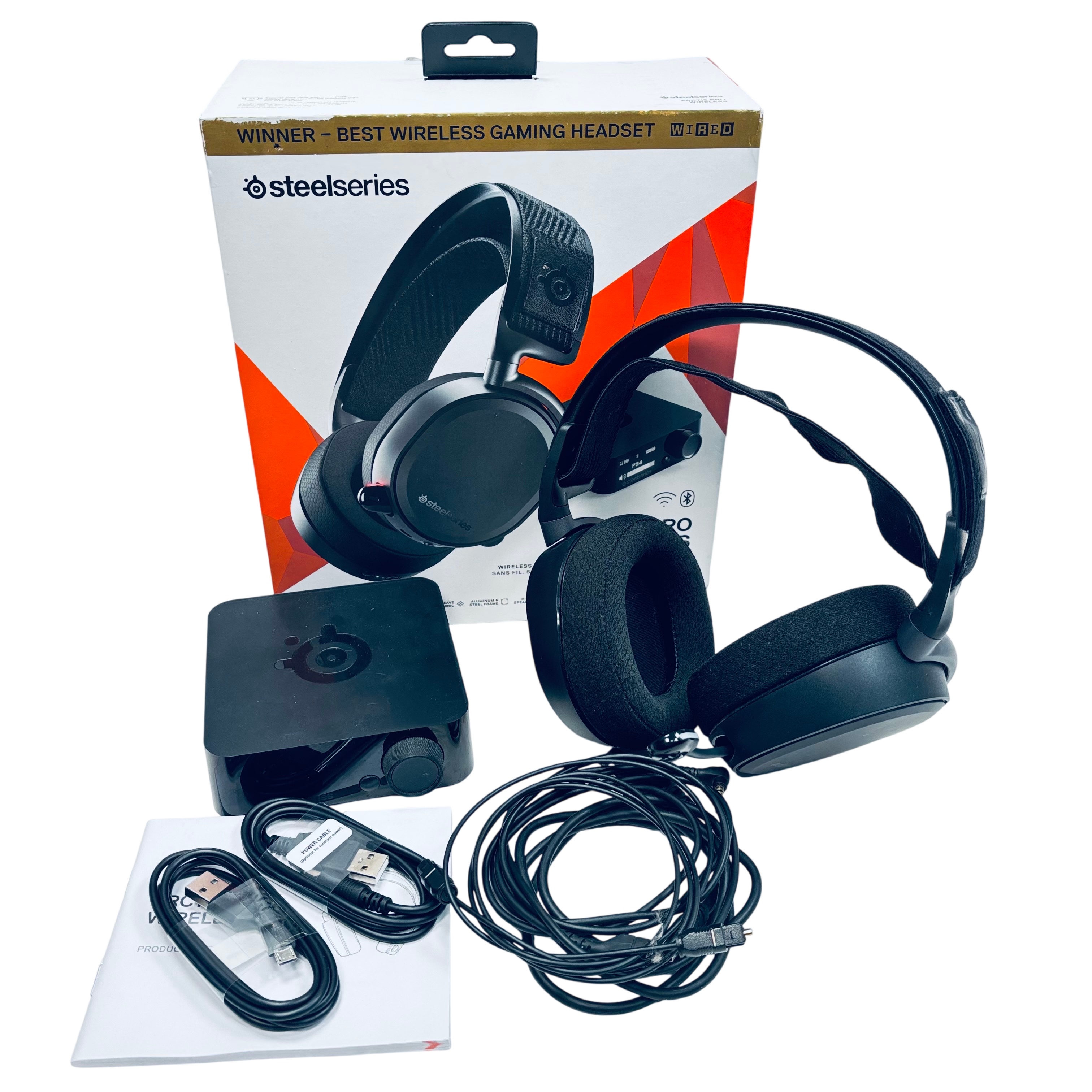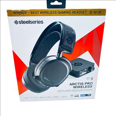 SteelSeries Arctis Pro Wireless Gaming Headset (Model 61473) delivers premium wireless audio with dual 2.4 GHz lossless and Bluetooth connectivity, supporting high-resolution sound up to 40,000 Hz. Designed with a durable aluminum and polished steel frame, it features comfortable AirWeave fabric ear cushions and a ClearCast bidirectional microphone for crystal-clear communication. This headset is compatible with PC and PlayStation 4, and includes a wireless transmitter base station, USB cables, audio cable, and user manual. Ideal for gamers seeking professional-grade audio performance and comfort during extended sessions.