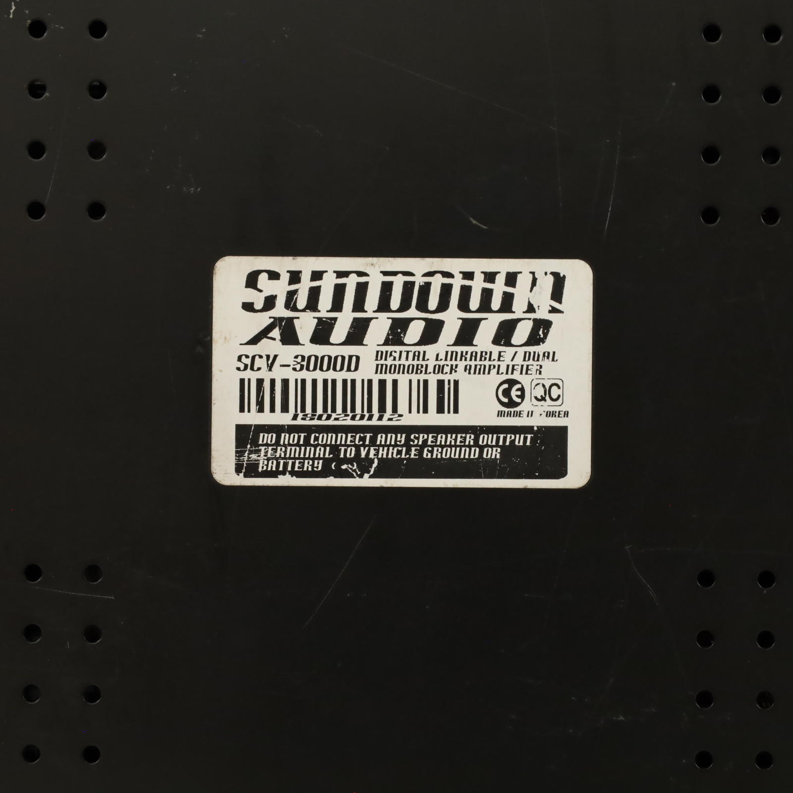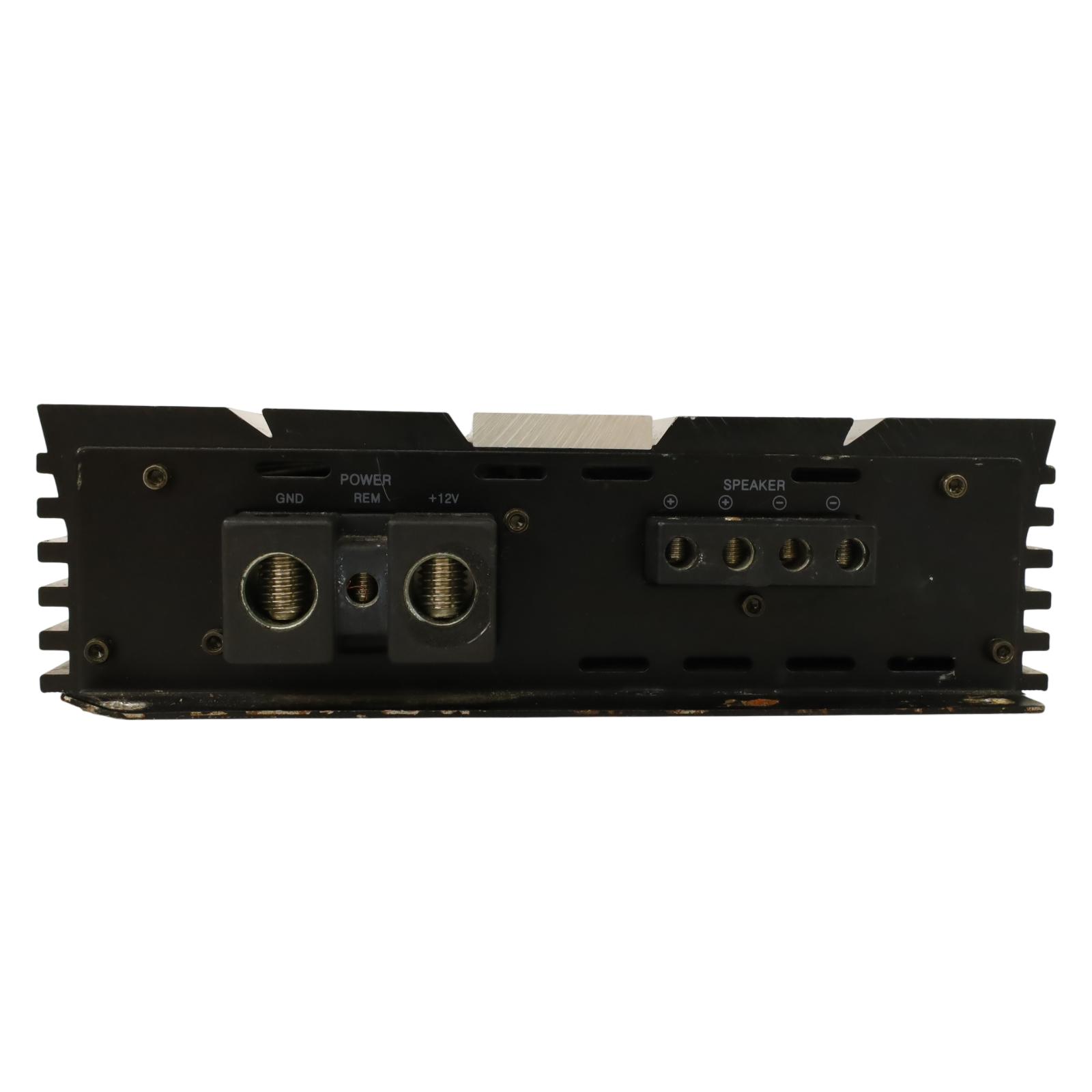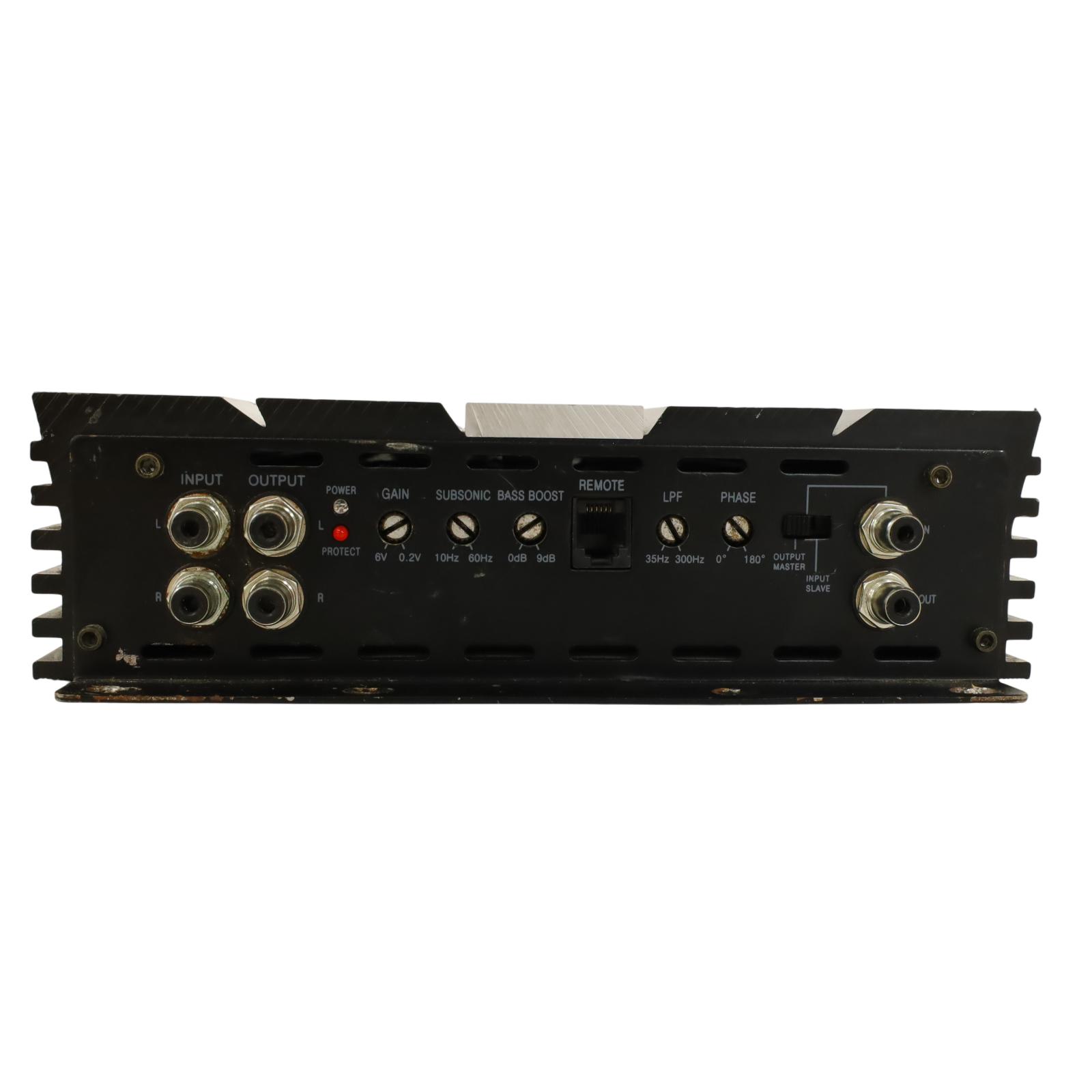 A monoblock Class D car amplifier delivering up to 3000 watts RMS at 1 ohm, with power ratings of 1500W at 2 ohms and 750W at 4 ohms. Designed for high-output subwoofer applications, it includes adjustable low-pass (35–300 Hz) and subsonic (10–60 Hz) filters, a 0–9 dB bass boost centered at 45 Hz, and a 0–180° phase shift control. The amplifier operates efficiently at 86% (4 ohms), maintains a signal-to-noise ratio of 90 dB, and features low total harmonic distortion under 0.1%. It accepts input voltages ranging from 6 to 0.2V and is recommended to be fused at 250A. The unit measures approximately 18.89" long, 8.25" wide, and 2.32" high.