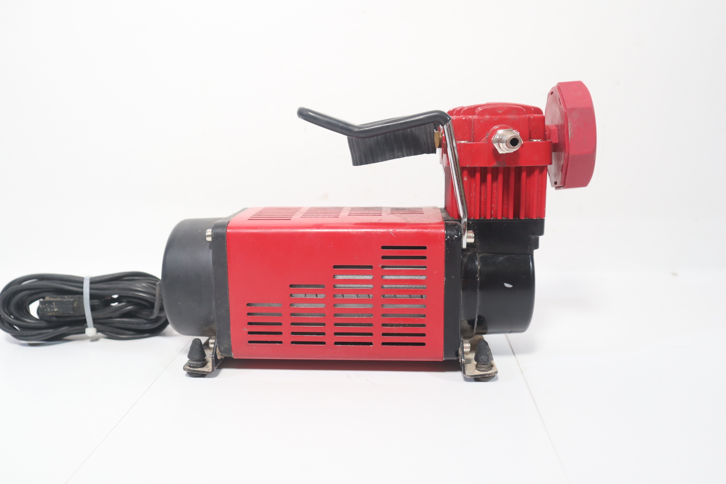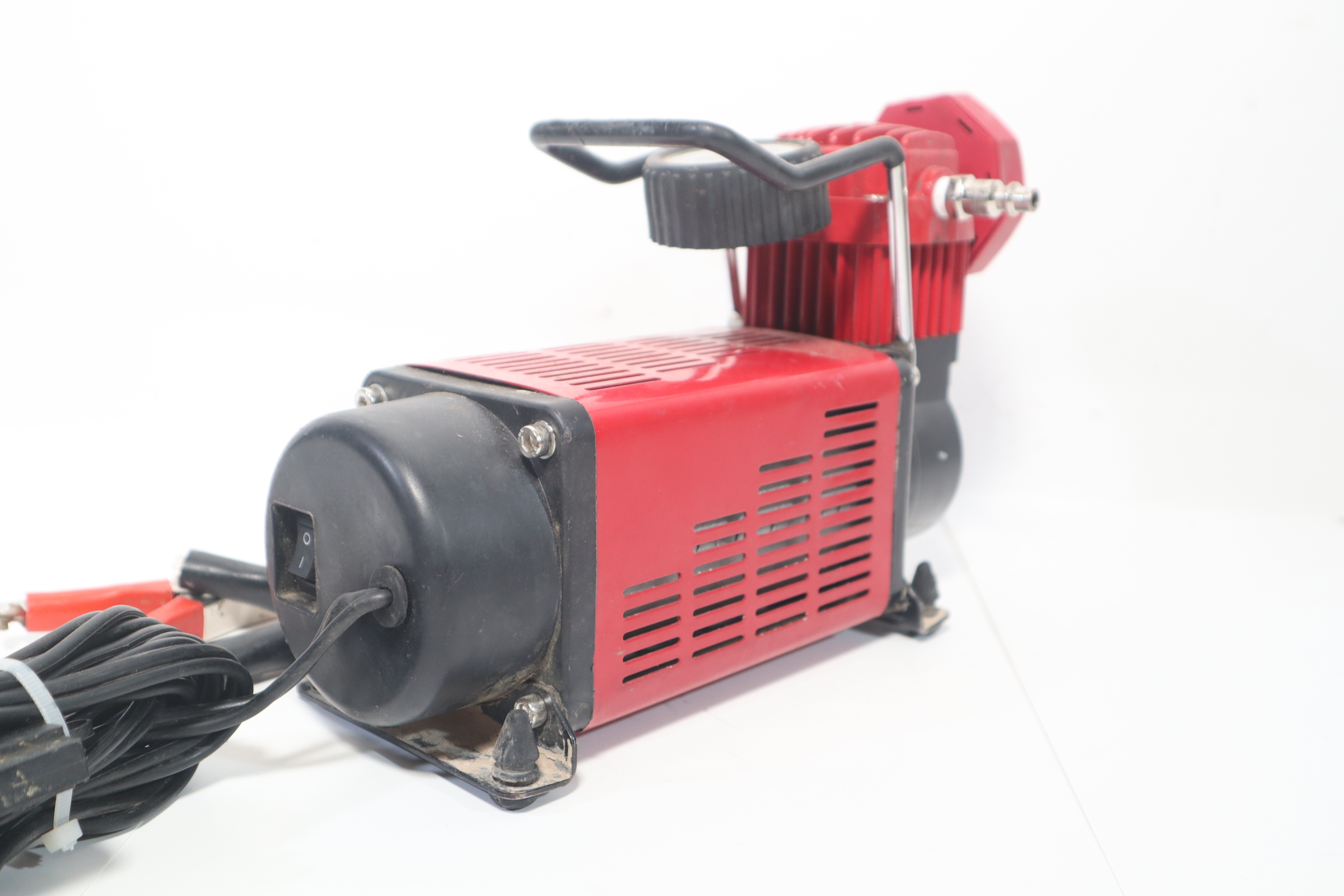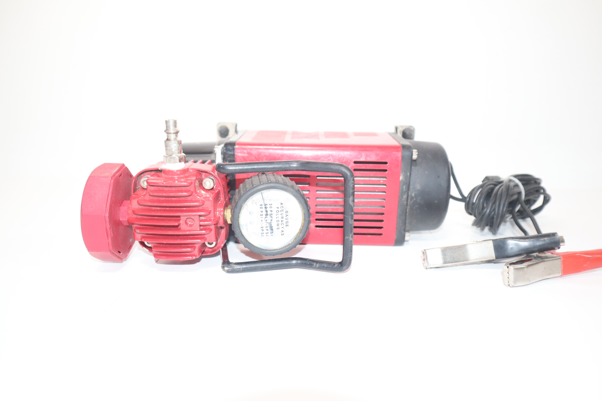 The SuperFlow MV-50 is a portable tire inflation system designed for inflating full size 4X4, truck, SUV, and RV tires. The MV-50 air compressor is a rugged direct drive 12-volt, 30-amp air compressor with an outstanding 3500 cubic inches of air flow. This tire inflator powers directly from your vehicle's battery with a 10 foot heavy duty power cord and alligator clips. Included is a 16 foot self-coiling air hose with quick connect type M automotive air fitting and easy twist brass inflator.