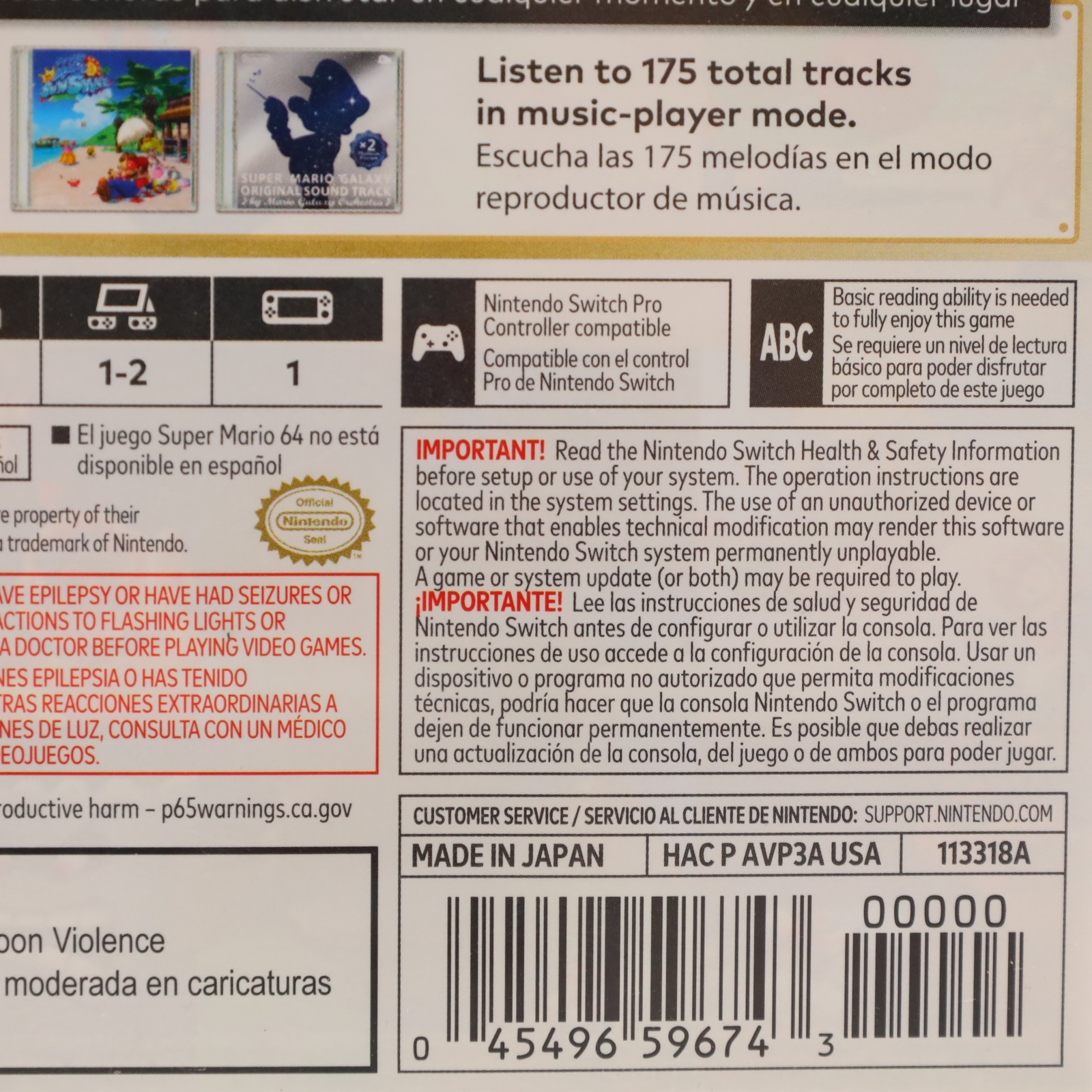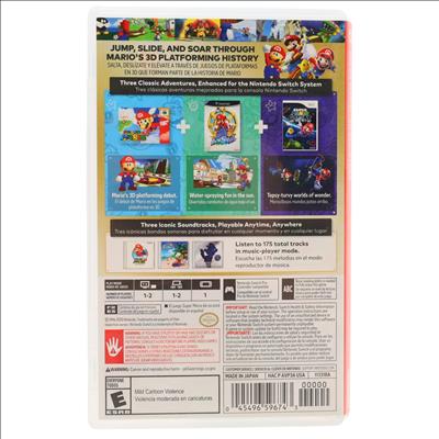 Offers three of Mario's classic 3D platforming adventures in one collection. In Super Mario 64, players jump into paintings to collect Power Stars and rescue Princess Peach. Super Mario Sunshine involves cleaning up Isle Delfino with the help of FLUDD, a water-spraying device. Super Mario Galaxy has players traveling between planets to power up Rosalina's Comet Observatory, with support for motion controls and a two-player Co-Star mode. All games feature improved resolution and support for Joy-Con controls, and the collection includes 175 iconic tunes from the three games. Enjoy these adventures at home or on the go with the Switch's handheld or tabletop modes.