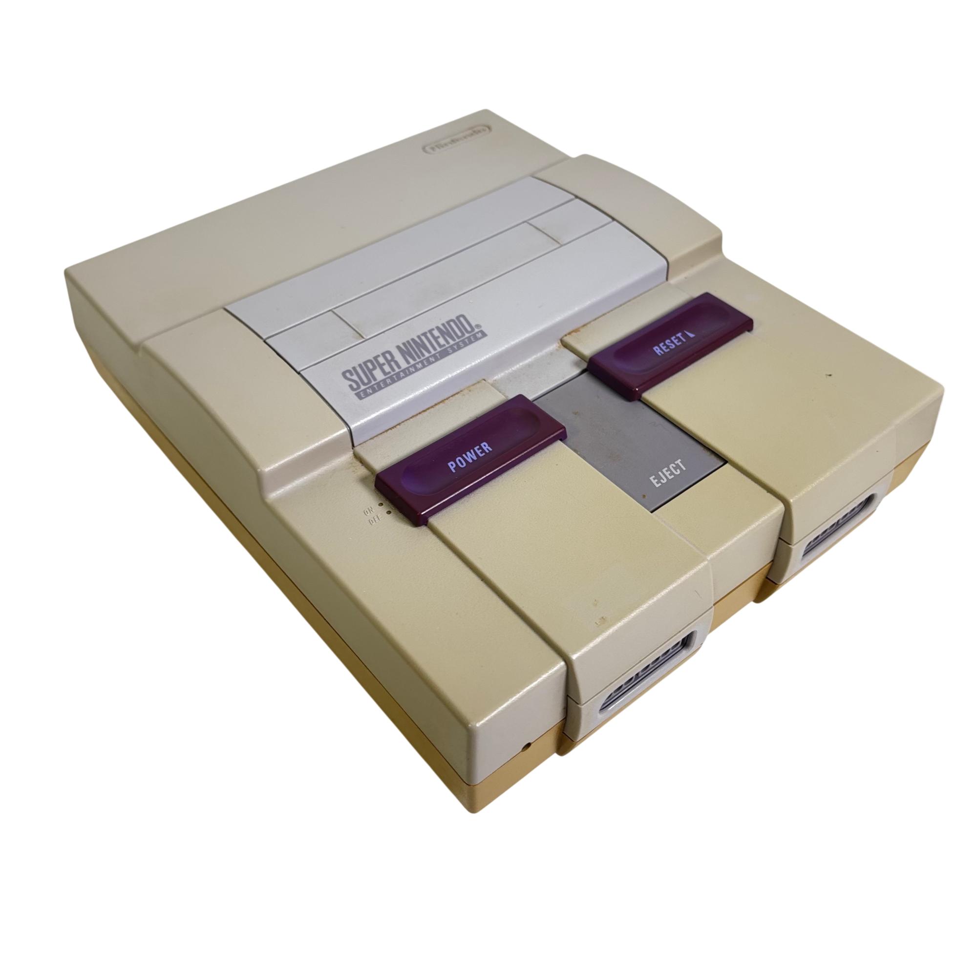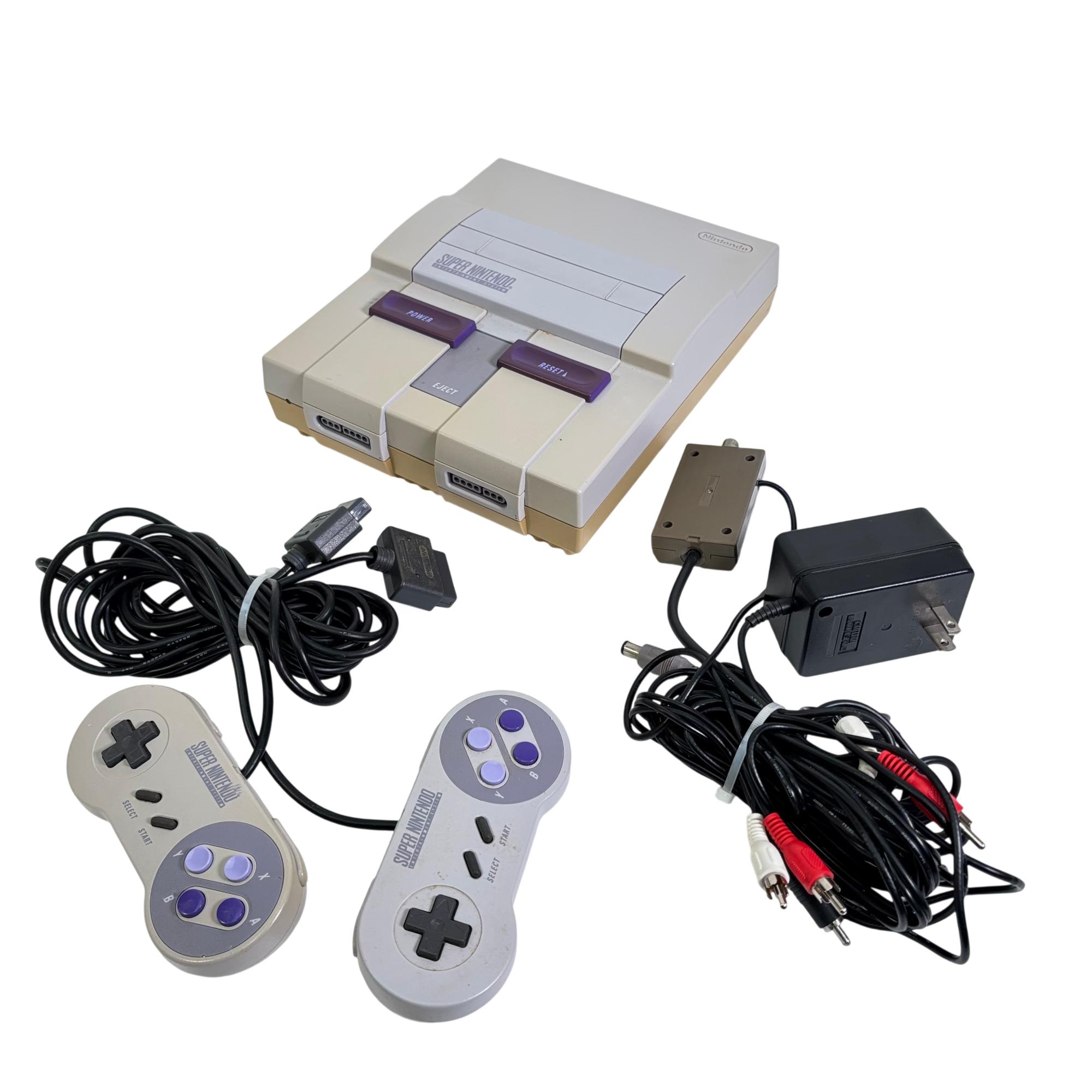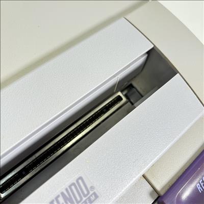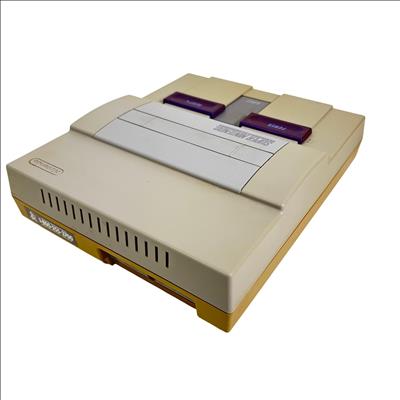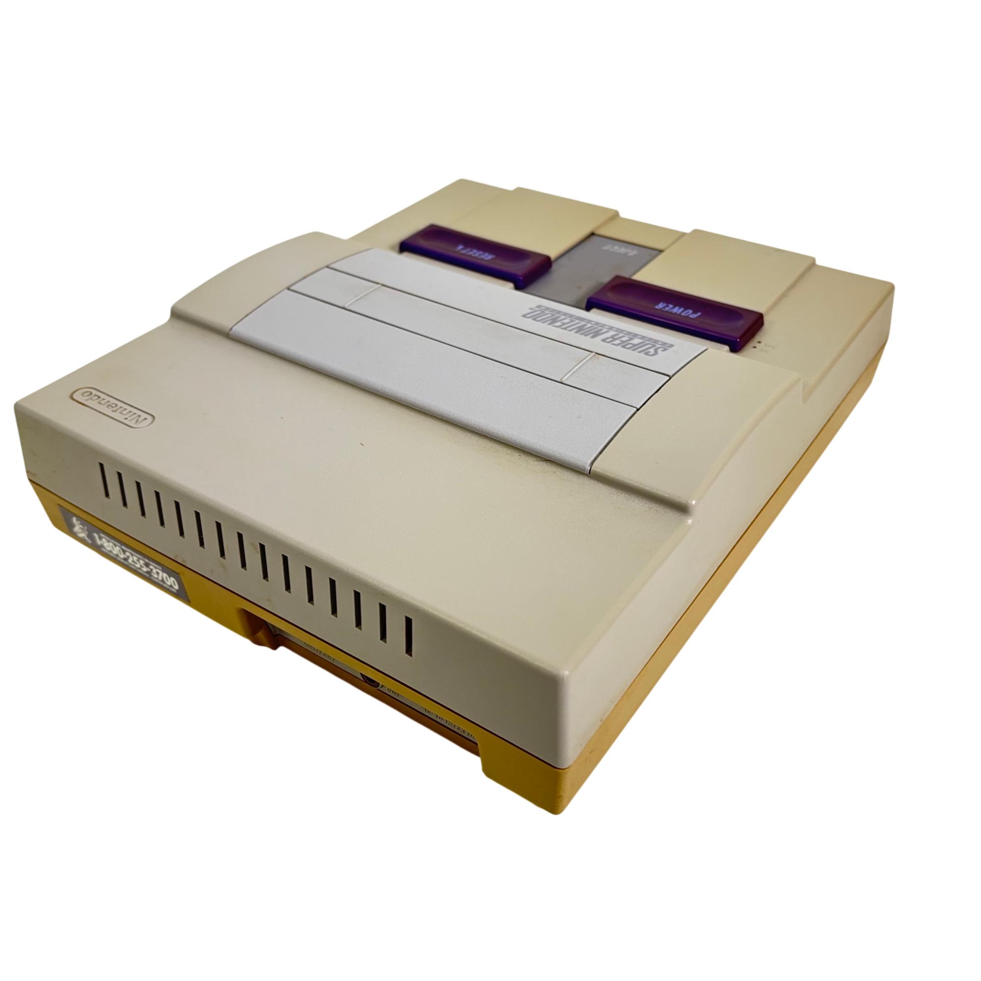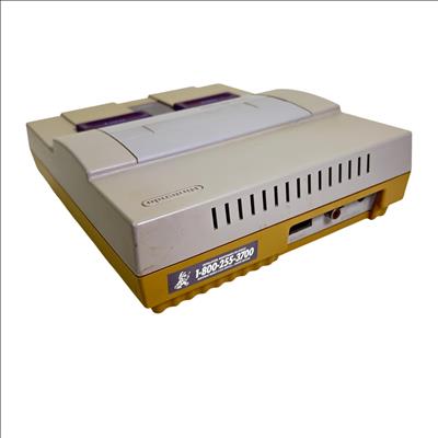 Nintendo Super Nintendo Entertainment System (SNES) Console SNS-001 is a classic 16-bit video game console featuring an iconic grey and purple design. This system includes the distinct power, reset, and eject buttons along with controller ports supporting traditional SNES controllers for a nostalgic gaming experience. It is compatible with a wide library of popular cartridge-based games, making it a must-have for retro gaming enthusiasts.