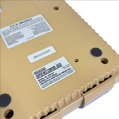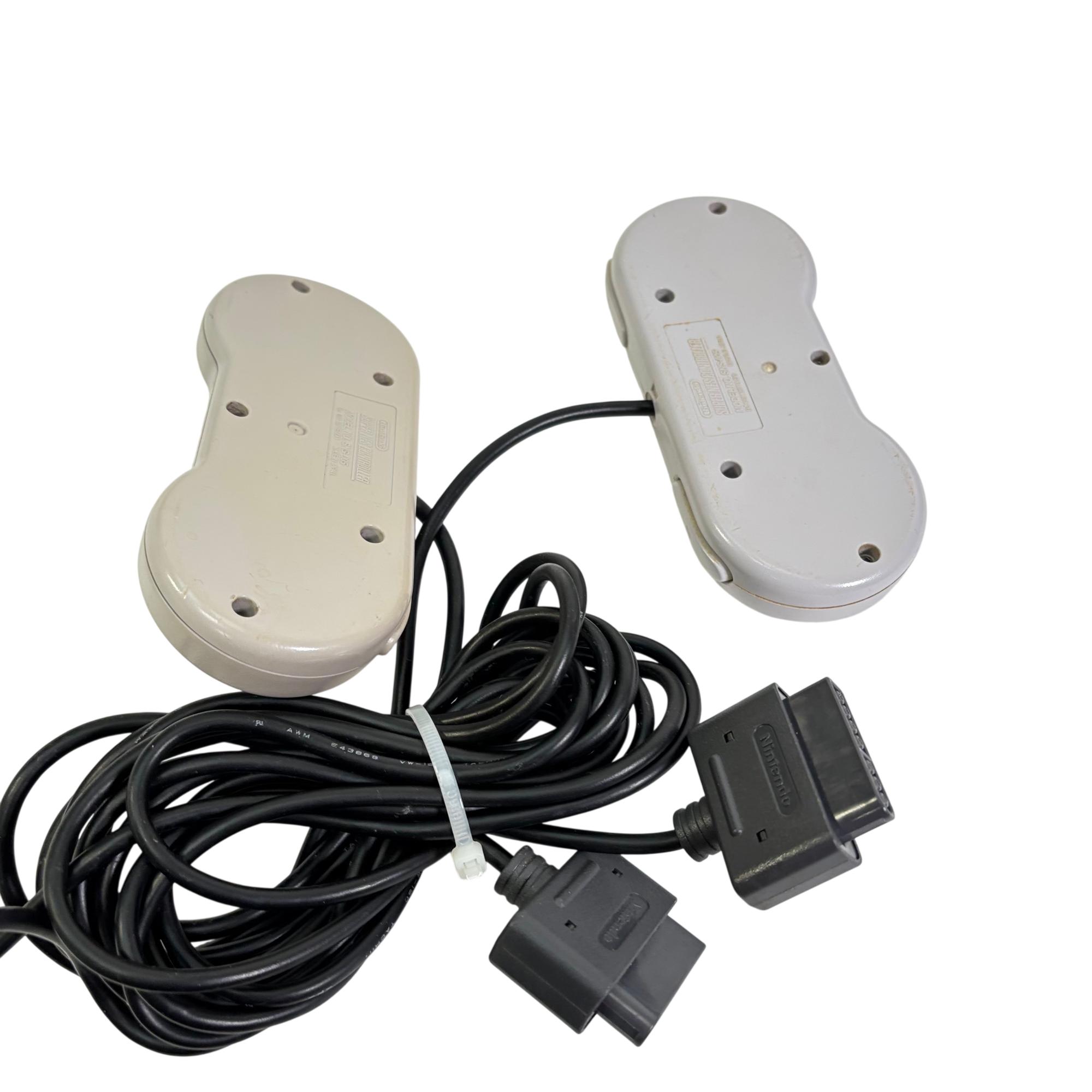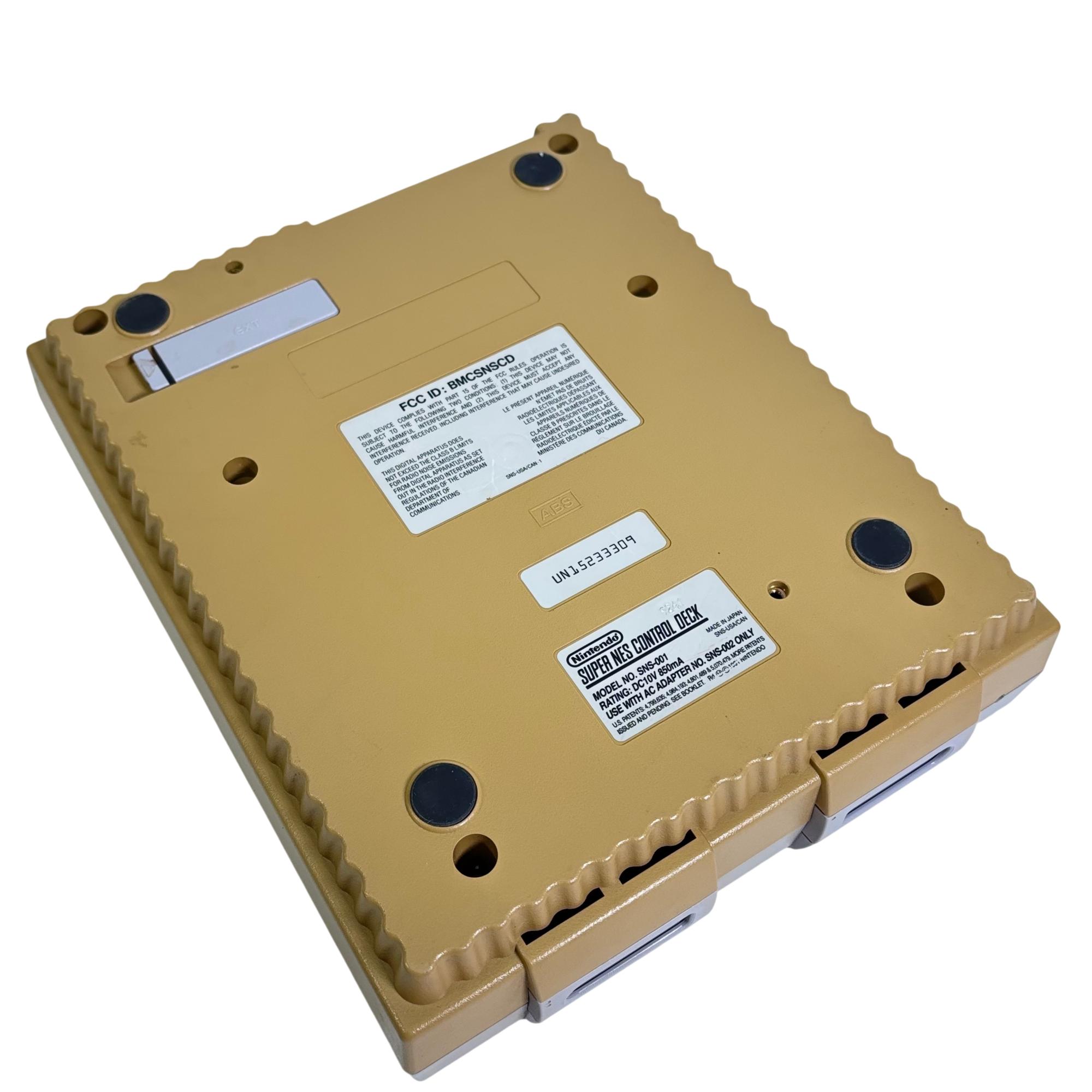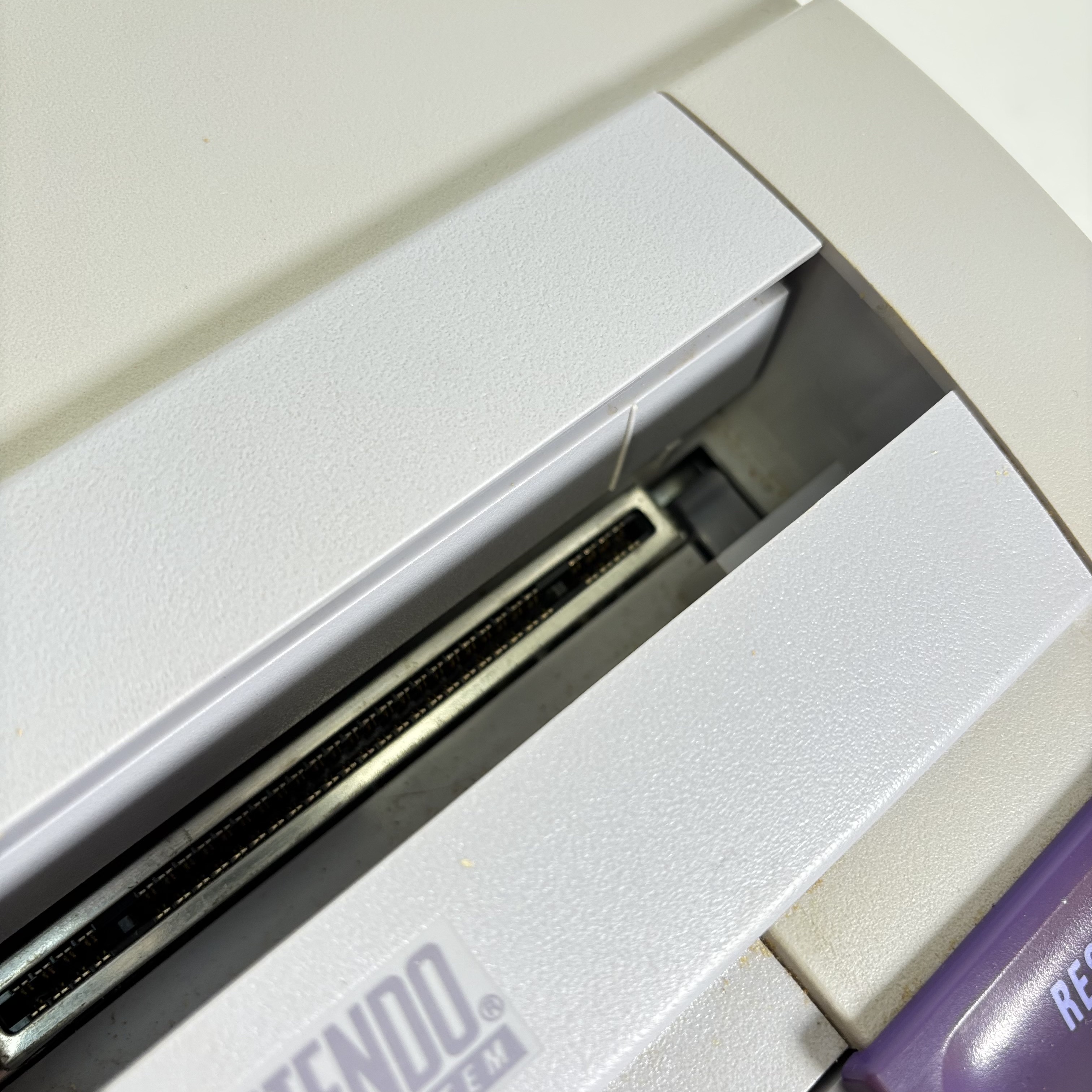Nintendo Super Nintendo Entertainment System (SNES) Console SNS-001 is a classic 16-bit video game console featuring an iconic grey and purple design. This system includes the distinct power, reset, and eject buttons along with controller ports supporting traditional SNES controllers for a nostalgic gaming experience. It is compatible with a wide library of popular cartridge-based games, making it a must-have for retro gaming enthusiasts.