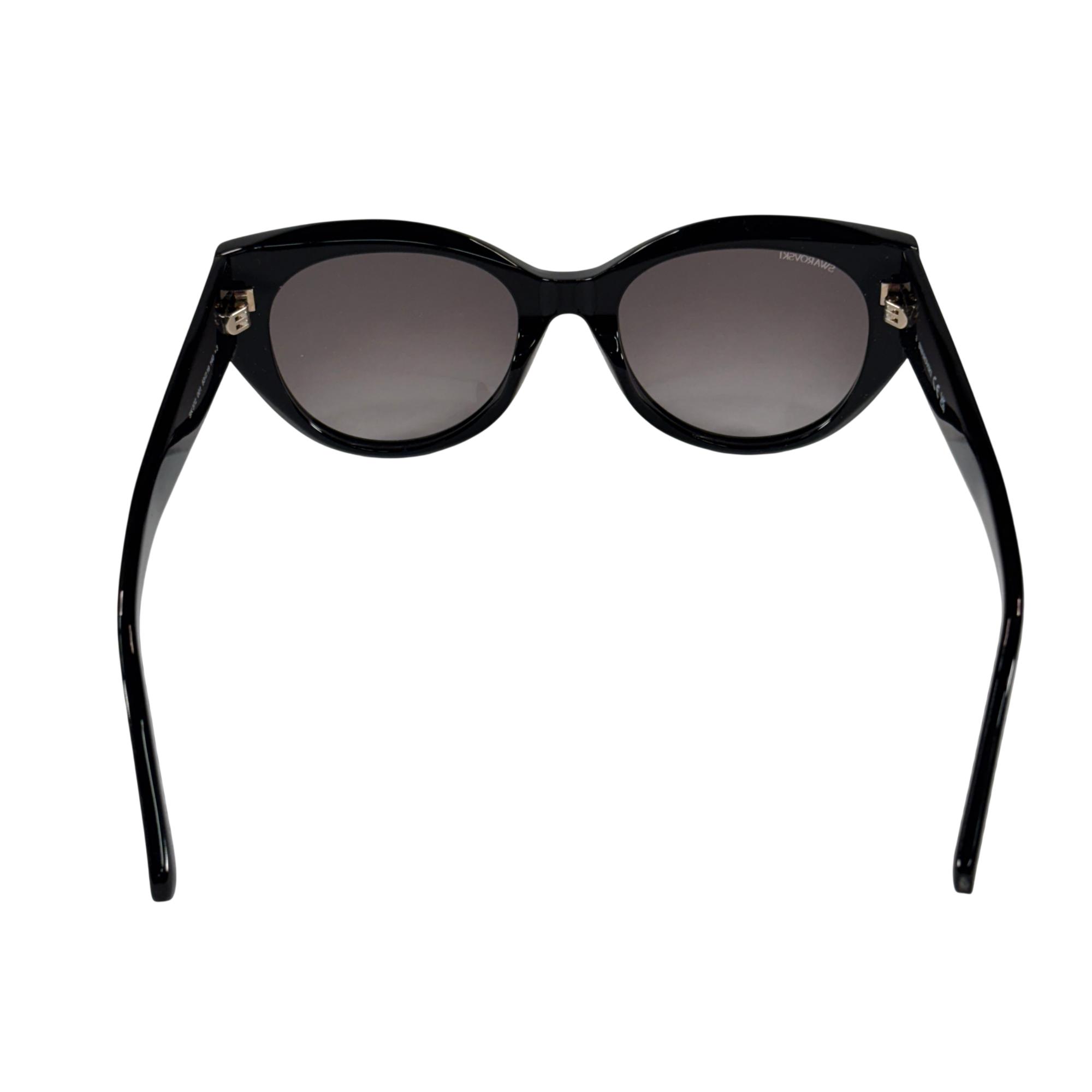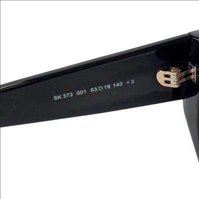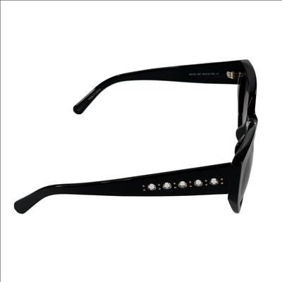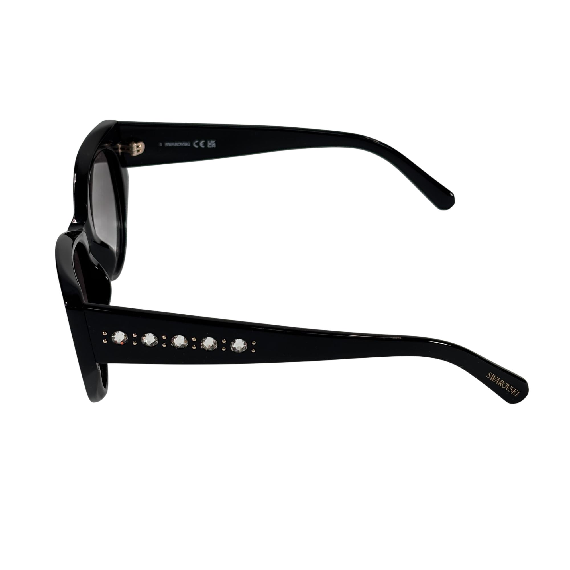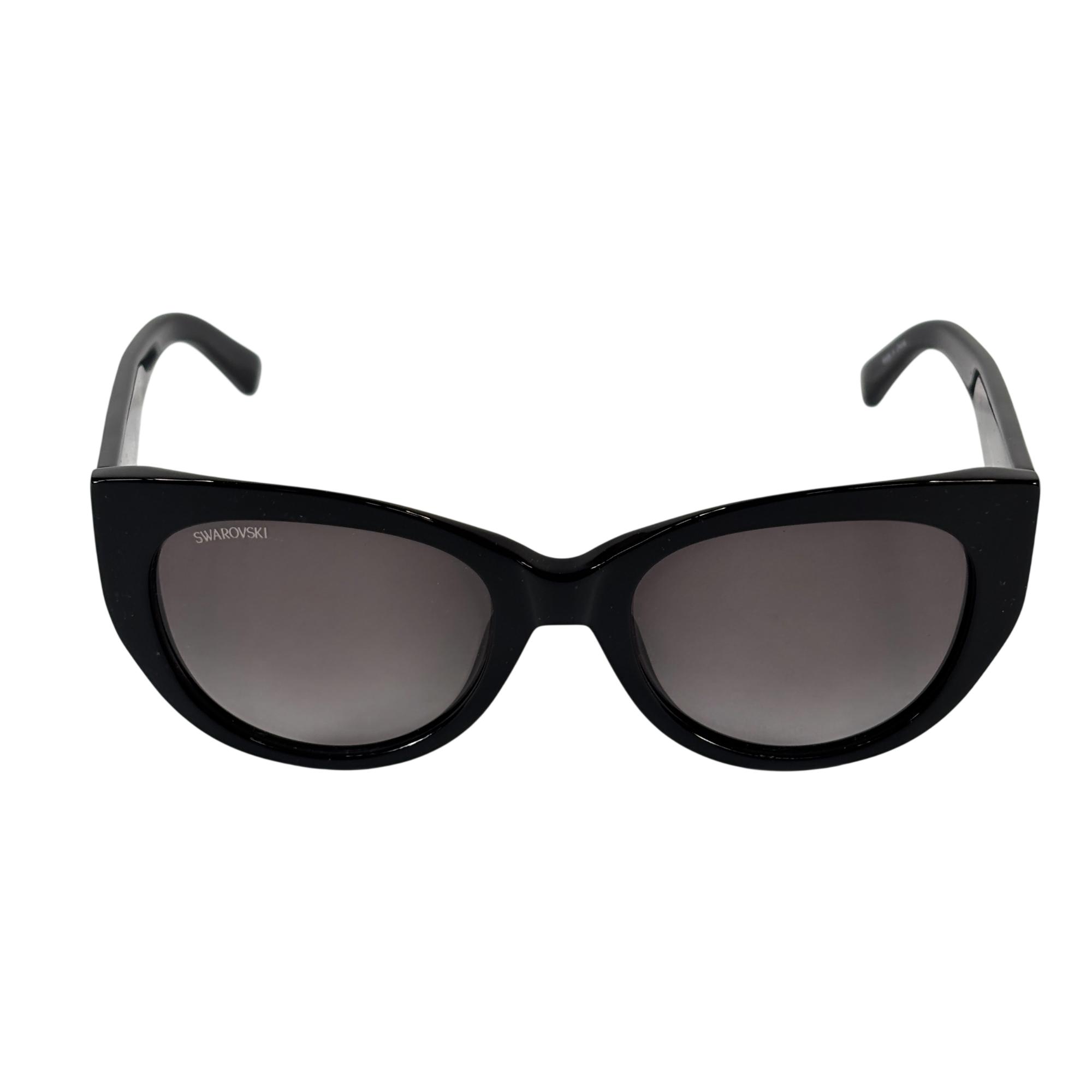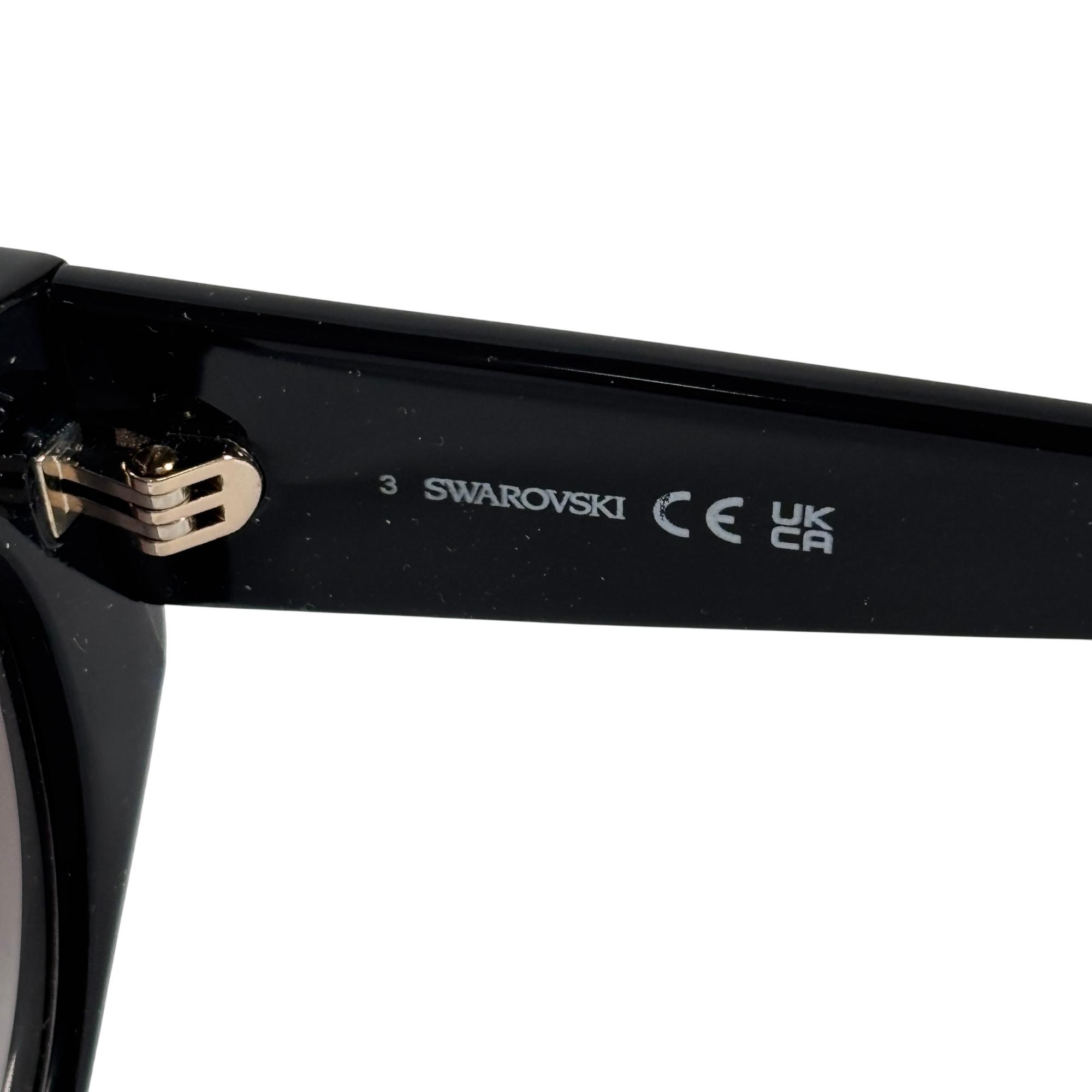 Swarovski SK372 001 Black Cat Eye Sunglasses feature an oversized plastic frame with sleek black coloring and grey lenses, combining modern design with elegant sophistication. These stylish sunglasses showcase a distinct cat-eye shape and metal accents that enhance both durability and fashion appeal, making them a refined accessory for eye protection and style.