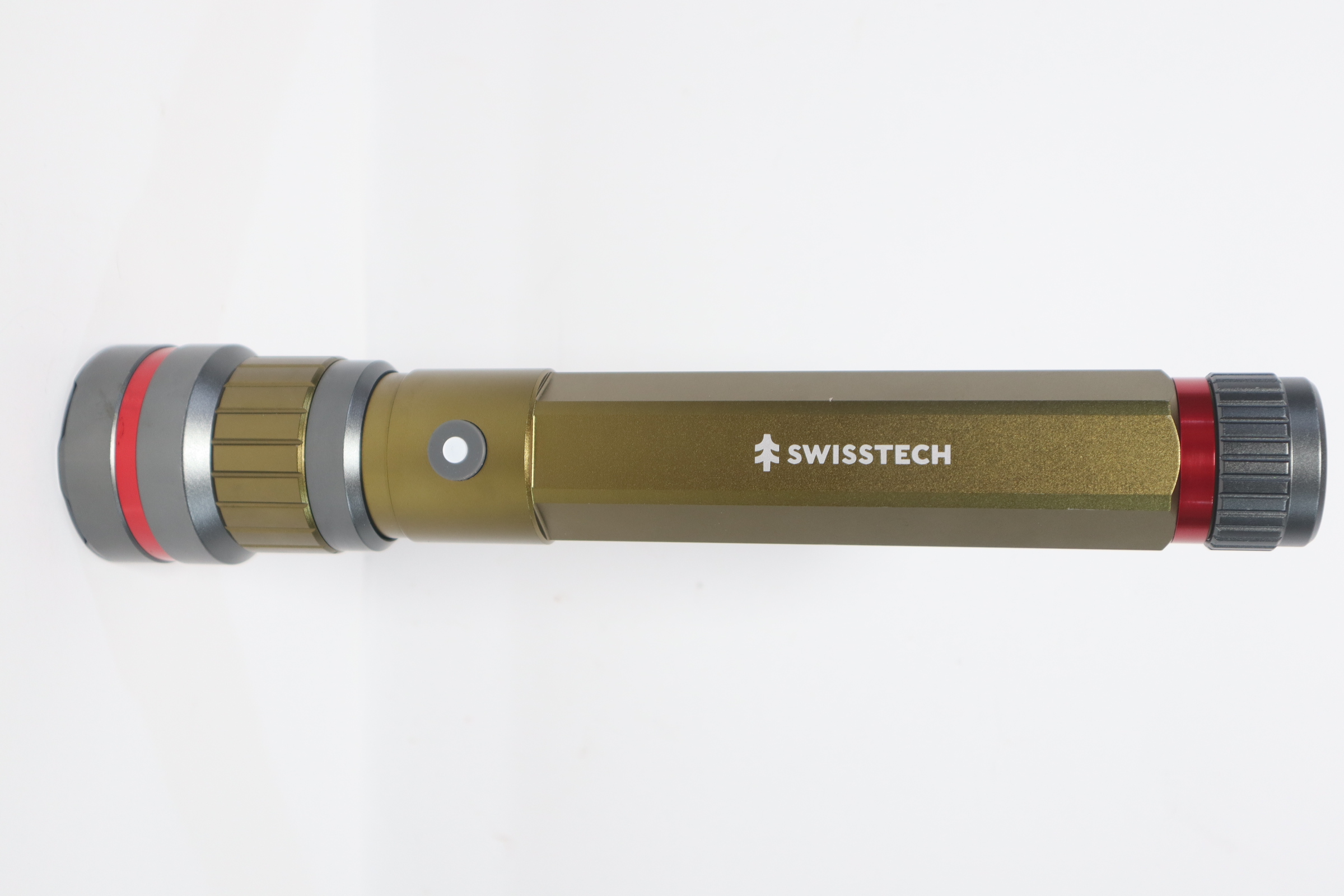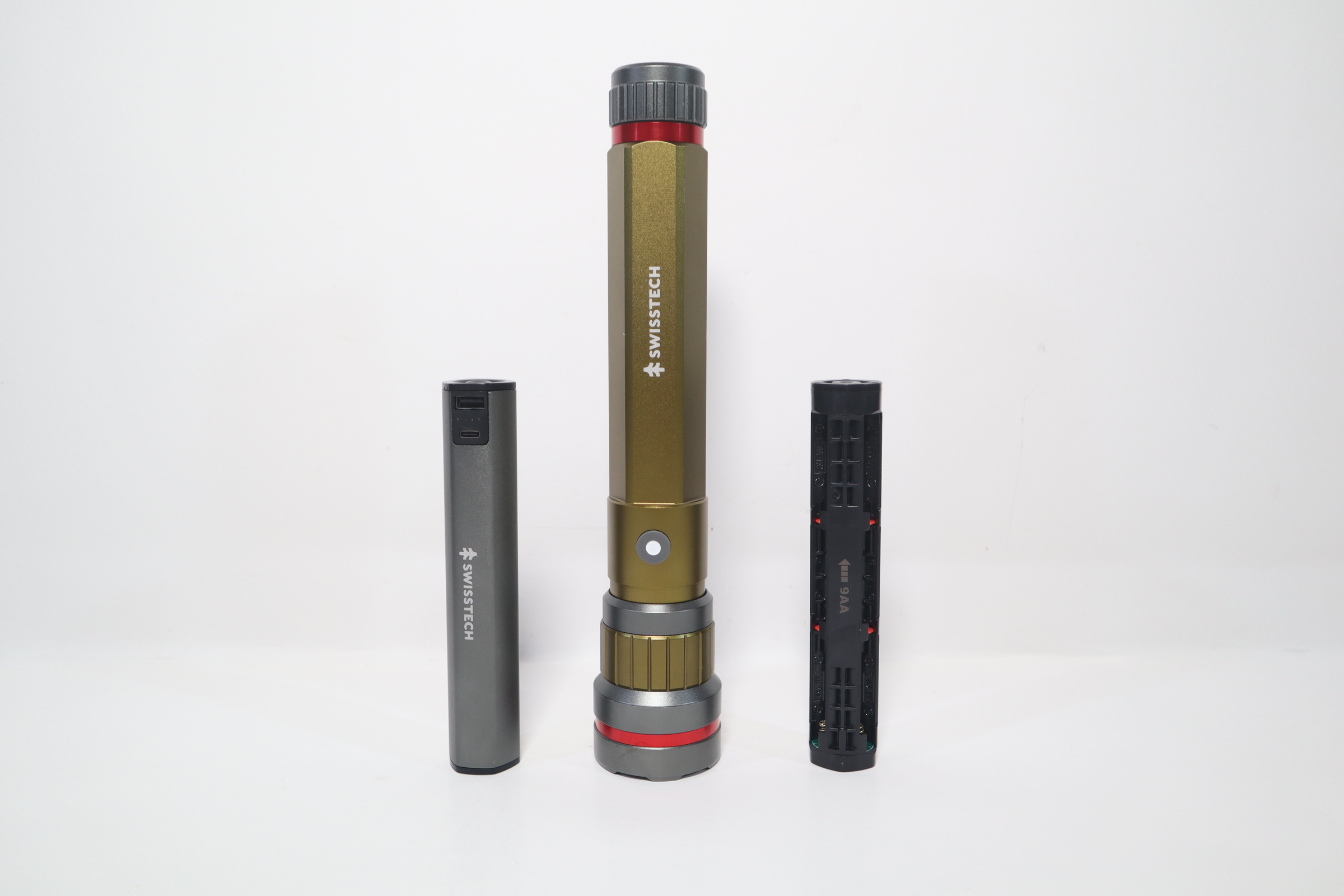 Overwhelm the dark and stay powered through any adventure with the Swiss Tech 6500 Lumen Dual Power Rechargeable LED Flashlight with Charging Bank. This powerhouse of a flashlight is built to deliver a massive 6500 lumens plus a 10000 mAh power bank, making it a must-have in your lighting and charging arsenal. Rated an extraordinary dust proof & waterproof IP67, this Swiss Tech Flashlight will always be there for you, whether you're hitting the trails for a fun adventure or needing light during an emergency. Dual power capability also means that you can use the USB-C charging cable or AA batteries in this flashlight with its interchangeable cores. Maximize your light output and battery life depending on your situation with High, Medium, and Low settings. The Swiss Tech Zuverlassig is built to overpower any challenge thrown its way.