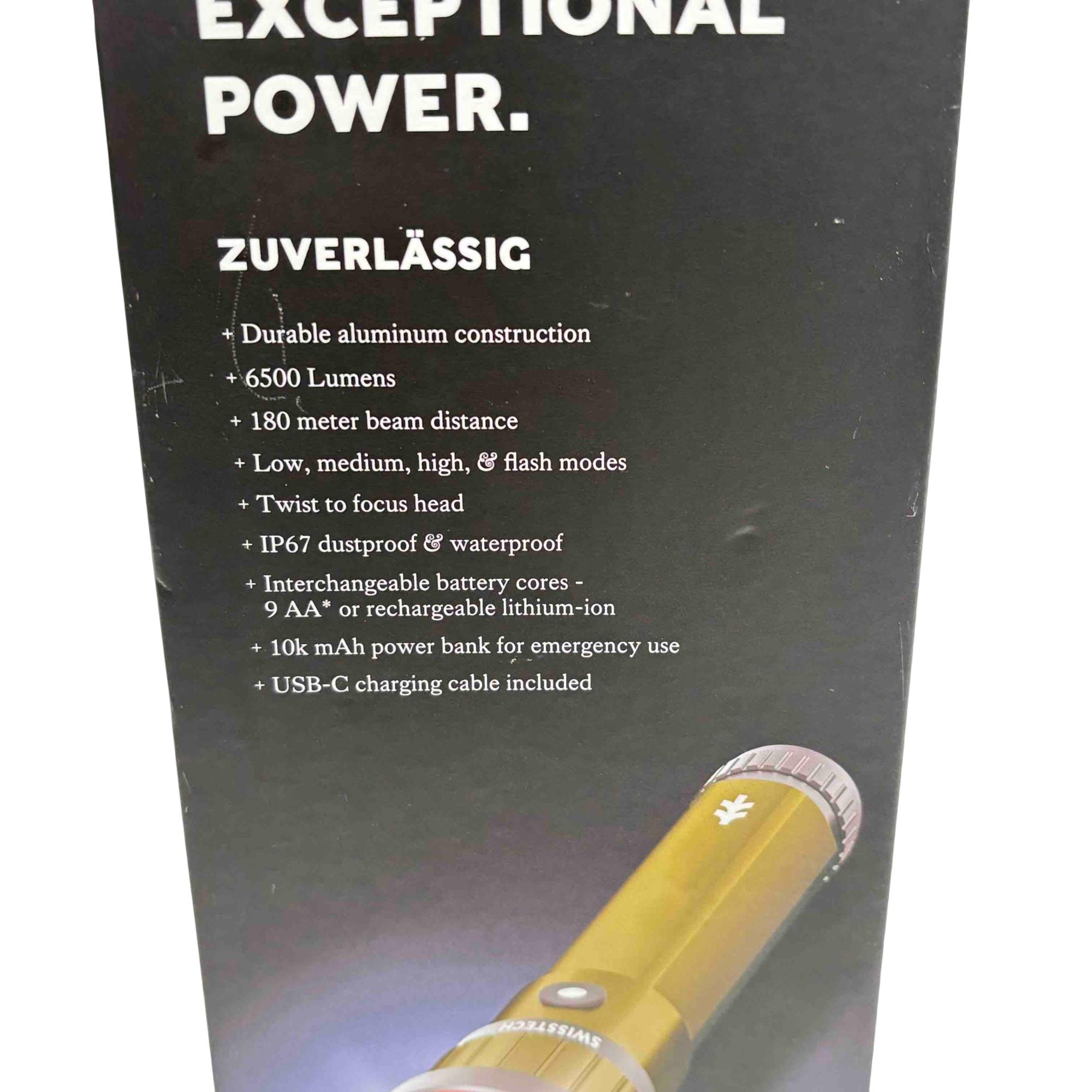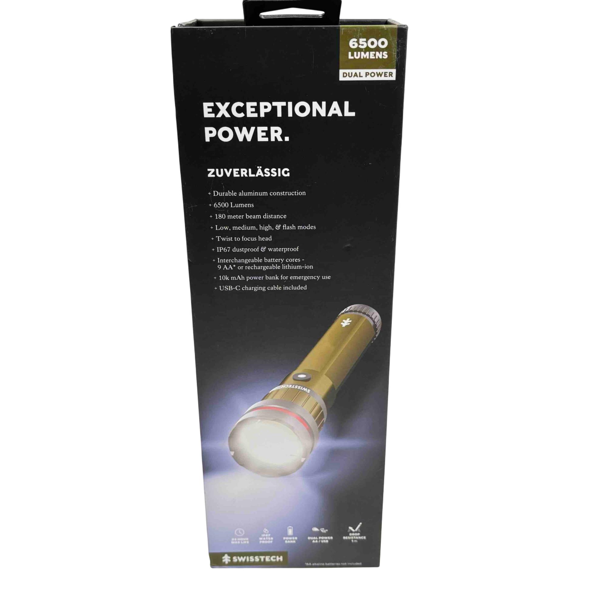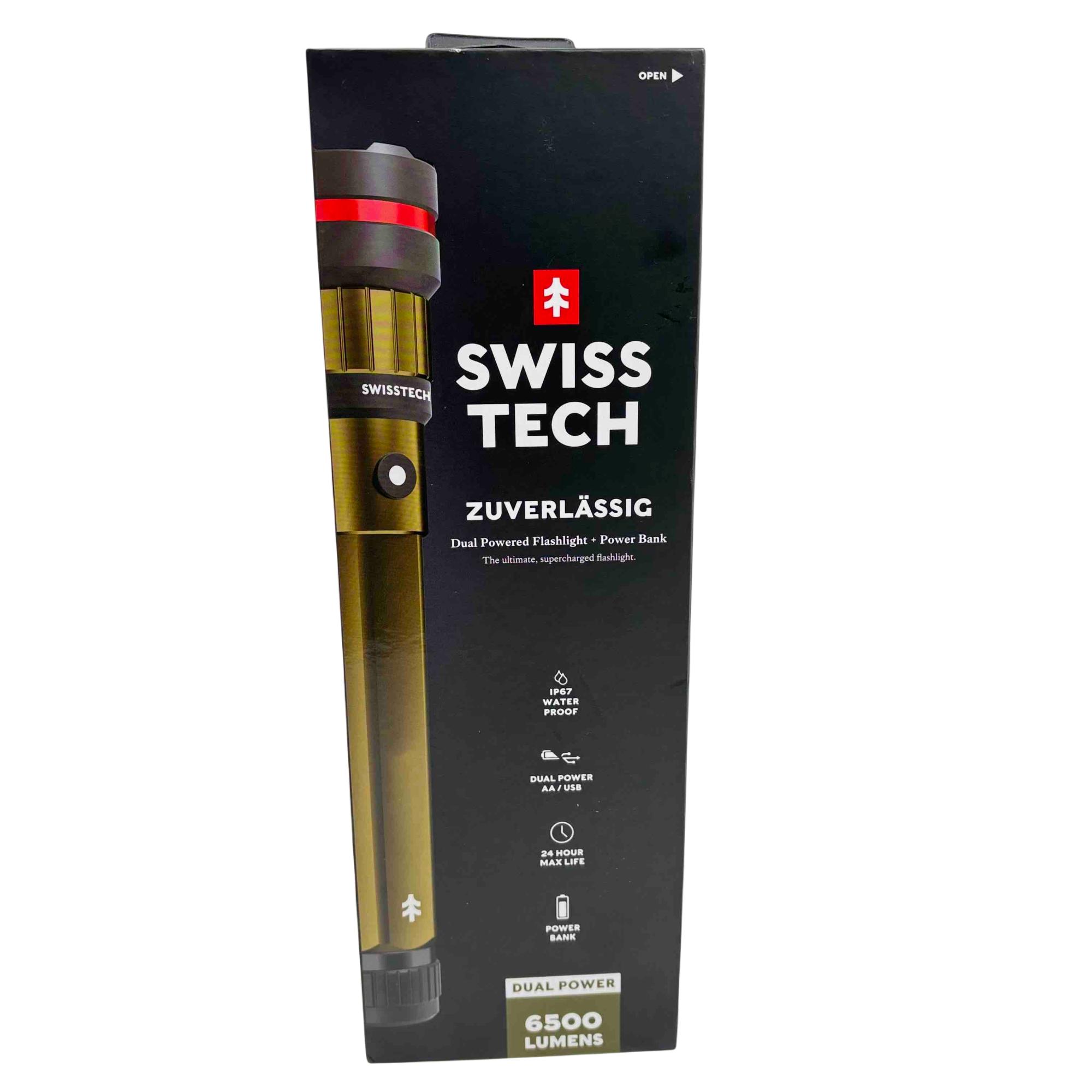 Experience unmatched power and versatility with the SWISS TECH Zuverlässig Dual Powered Flashlight + Power Bank. Boasting an incredible 6500 lumens and a sturdy aluminum construction, this flashlight is perfect for any adventure. Its IP67 dustproof and waterproof rating ensures reliability in all conditions, while the interchangeable battery cores and USB-C charging offer maximum convenience.