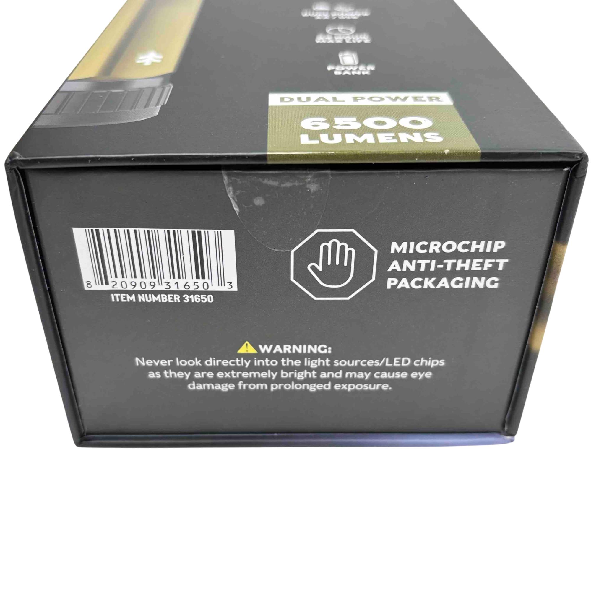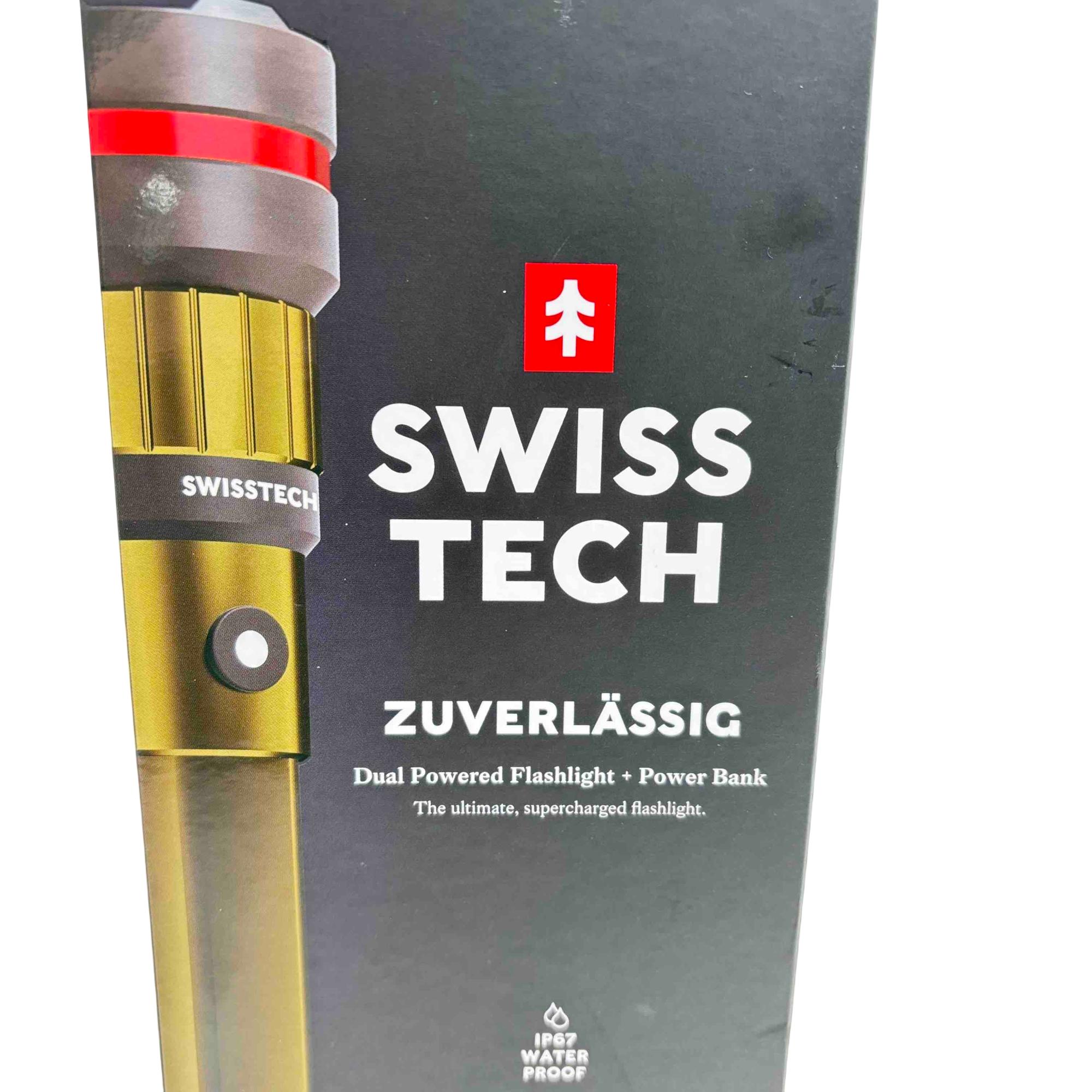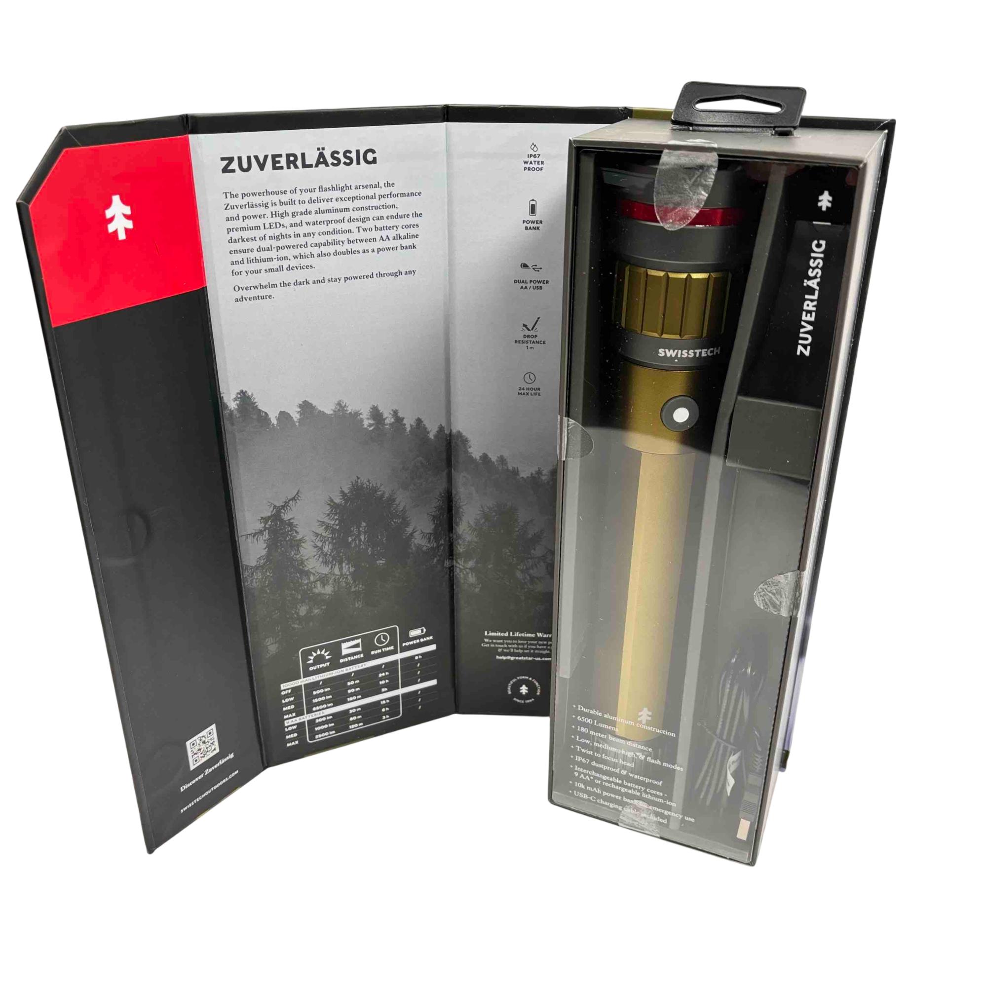 Experience unmatched power and versatility with the SWISS TECH Zuverlässig Dual Powered Flashlight + Power Bank. Boasting an incredible 6500 lumens and a sturdy aluminum construction, this flashlight is perfect for any adventure. Its IP67 dustproof and waterproof rating ensures reliability in all conditions, while the interchangeable battery cores and USB-C charging offer maximum convenience.