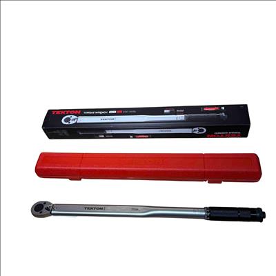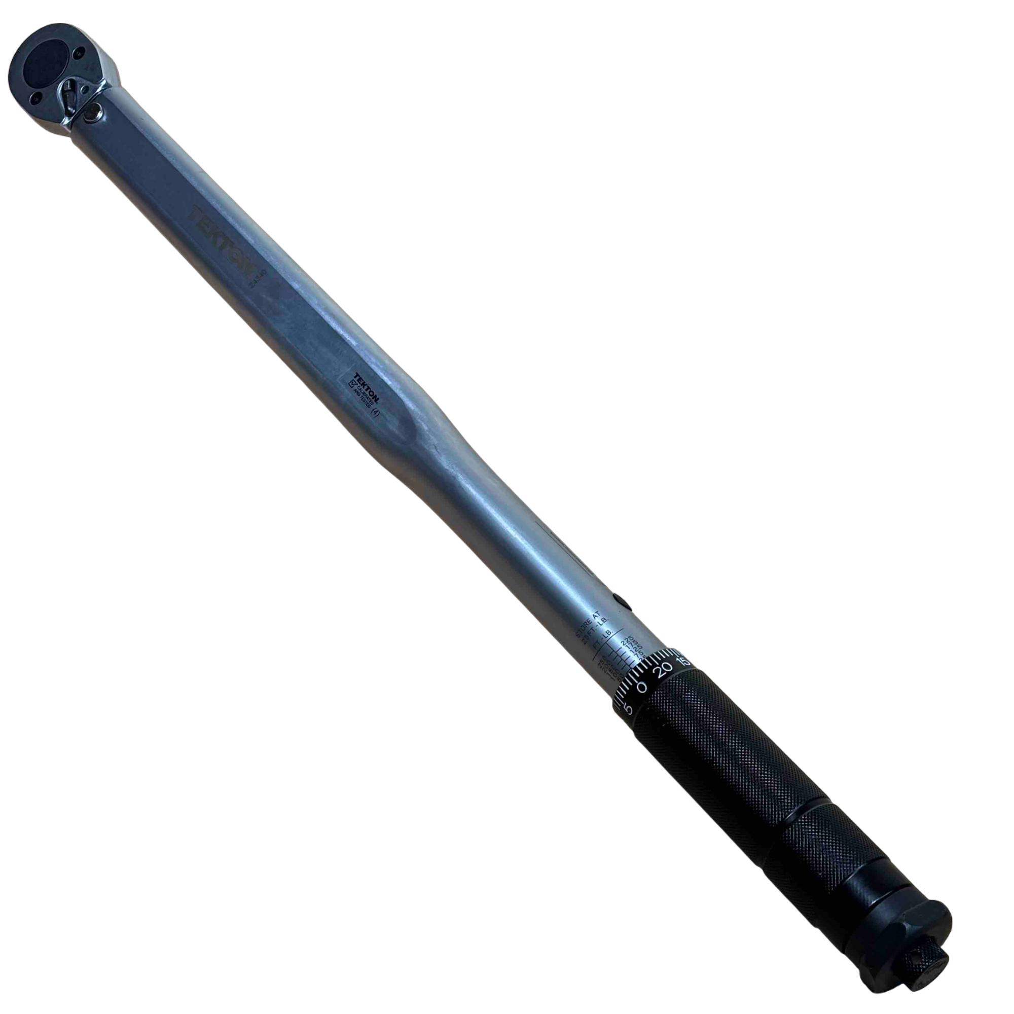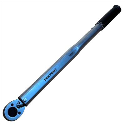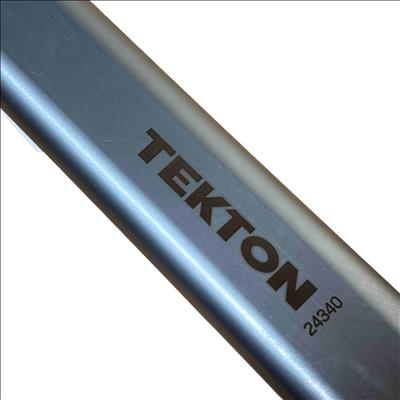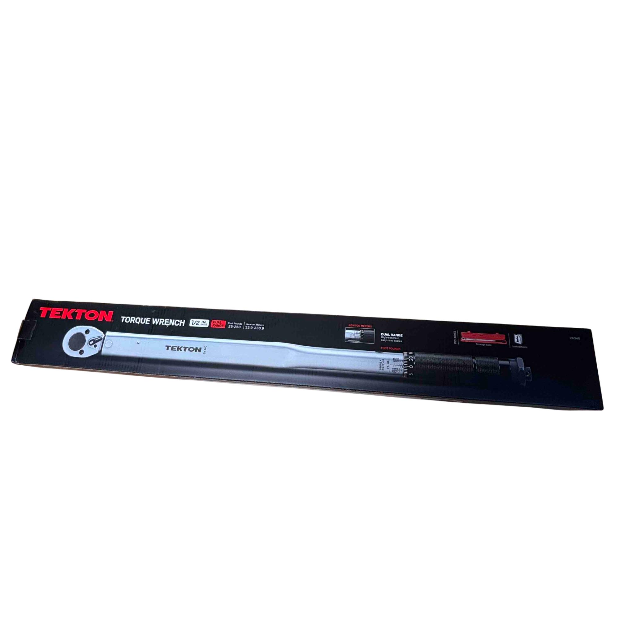 TEKTON 24340 1/2 Inch Drive Click Torque Wrench (25-250 ft.-lb.) is a precision hand tool designed for accurately applying torque between 25 and 250 foot-pounds. It features a dual-range setting for versatile use and a durable chrome-plated finish for long-lasting performance, making it ideal for automotive and mechanical applications.