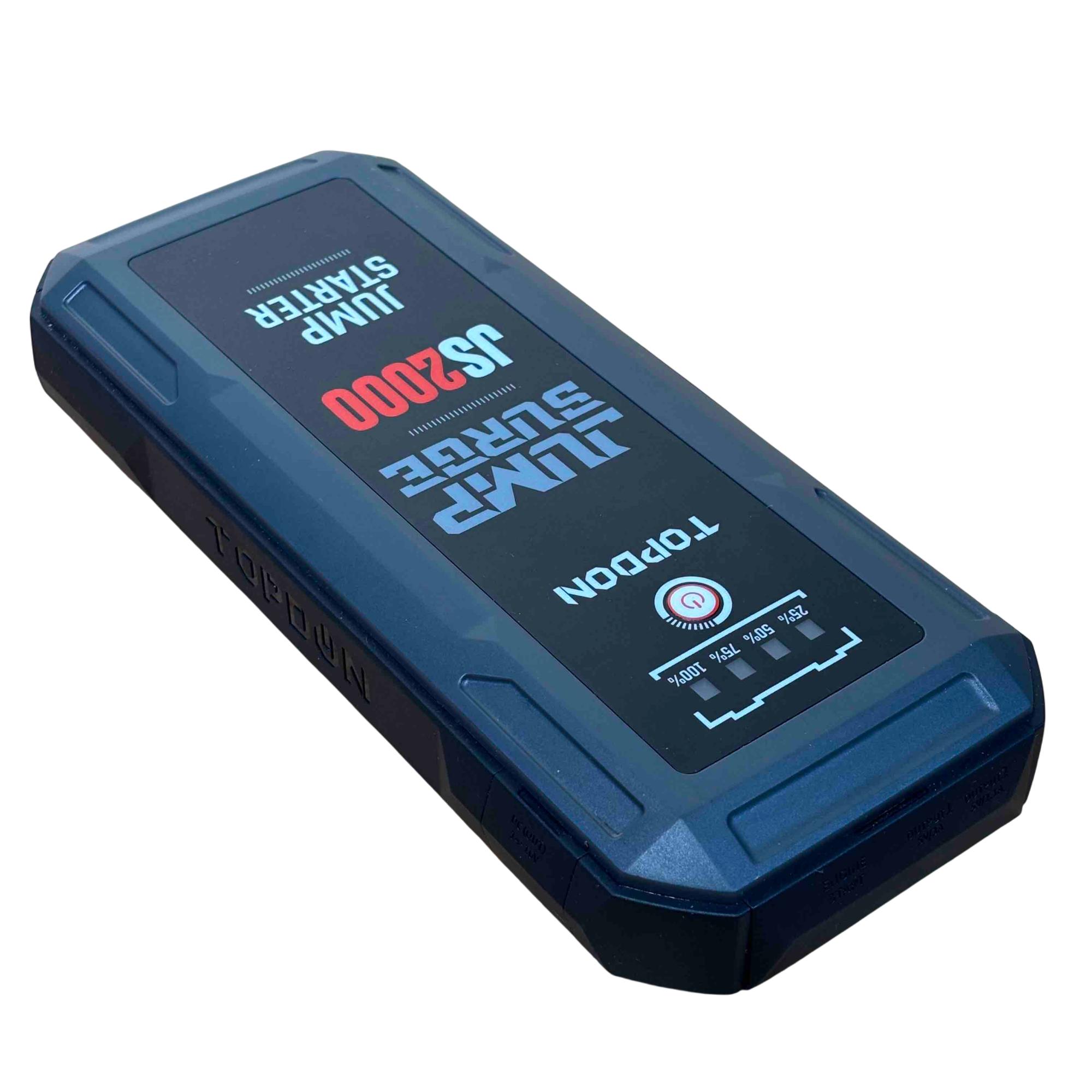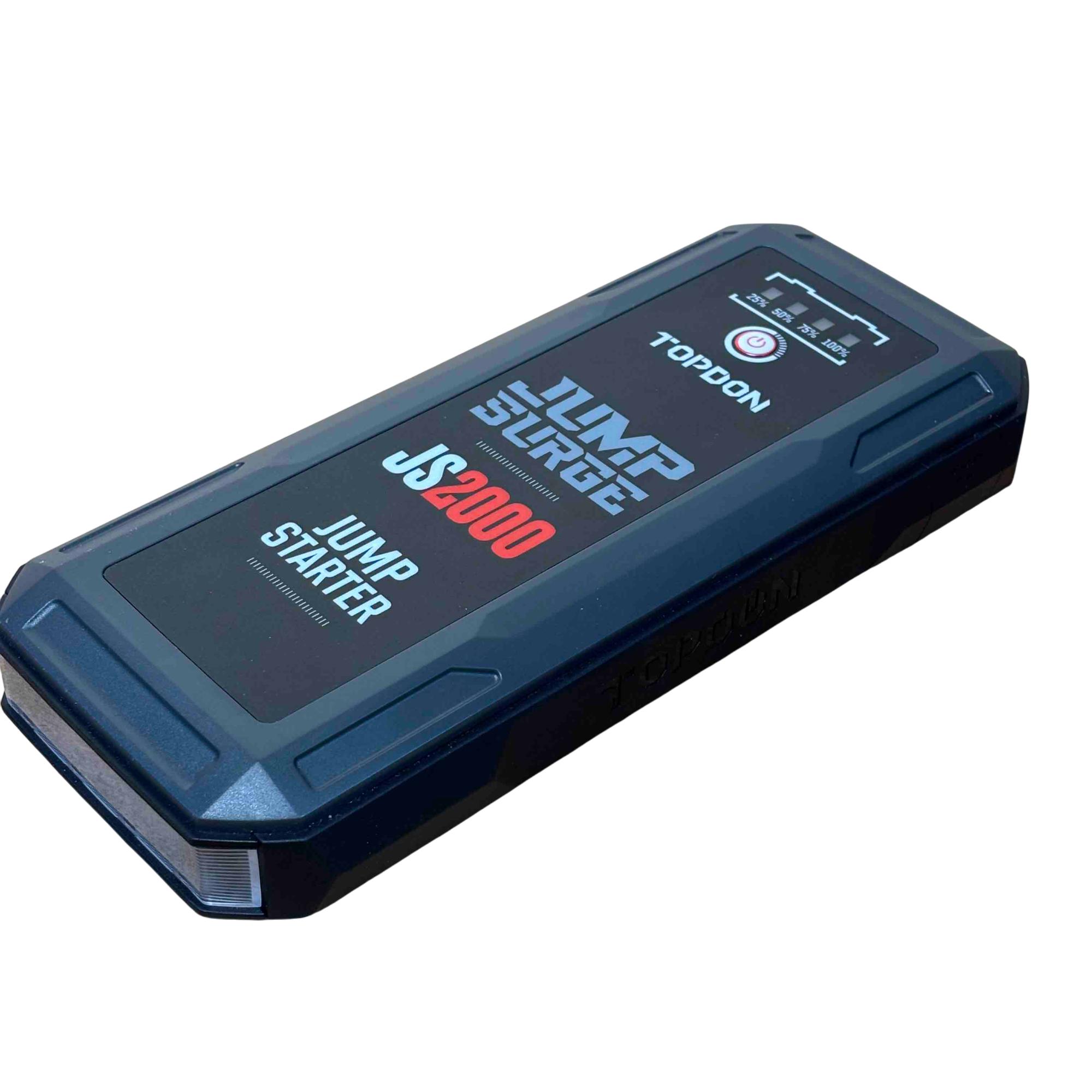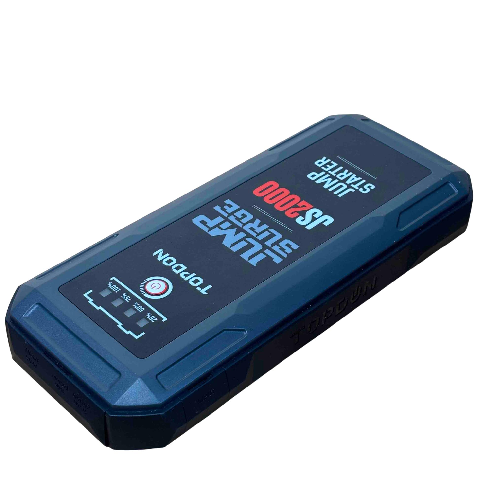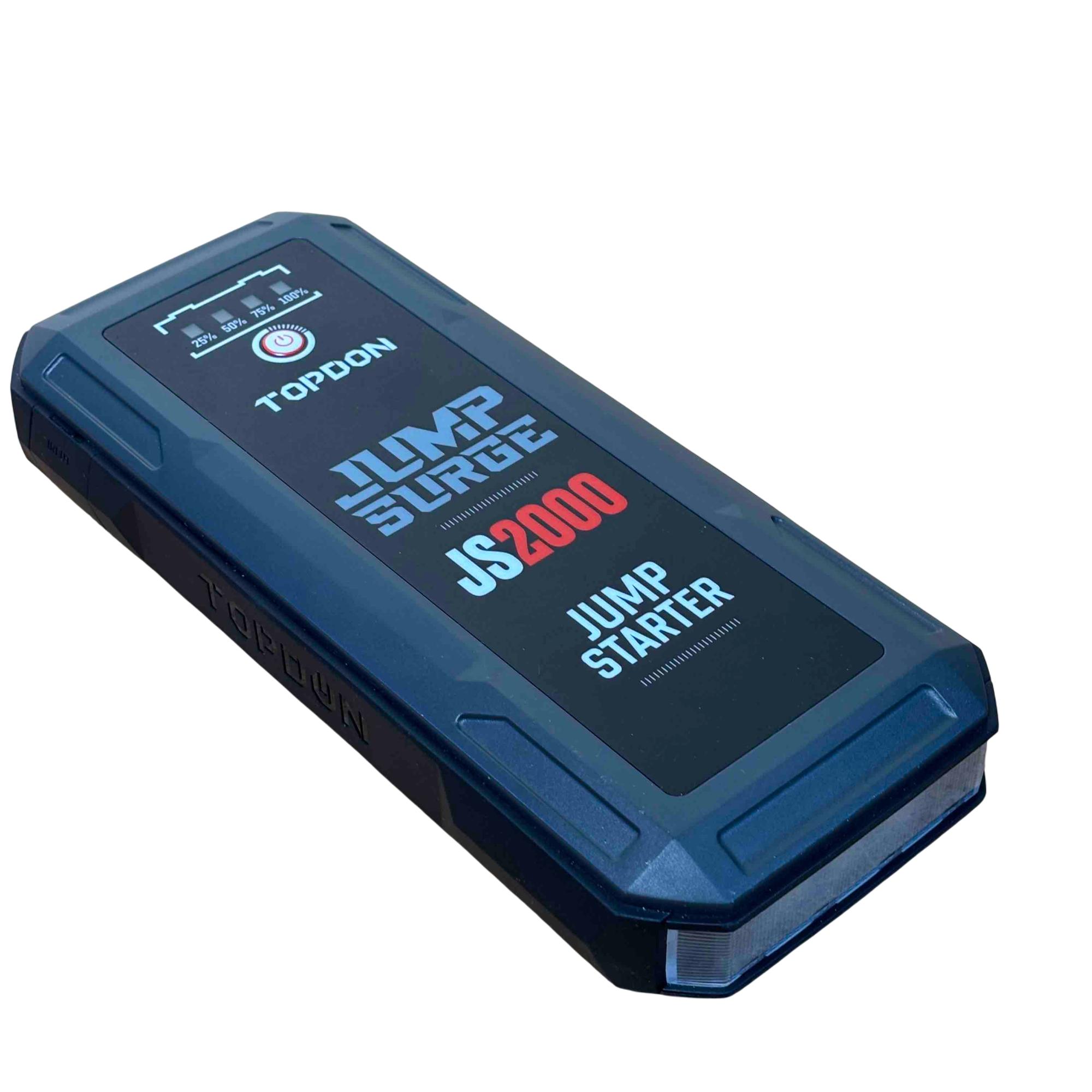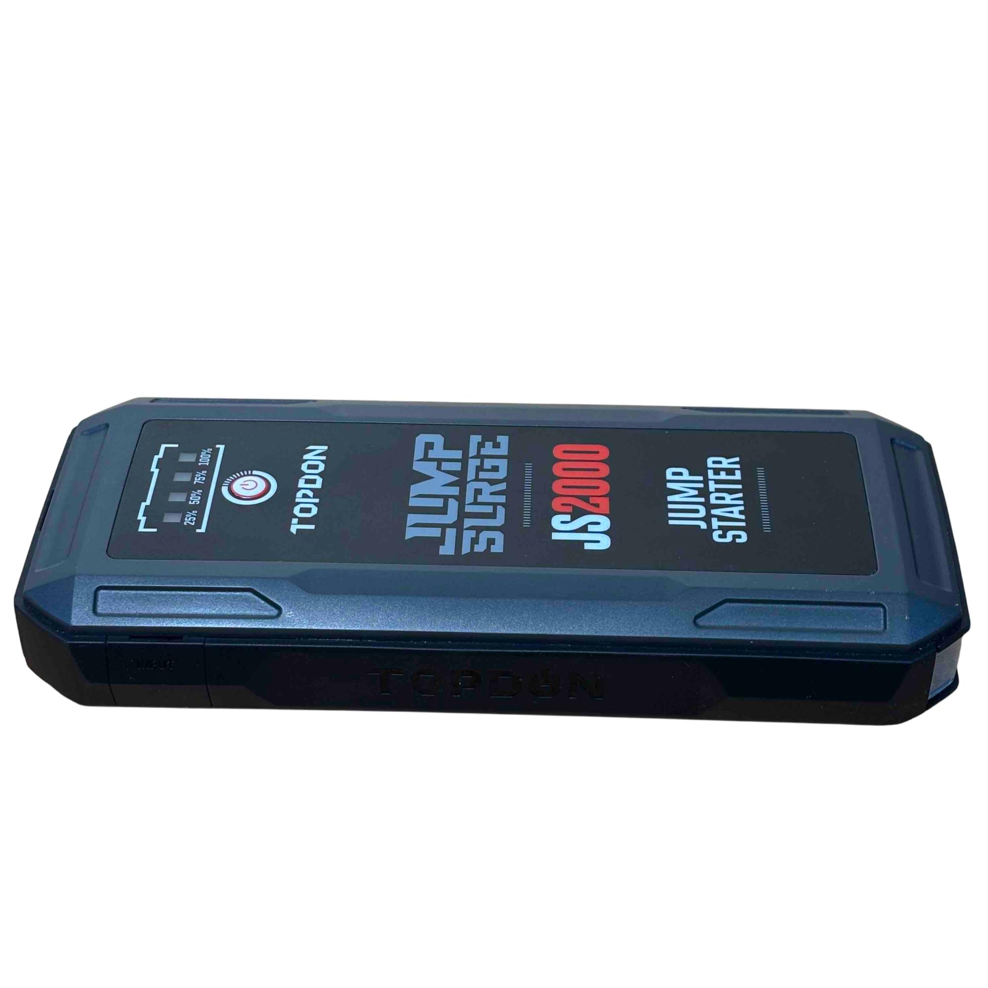 Introducing the TOPDON JUMPSURGE2000, a powerful portable car jump starter capable of delivering up to 2000A peak current. This compact yet robust device houses a 16,000mAh battery, providing reliable power when you need it most. Equipped with both Type-C and USB outputs, it ensures your devices stay charged while you hit the road with confidence.