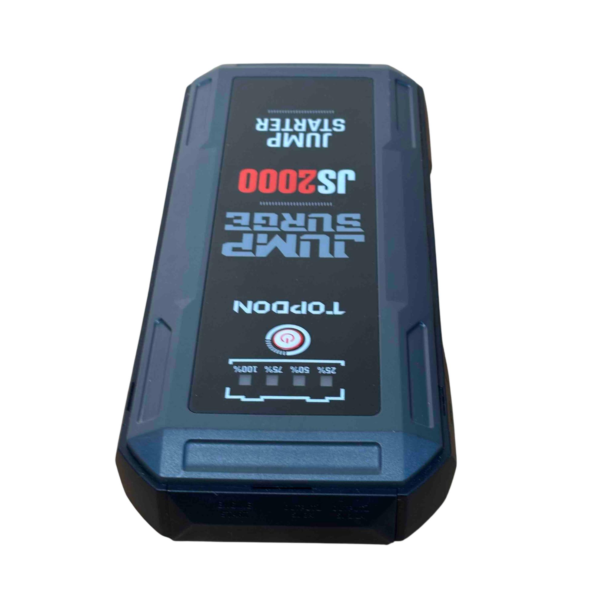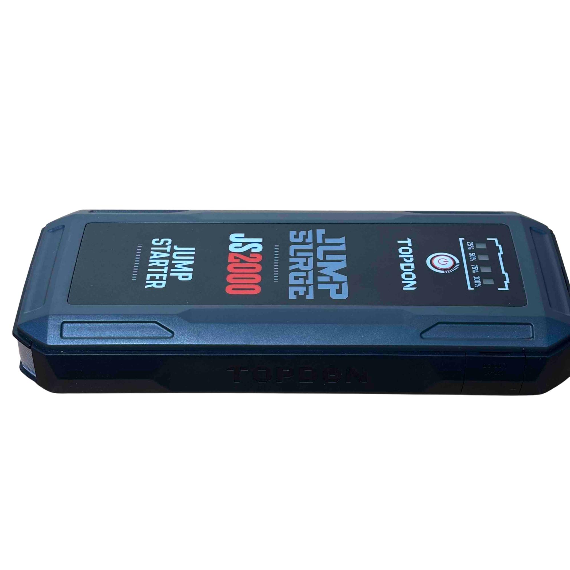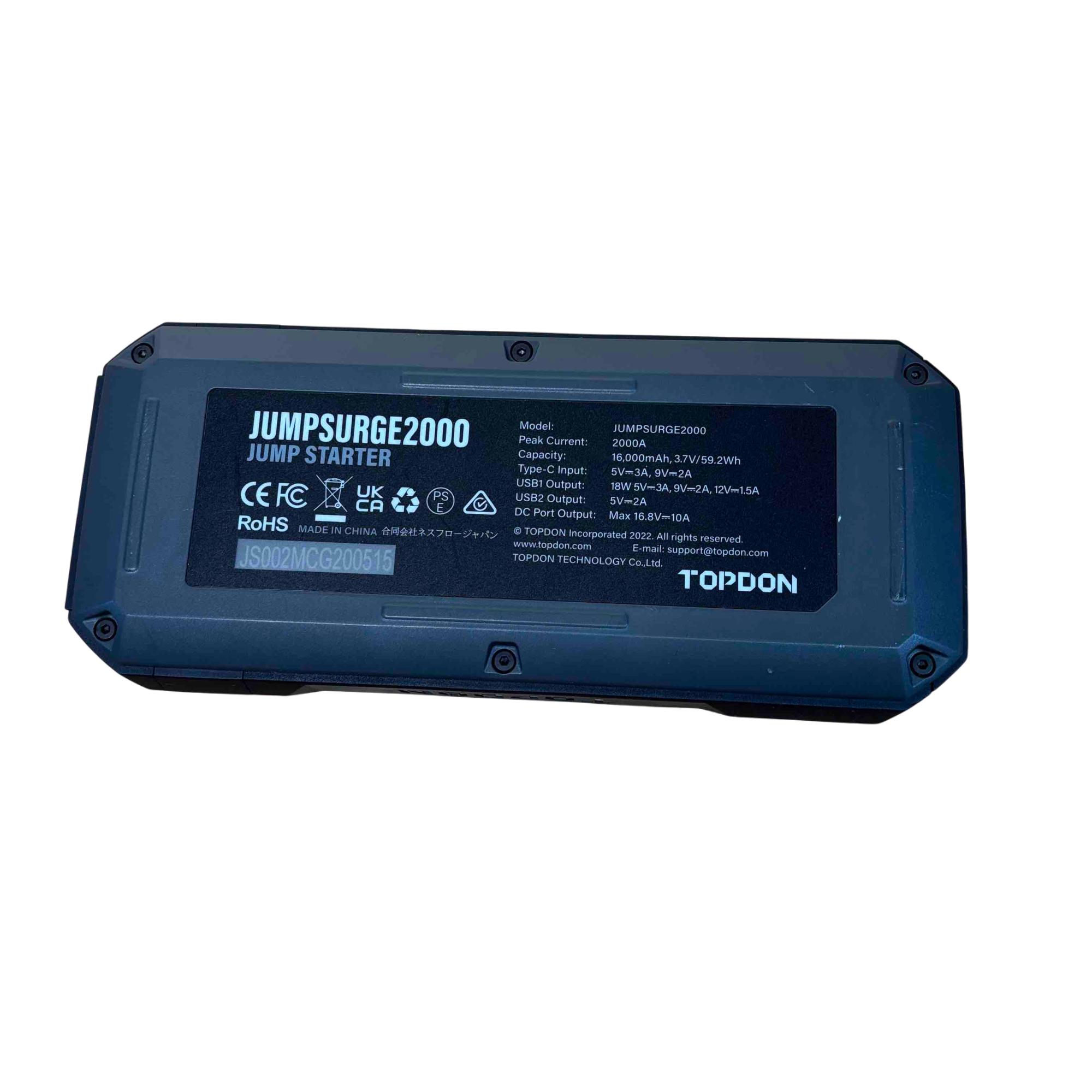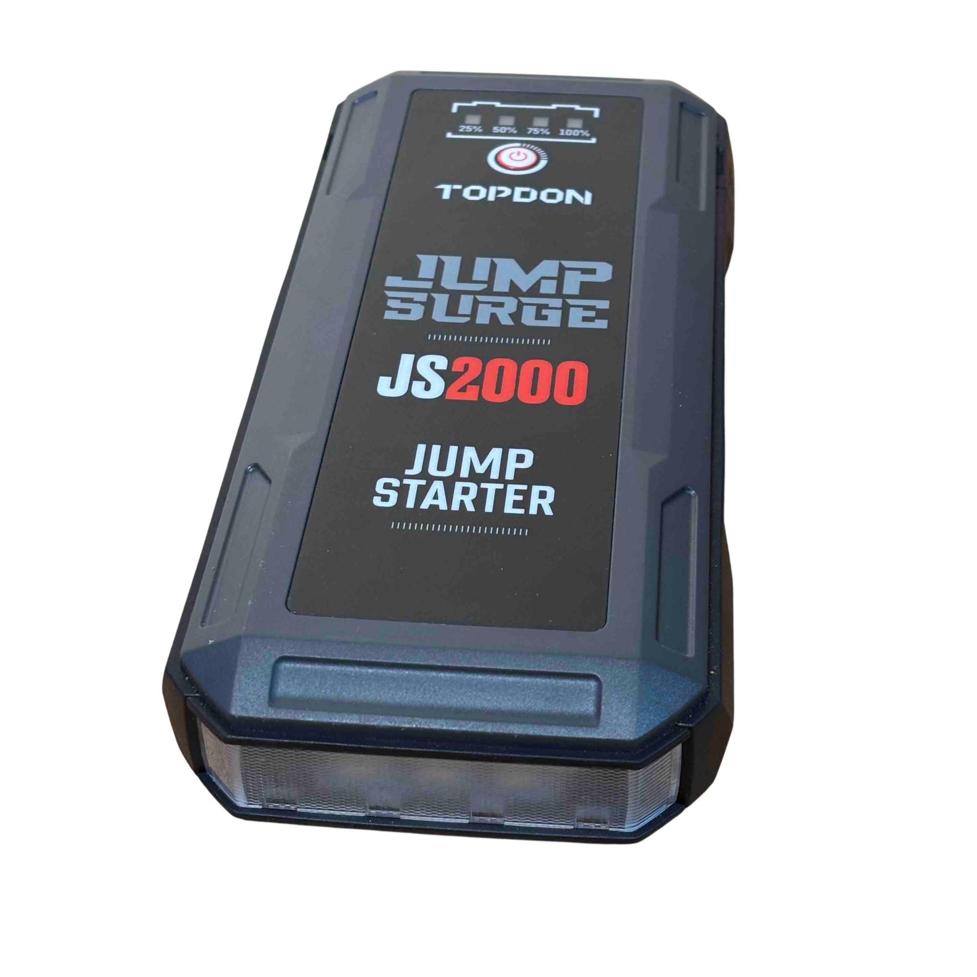 Introducing the TOPDON JUMPSURGE2000, a powerful portable car jump starter capable of delivering up to 2000A peak current. This compact yet robust device houses a 16,000mAh battery, providing reliable power when you need it most. Equipped with both Type-C and USB outputs, it ensures your devices stay charged while you hit the road with confidence.
