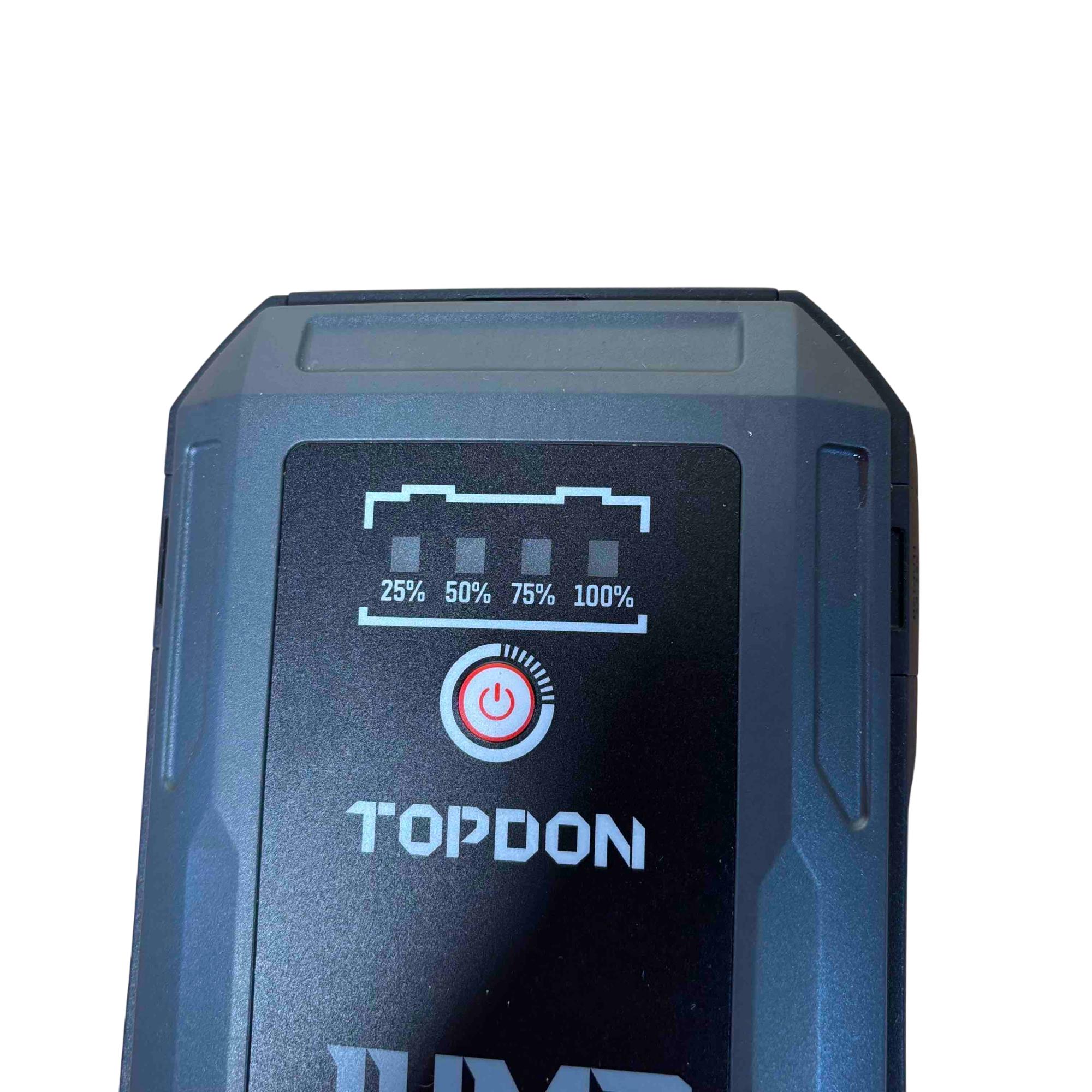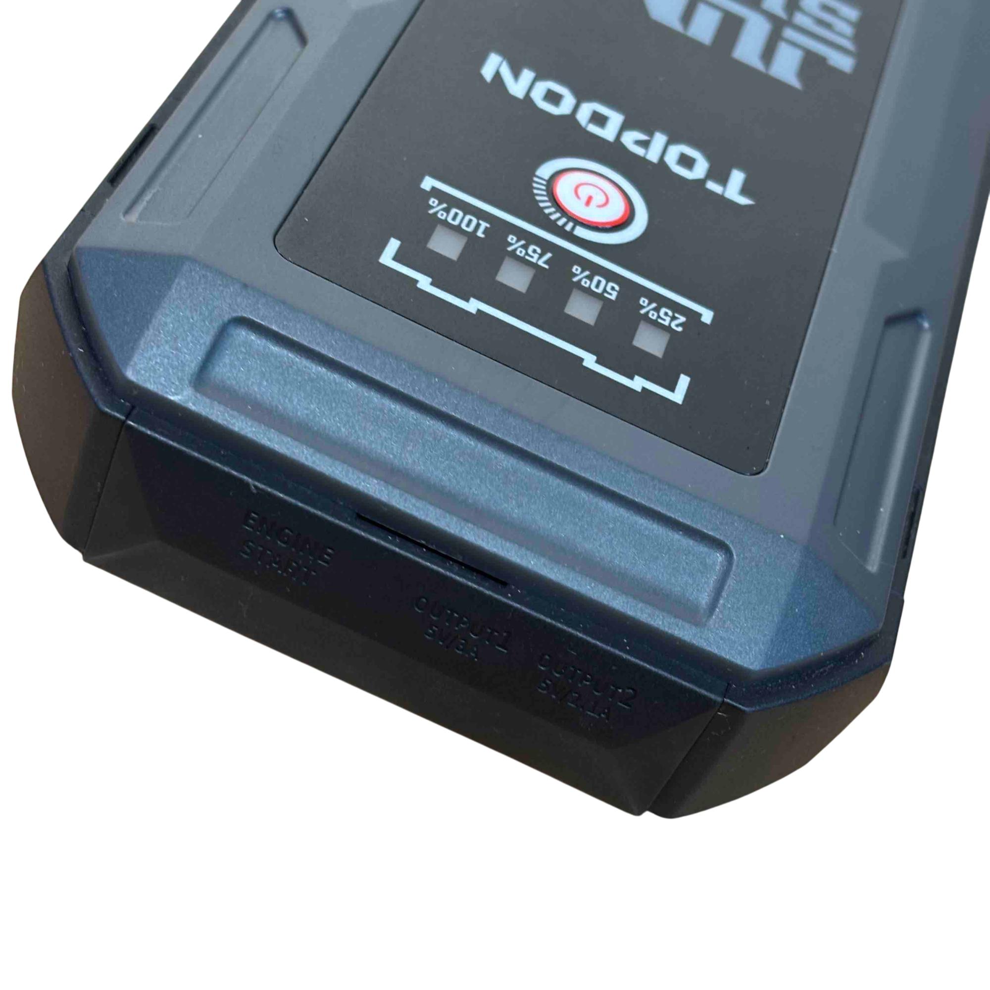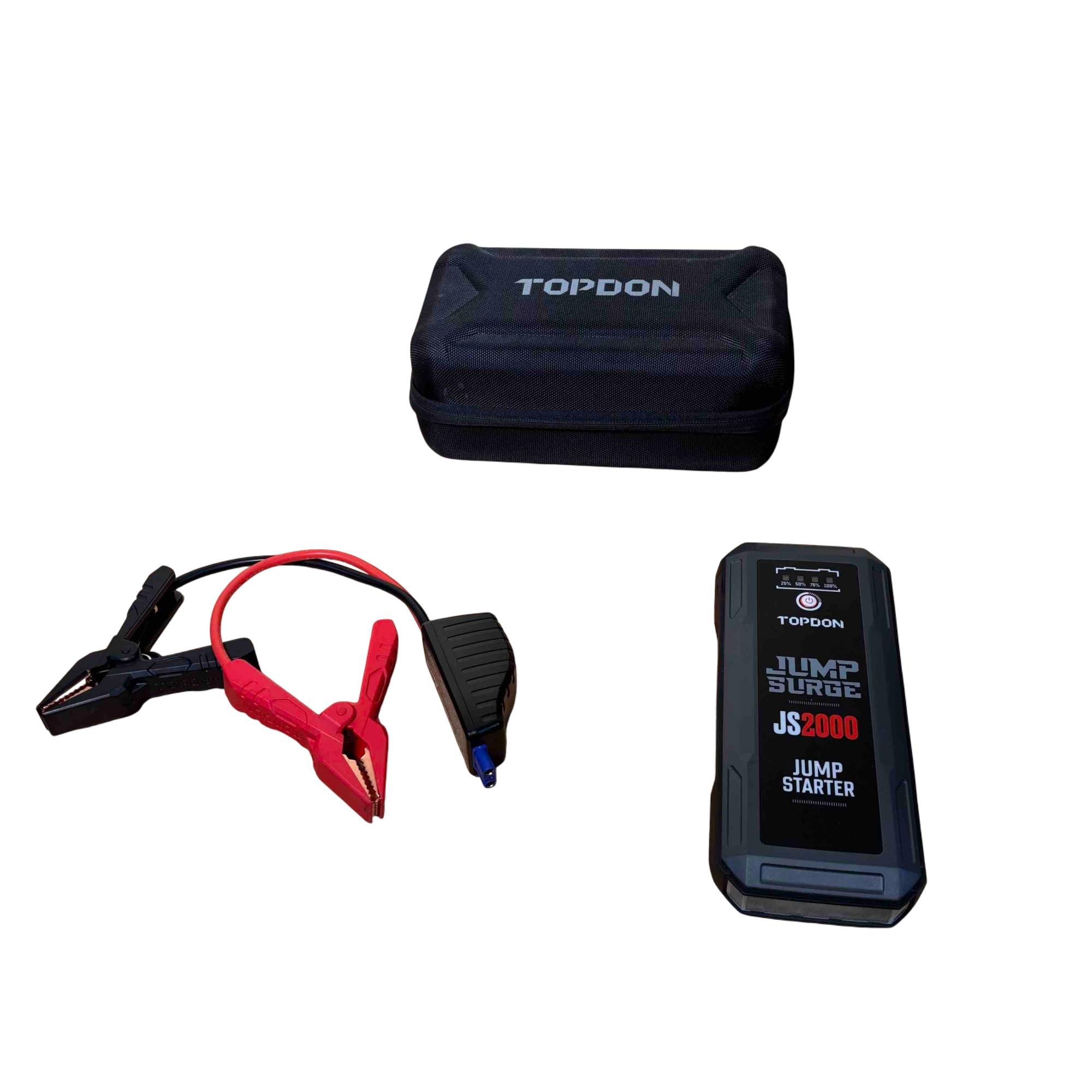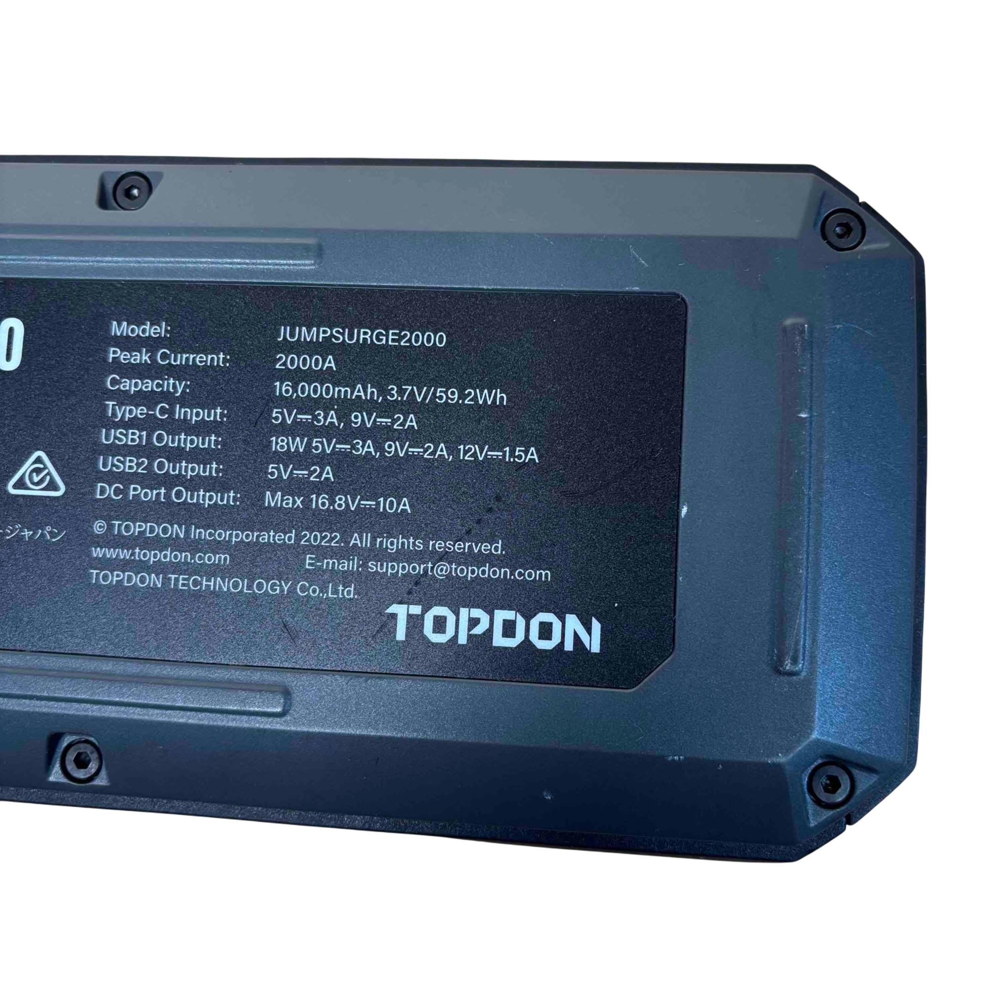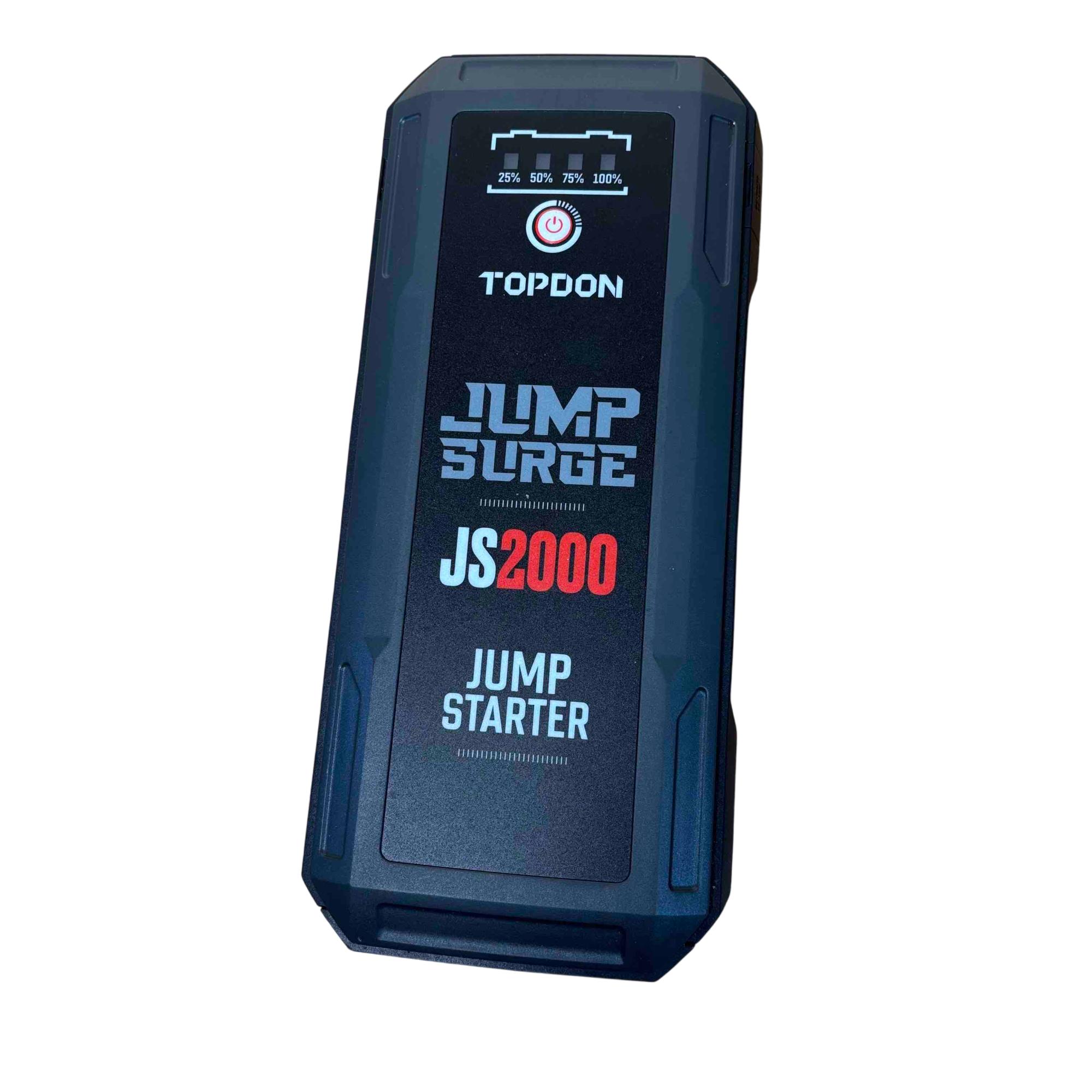Introducing the TOPDON JUMPSURGE2000, a powerful portable car jump starter capable of delivering up to 2000A peak current. This compact yet robust device houses a 16,000mAh battery, providing reliable power when you need it most. Equipped with both Type-C and USB outputs, it ensures your devices stay charged while you hit the road with confidence.